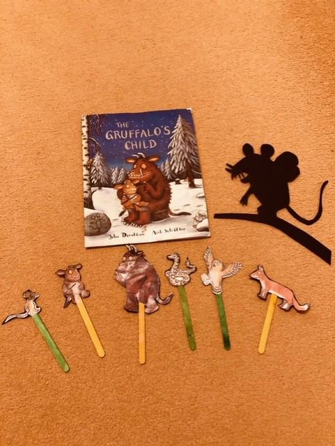 08.02.21 Eppy's mam hid the story characters in the garden. While Eppy's mam read the story, Eppy was the mouse and her brother George was the fox. Eppy has made a fantastic shadow puppet of the big bad mouse! Eppy has also had her face painted like the Gruffalo! What a brilliant idea! Well done!