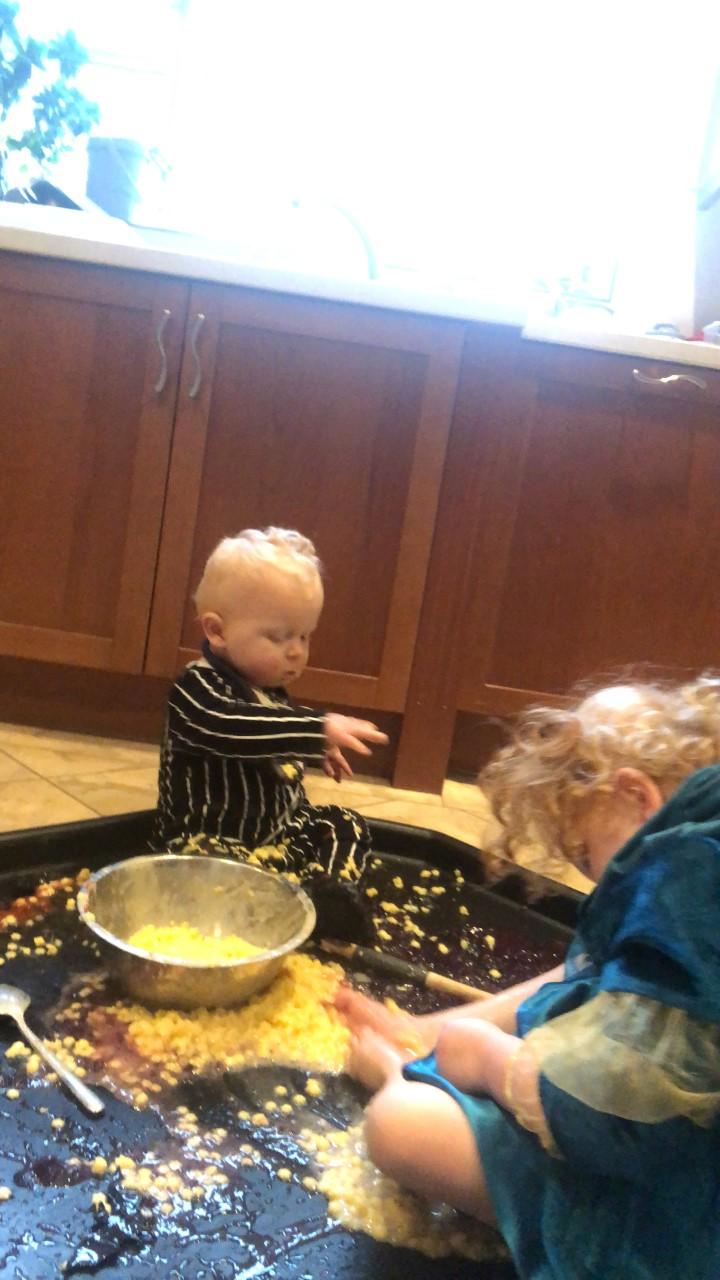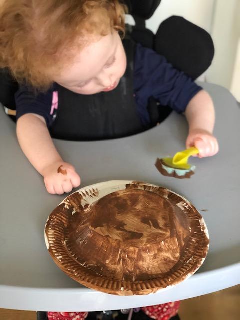 24.01.21 - PAINTING THE GRUFFALO - Eppy made her own purple paint for the spikes on the Gruffalos back. She even helped her mam to clean up after her painting! STANDING - Eppy looks around her kitchen, looking for the hidden characters in the story. MAKING GRUFFALO CAKES Eppy, George and her mam had fun making some delicious Gruffalo cakes.