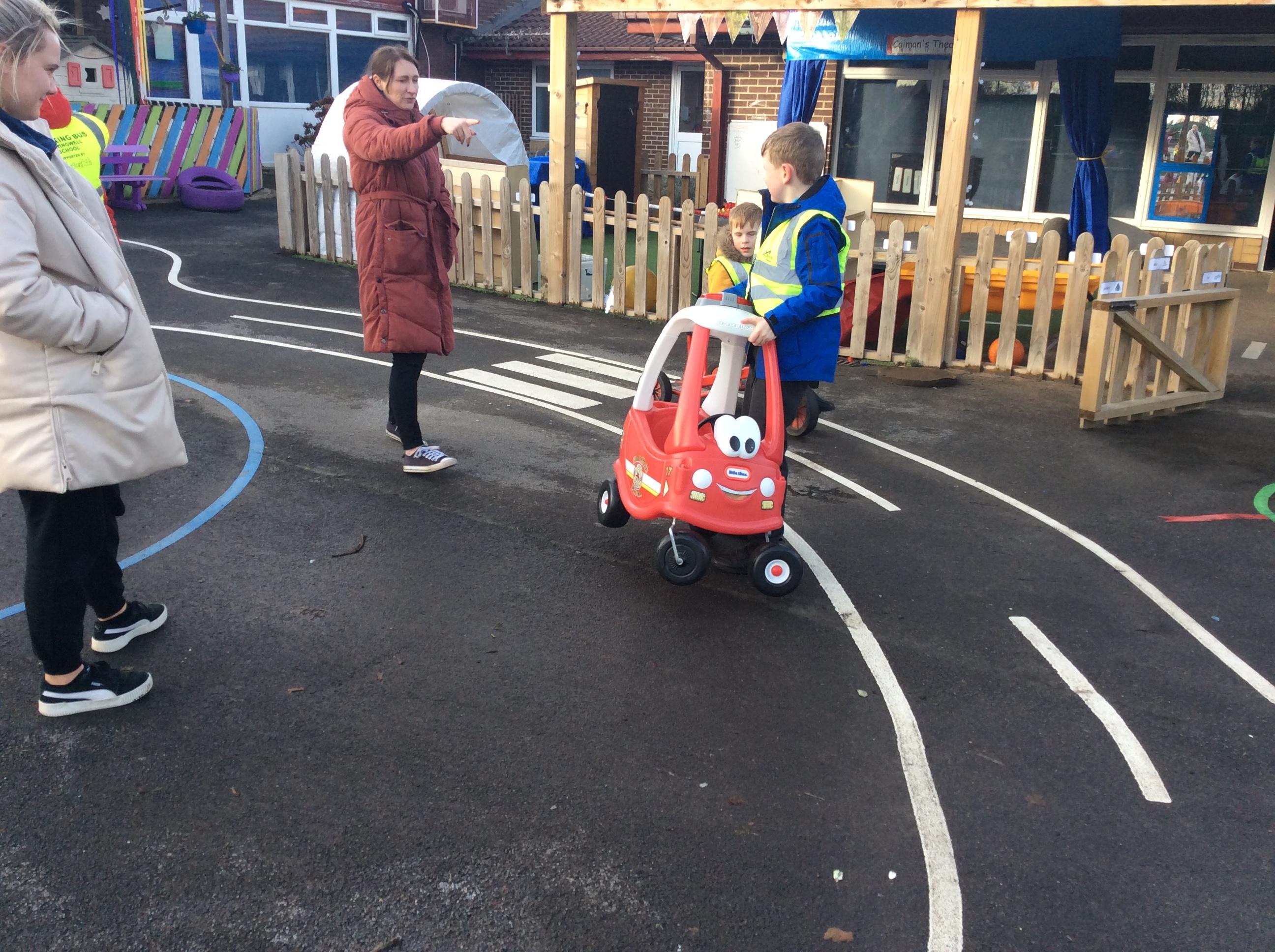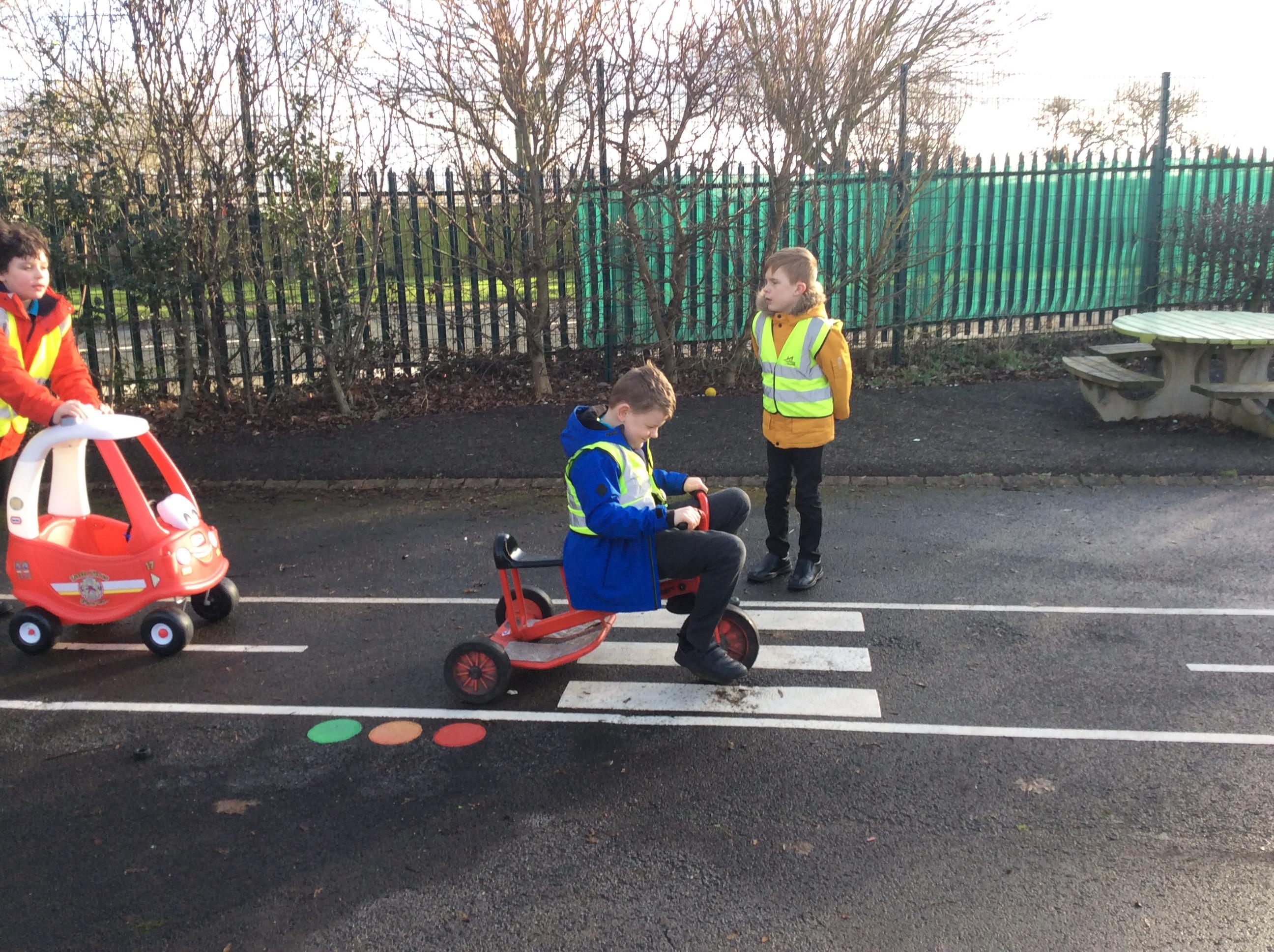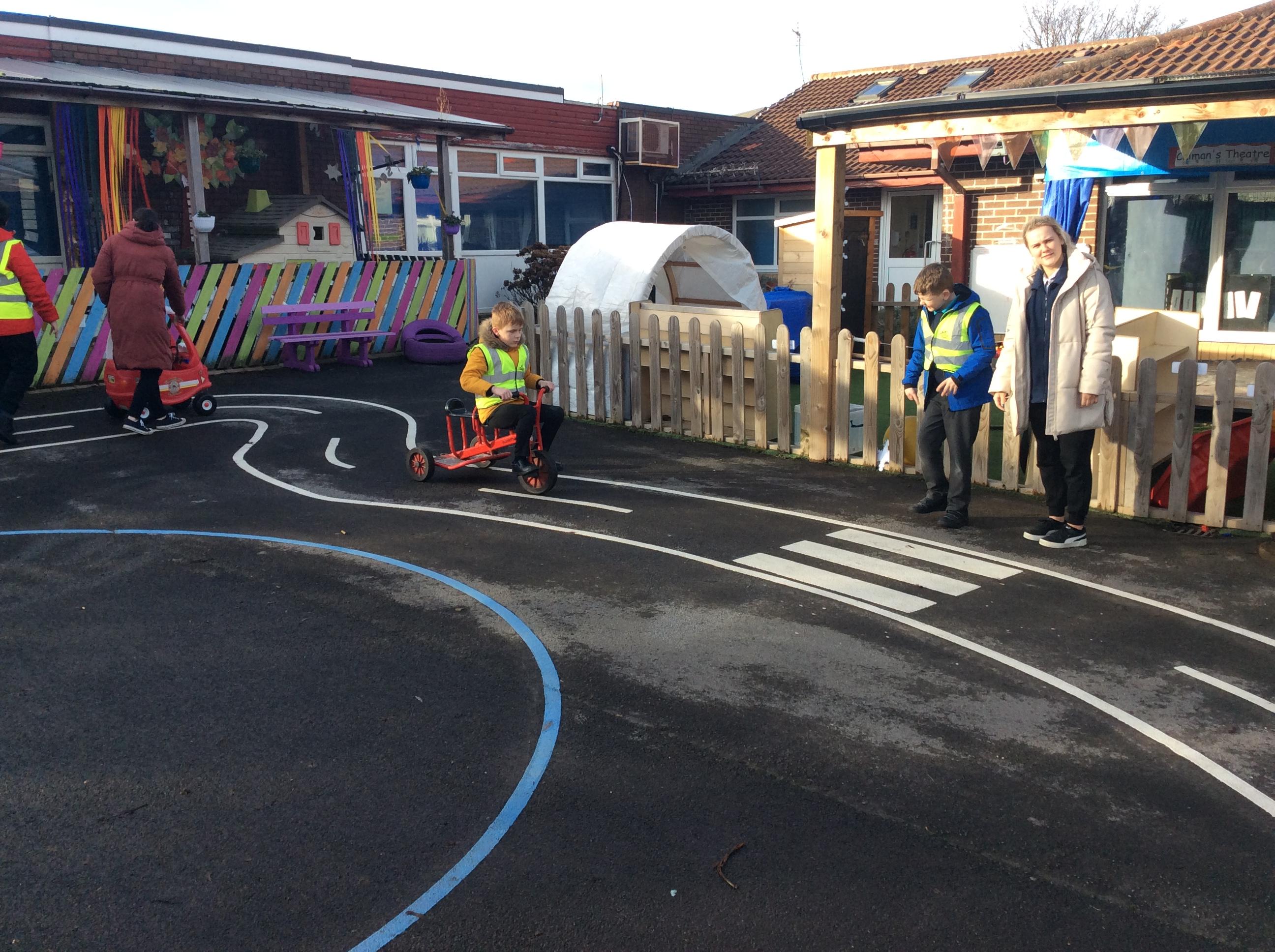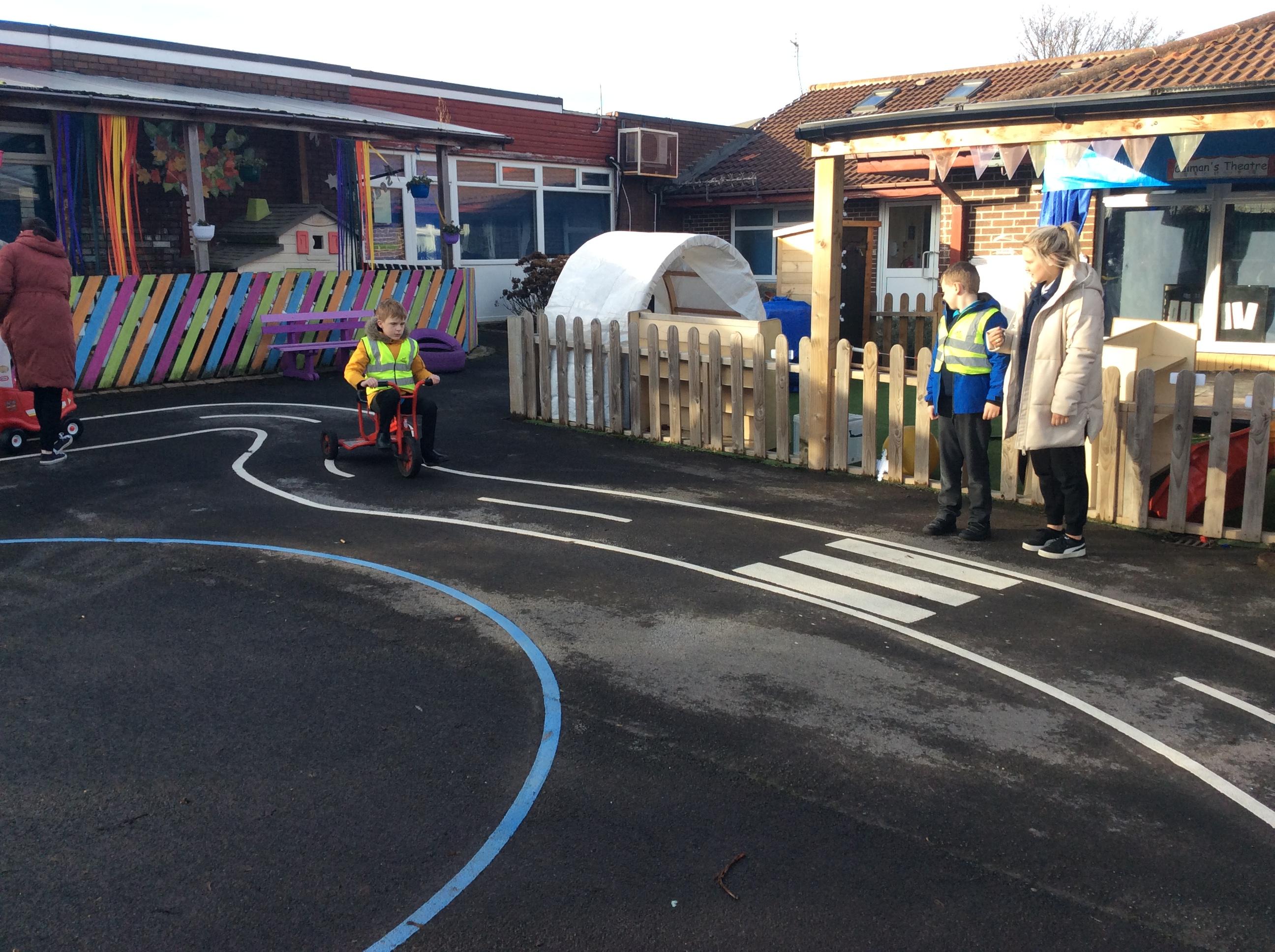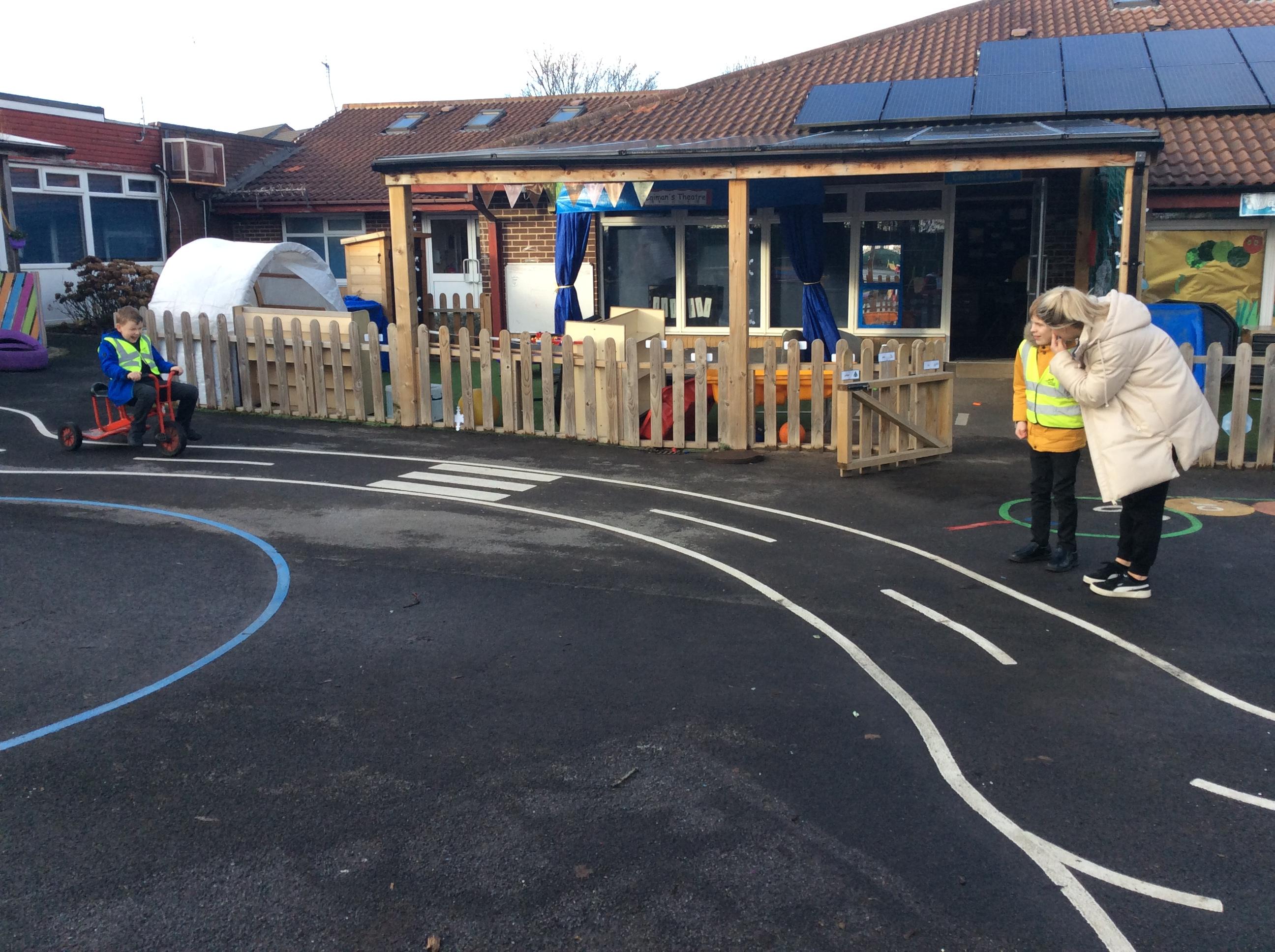 21 1 21 - Road Safety (PSHE): We enjoyed exploring and role-playing road safety rules on the road track in the outside area.