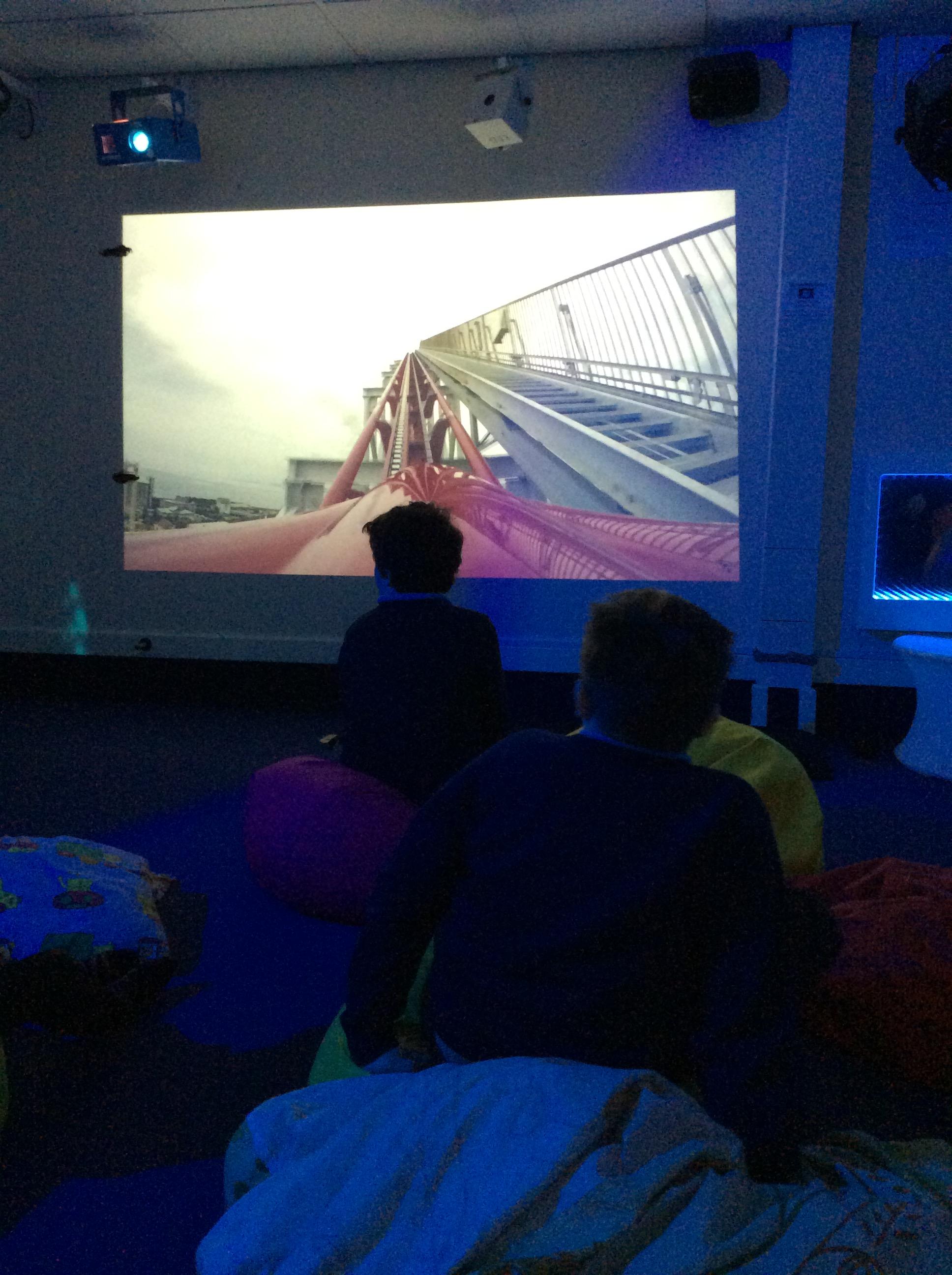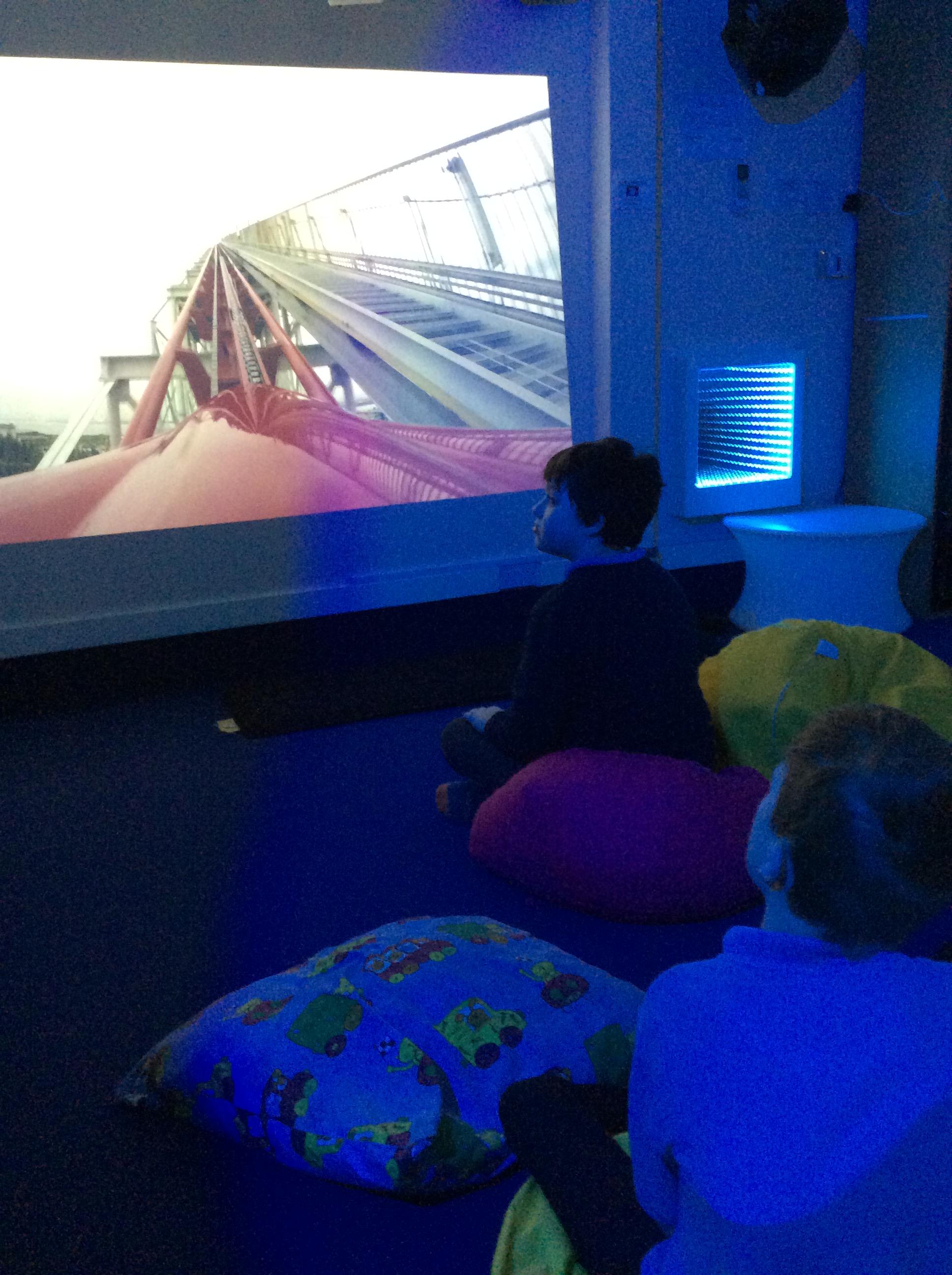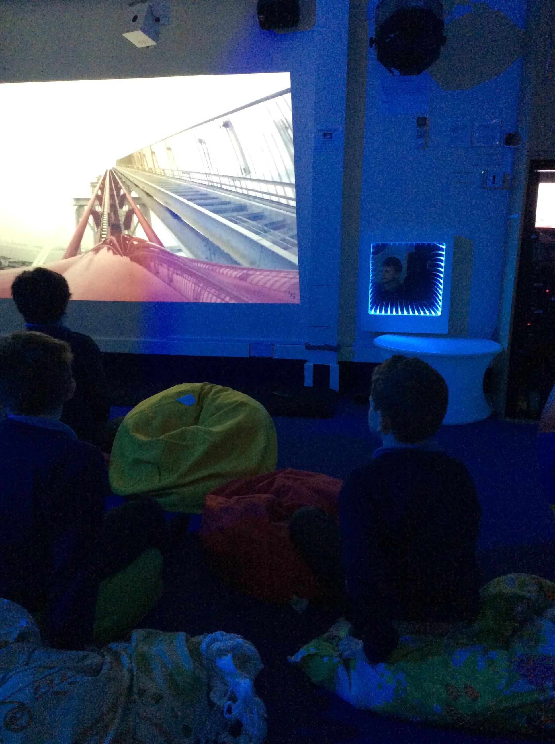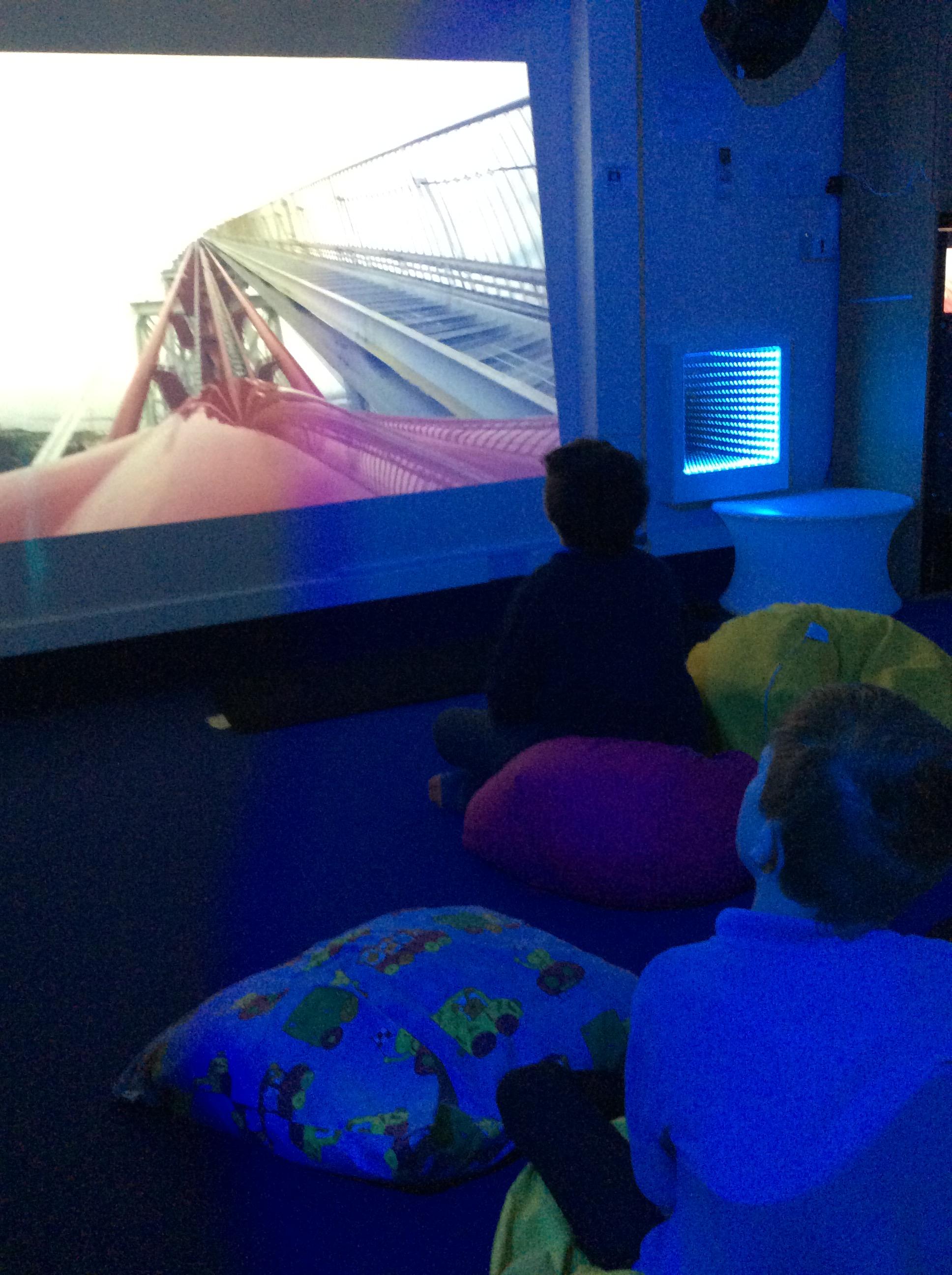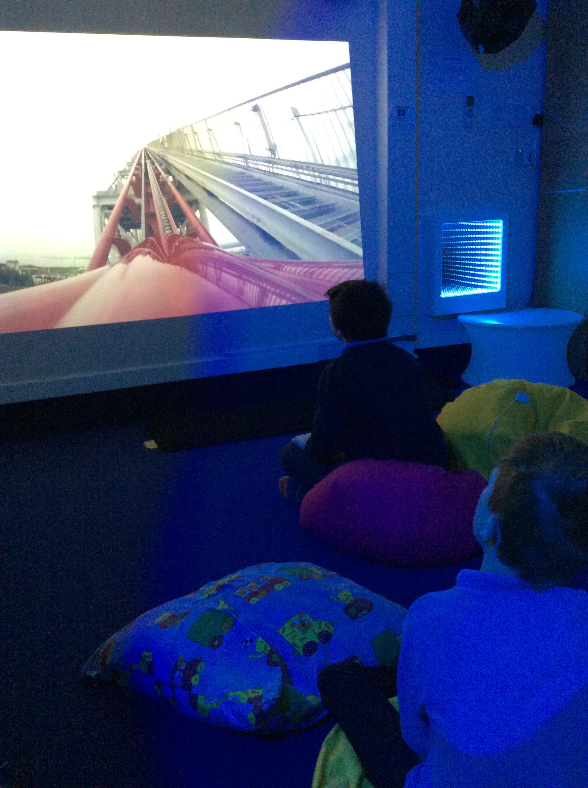 5/2/21 Theme Parks (History) : We went in to the sensory room experienced riding rollercoasters on the big screen.