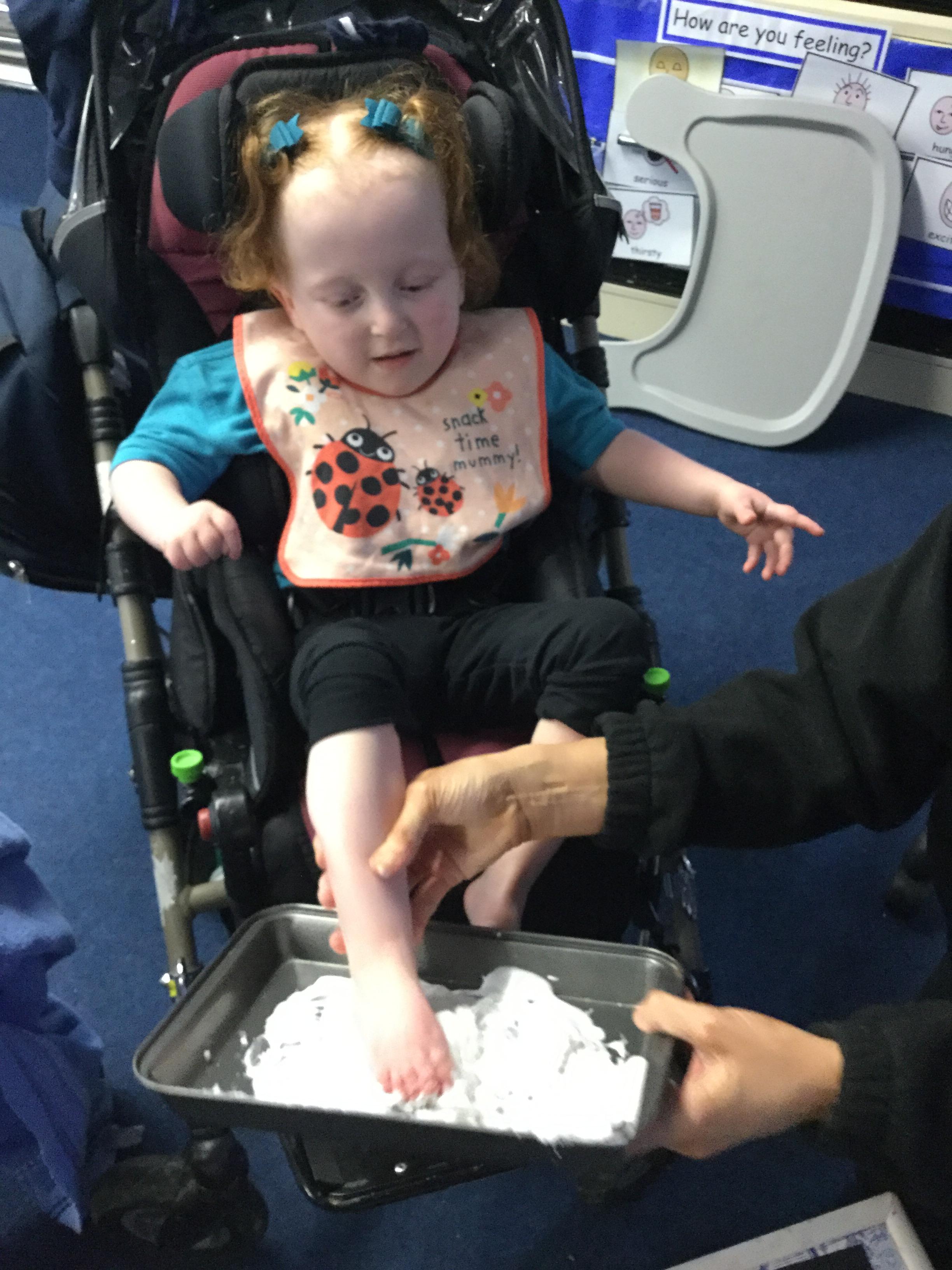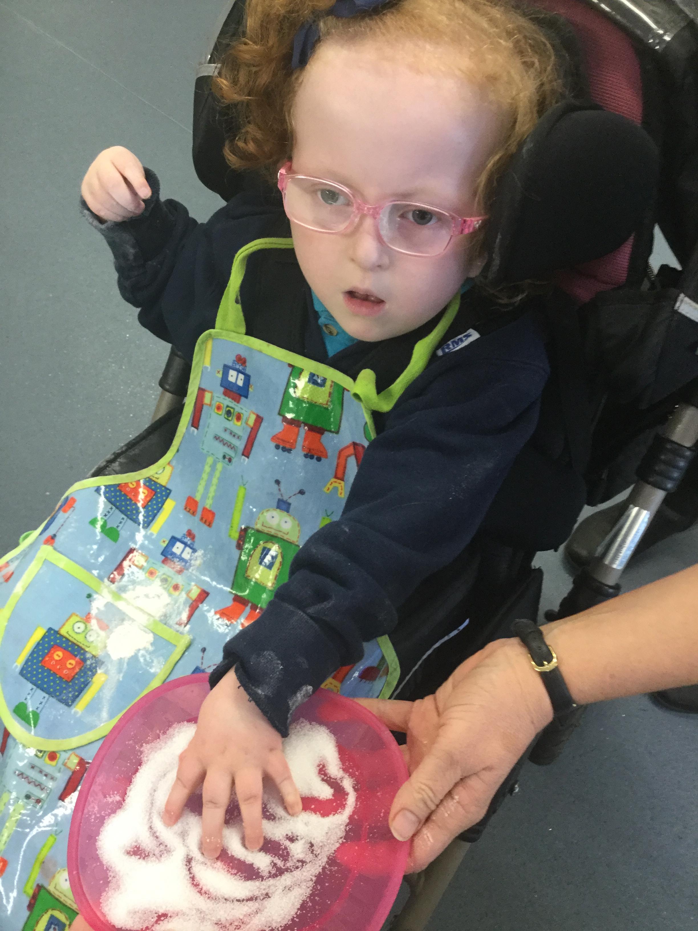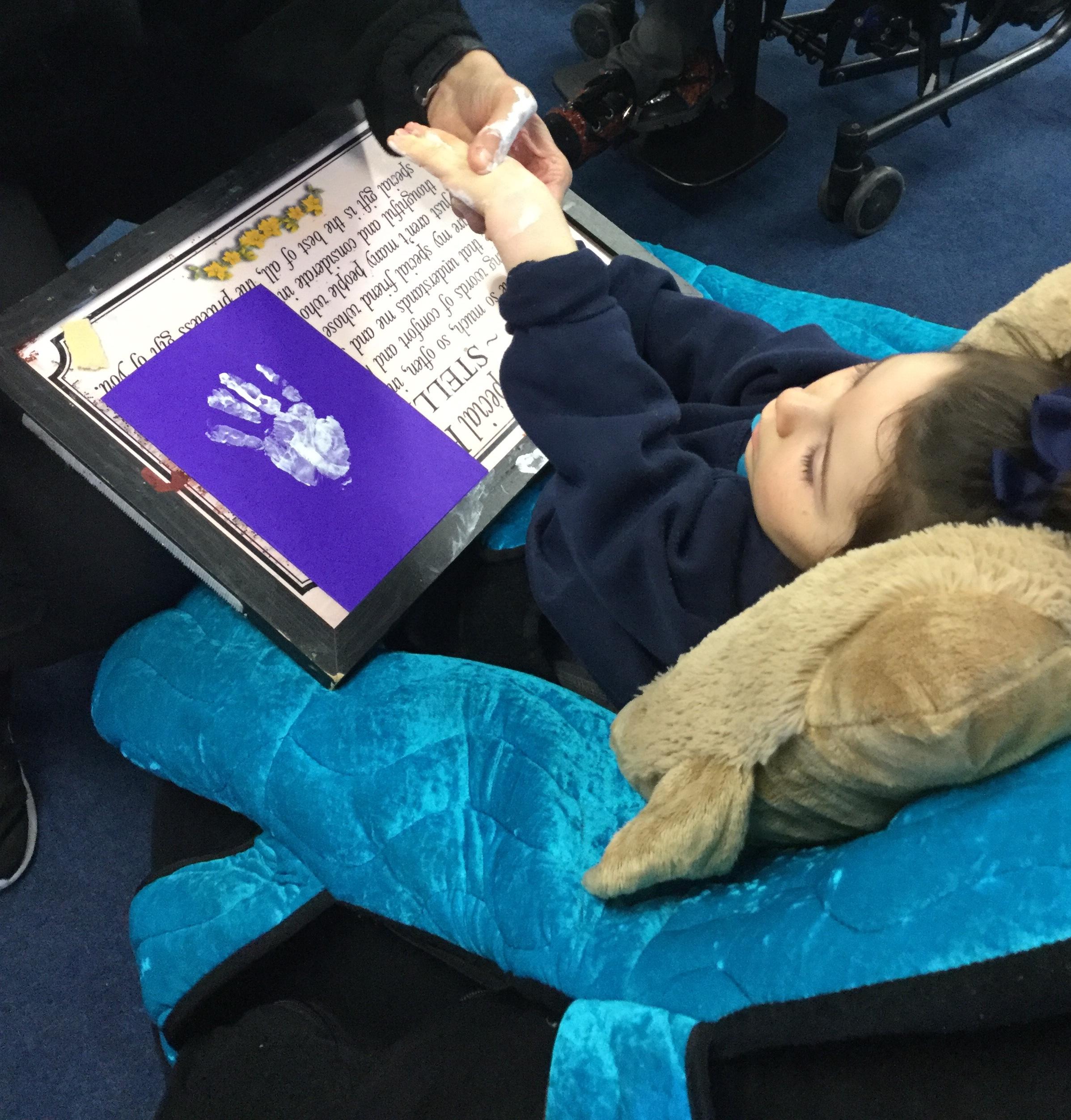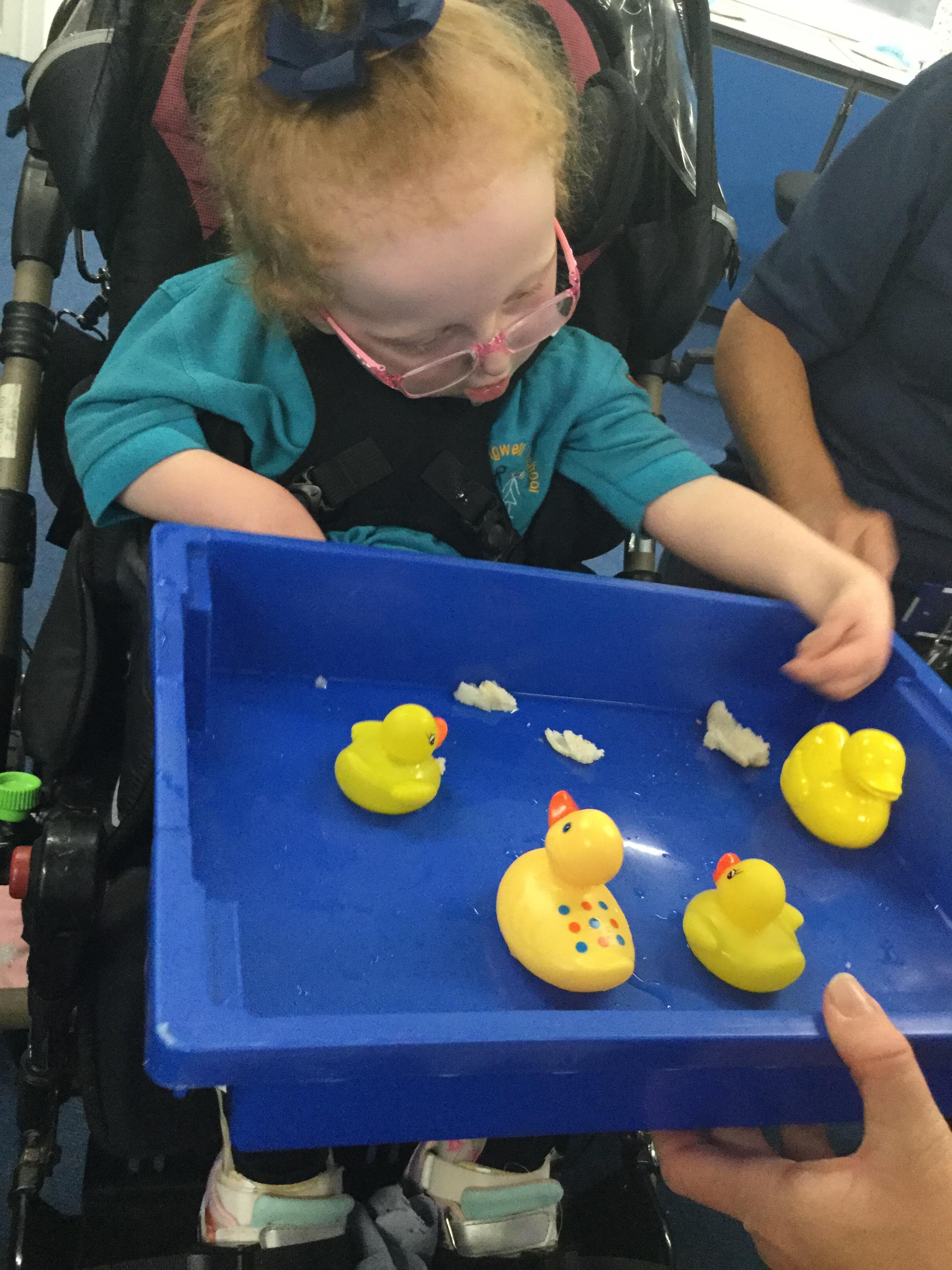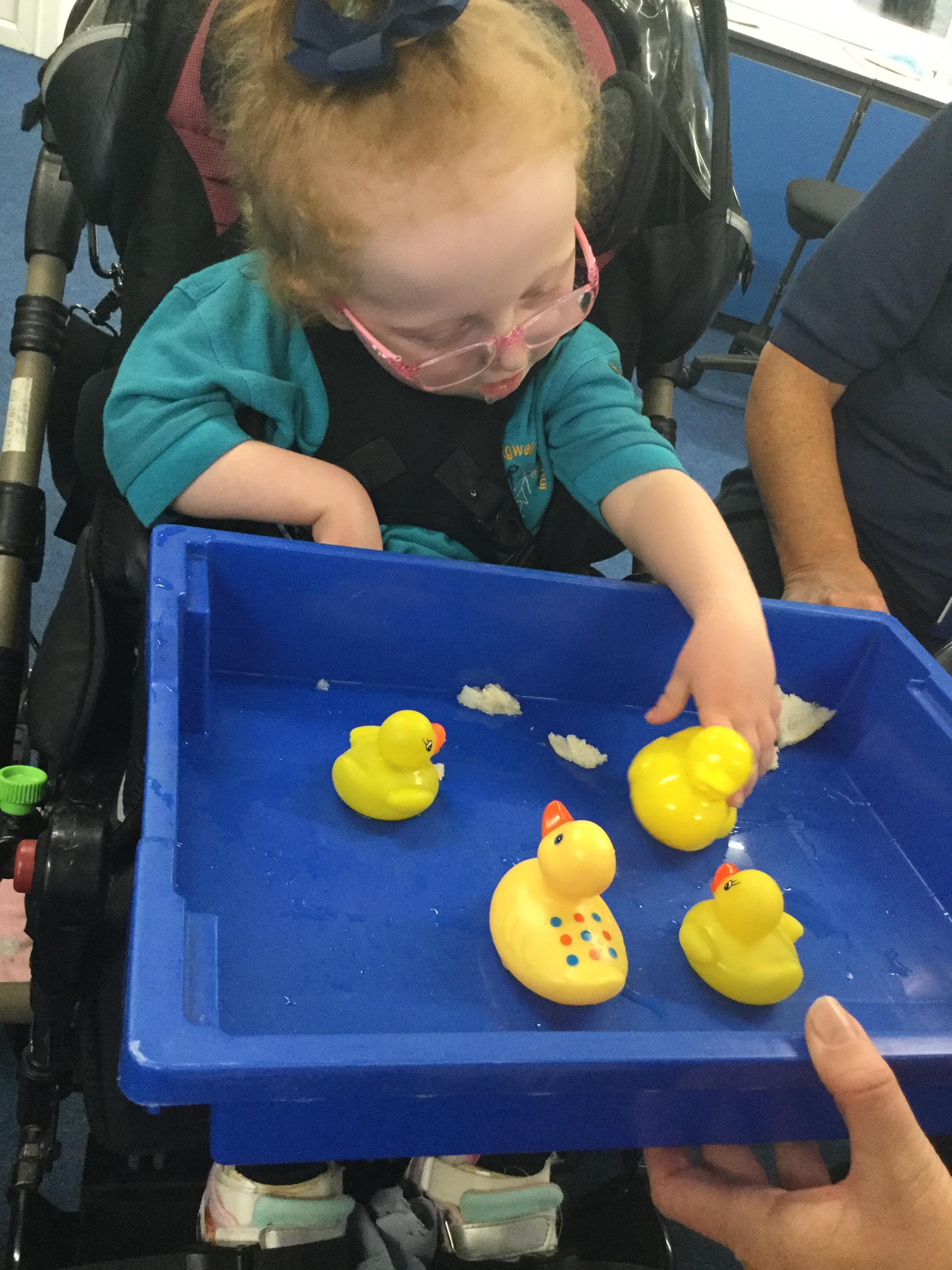 Sparkle curriculum is predominantly made up of sensory themed learning and therapeutic activities. More time will be spent on more beneficial, holistic and individualised activities e.g. positioning in specialised equipment, visual stimulation, hand and finger work (exploration – sensory play), therapies (hydrotherapy, rebound therapy etc), movement, relaxation, Tac Pac, story massage etc.