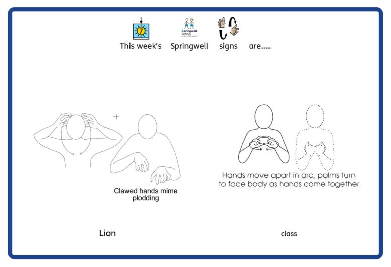 We also have our own Springwell set of Makaton signs which we cover 2 signs each week alongside the official Makaton sign. We have split these signs into 4 categories; School, Colours, Farm animals and Classes.