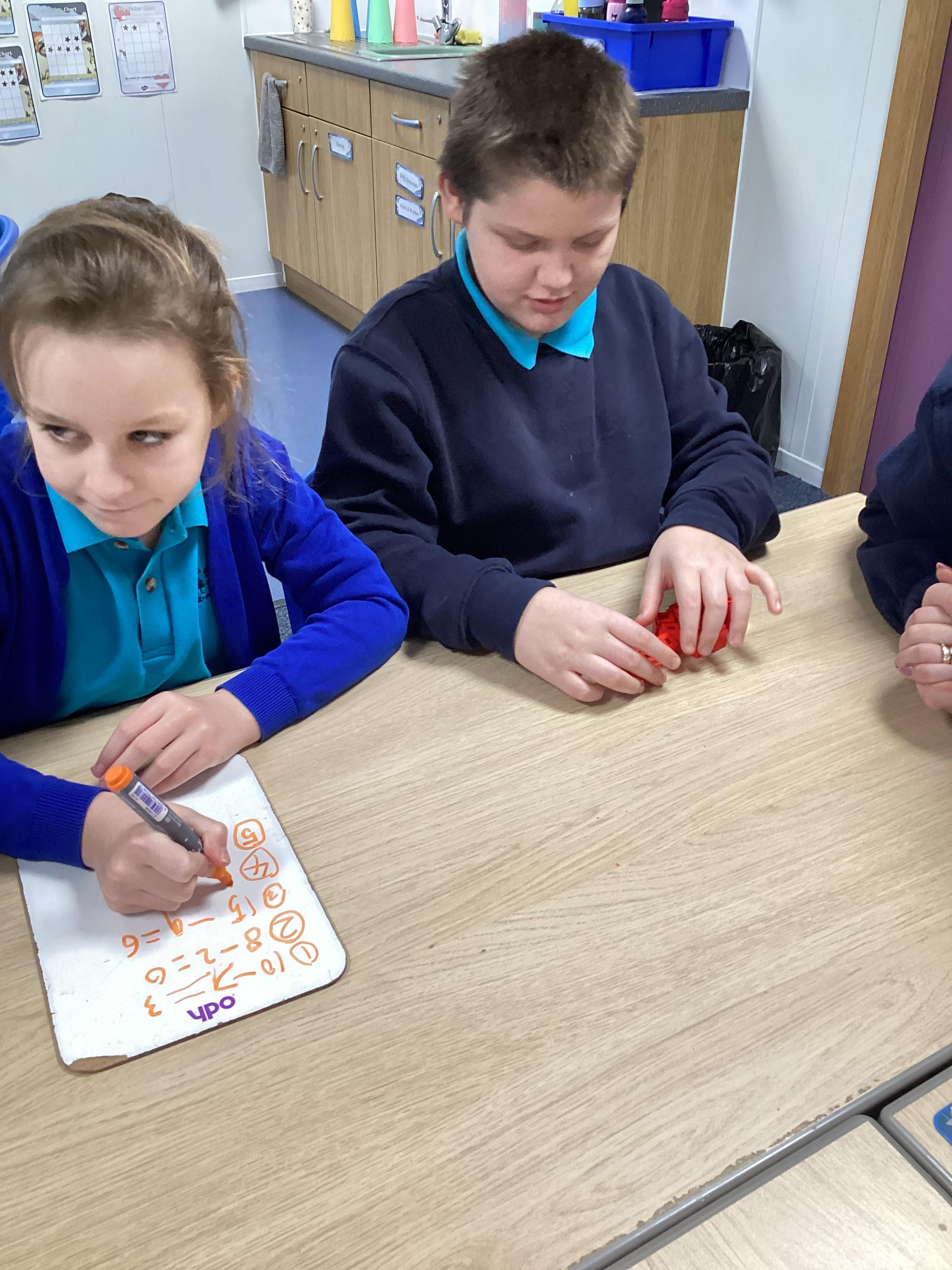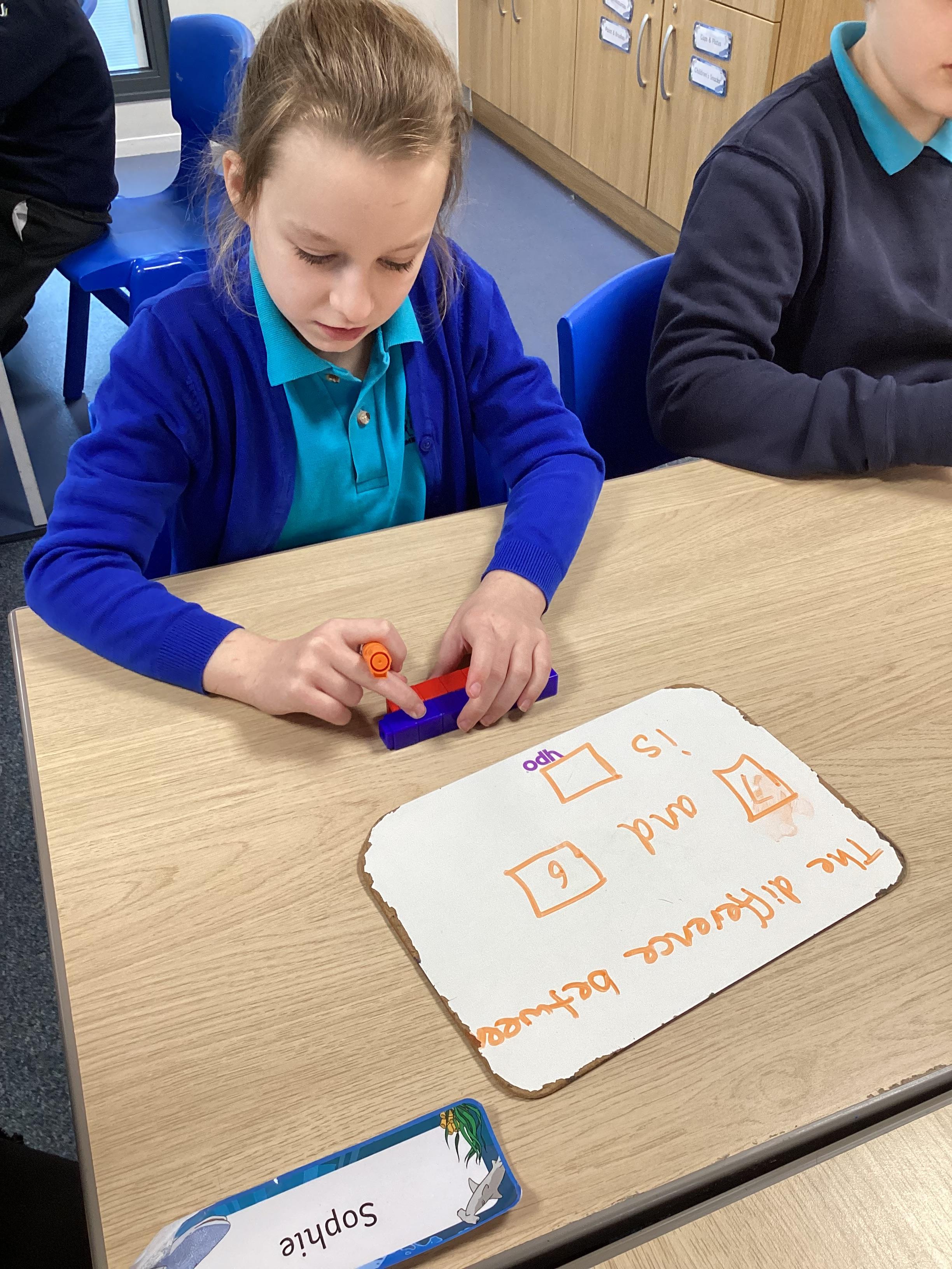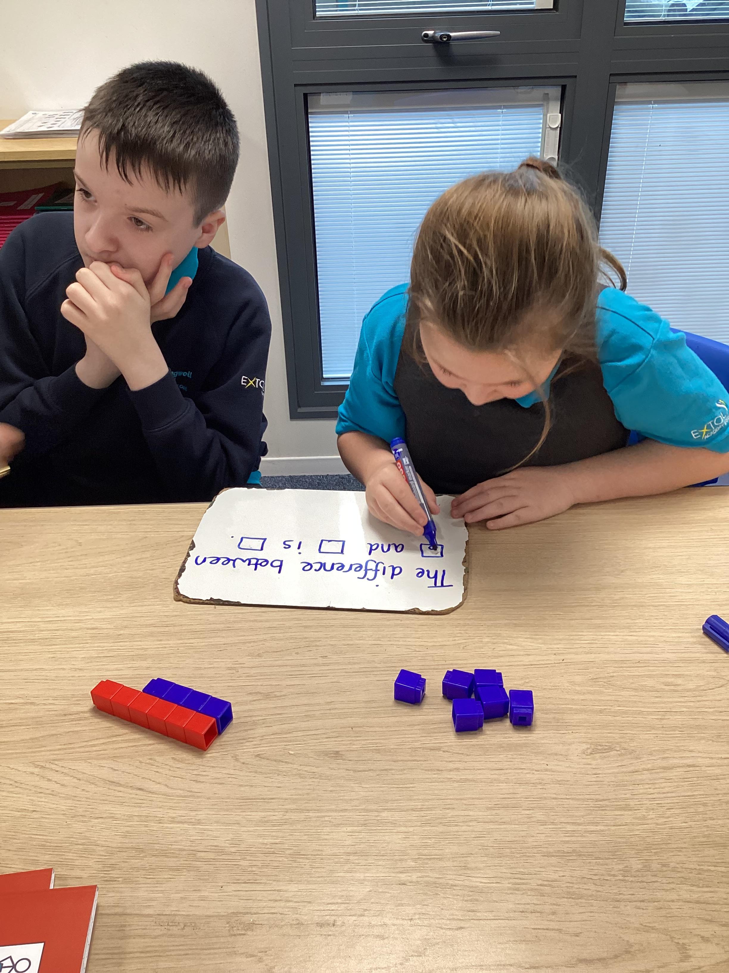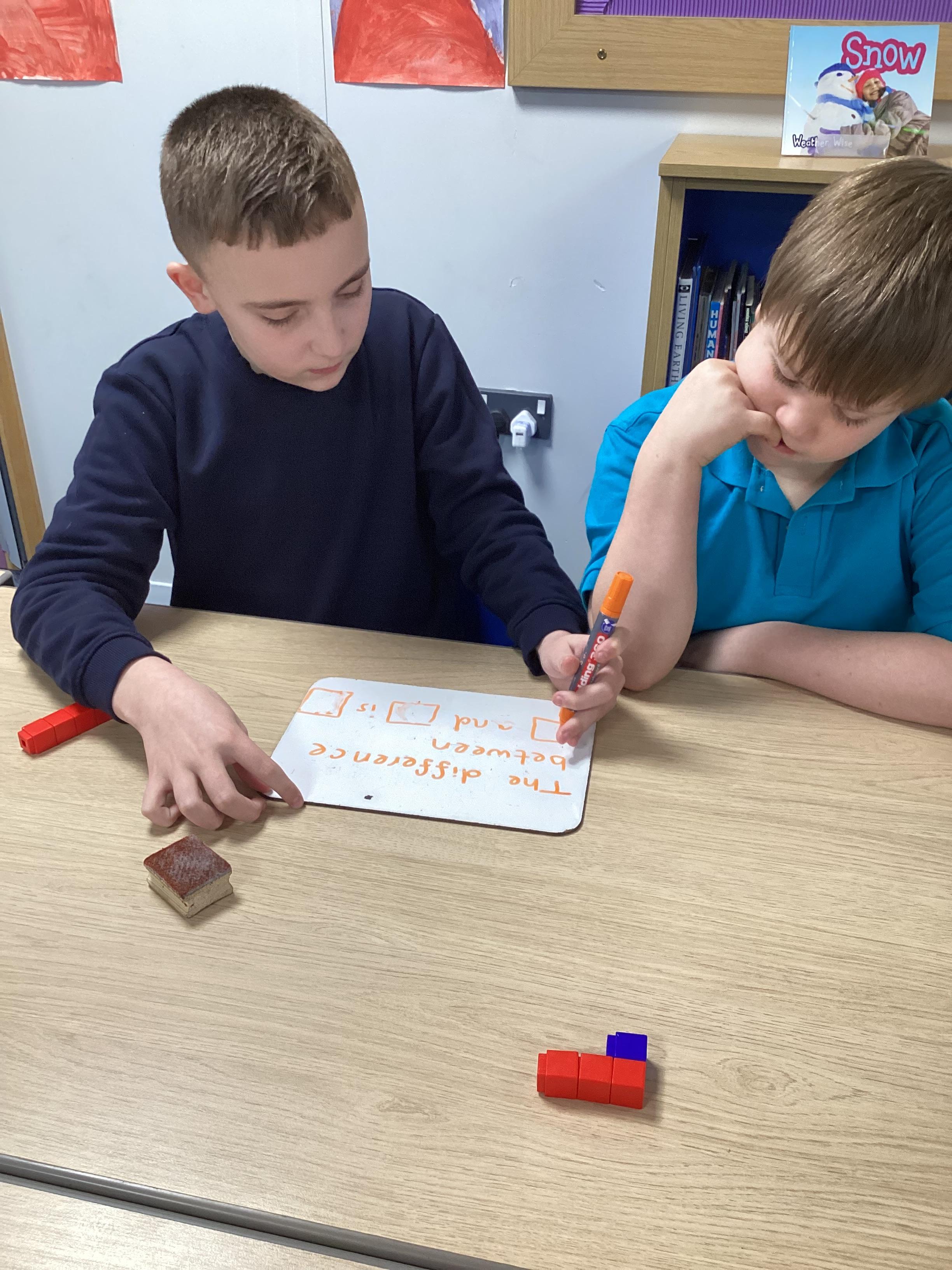 In Maths today, we have been finding the difference between two sets of cubes. Then writing number sentences to explain this. Amazing work!