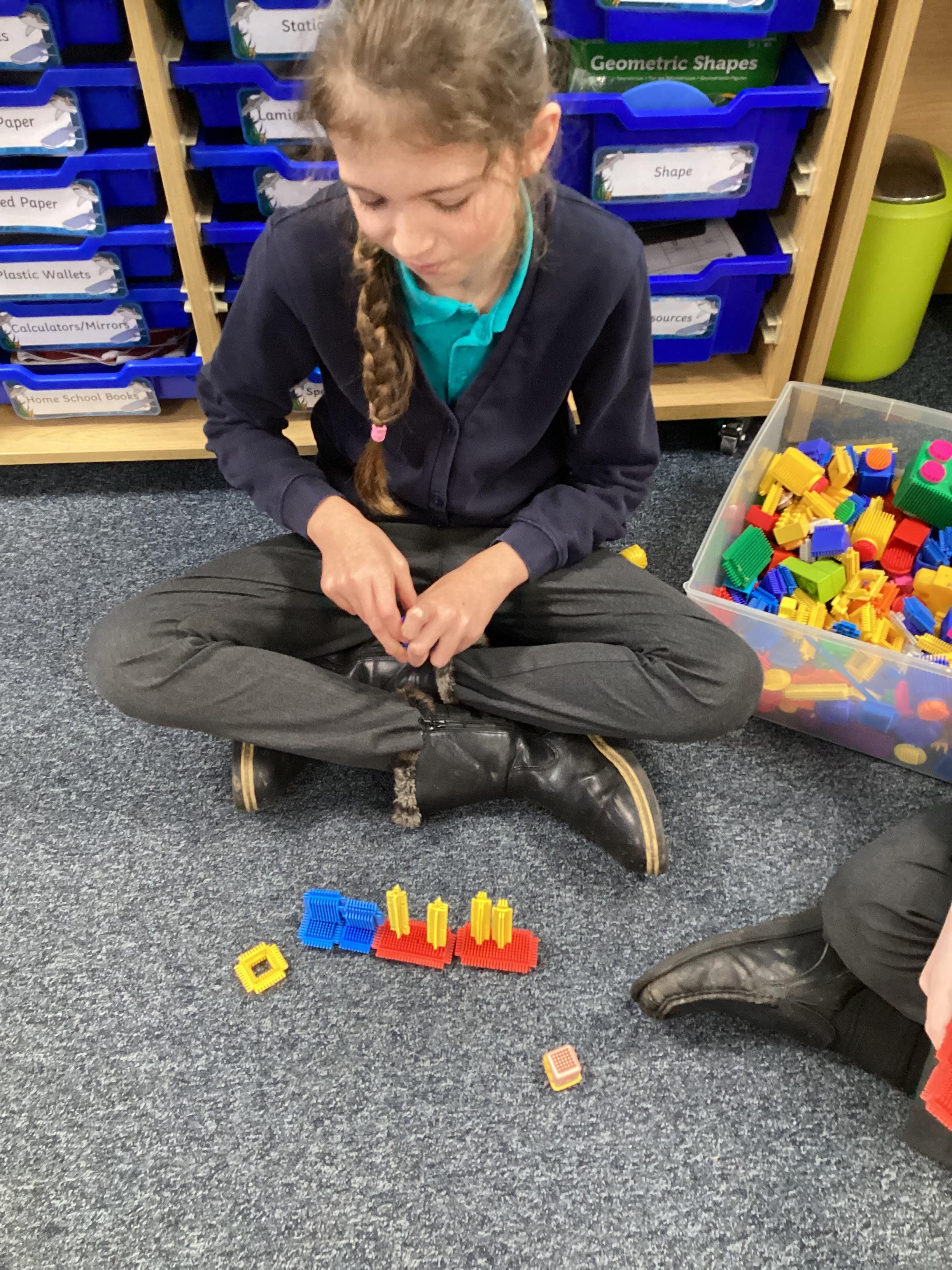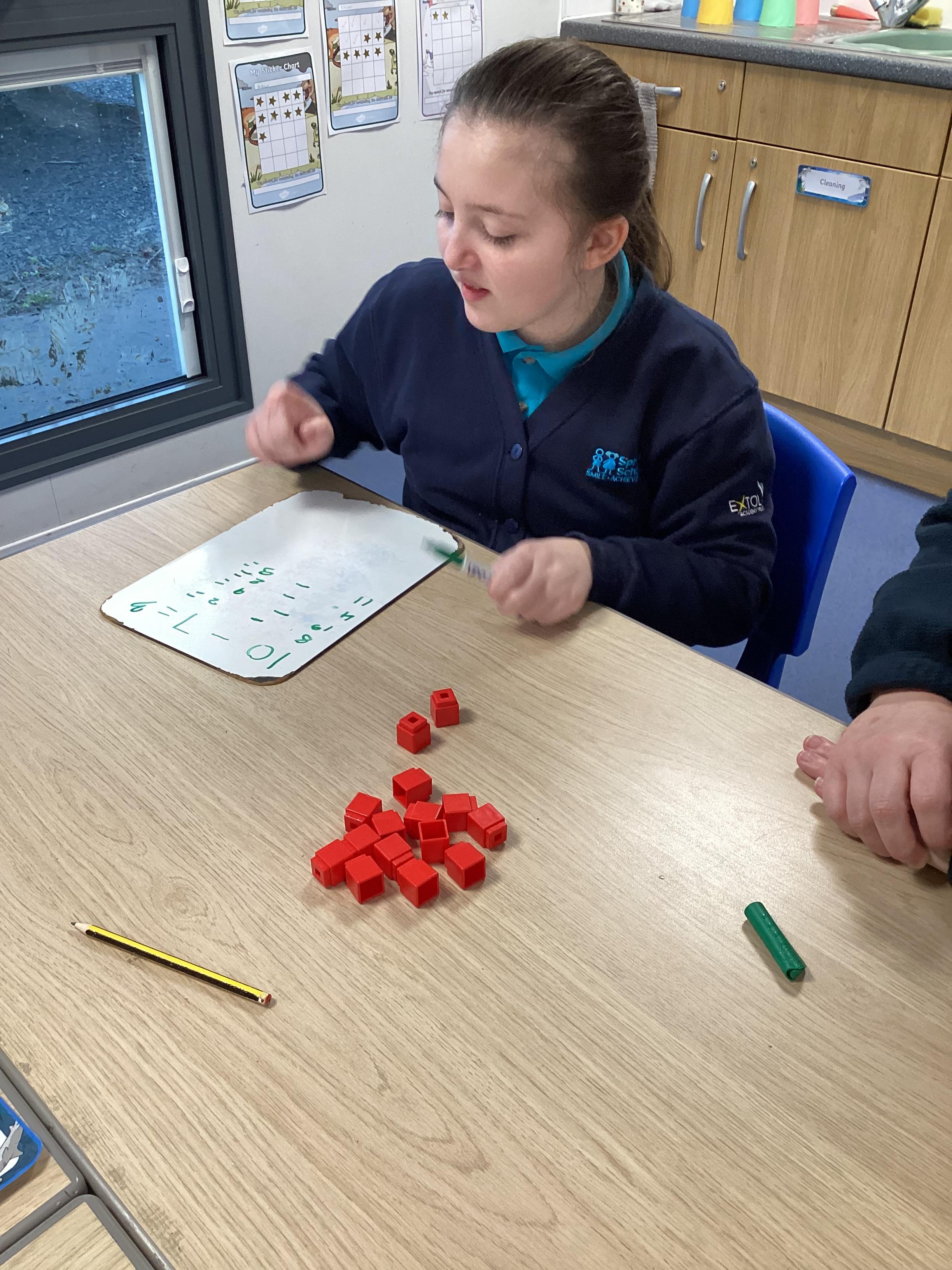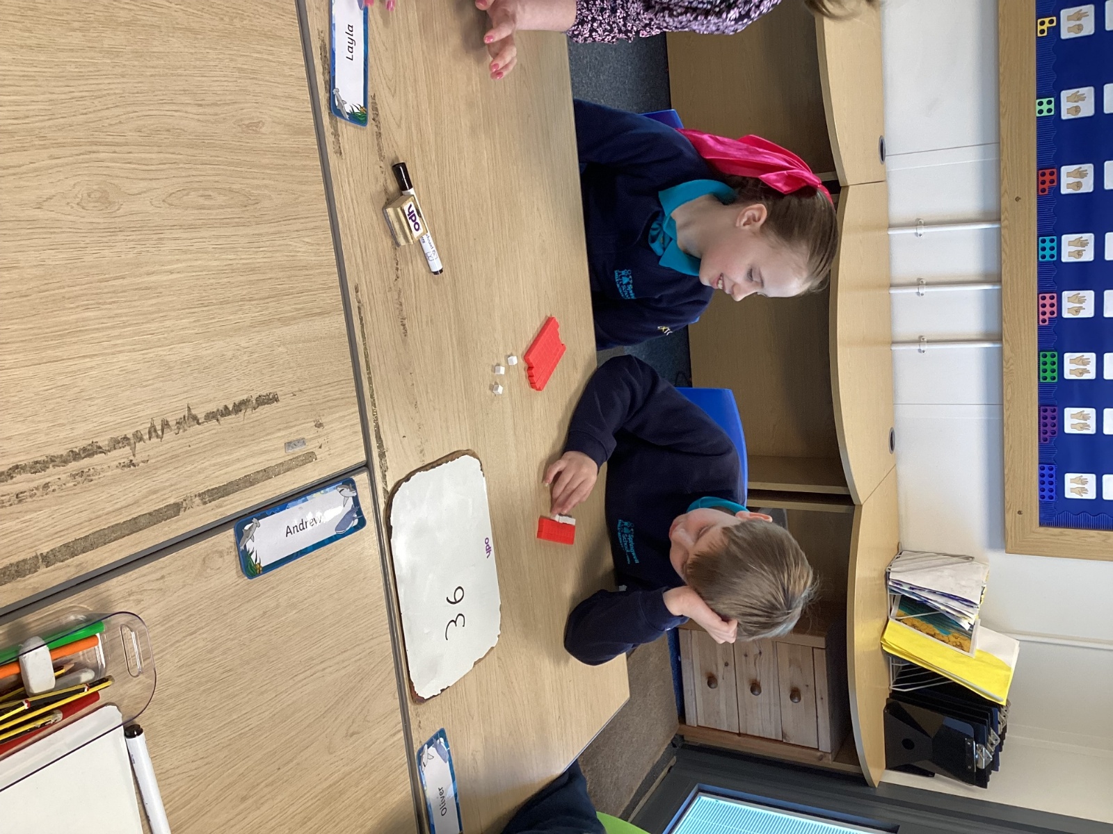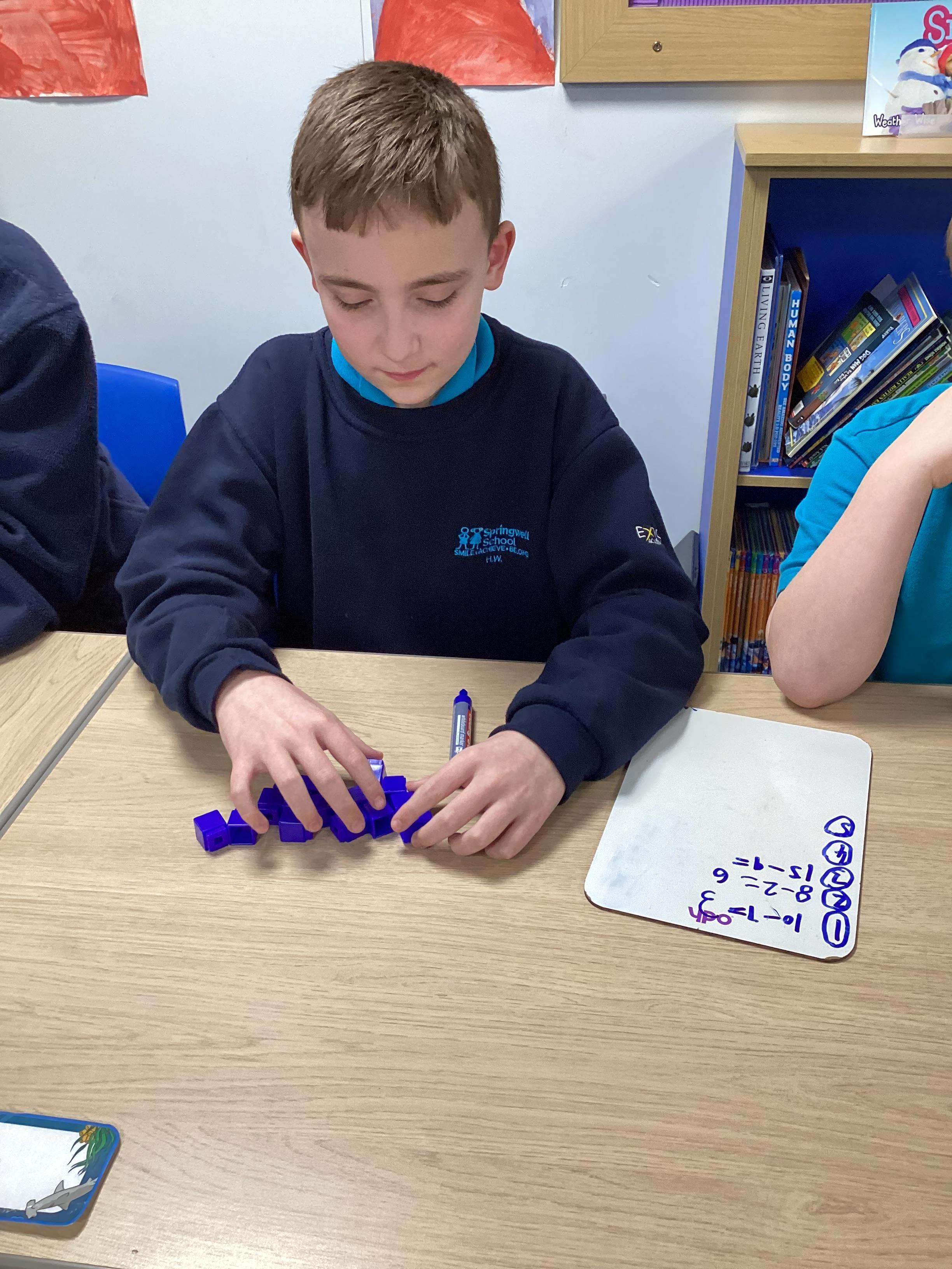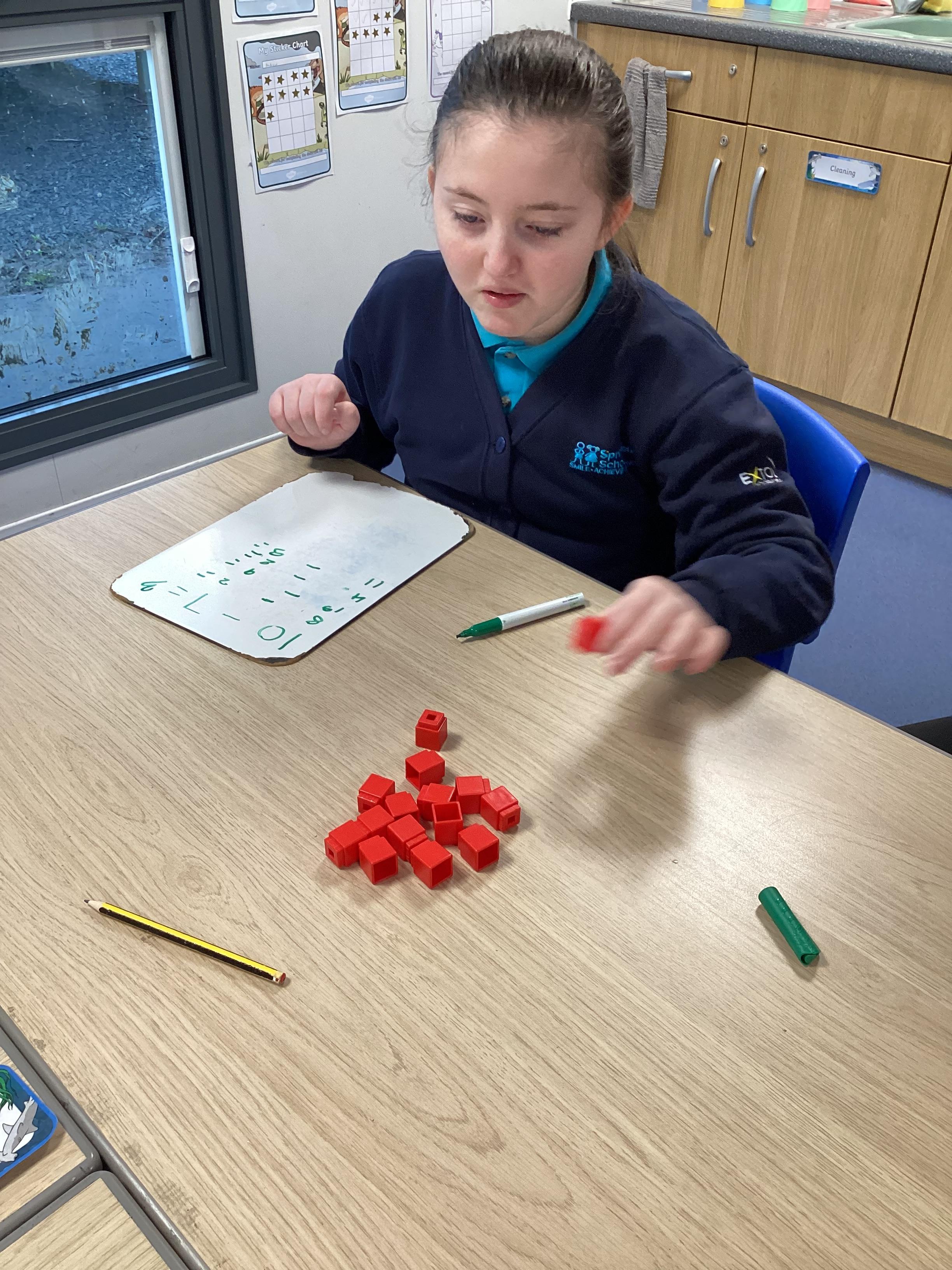In Maths today, we have been working out subtraction sums by using concrete objects (cubes). We counted the whole, took away so many and counted how many were left.
