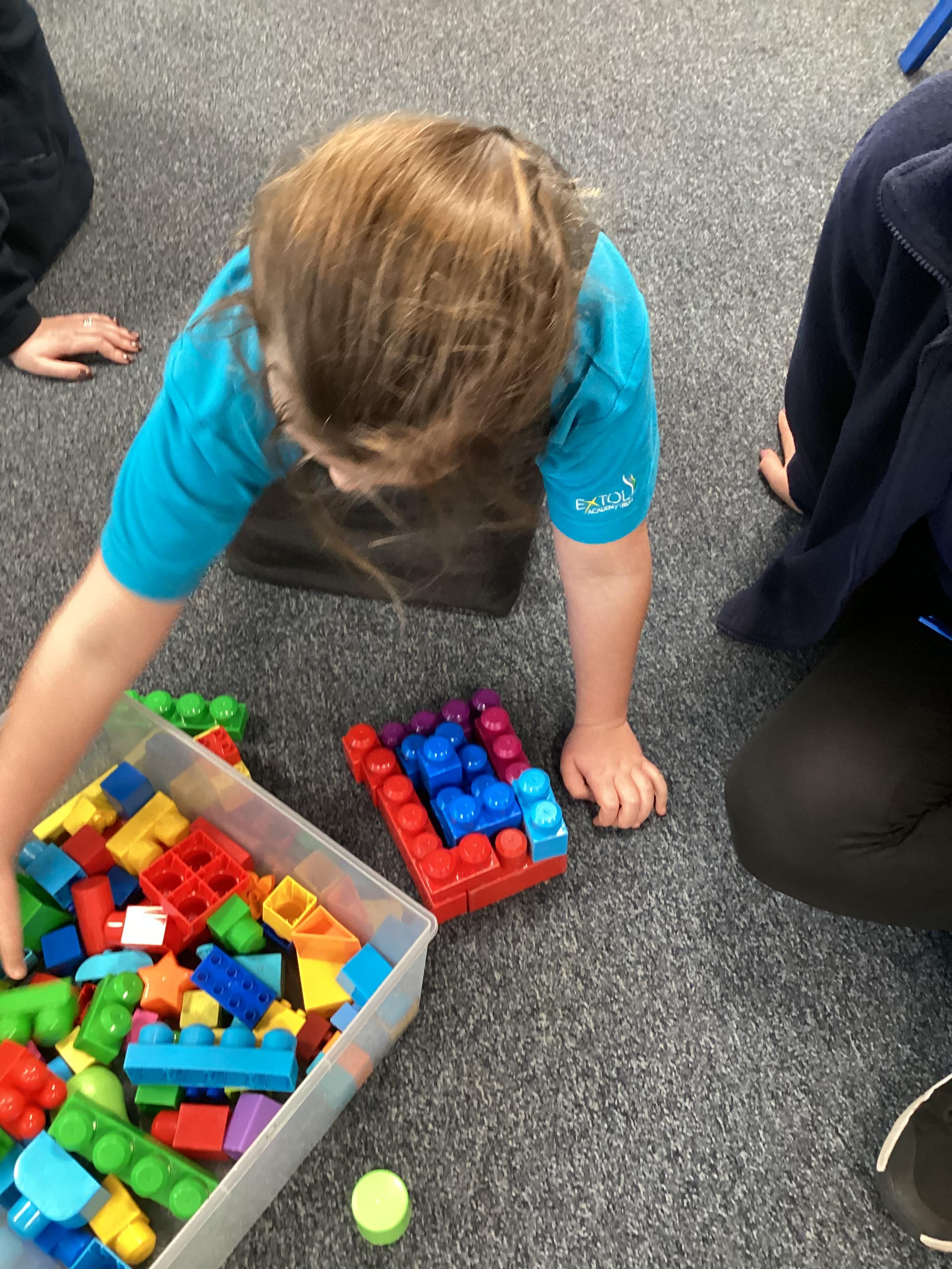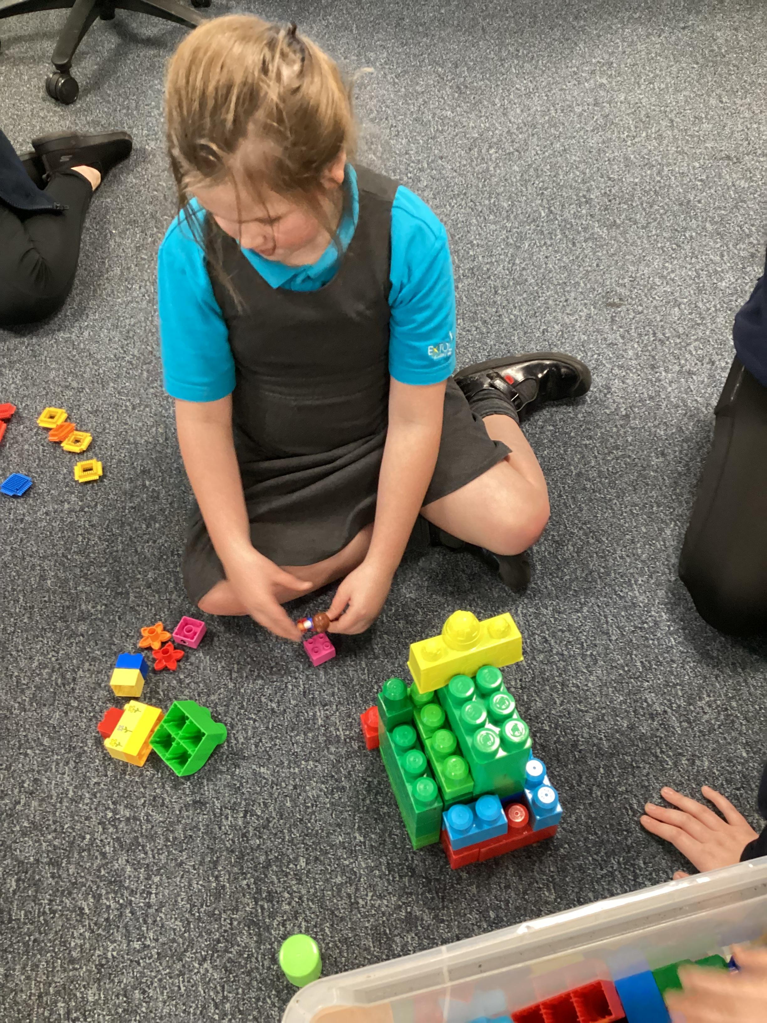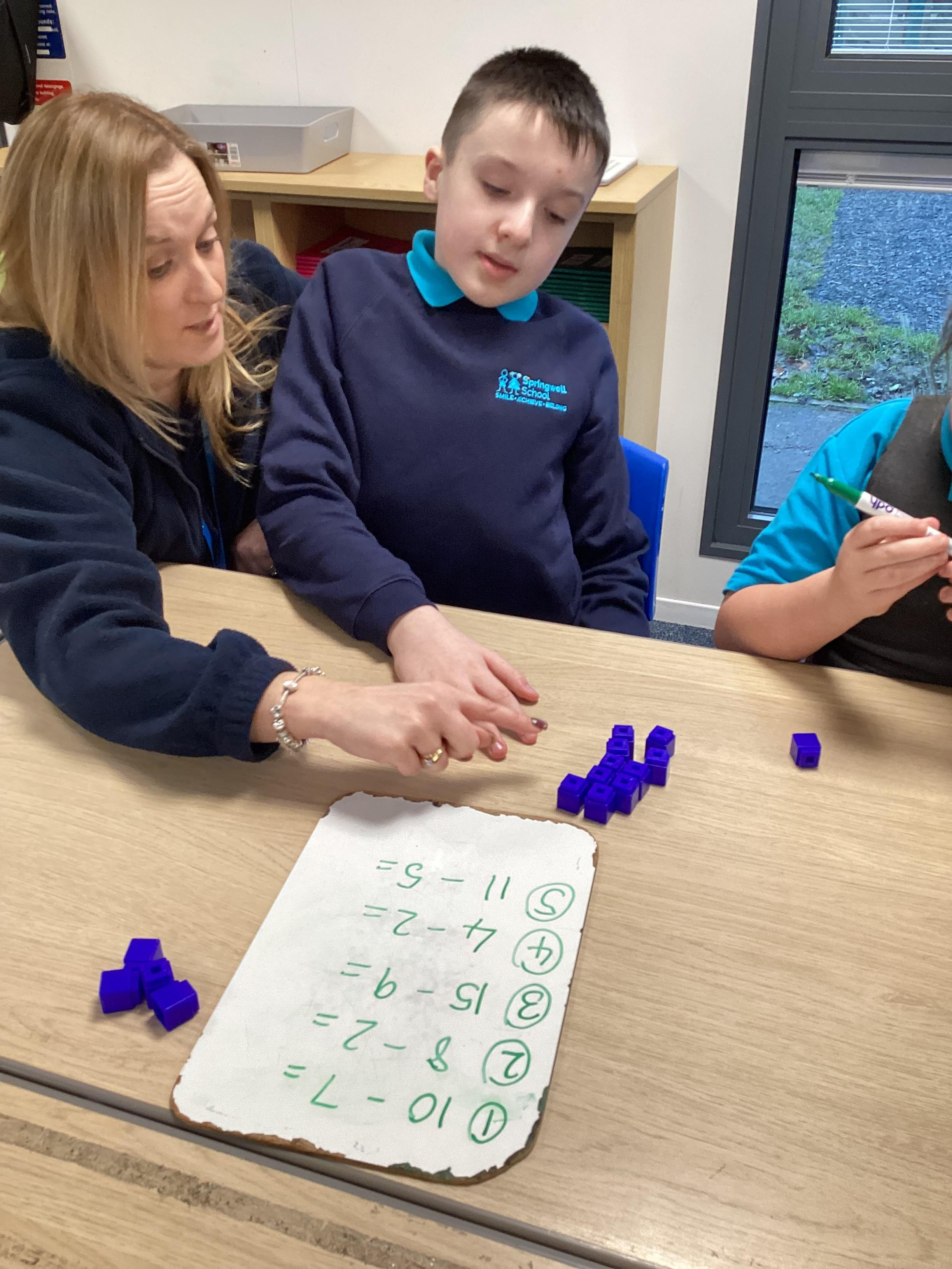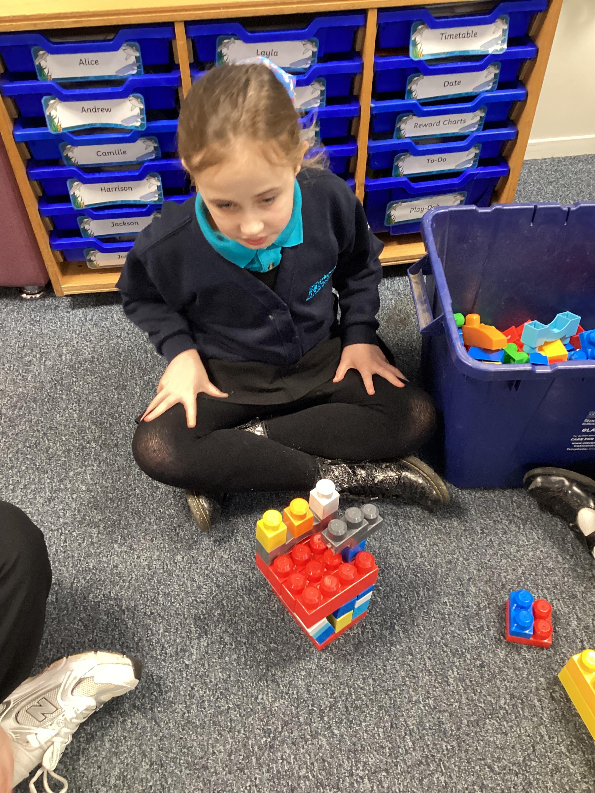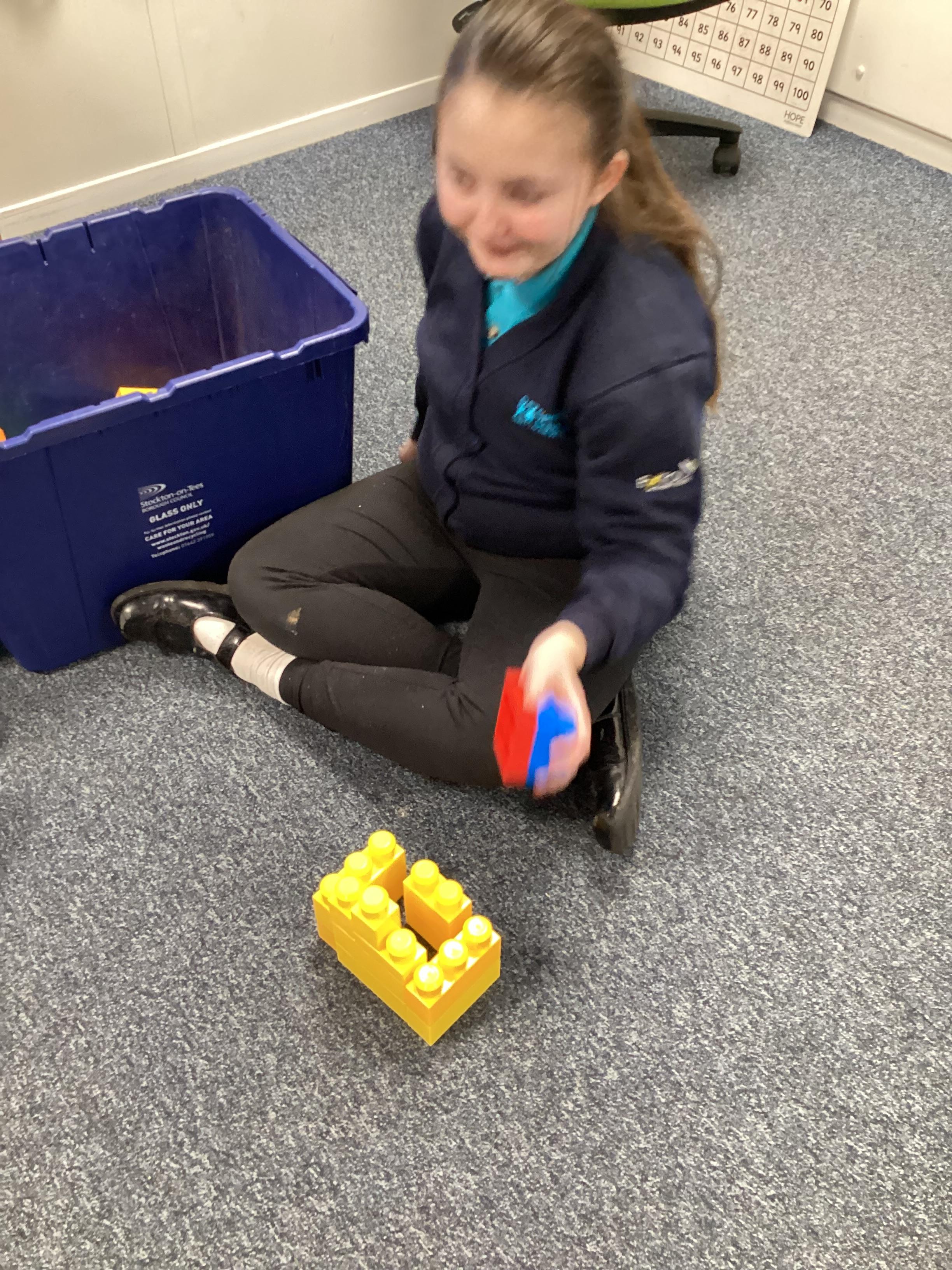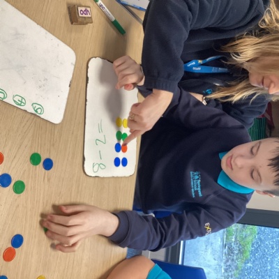 In Maths today, we have been working out subtraction sums by using concrete objects (cubes). We counted the whole, took away so many and counted how many were left.