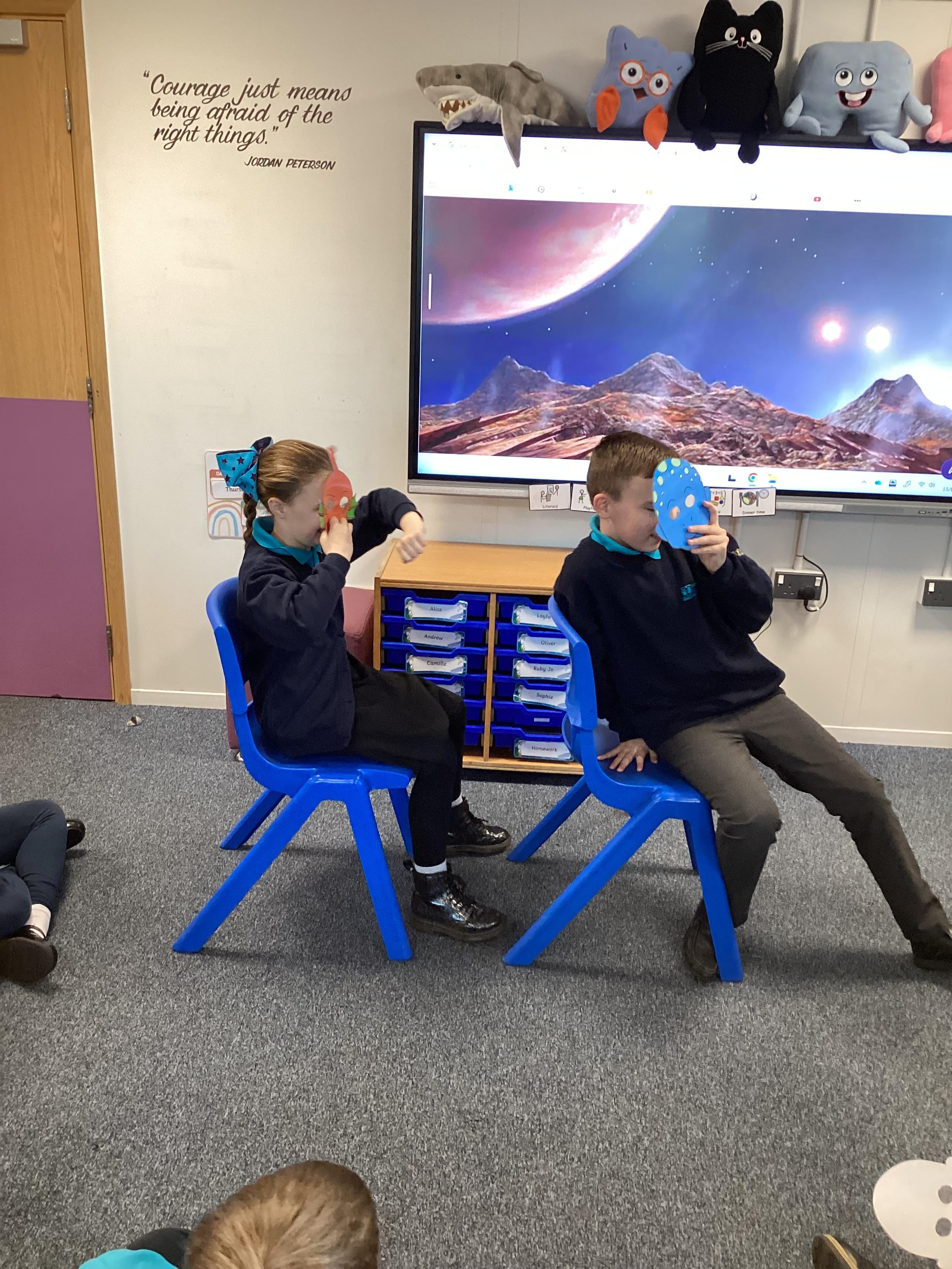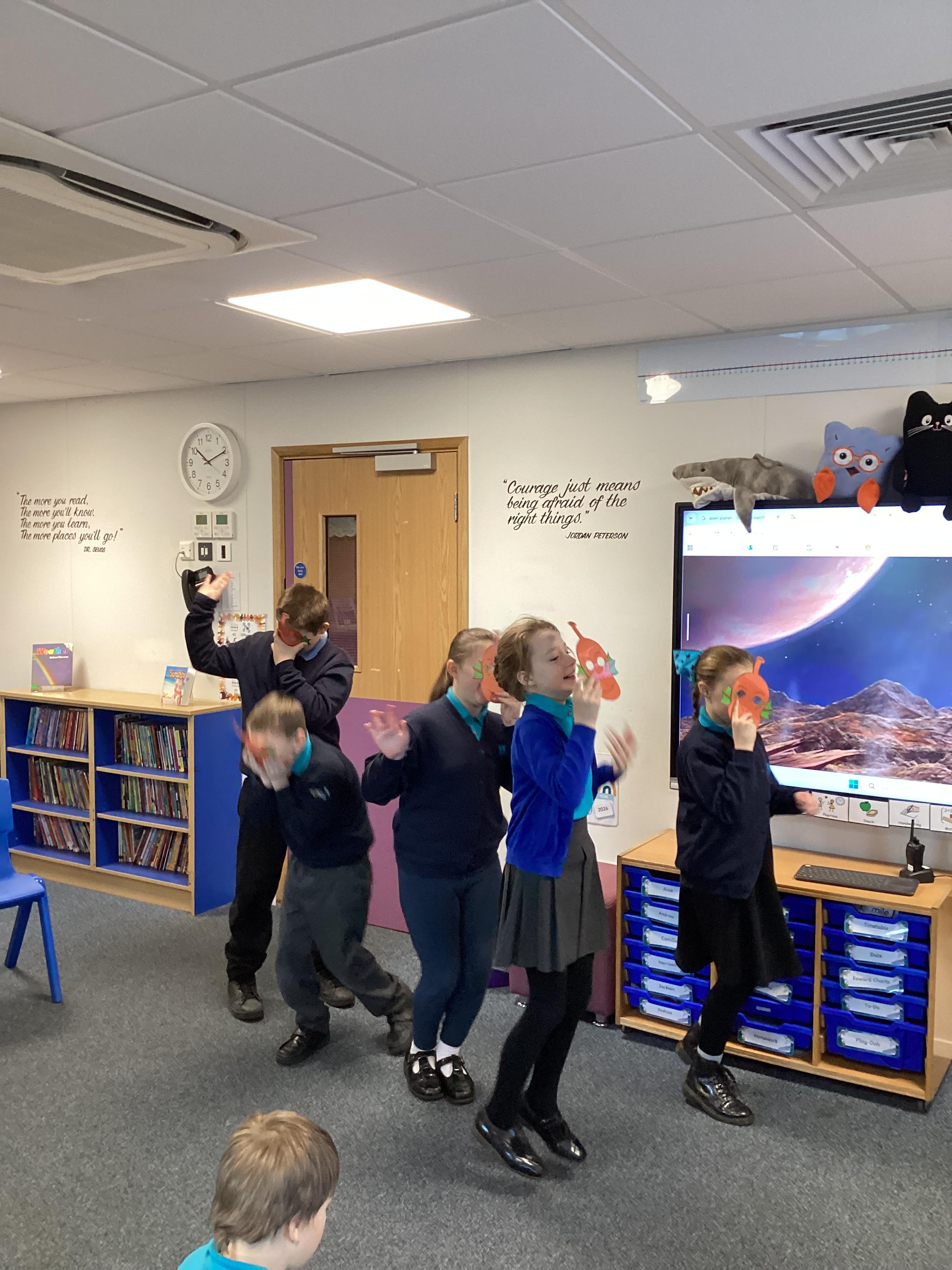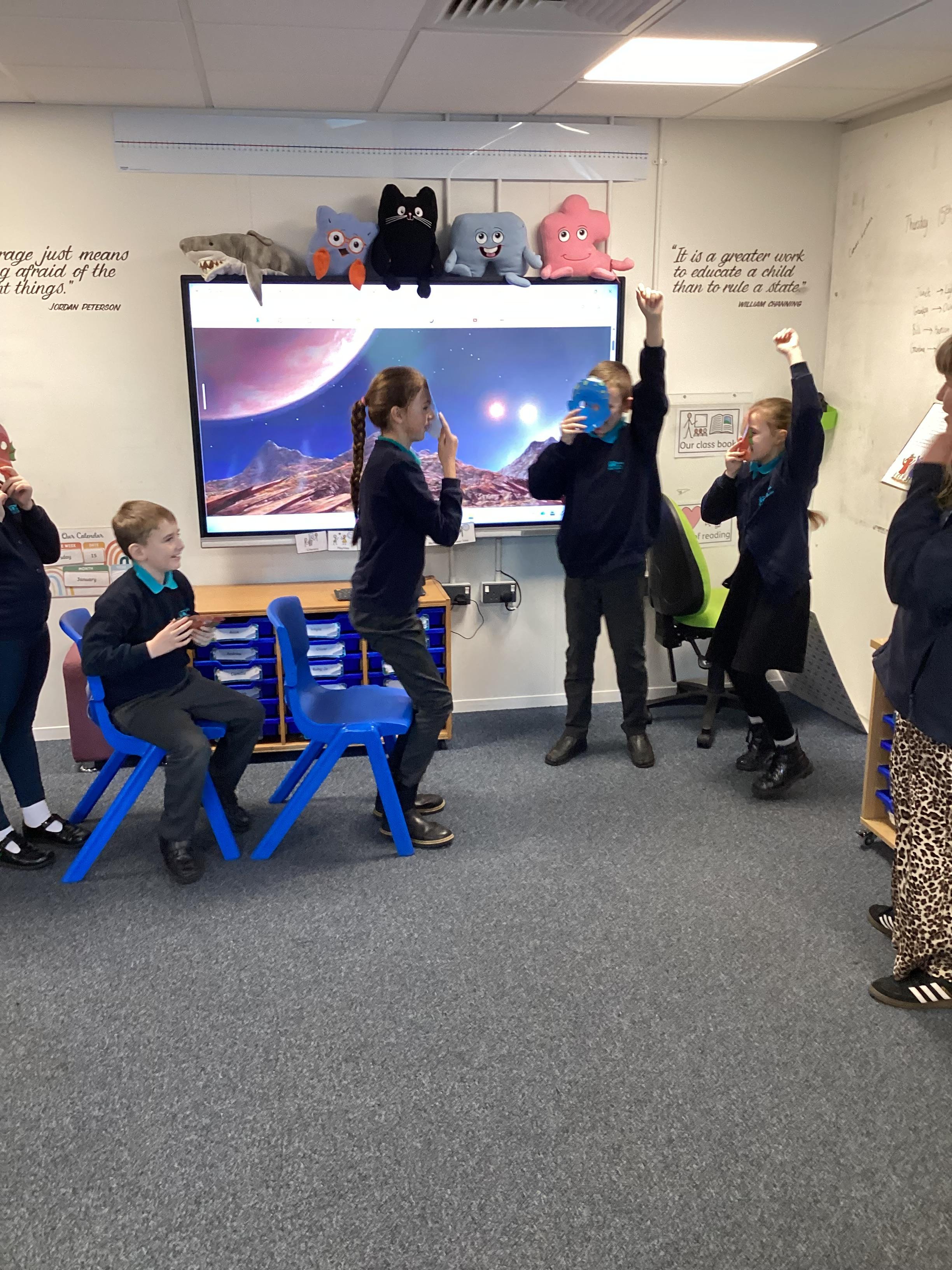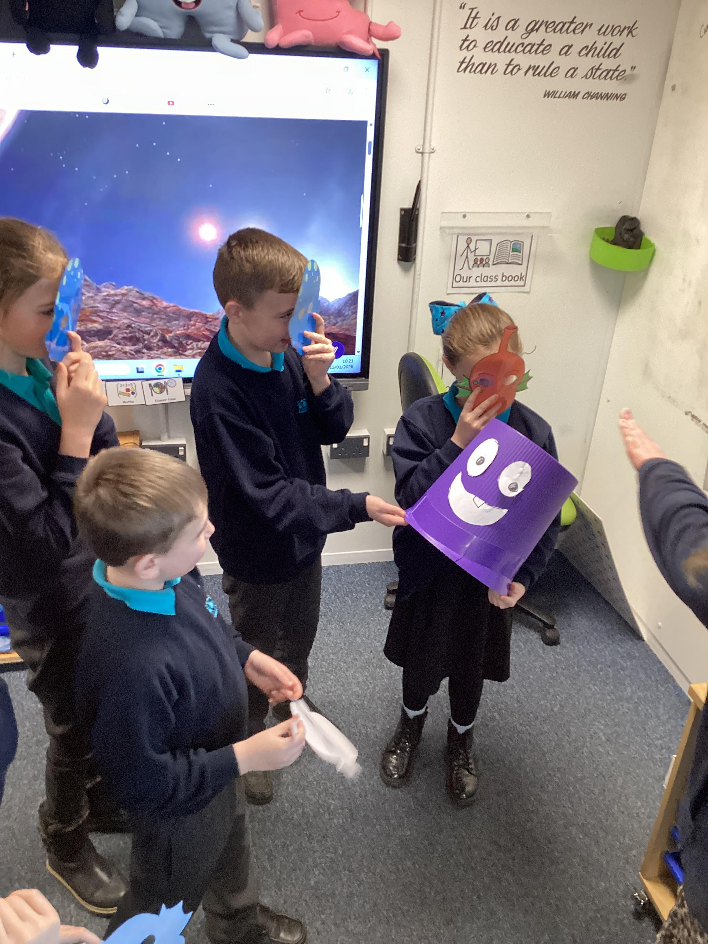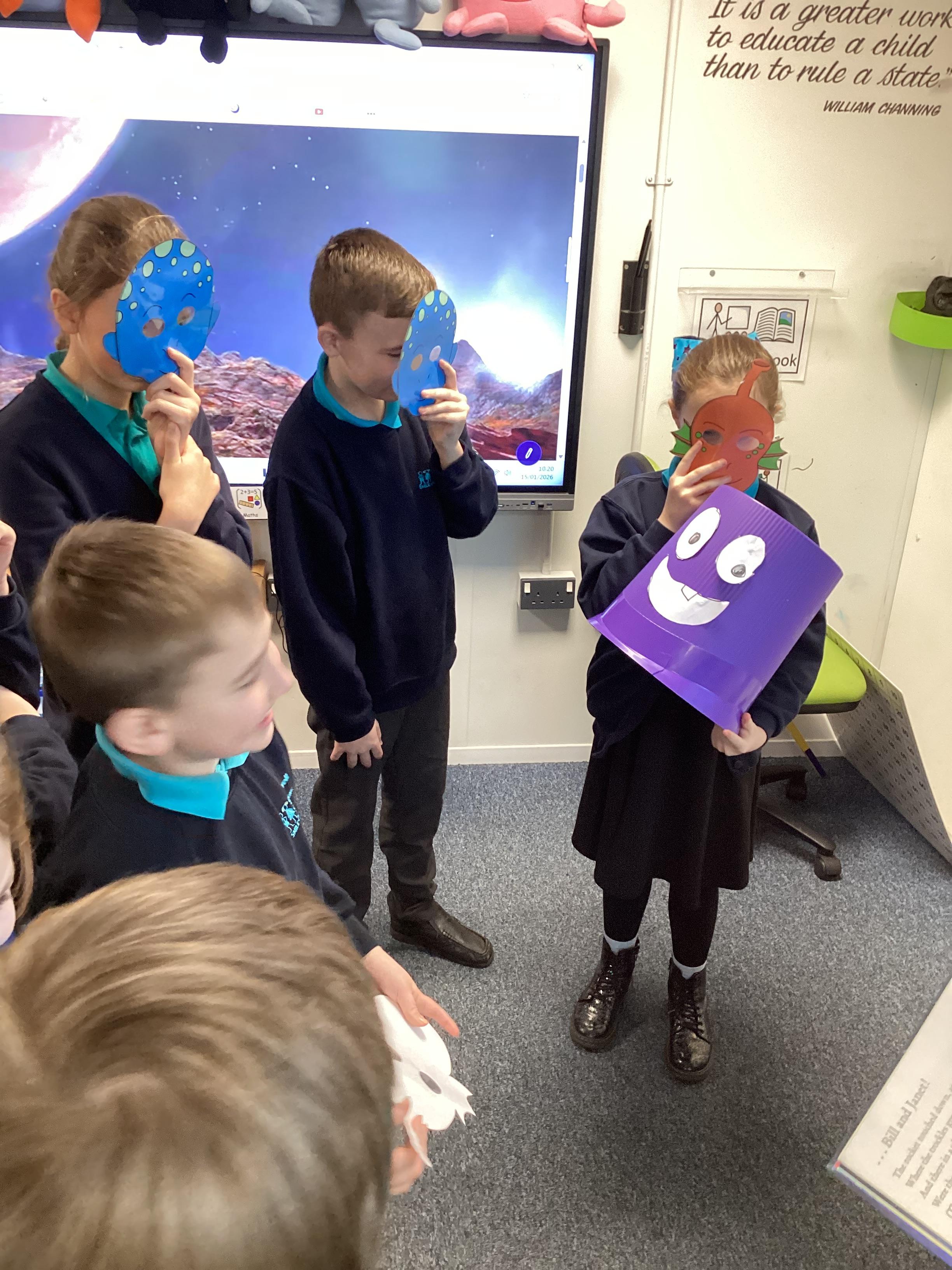 In PE today, we had LOTS of fun. Our topic is 'Expressive Movements' and we've been learning about different ways to move our bodies to tell a story. Today we imagined that we had just landed our rockets on the moon and that we found aliens.