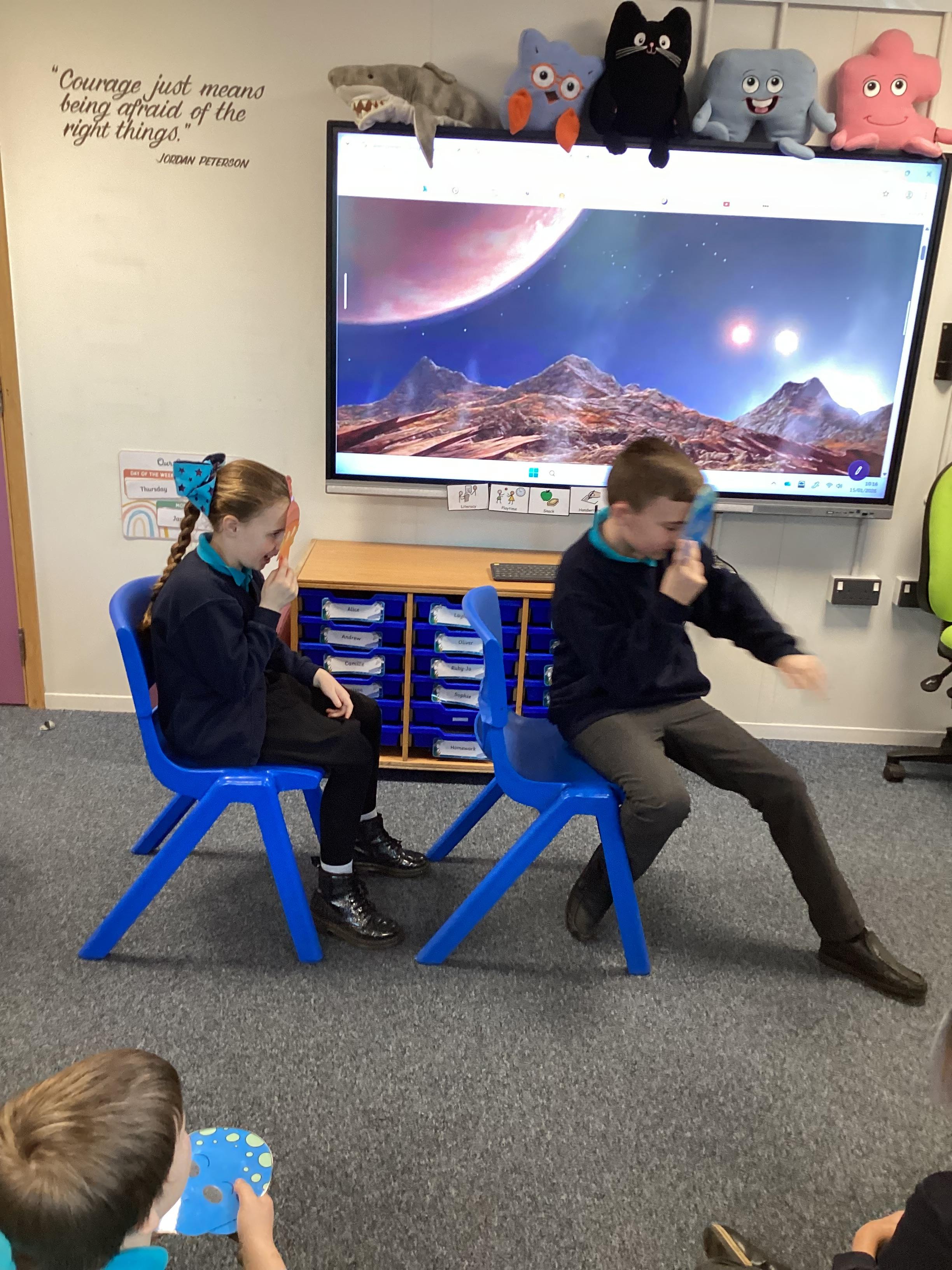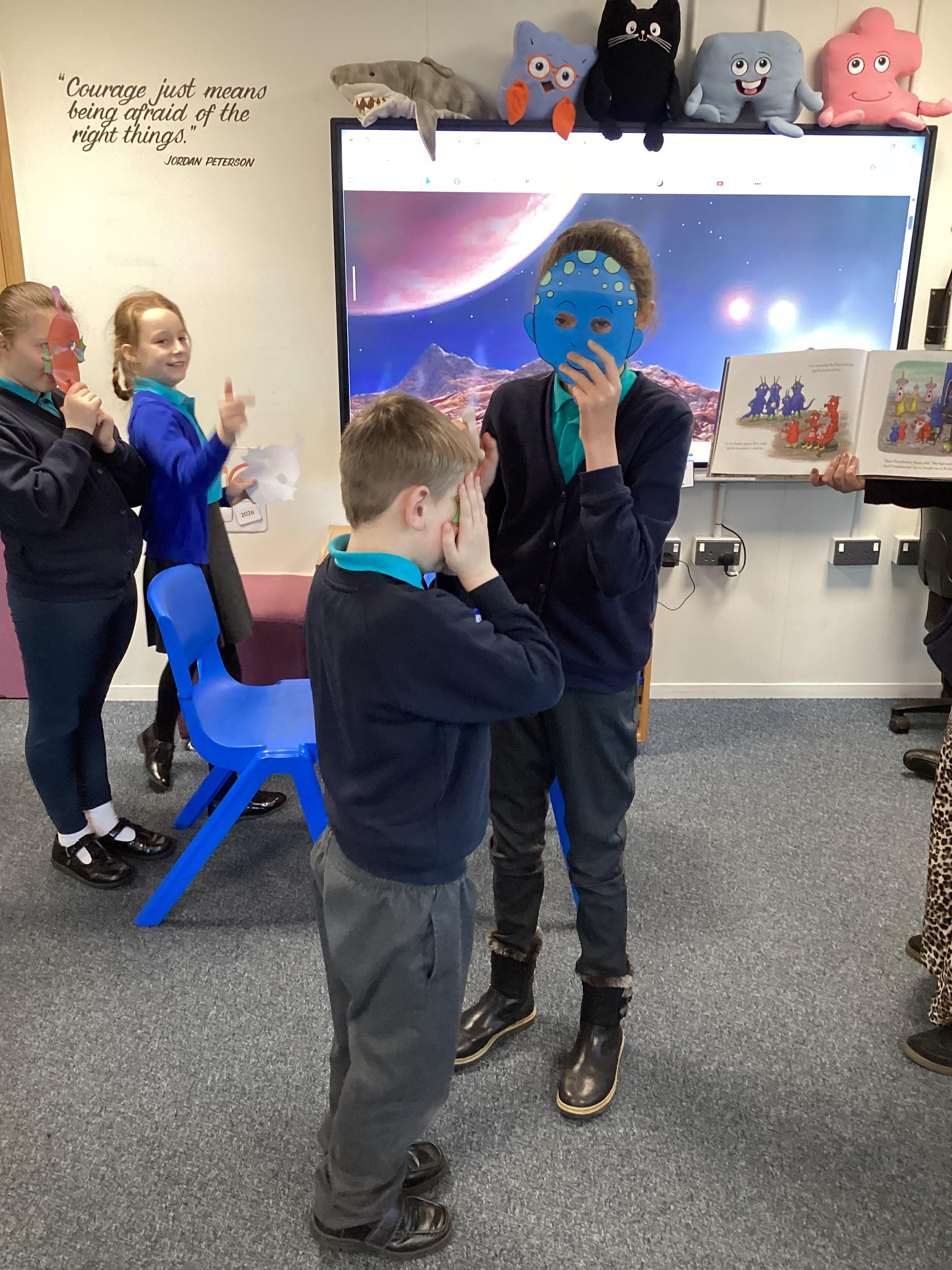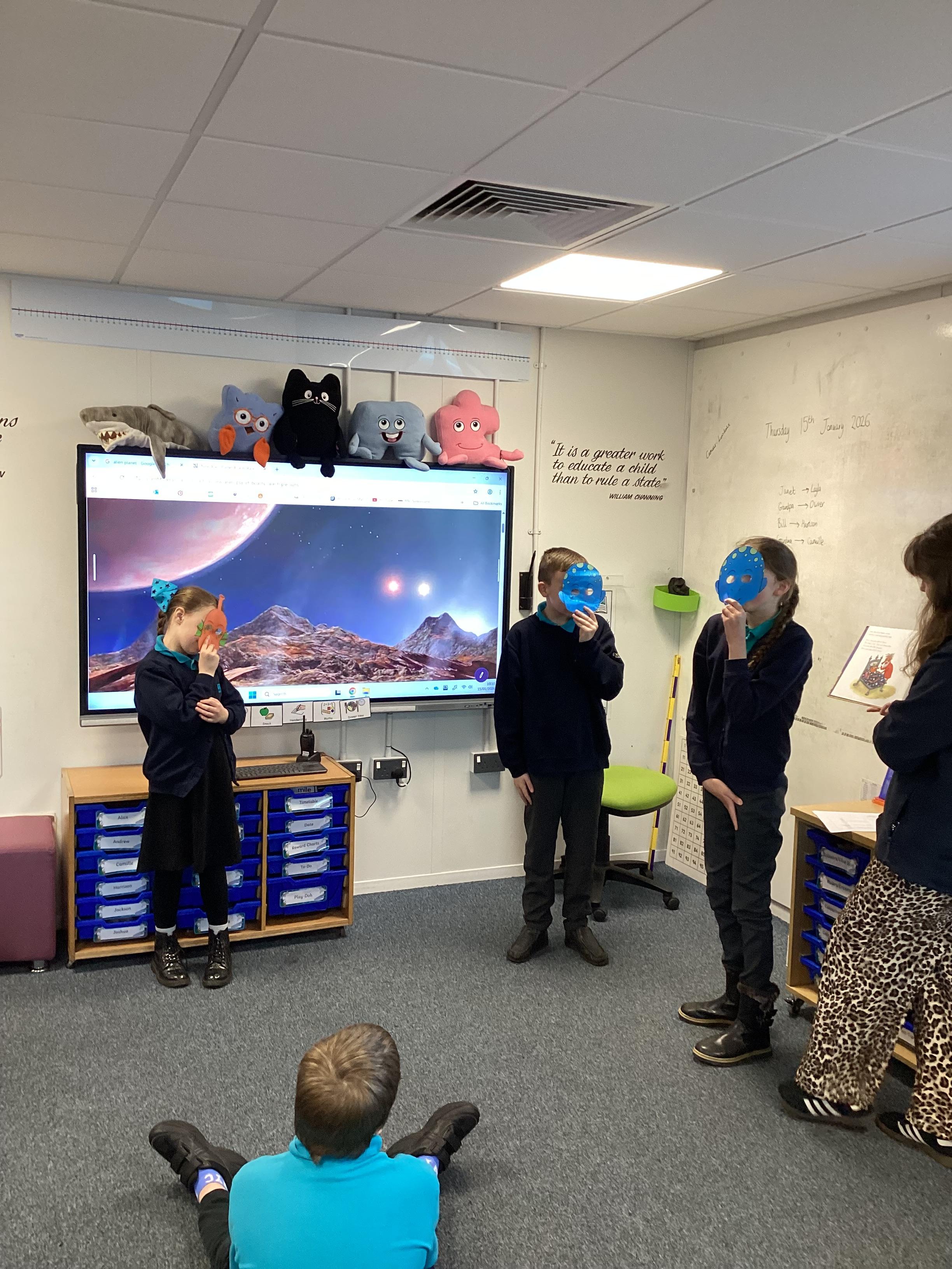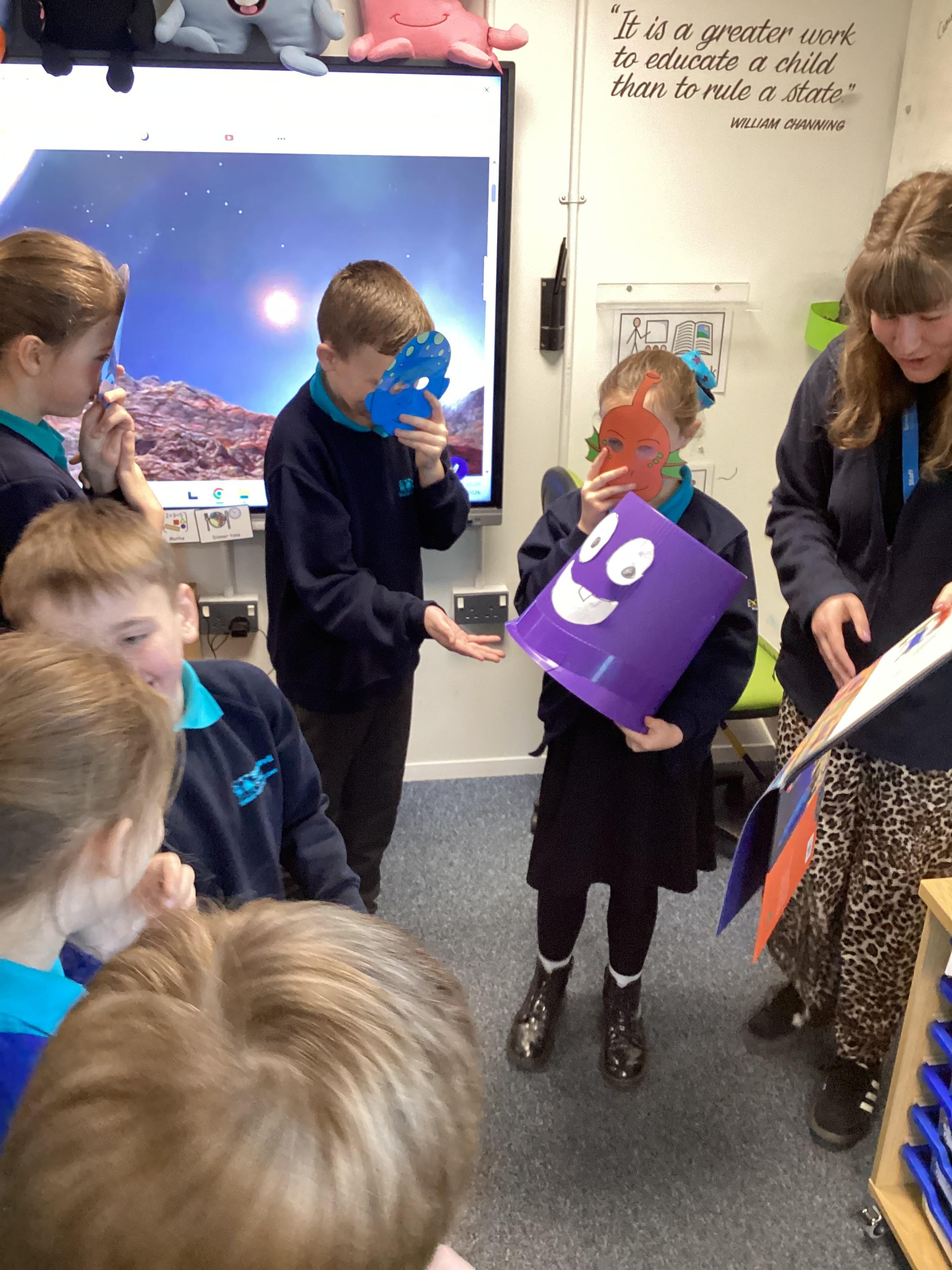 In PE today, we had LOTS of fun. Our topic is 'Expressive Movements' and we've been learning about different ways to move our bodies to tell a story. Today we imagined that we had just landed our rockets on the moon and that we found aliens.