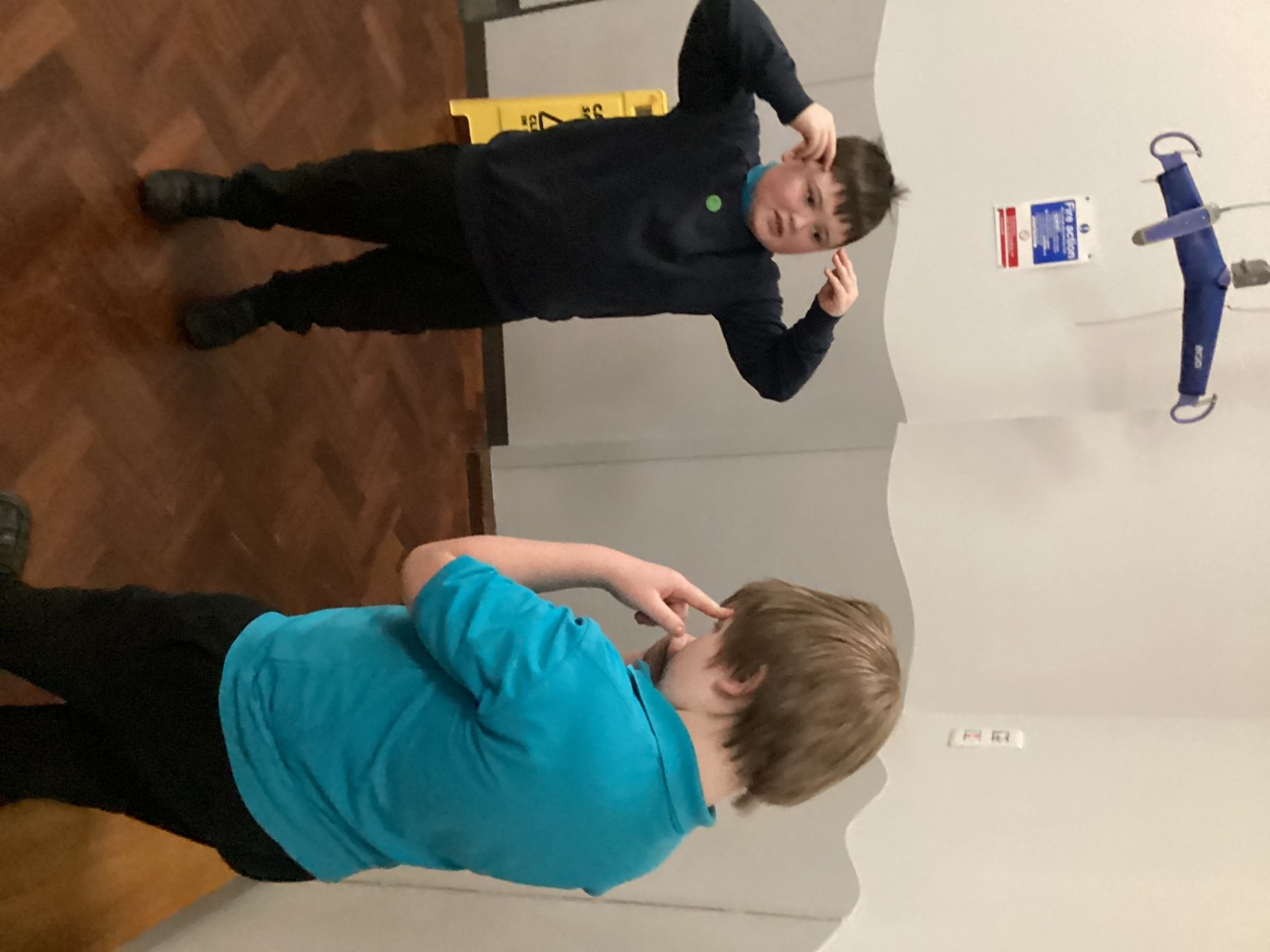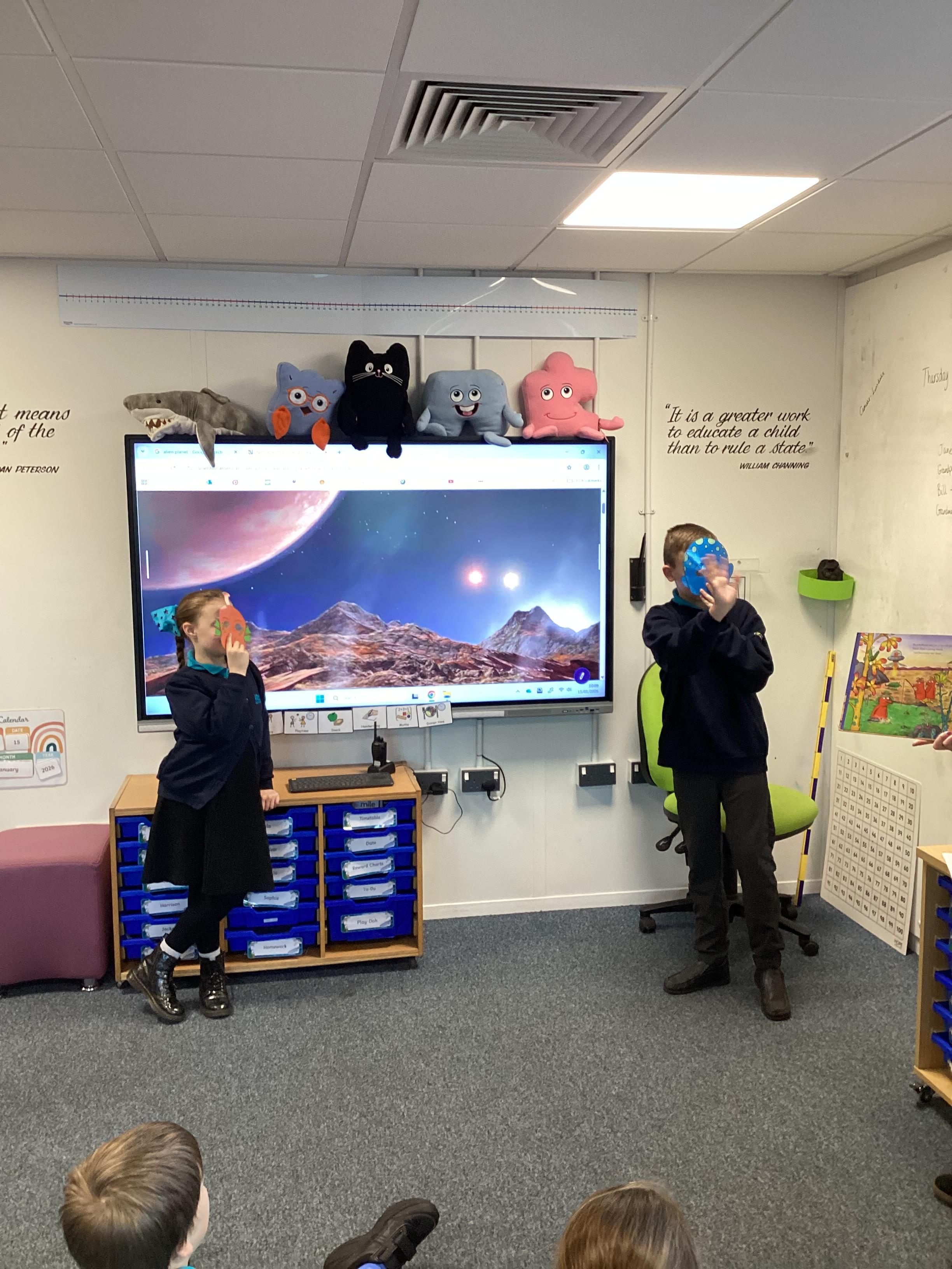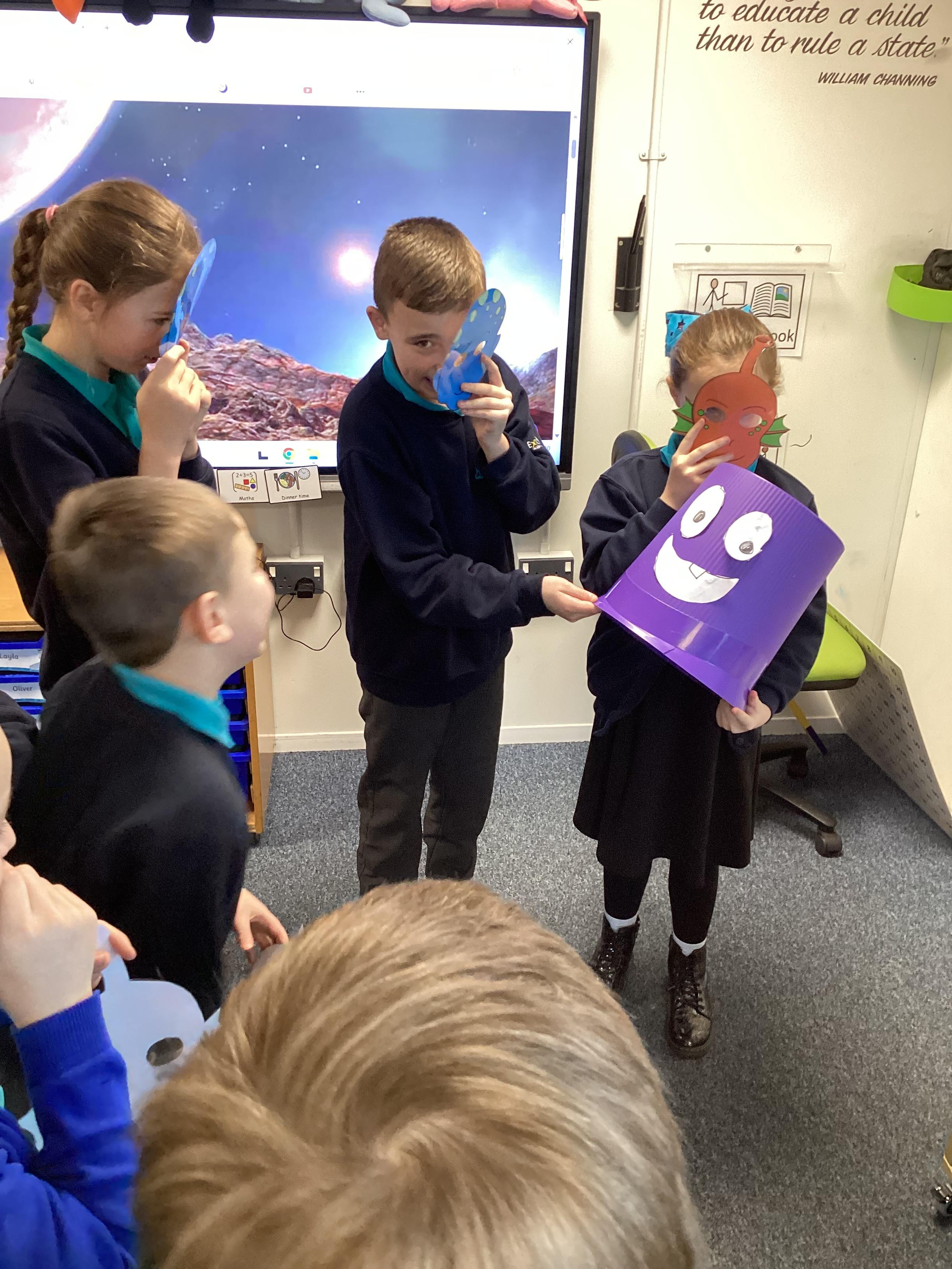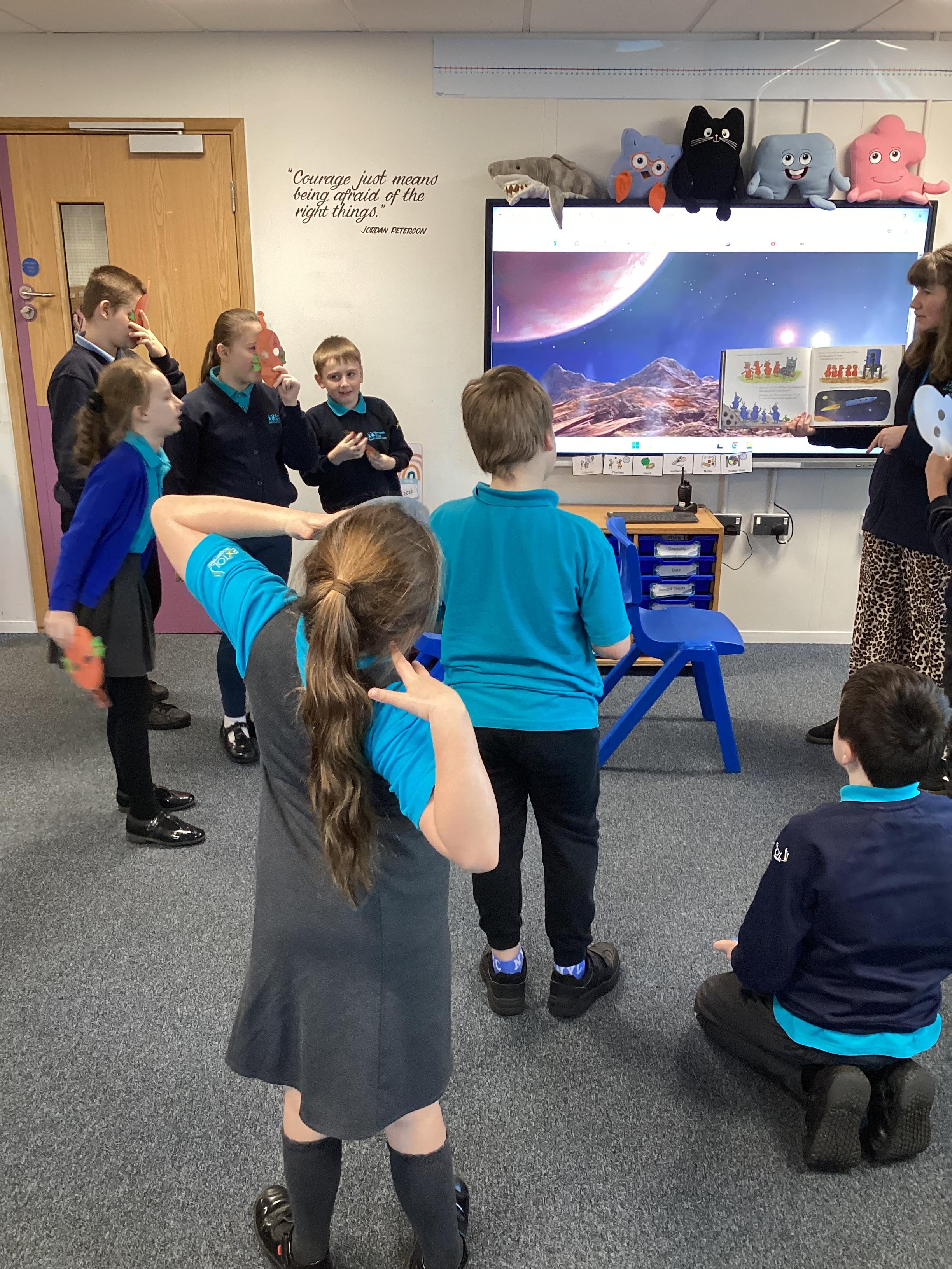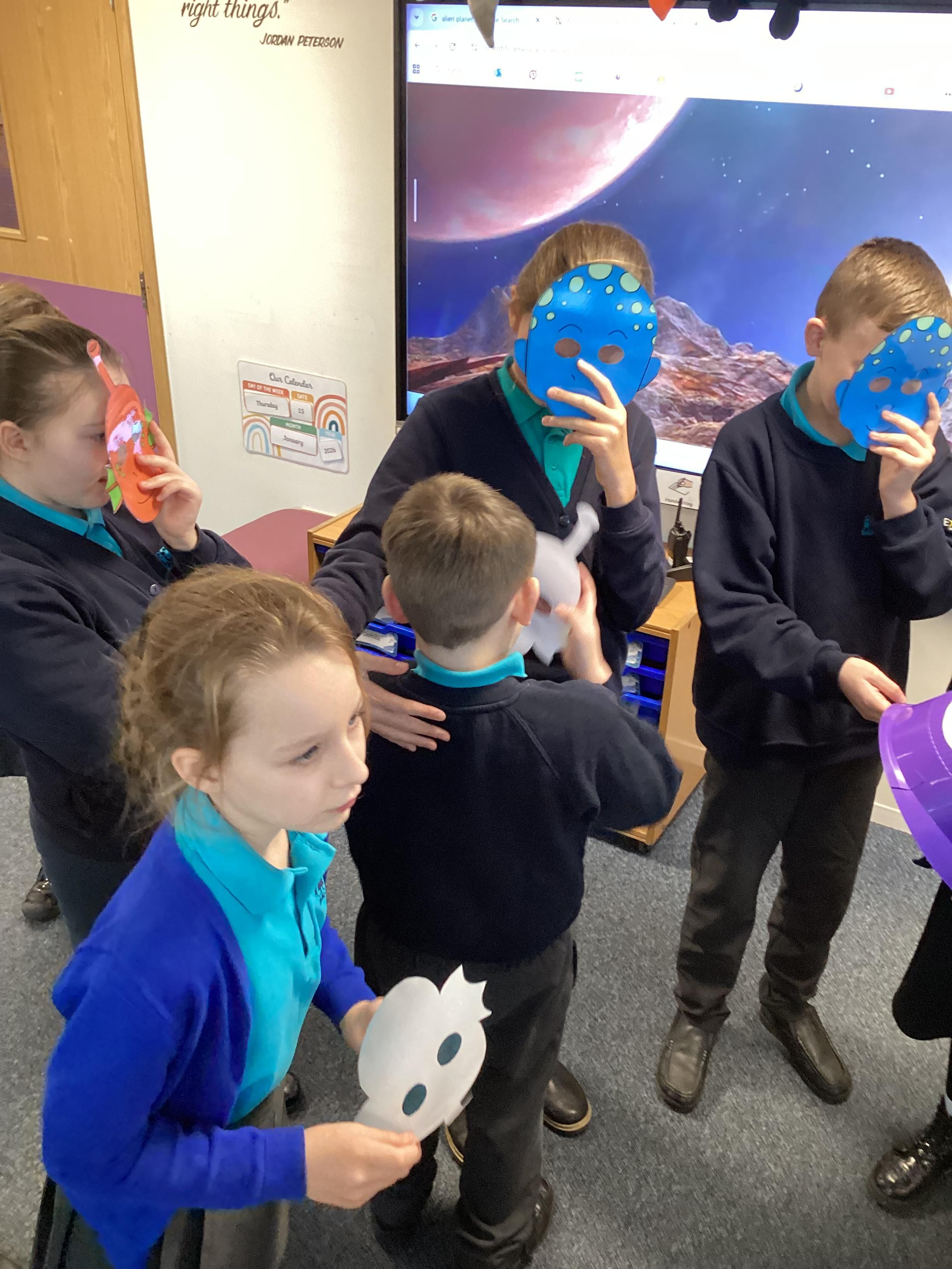 In PE today, we had LOTS of fun. Our topic is 'Expressive Movements' and we've been learning about different ways to move our bodies to tell a story. Today we imagined that we had just landed our rockets on the moon and that we found aliens.