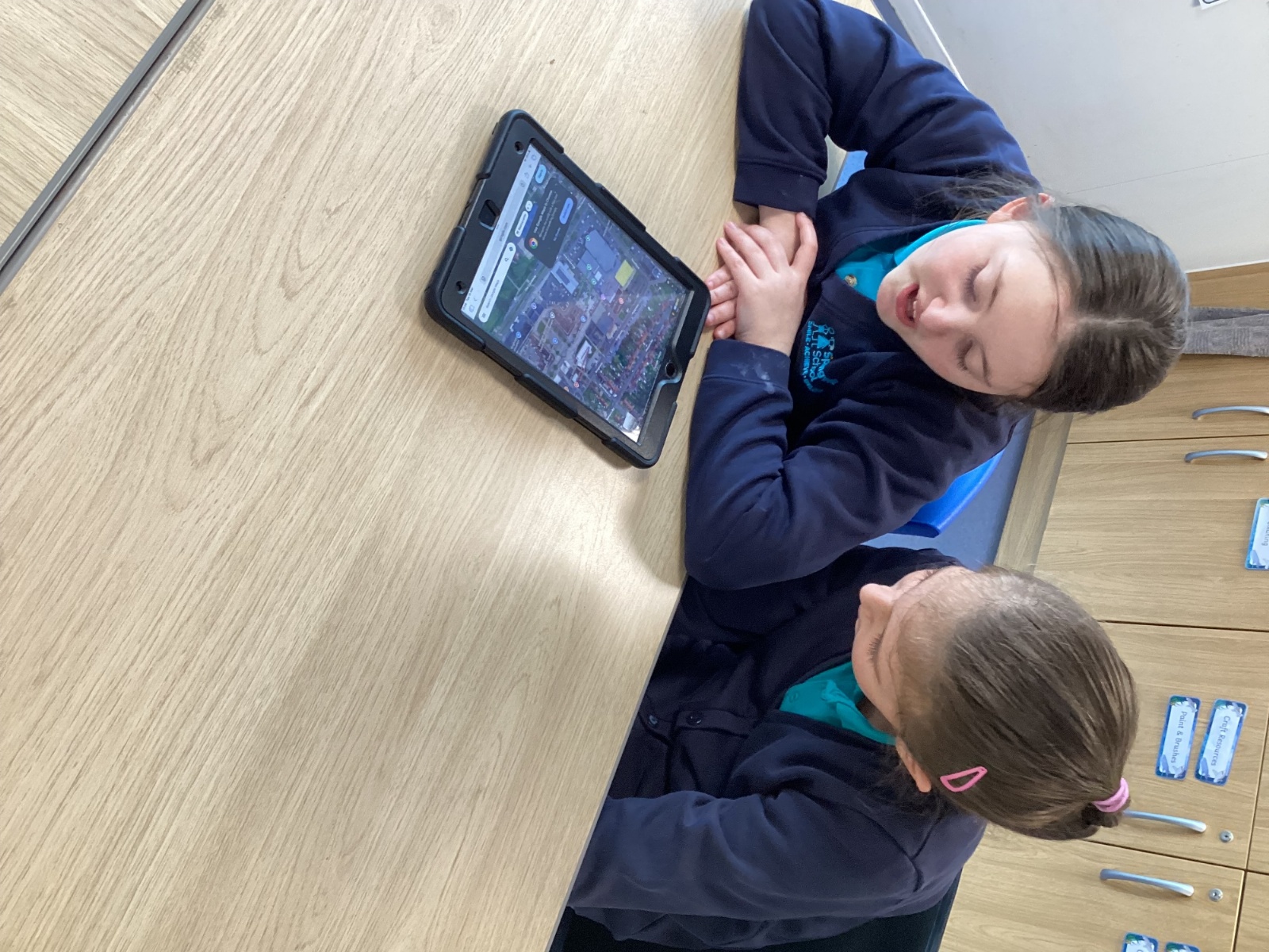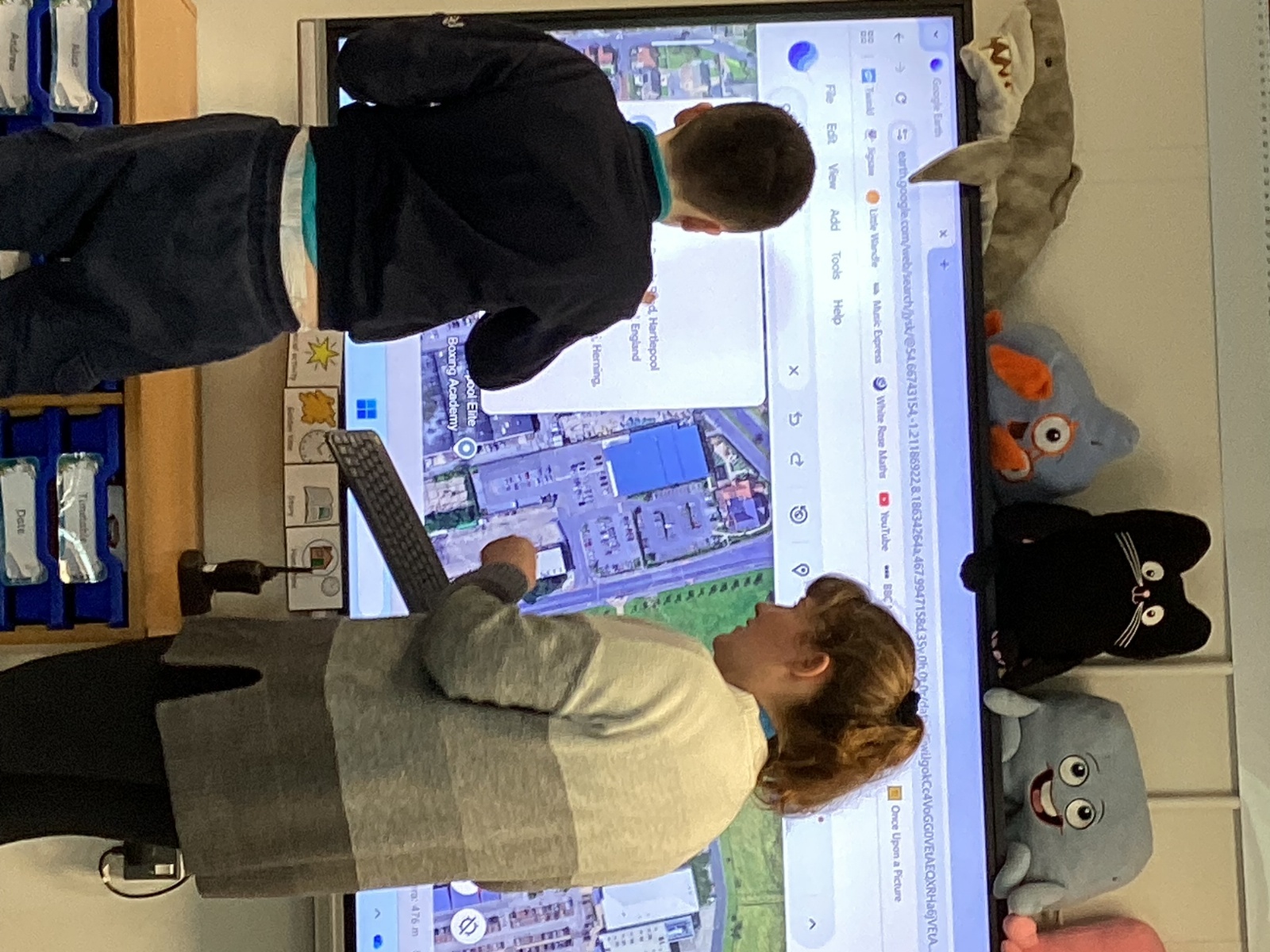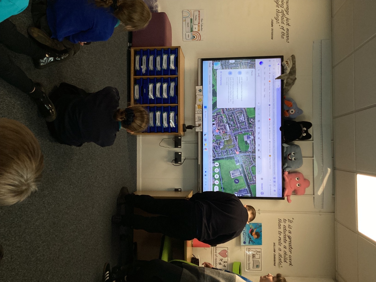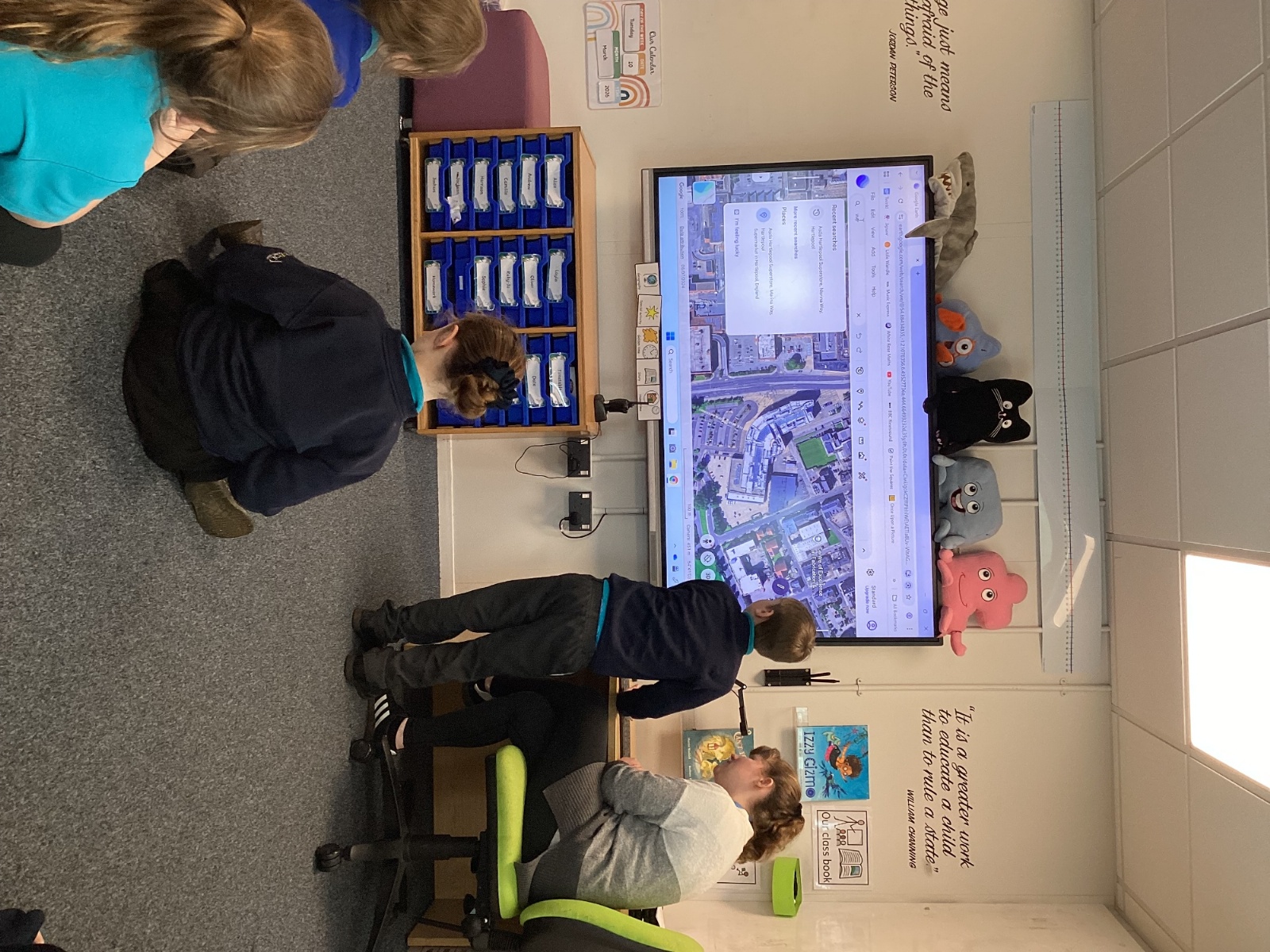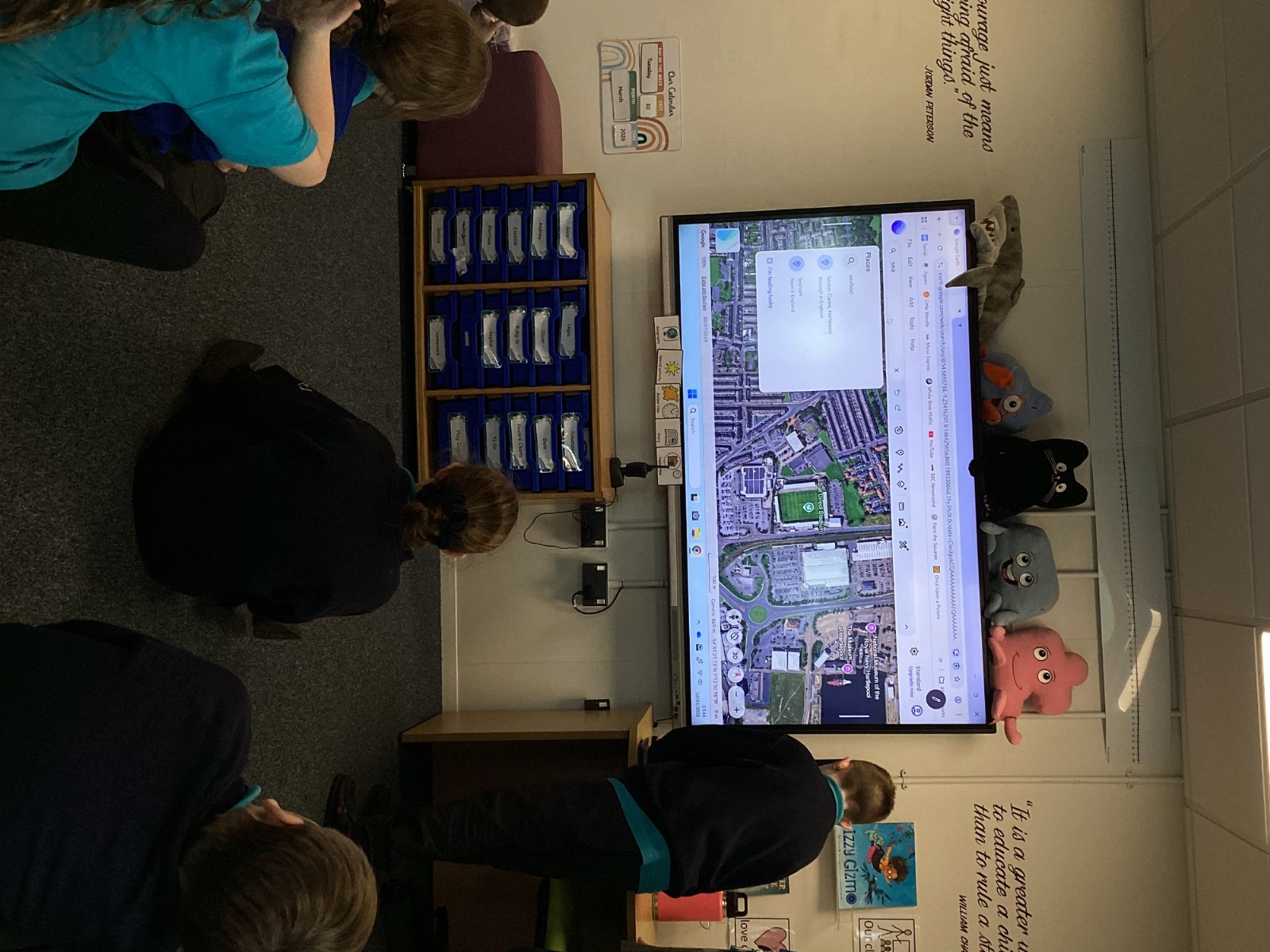 In Geography today, we looked at Google Maps and Google Earth. We looked at places we have visited and what is around them. The children then worked in pairs on iPads to find some familiar places (shops, Mill House, school etc).