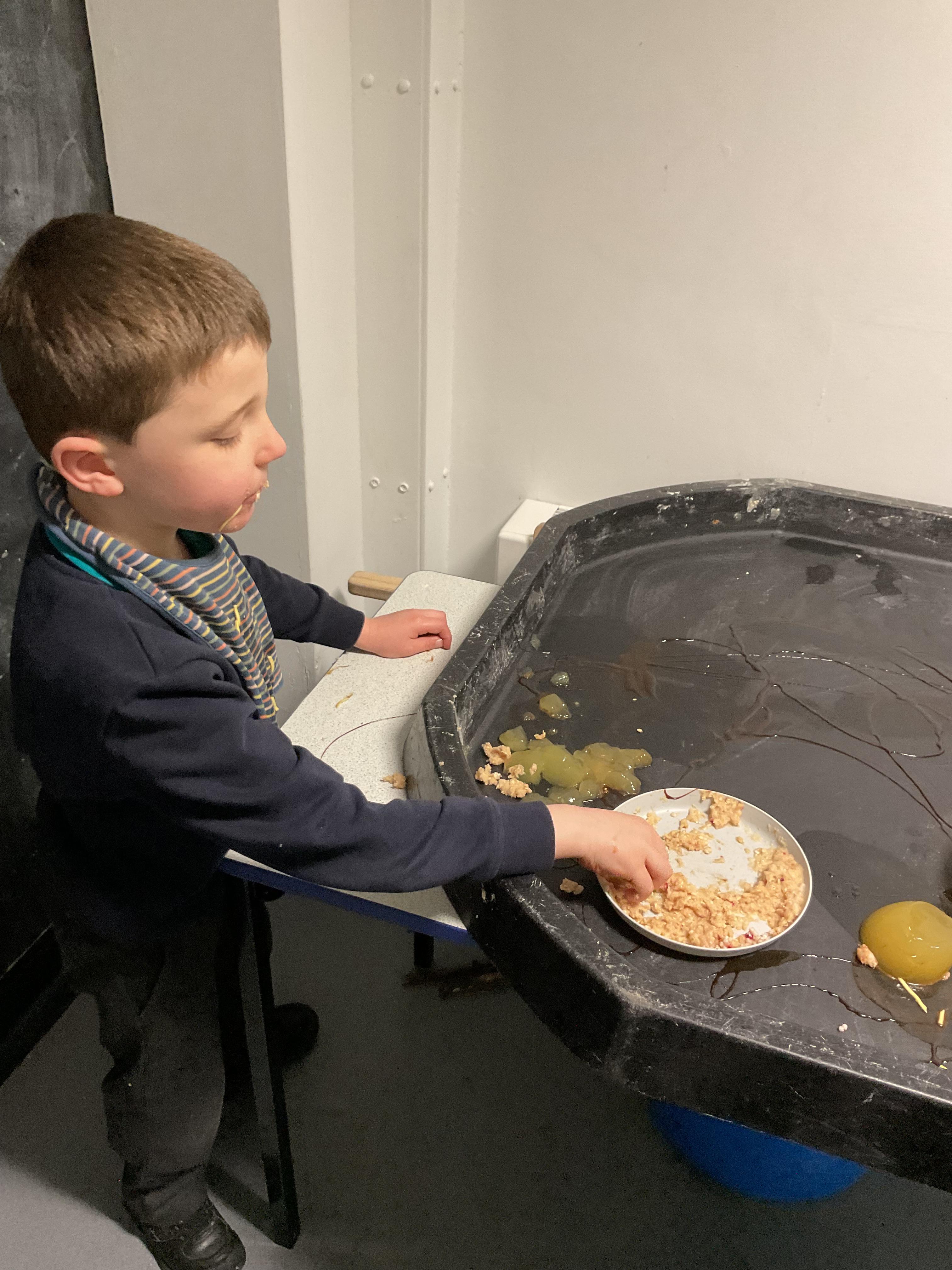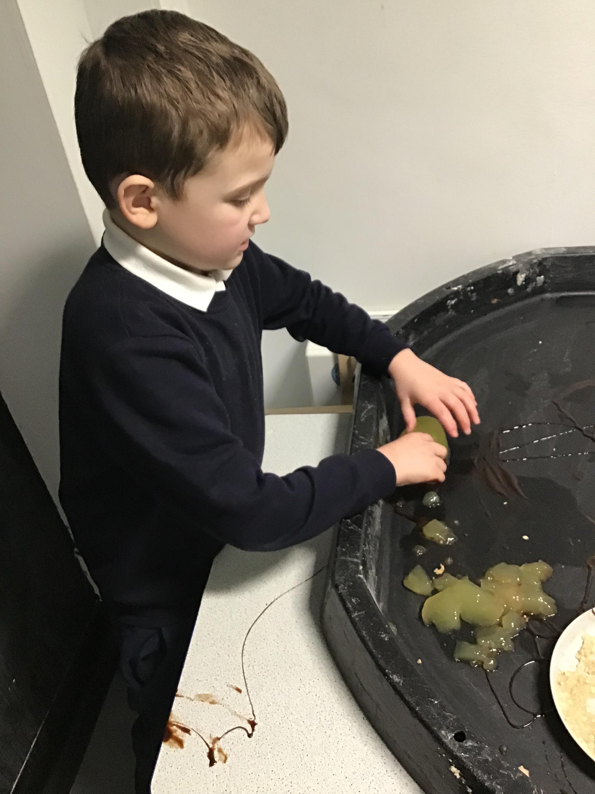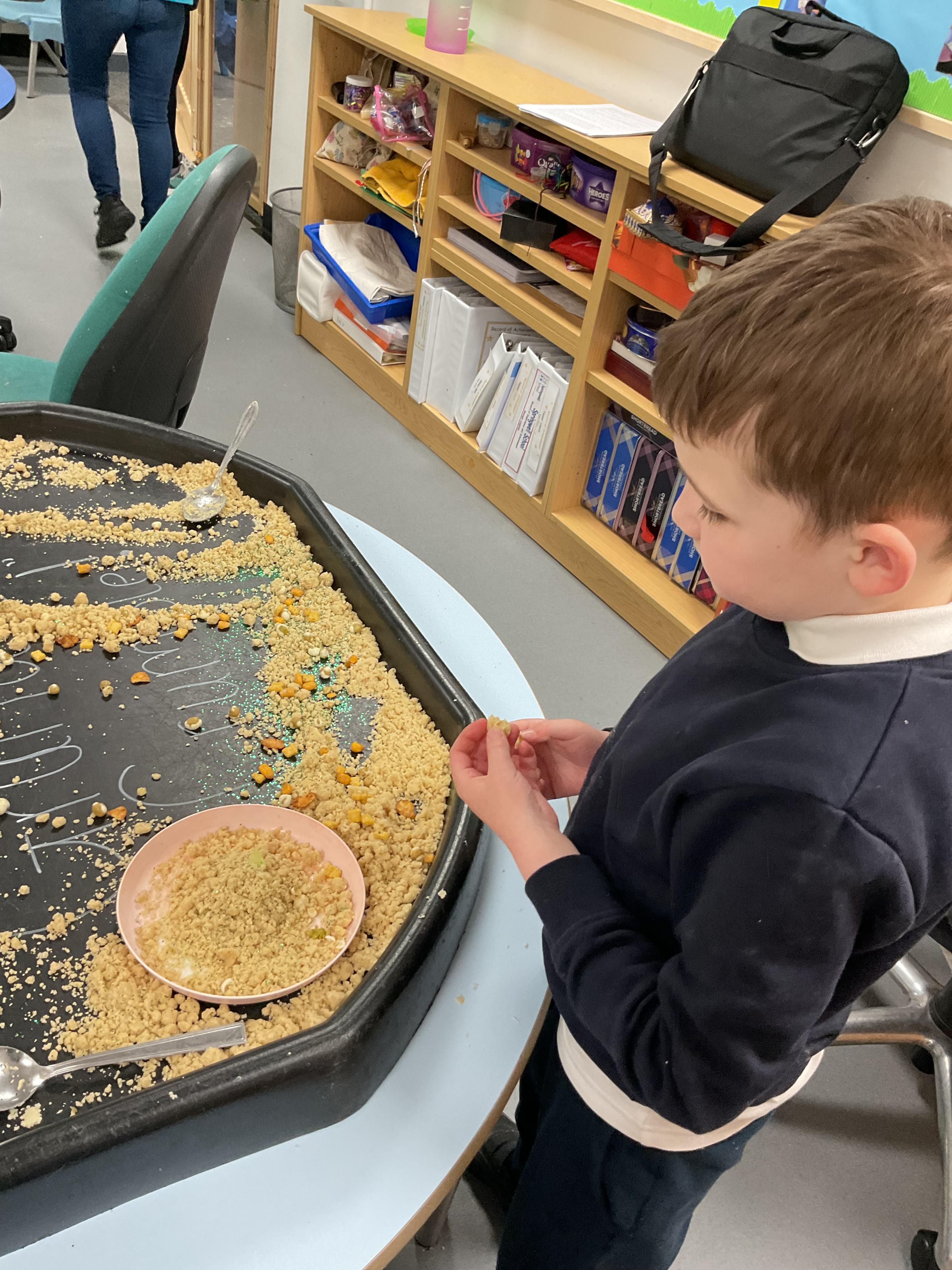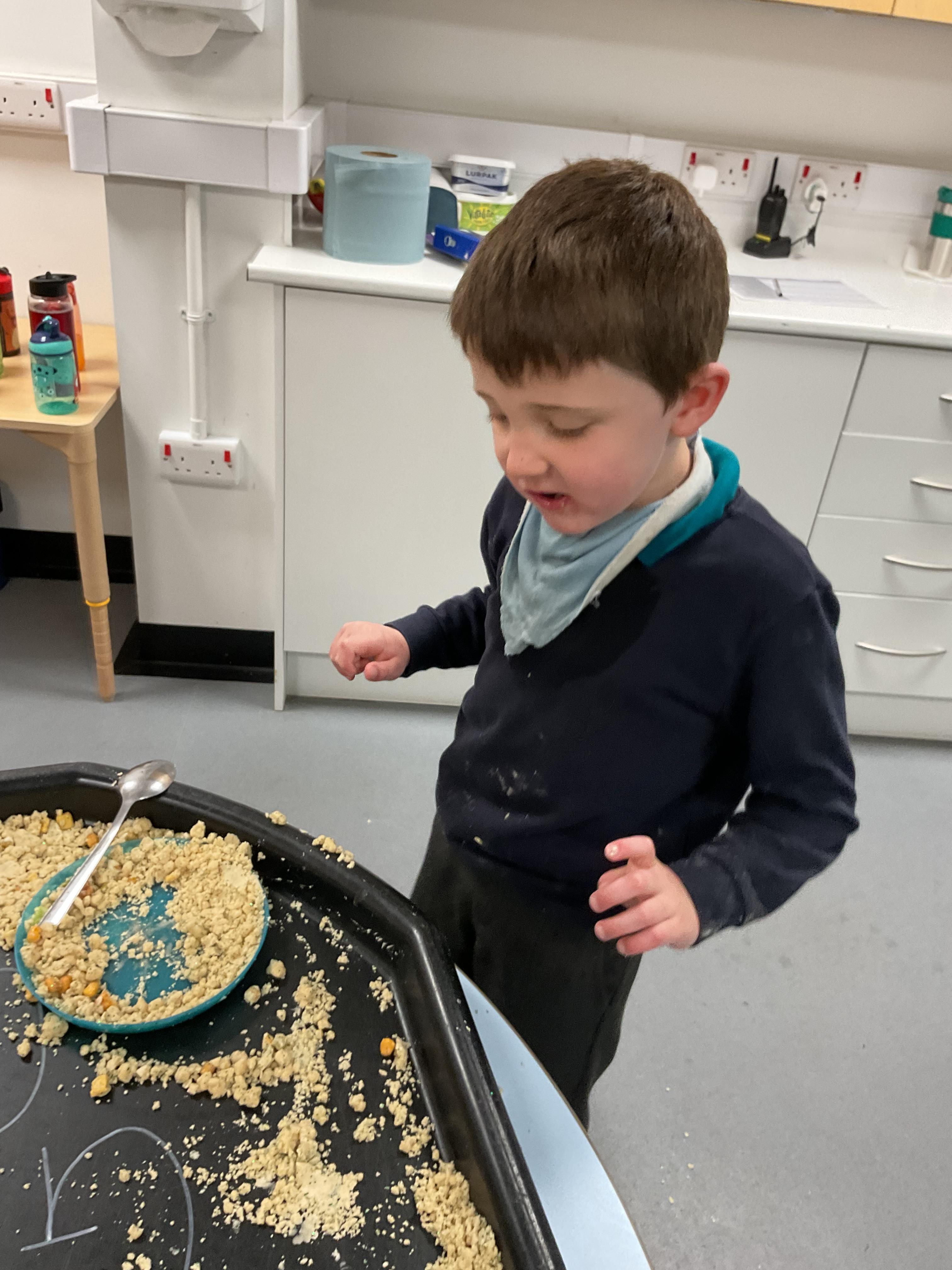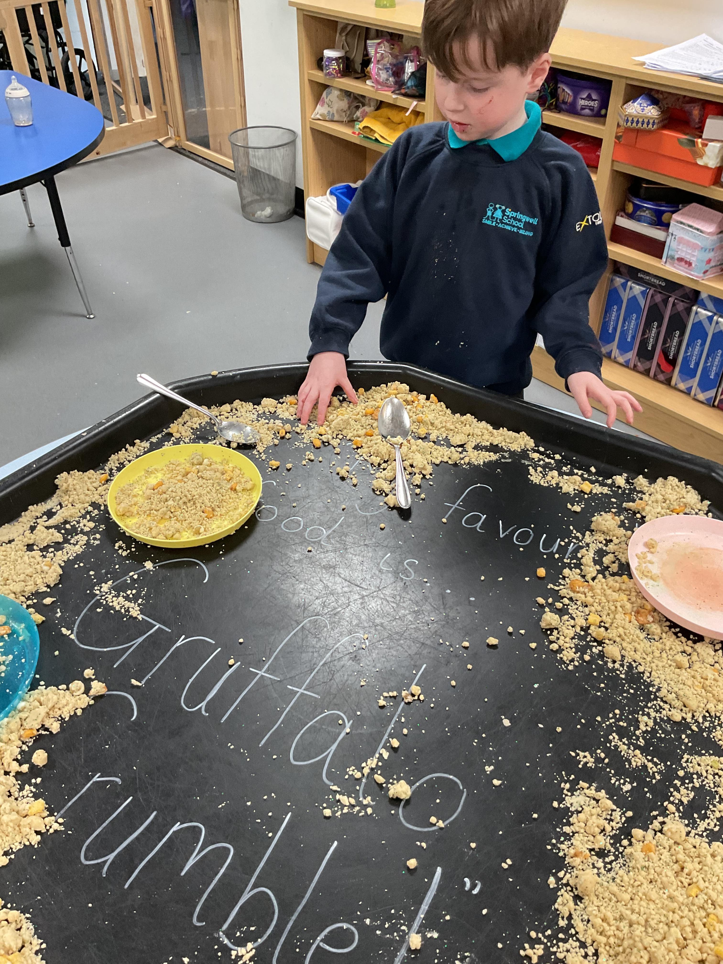 Over the last two weeks of term we enjoyed exploring our story of the week in an interactive way. All of the children enjoyed using their senses as they explored the 'Gruffalo Crumble' alongside a variety of textures objects and food sources.