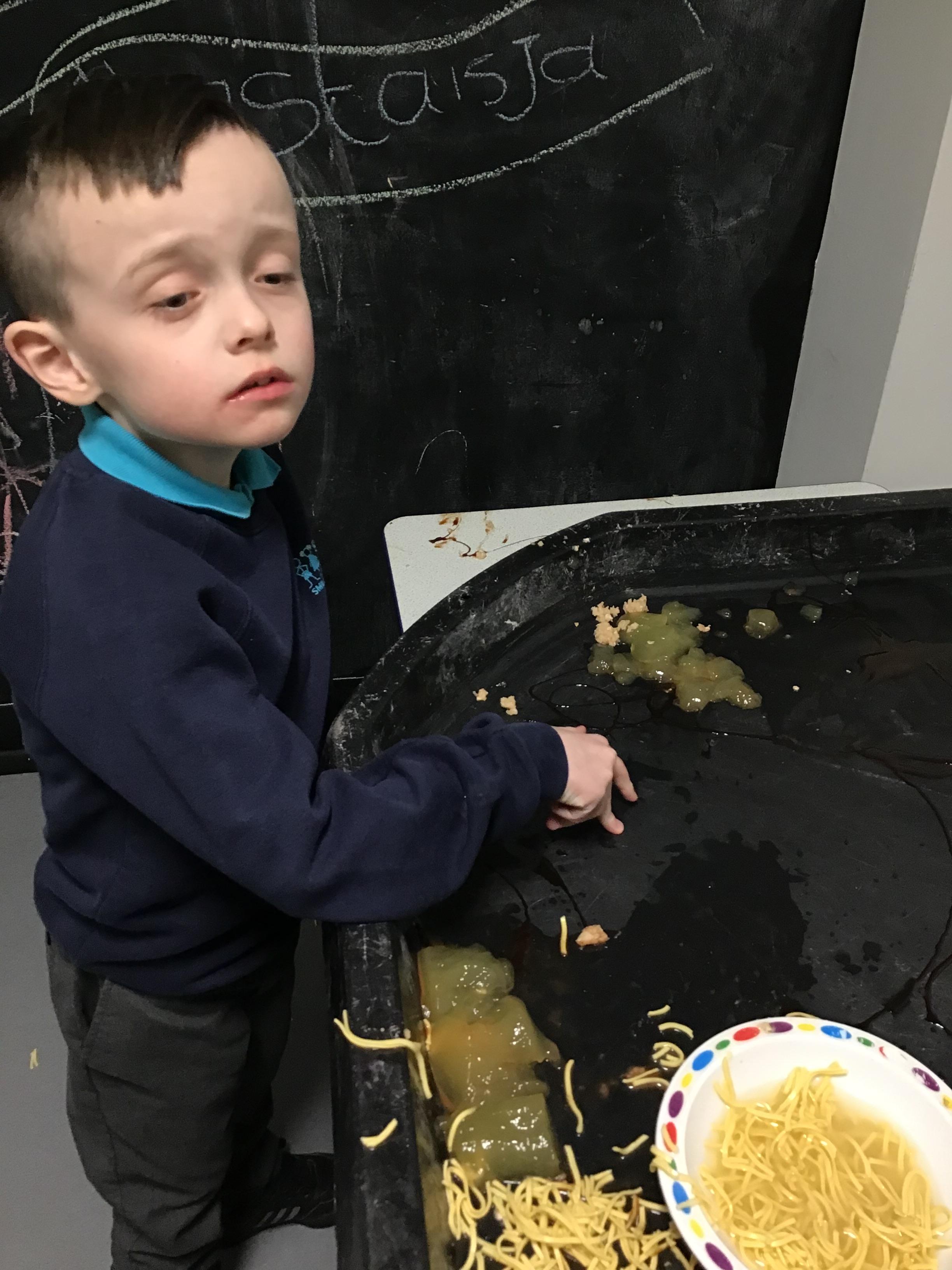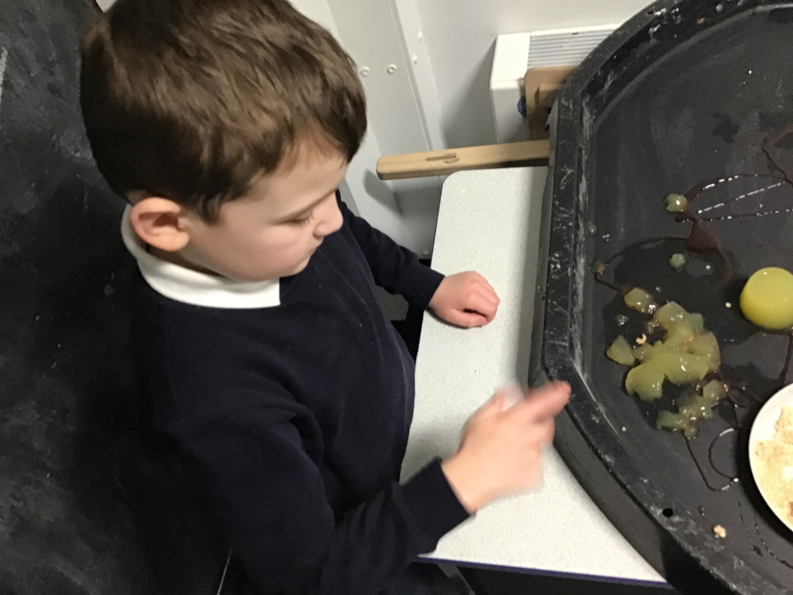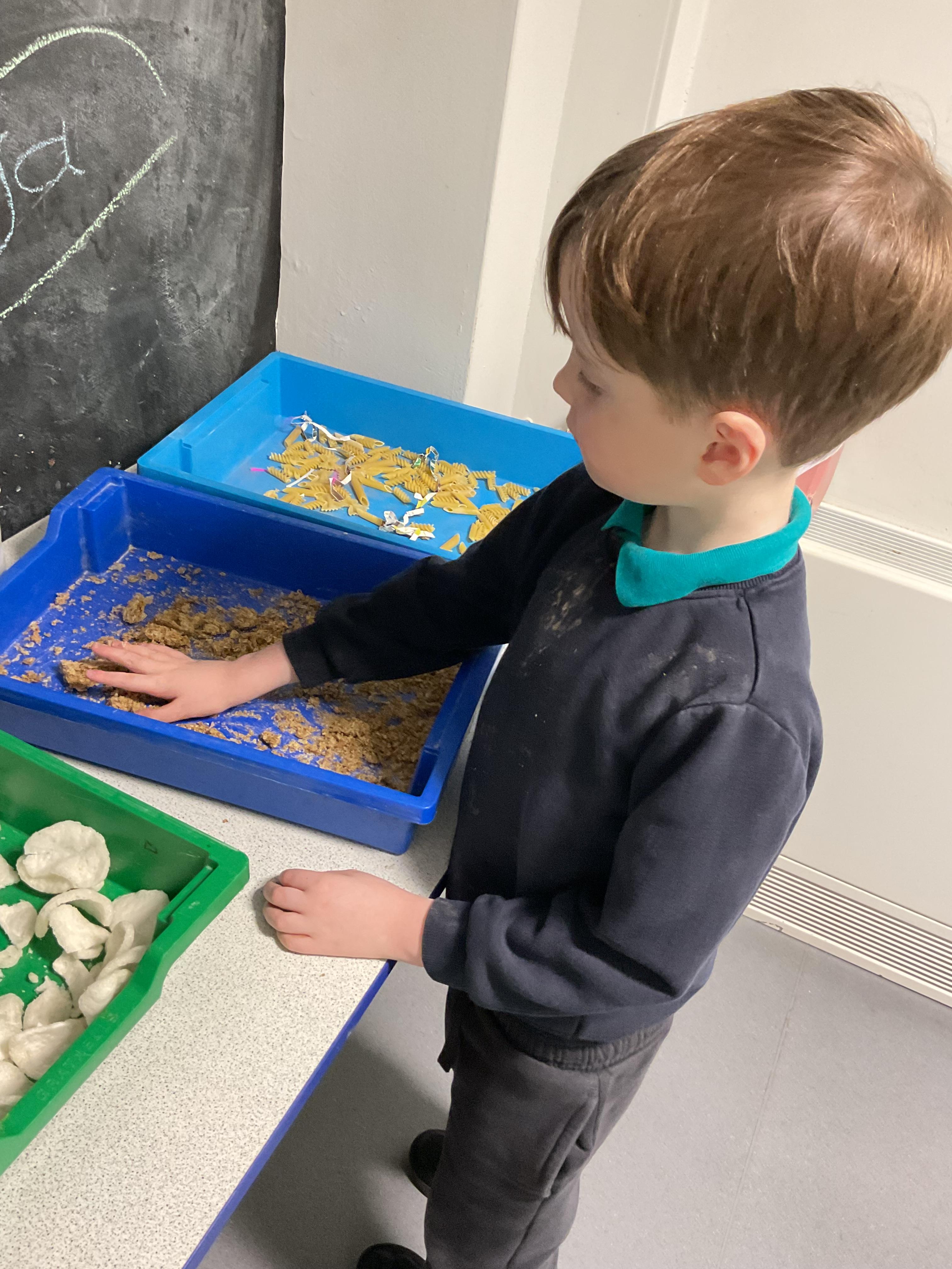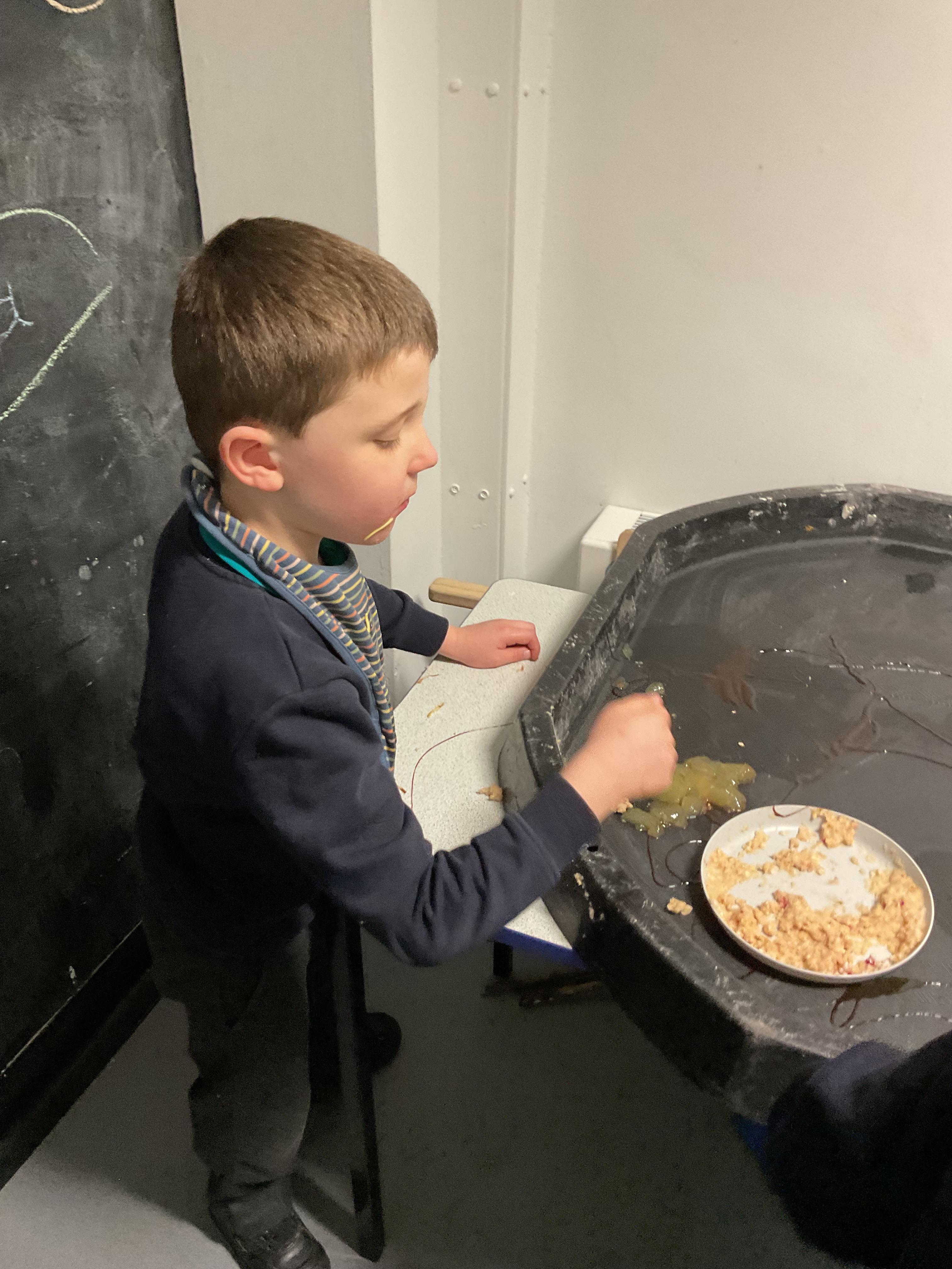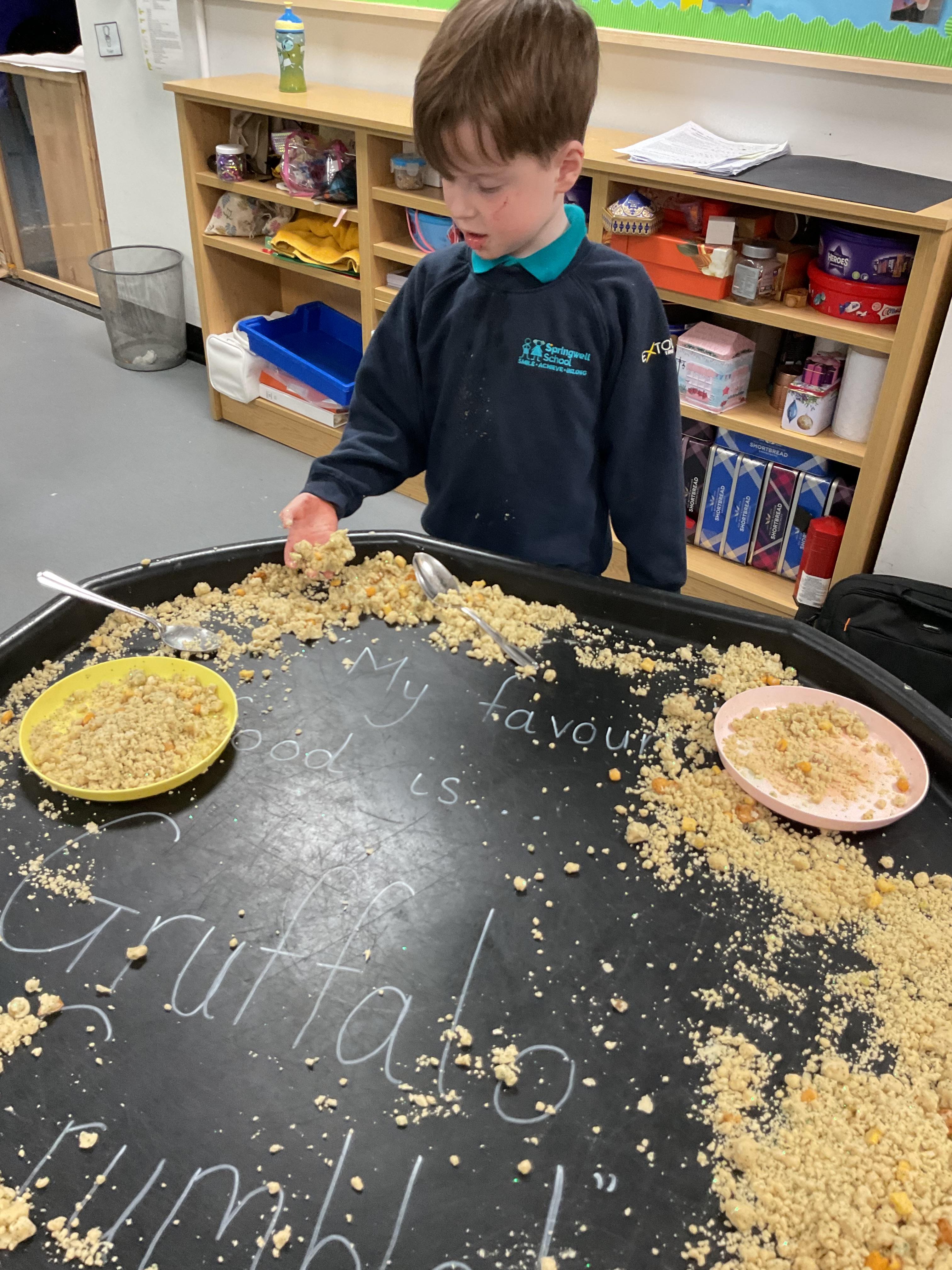 Over the last two weeks of term we enjoyed exploring our story of the week in an interactive way. All of the children enjoyed using their senses as they explored the 'Gruffalo Crumble' alongside a variety of textures objects and food sources.