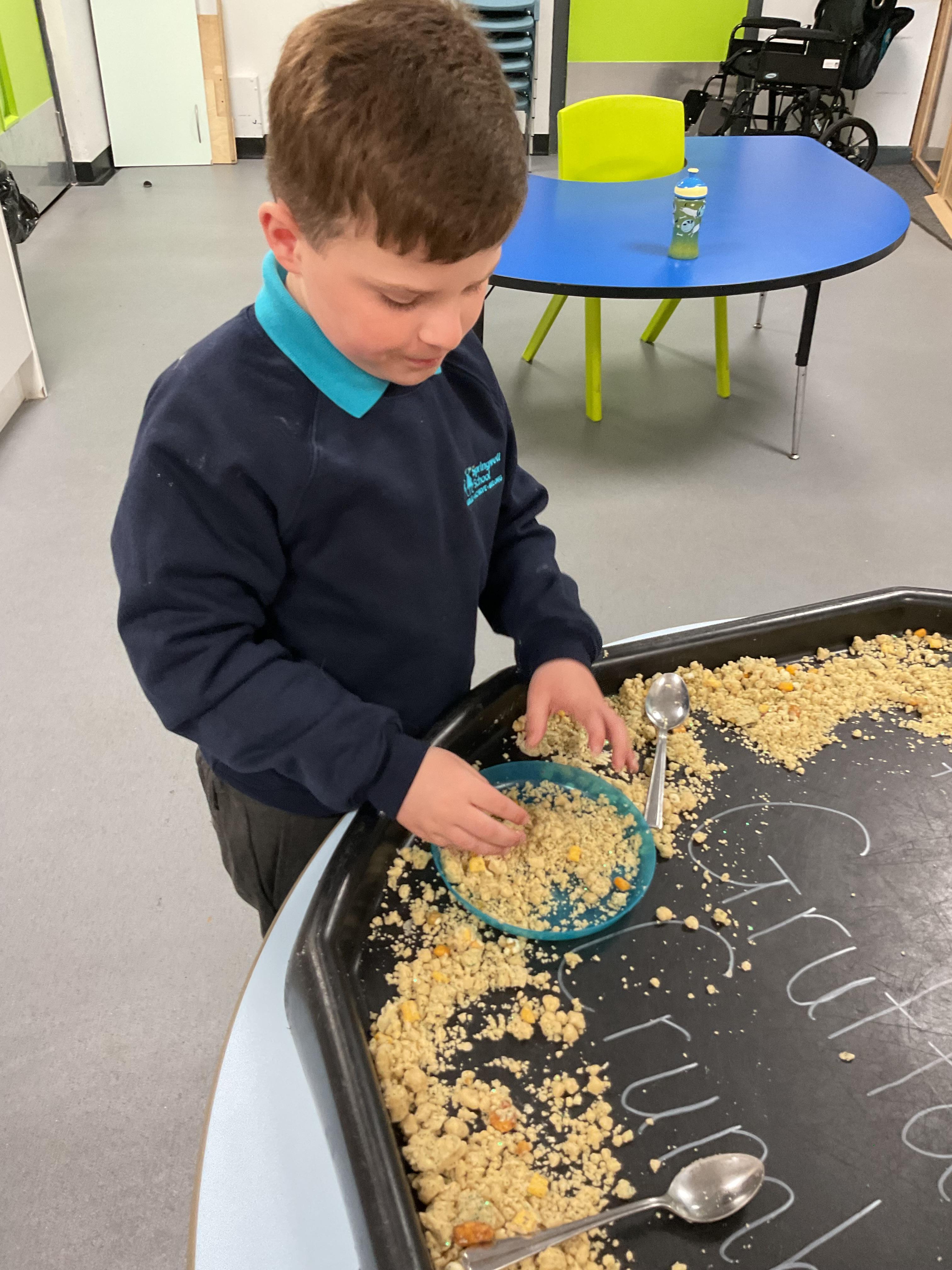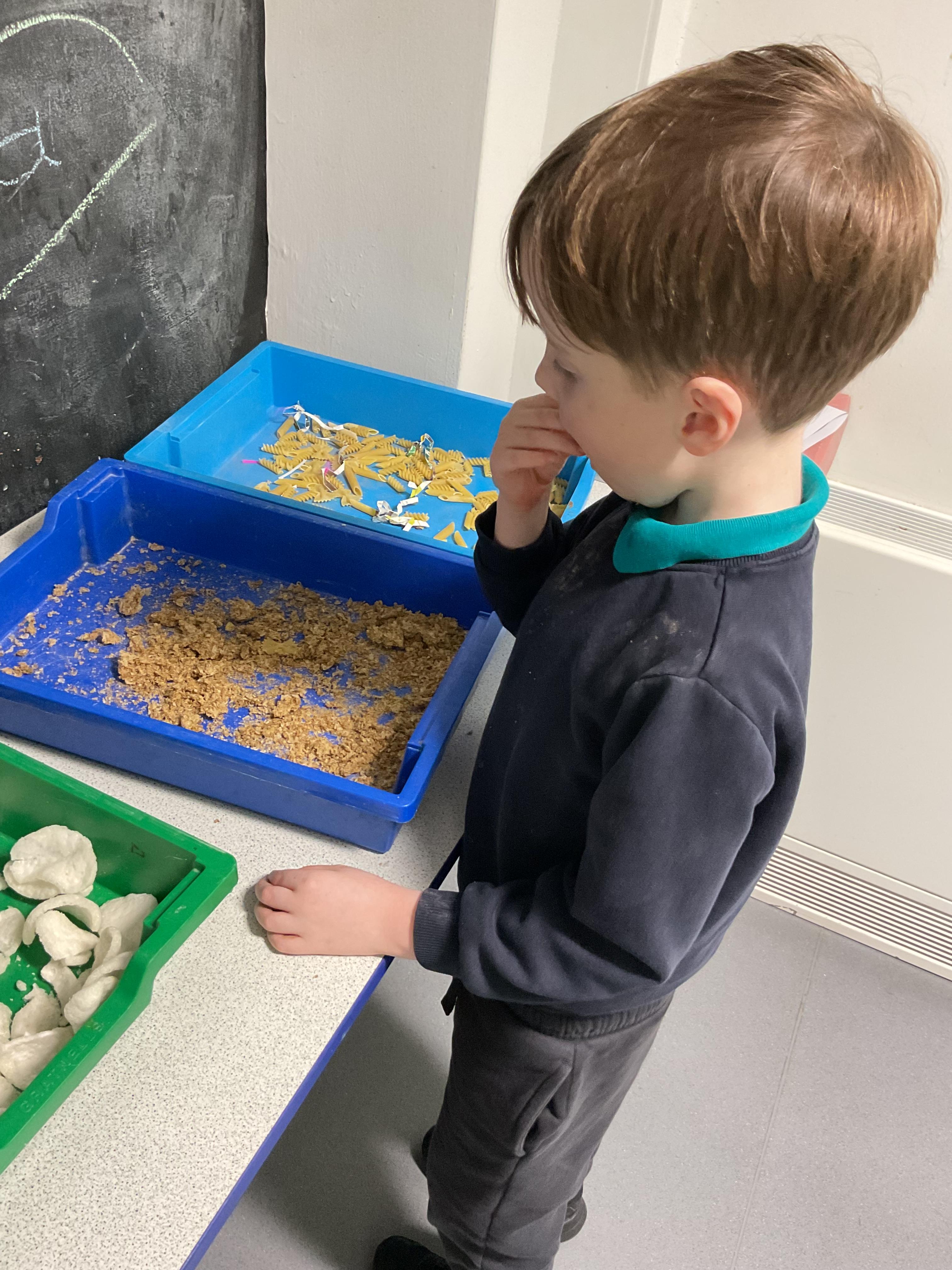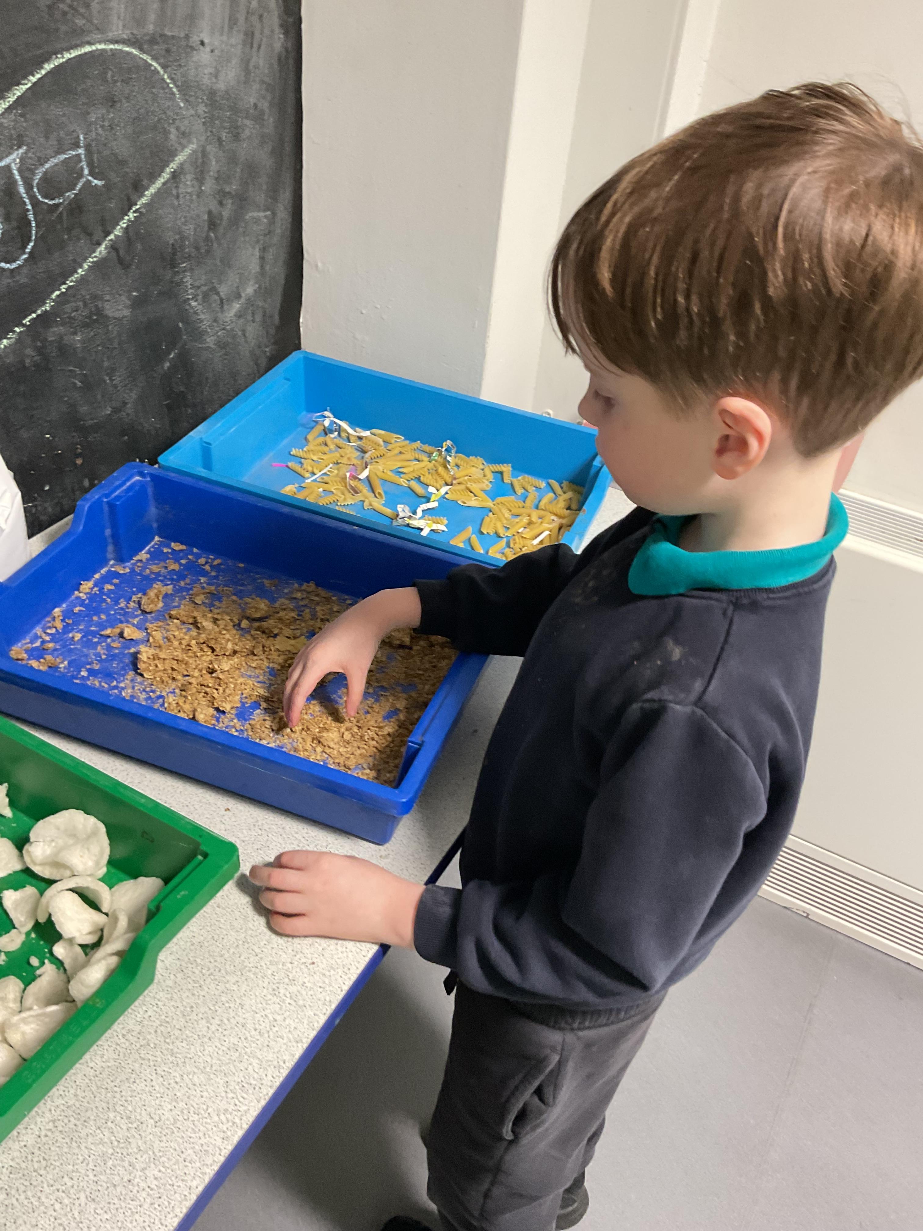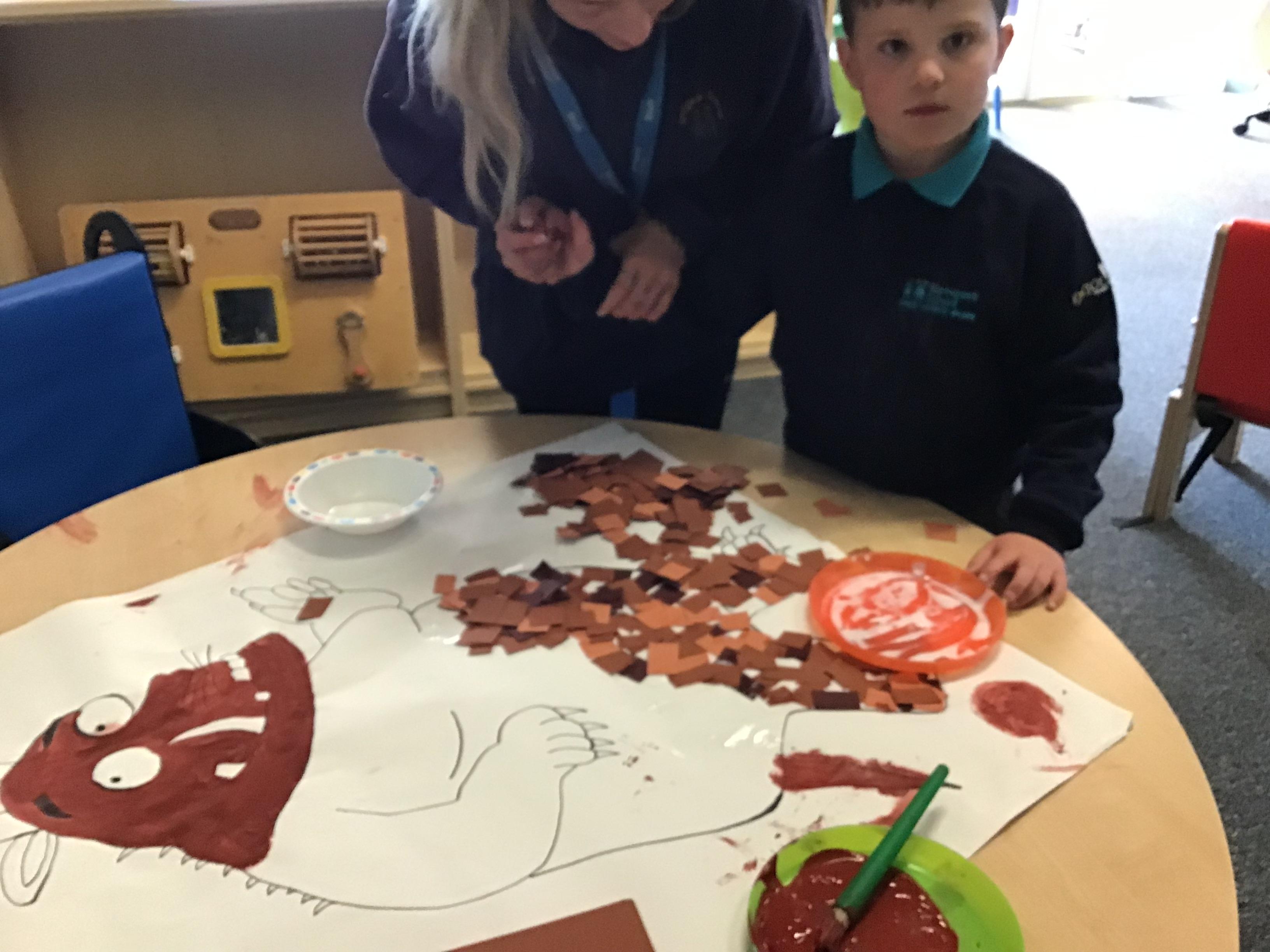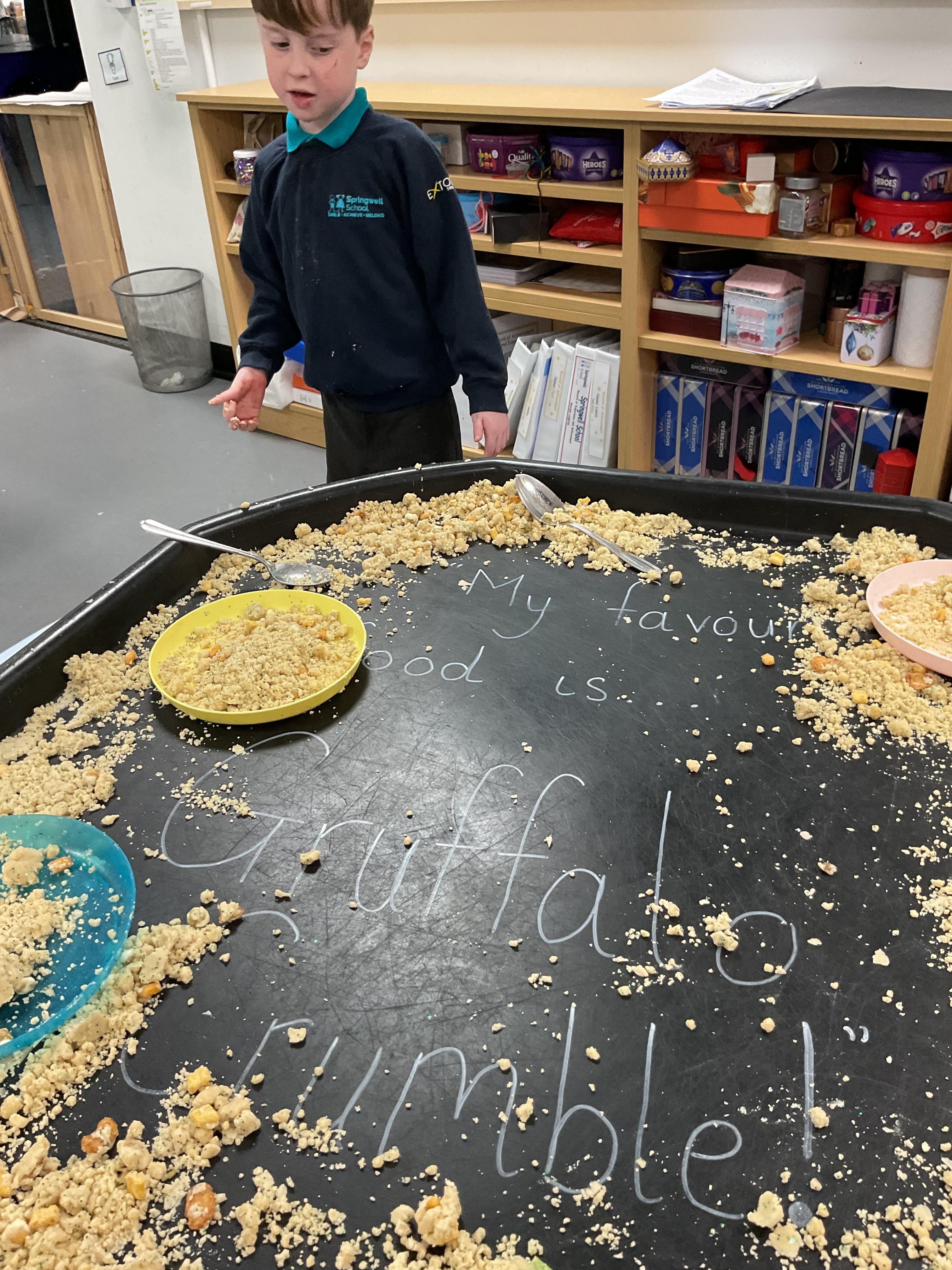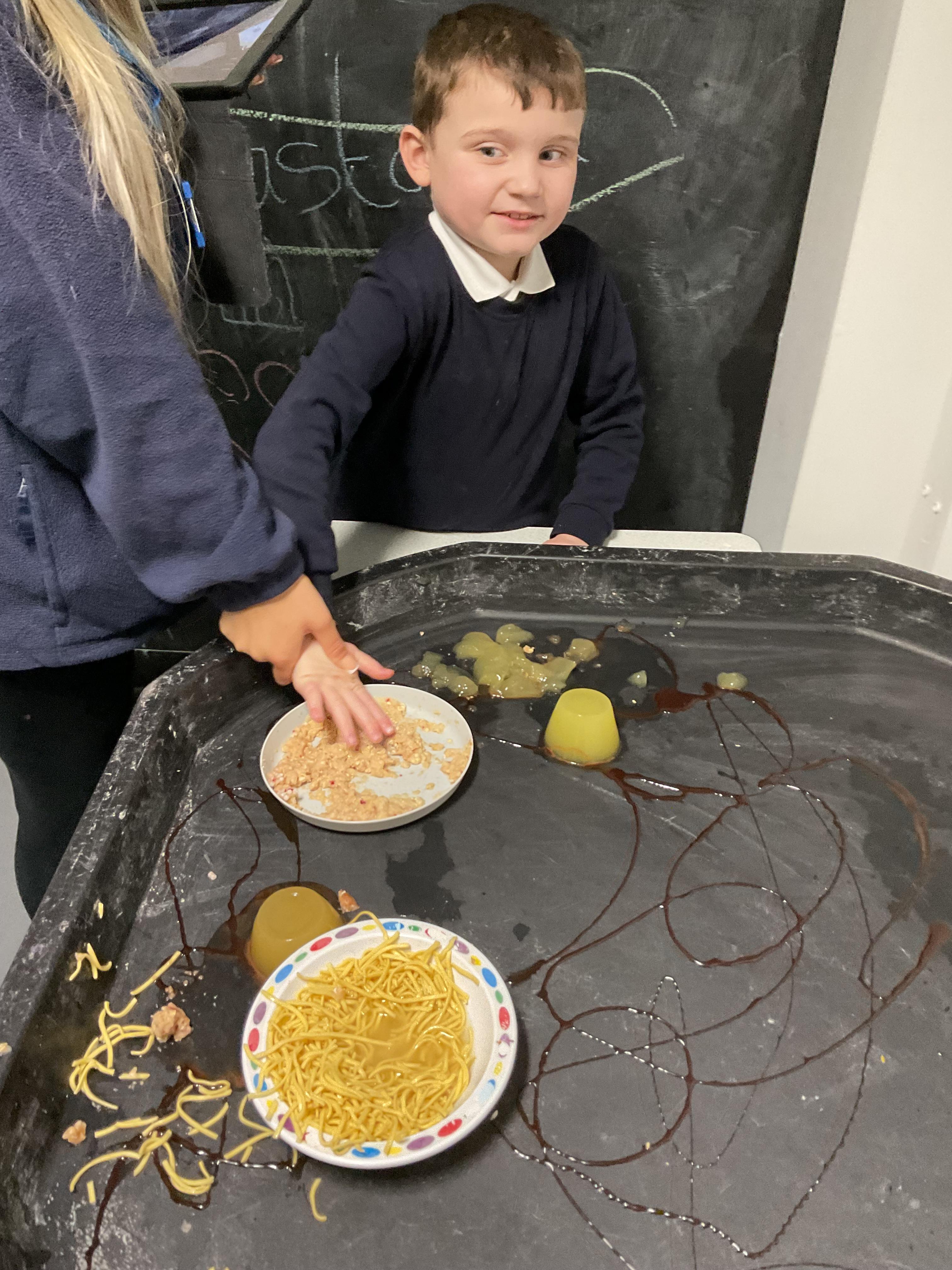 Over the last two weeks of term we enjoyed exploring our story of the week in an interactive way. All of the children enjoyed using their senses as they explored the 'Gruffalo Crumble' alongside a variety of textures objects and food sources.
