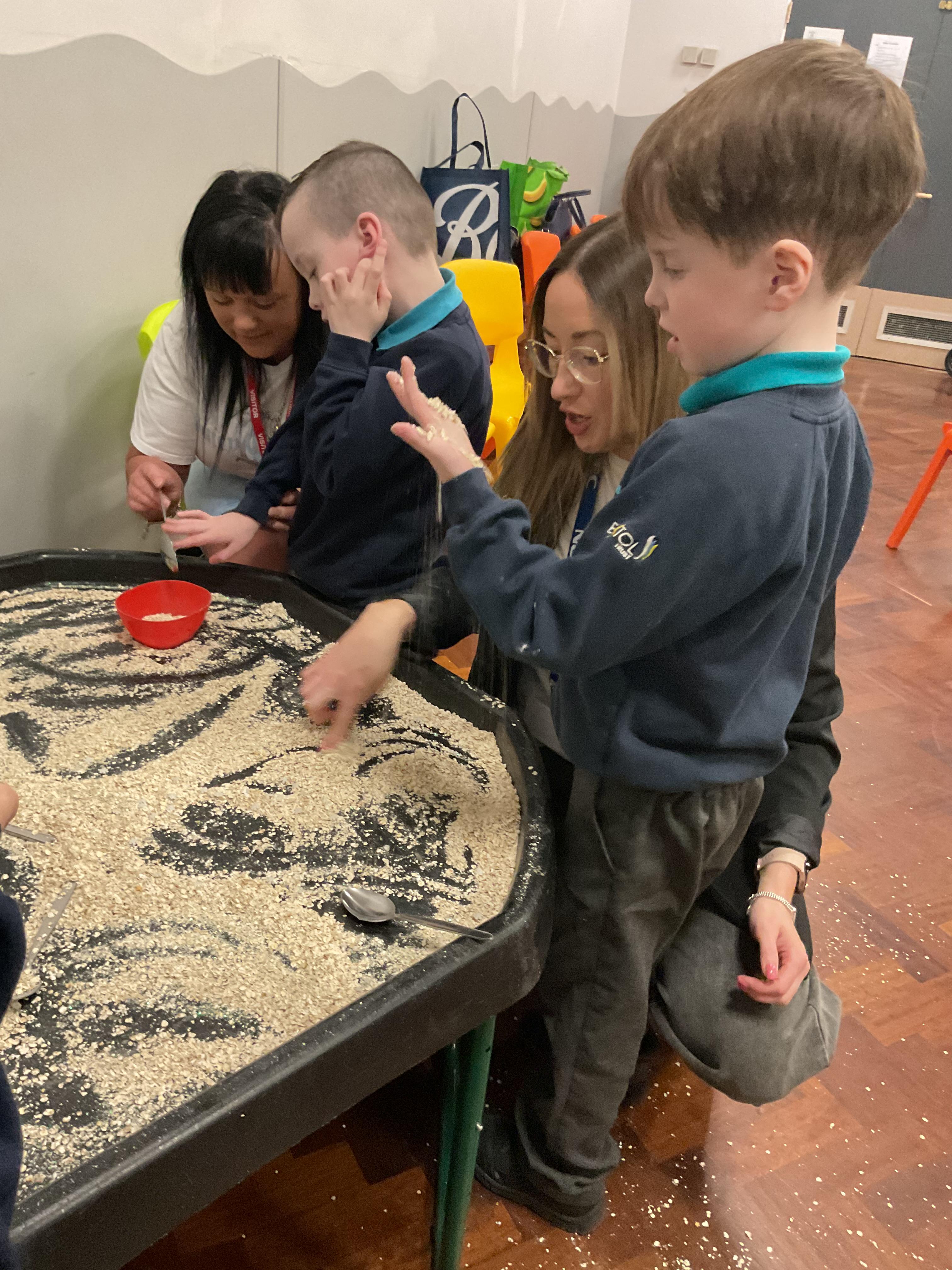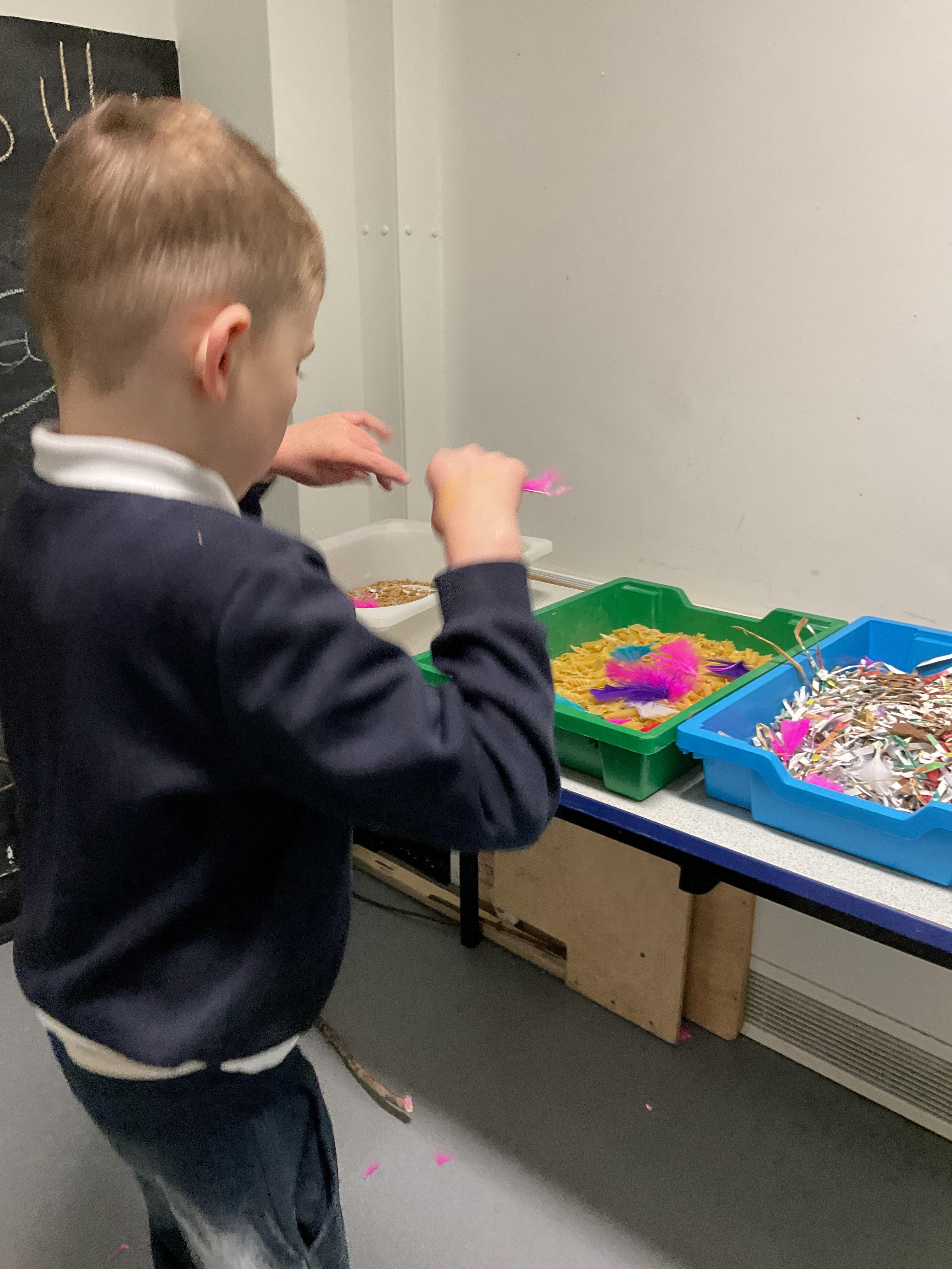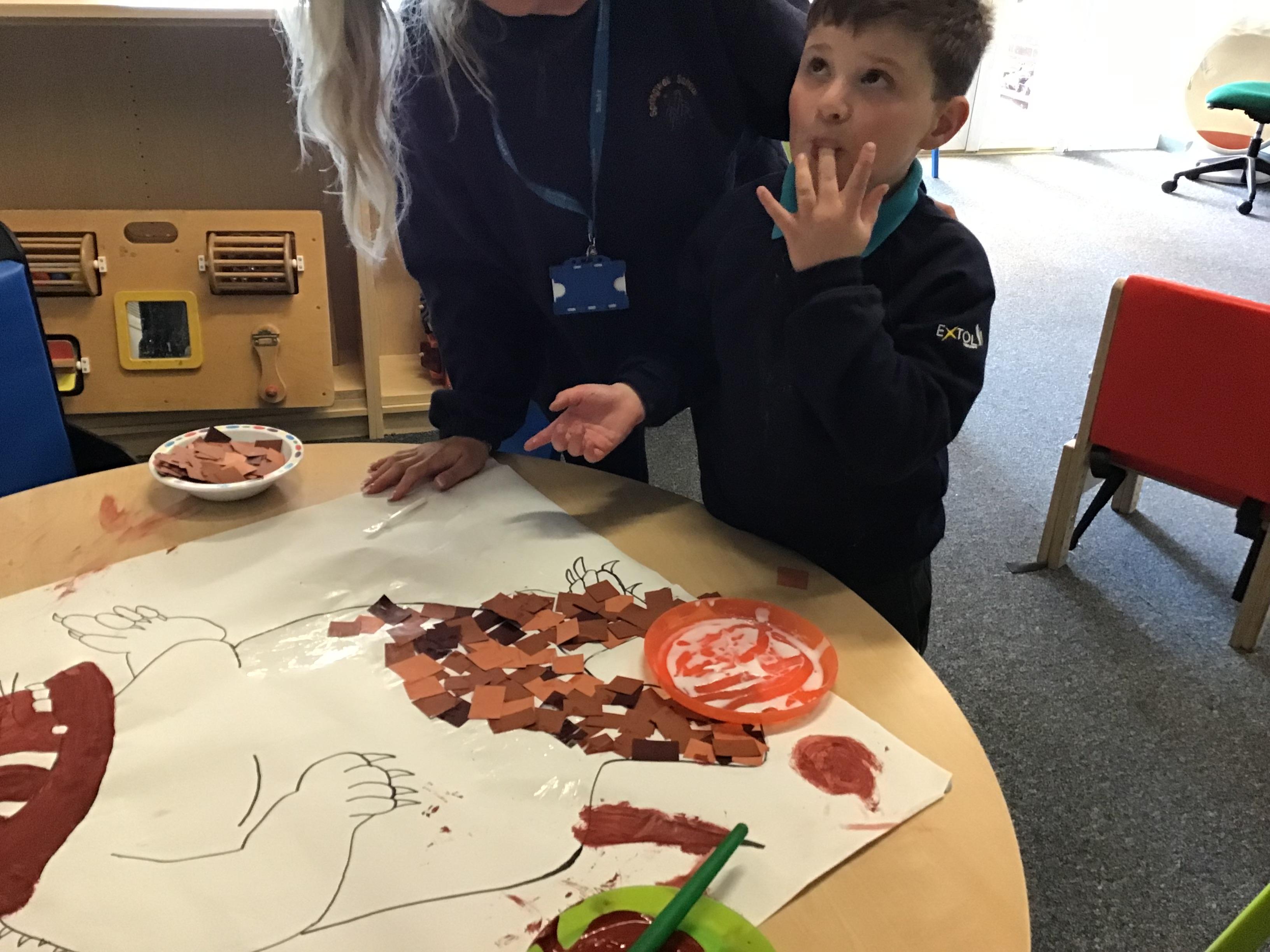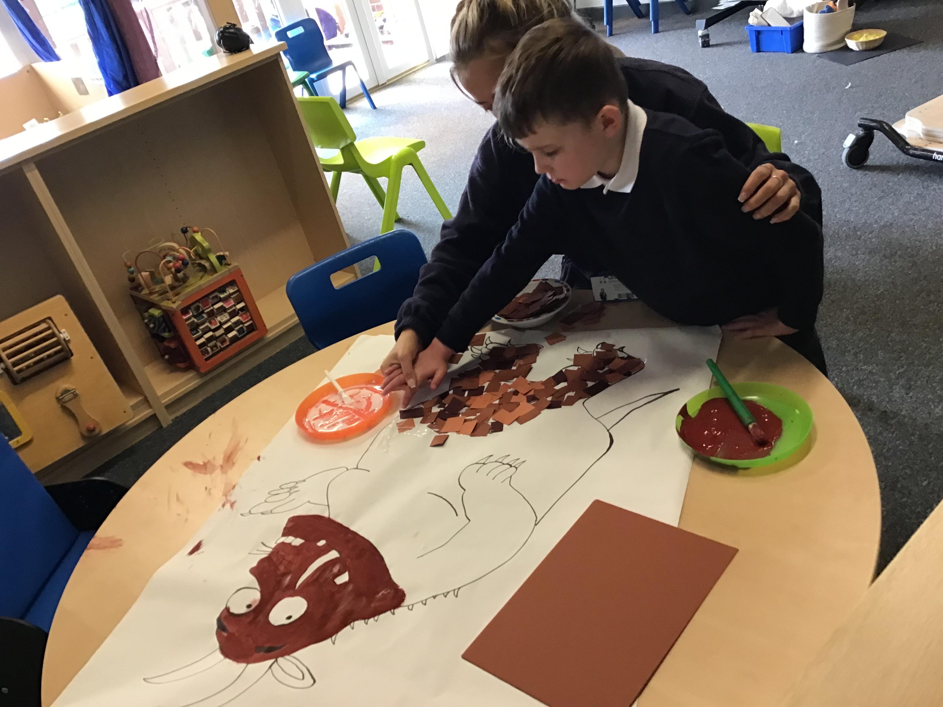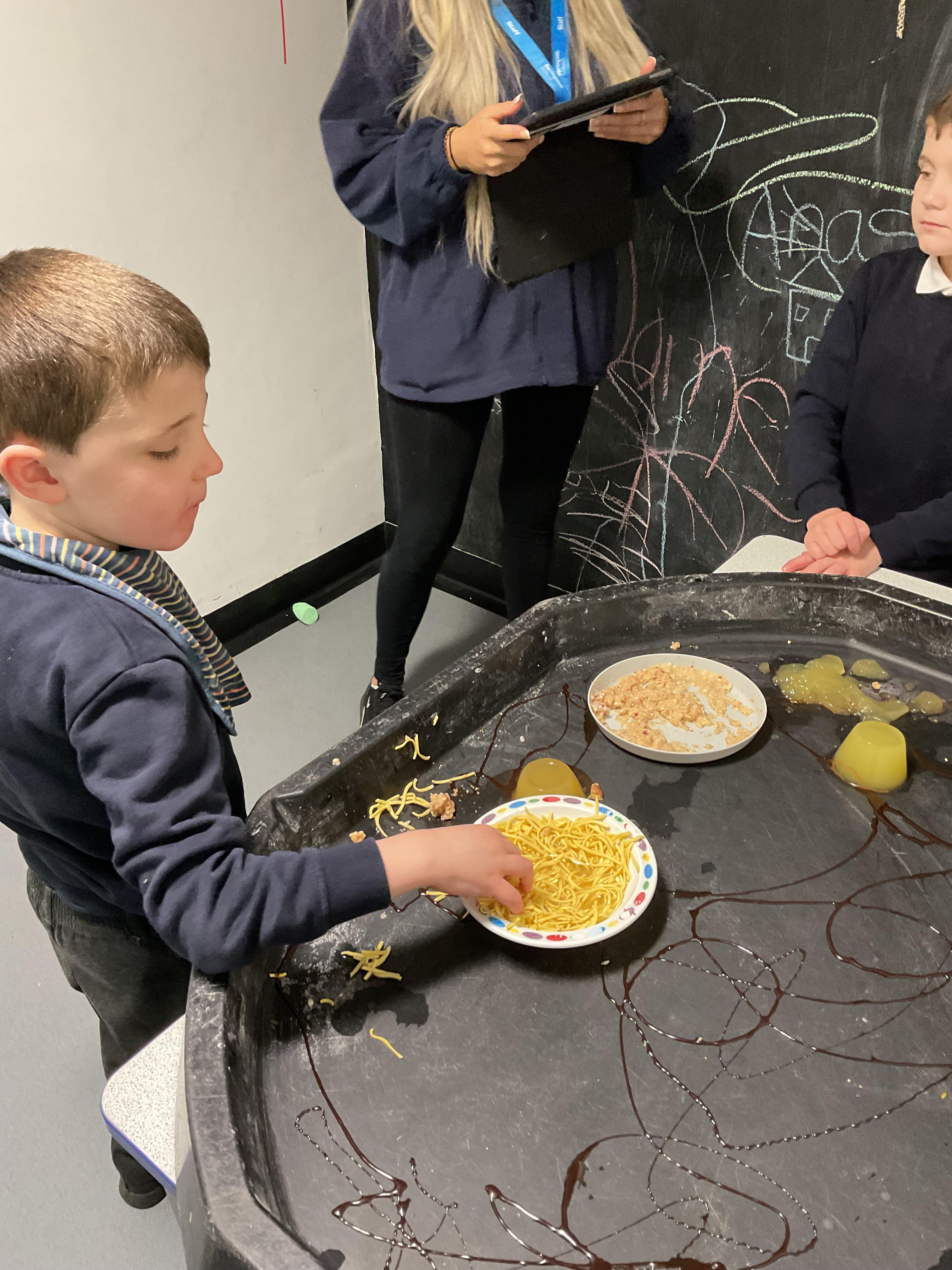 Over the last two weeks of term we enjoyed exploring our story of the week in an interactive way. All of the children enjoyed using their senses as they explored the 'Gruffalo Crumble' alongside a variety of textures objects and food sources.
