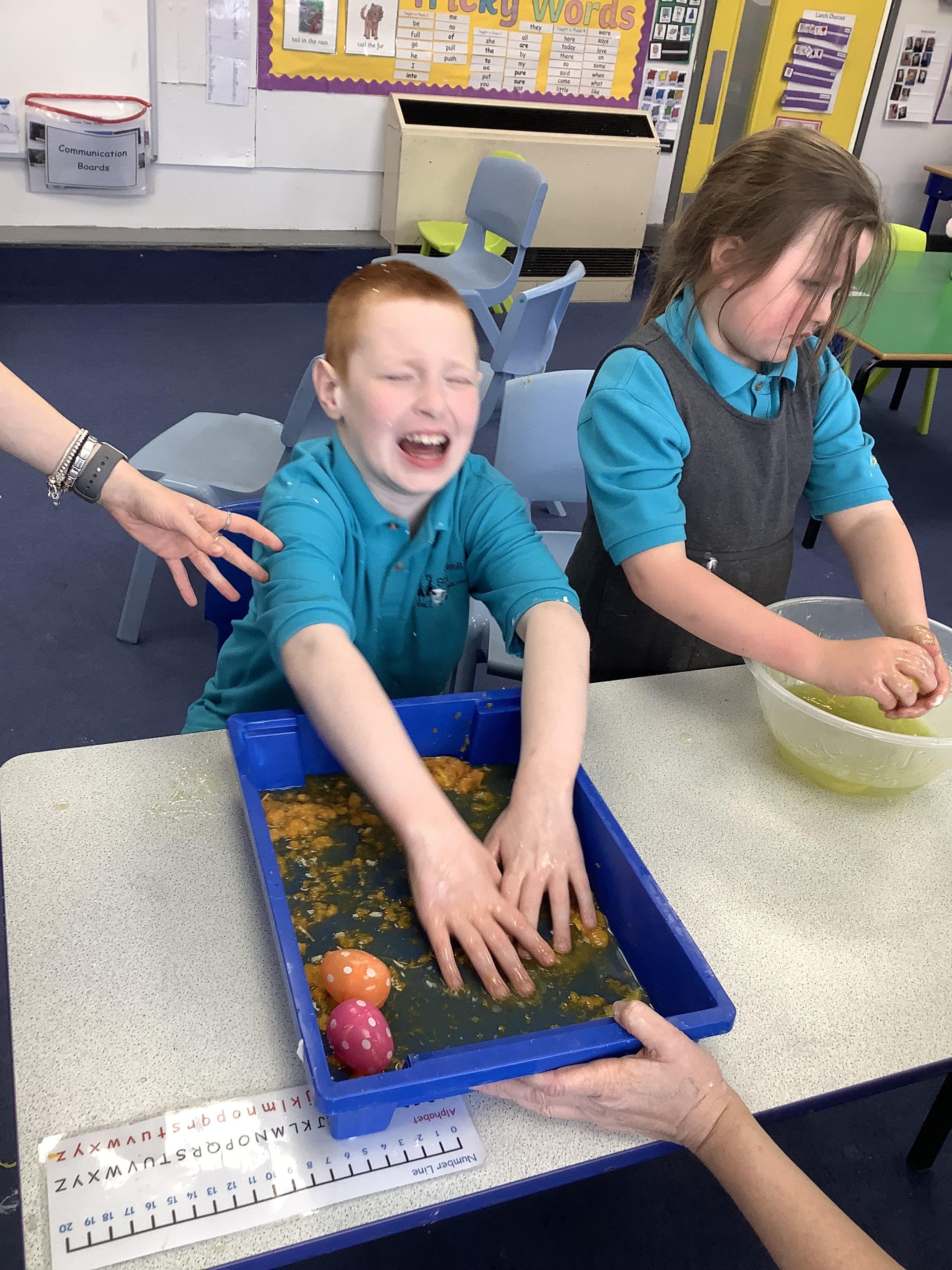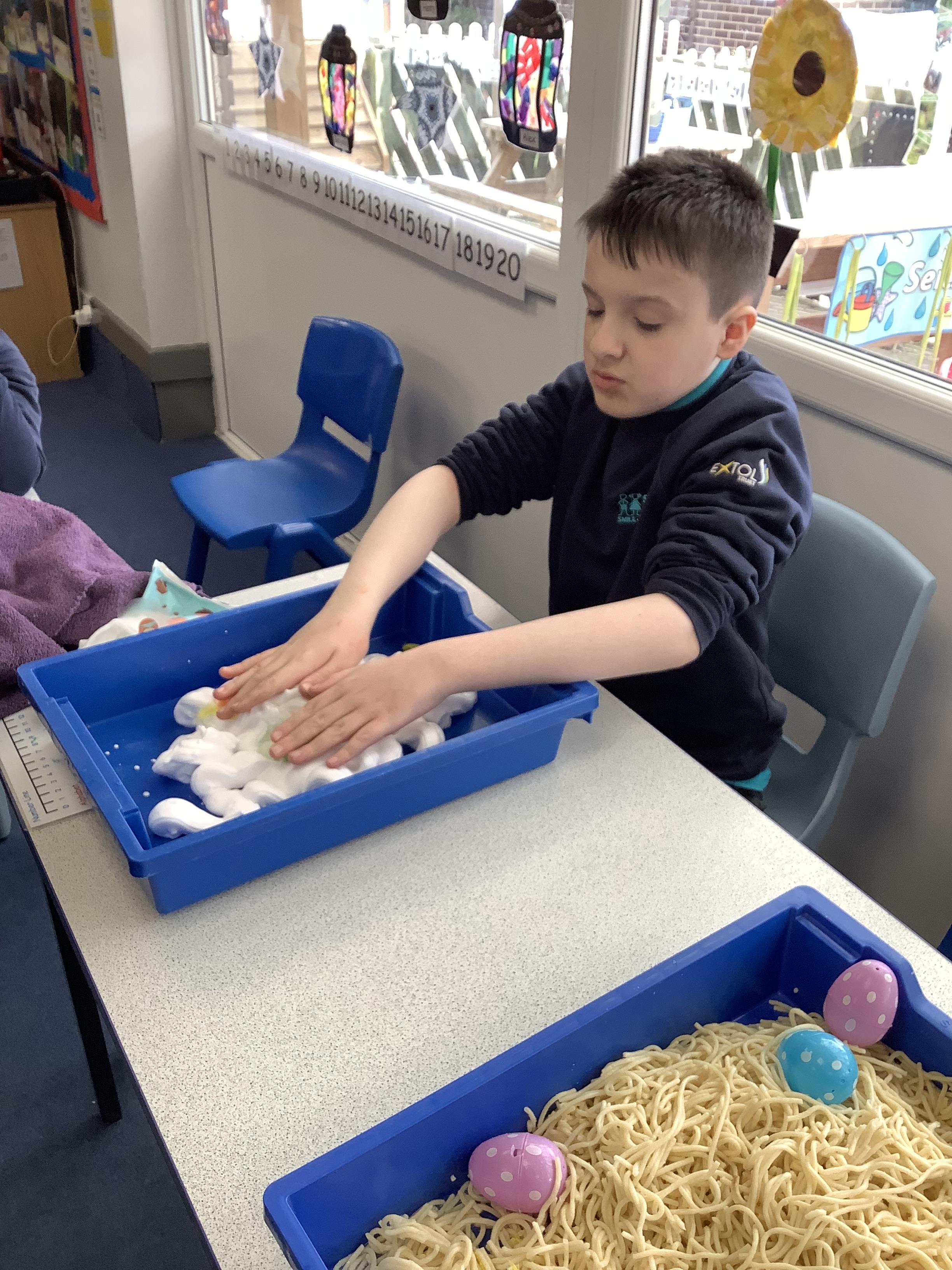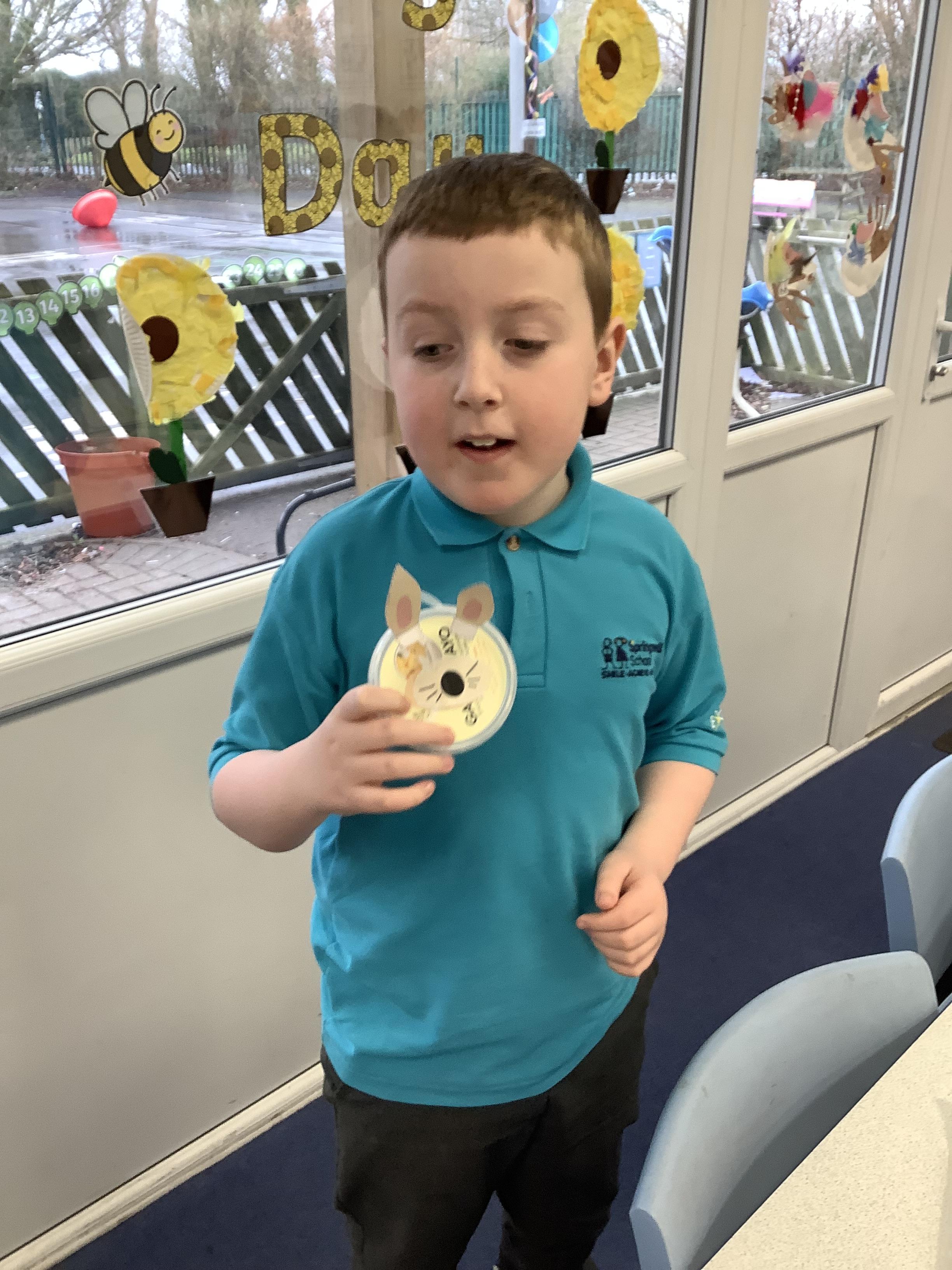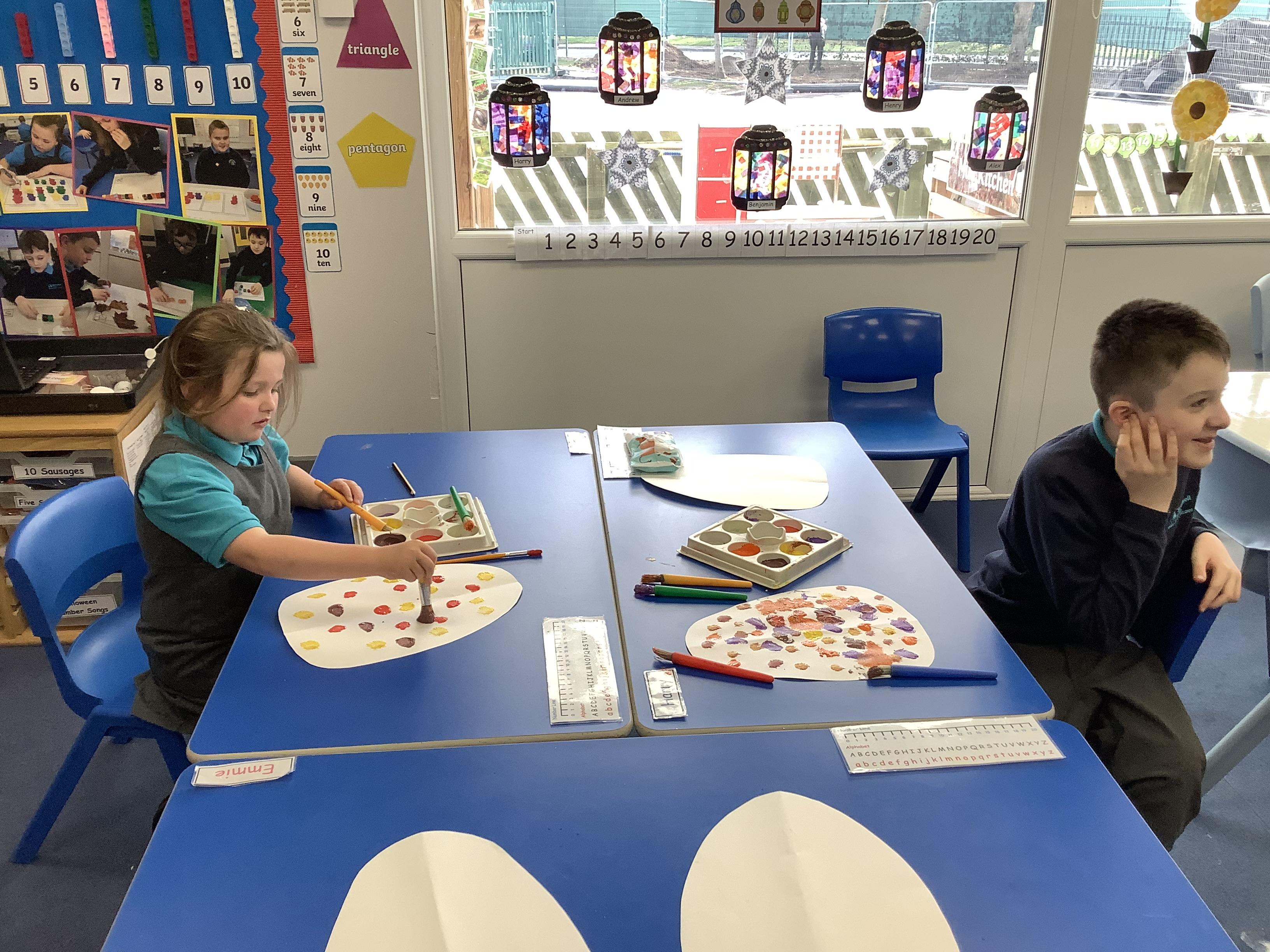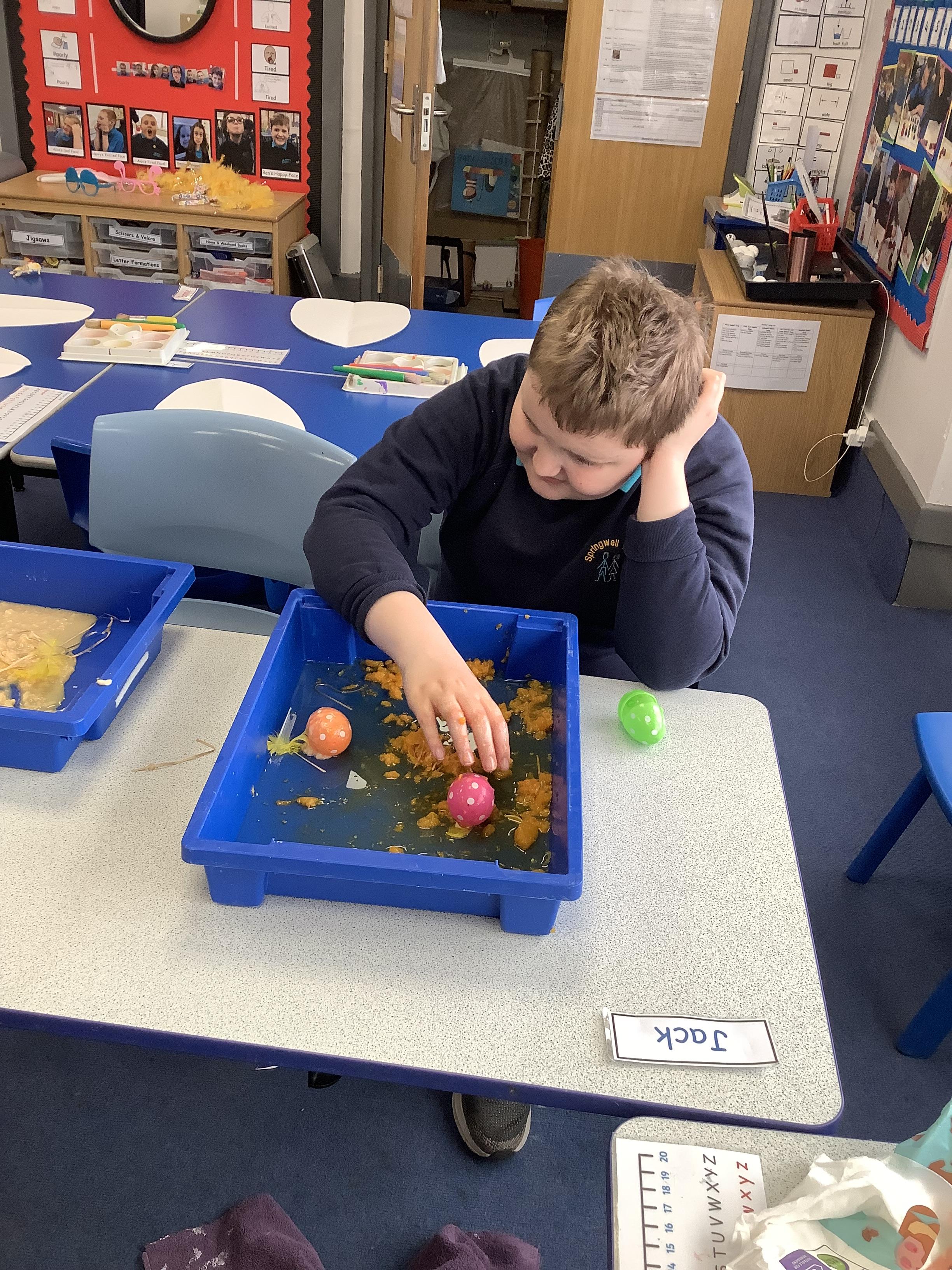11.04.25 ART & DESIGN/RE The children have been decorating their own Easter Egg using a variety of coloured paint. EASTER PHOTO SHOOT: The children enjoyed trying on Easter glasses and bunny ear hairbands and looking at themselves in the mirror!