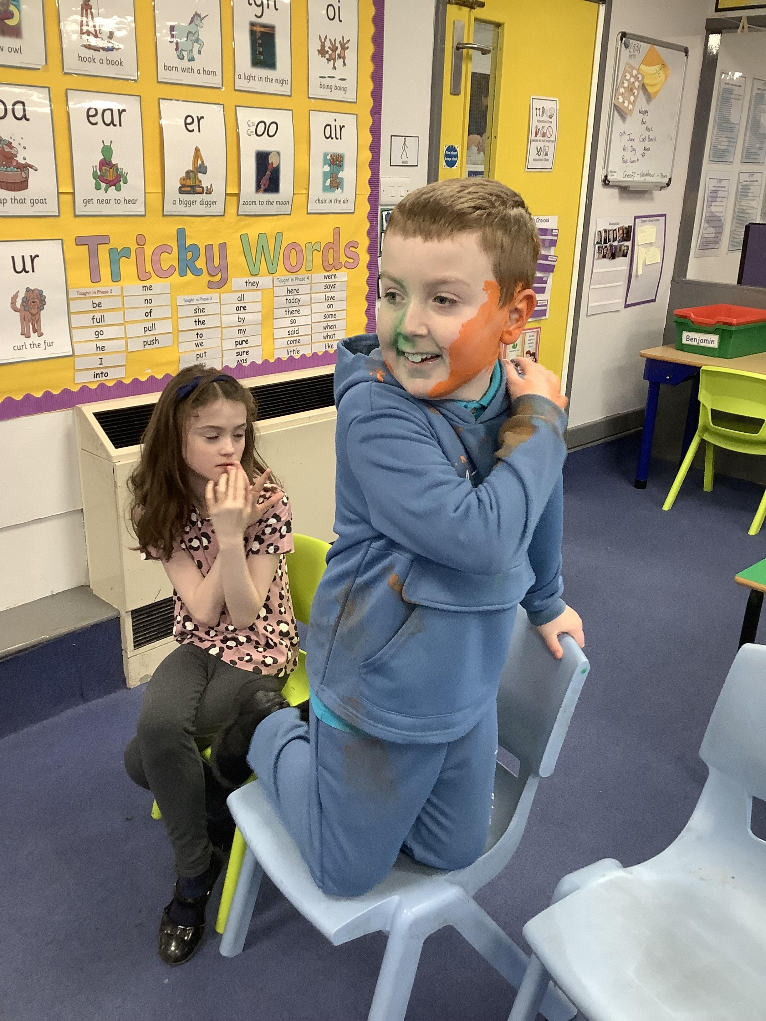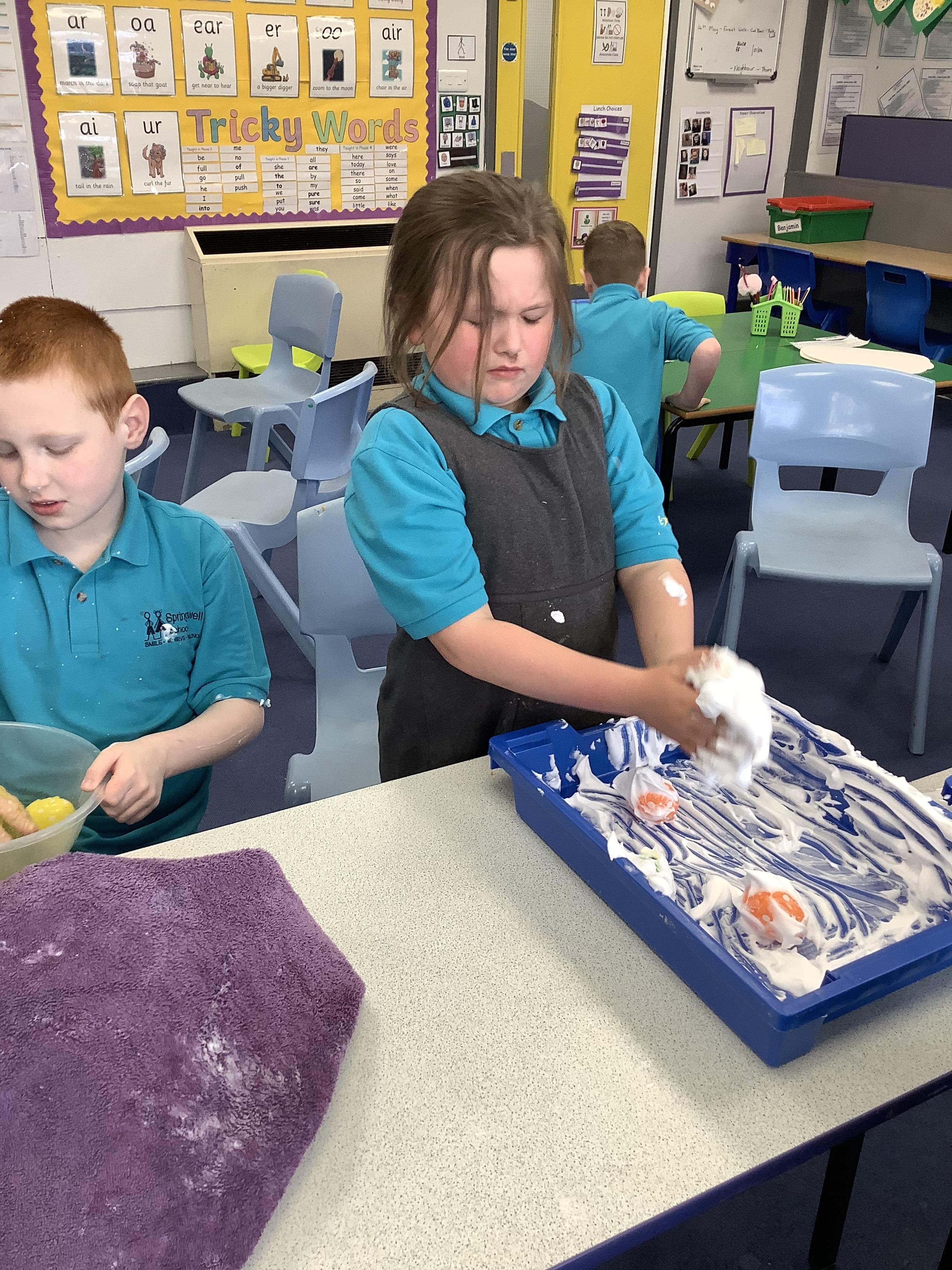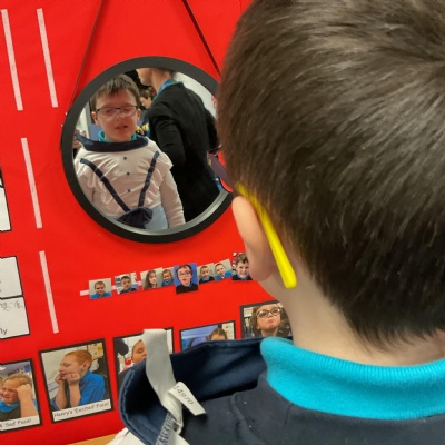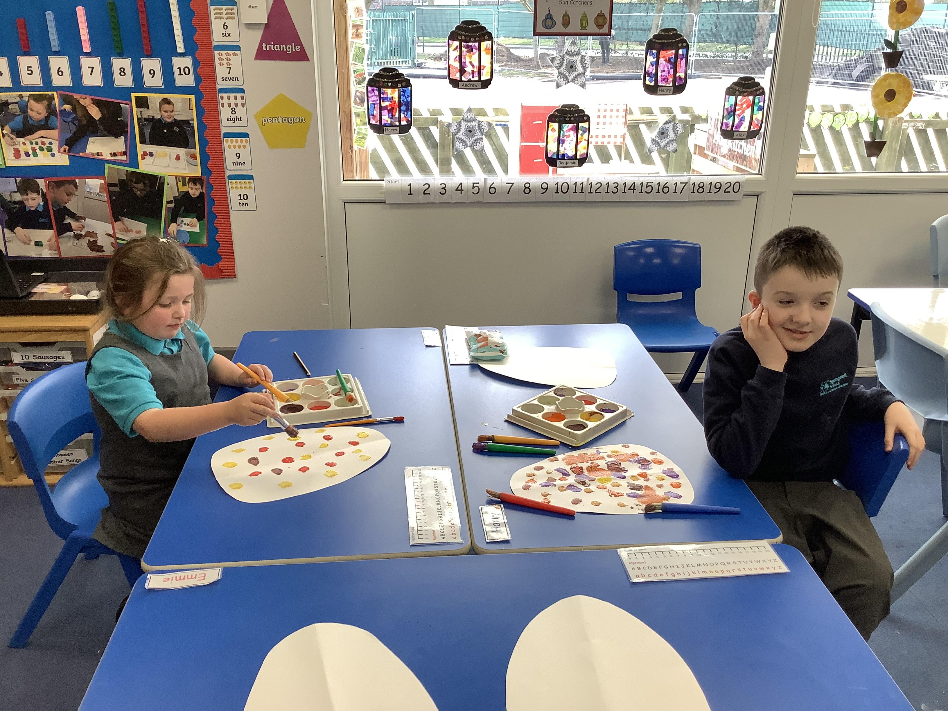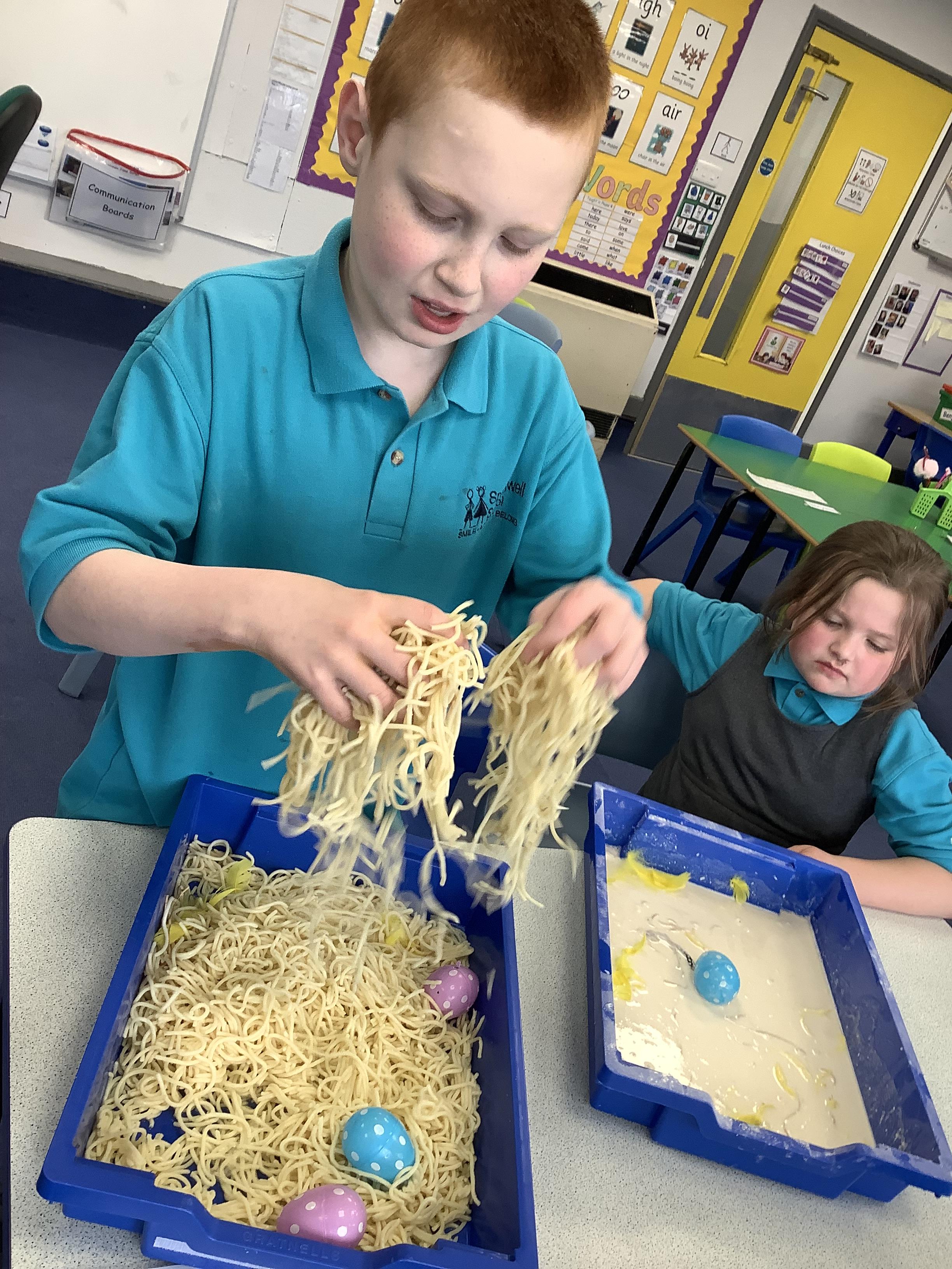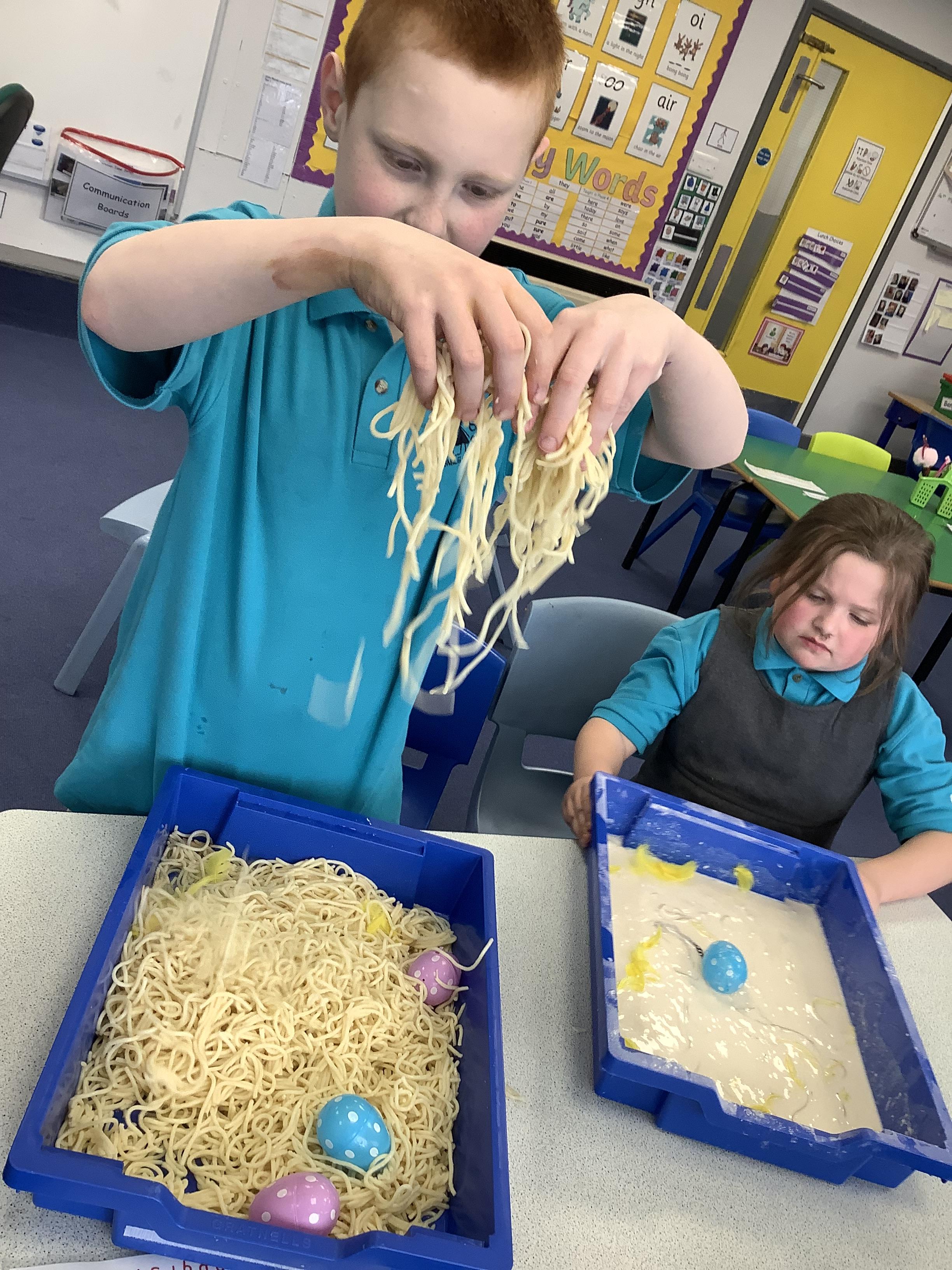 11.04.25 ART & DESIGN/RE The children have been decorating their own Easter Egg using a variety of coloured paint. EASTER PHOTO SHOOT: The children enjoyed trying on Easter glasses and bunny ear hairbands and looking at themselves in the mirror!