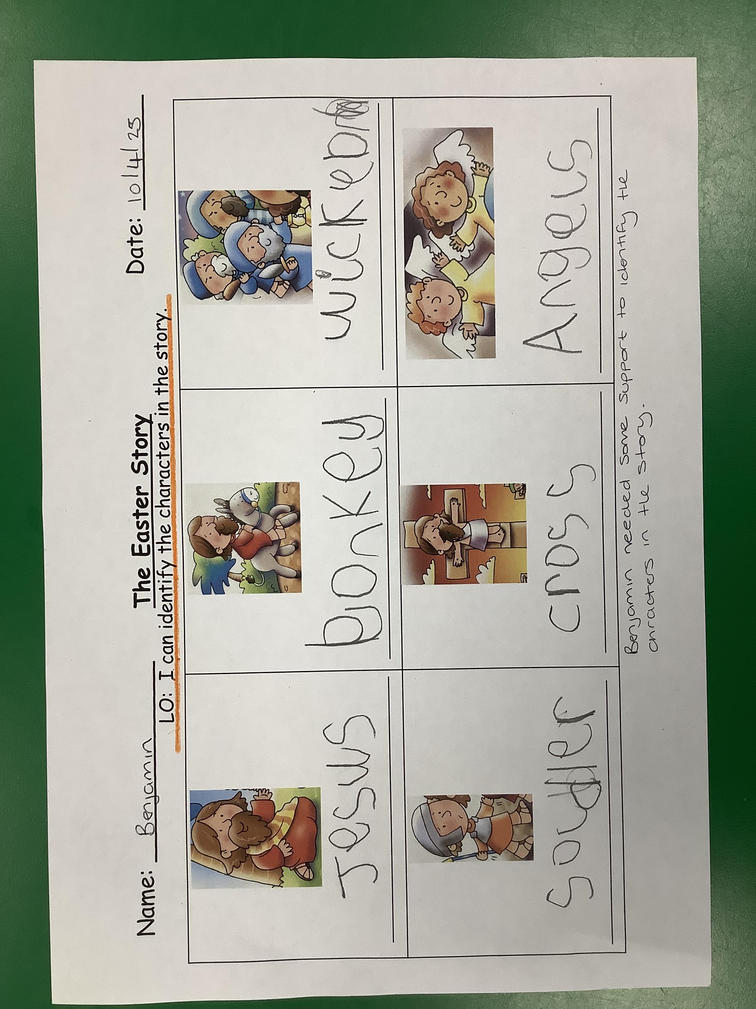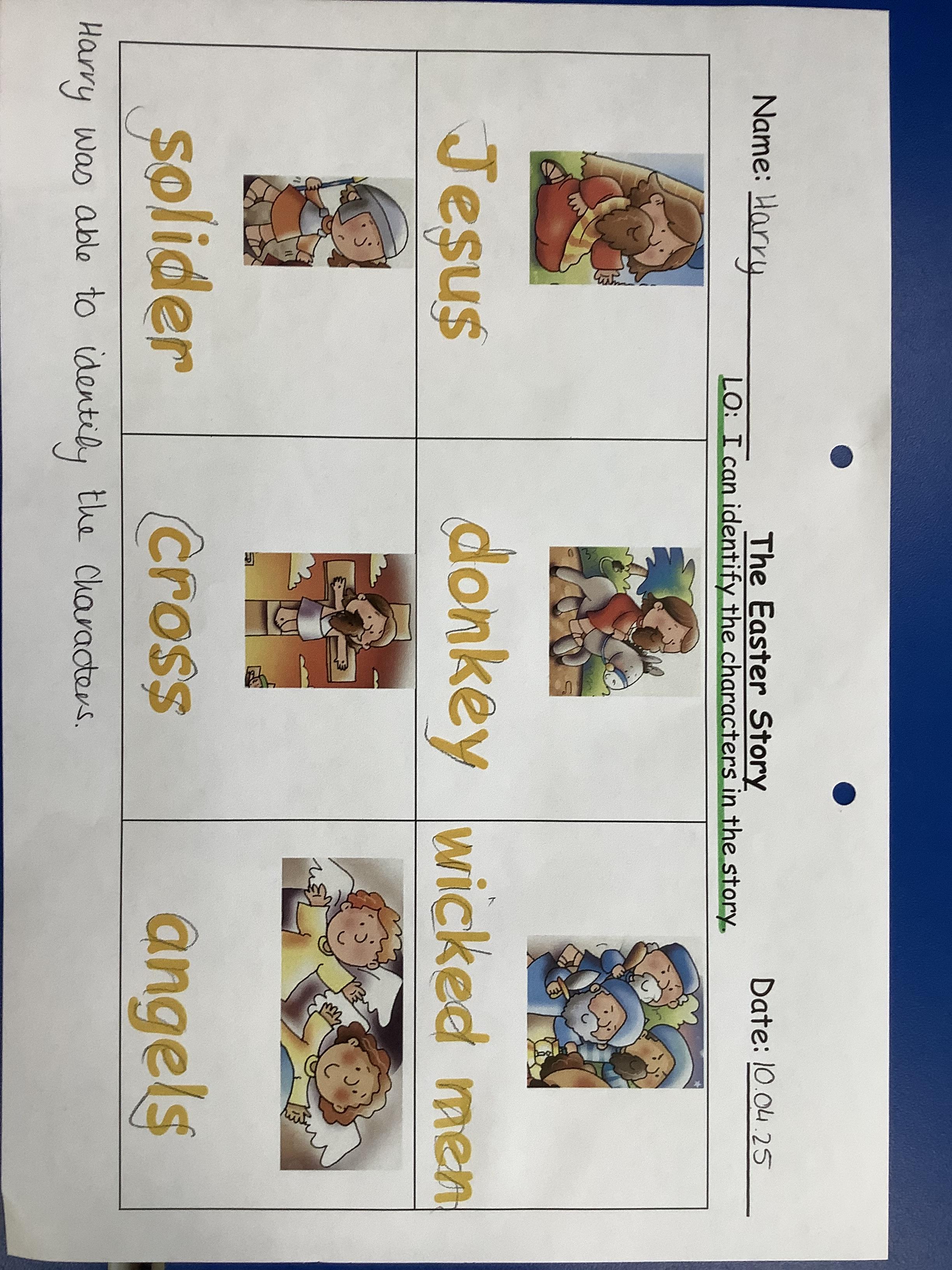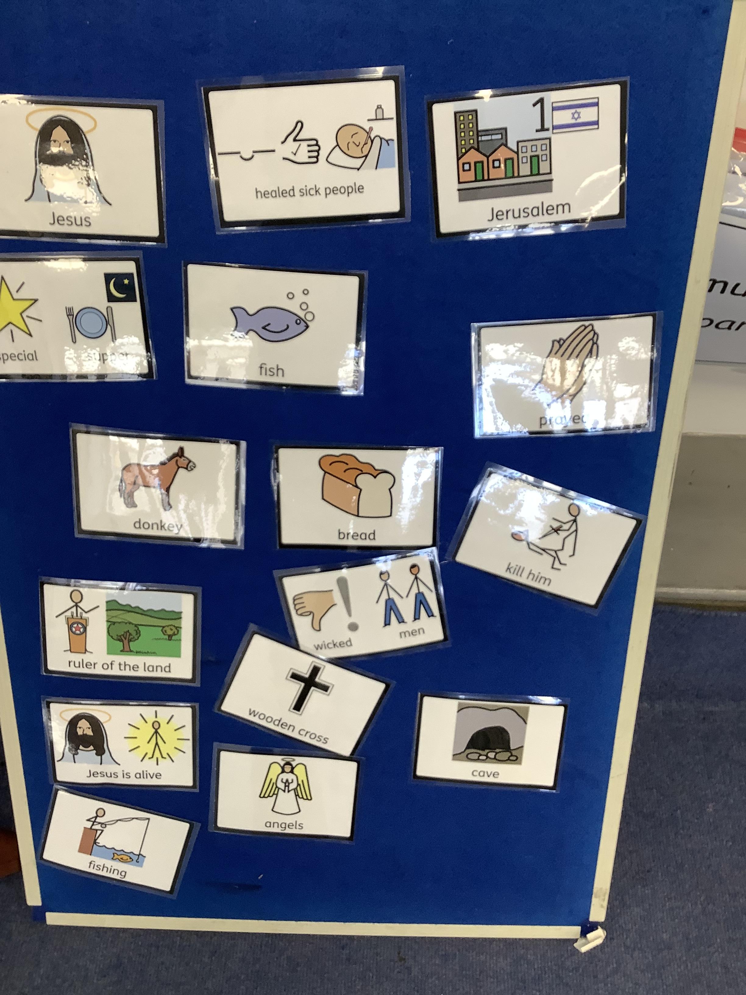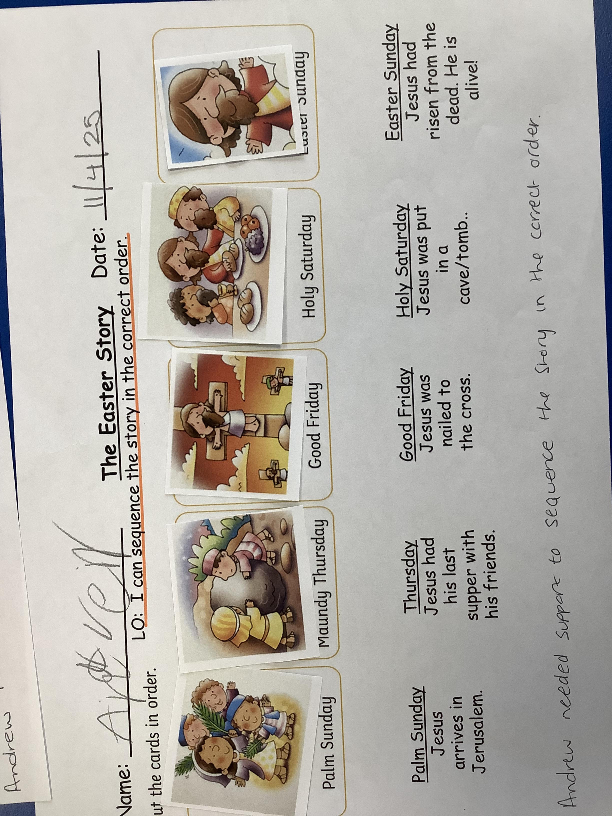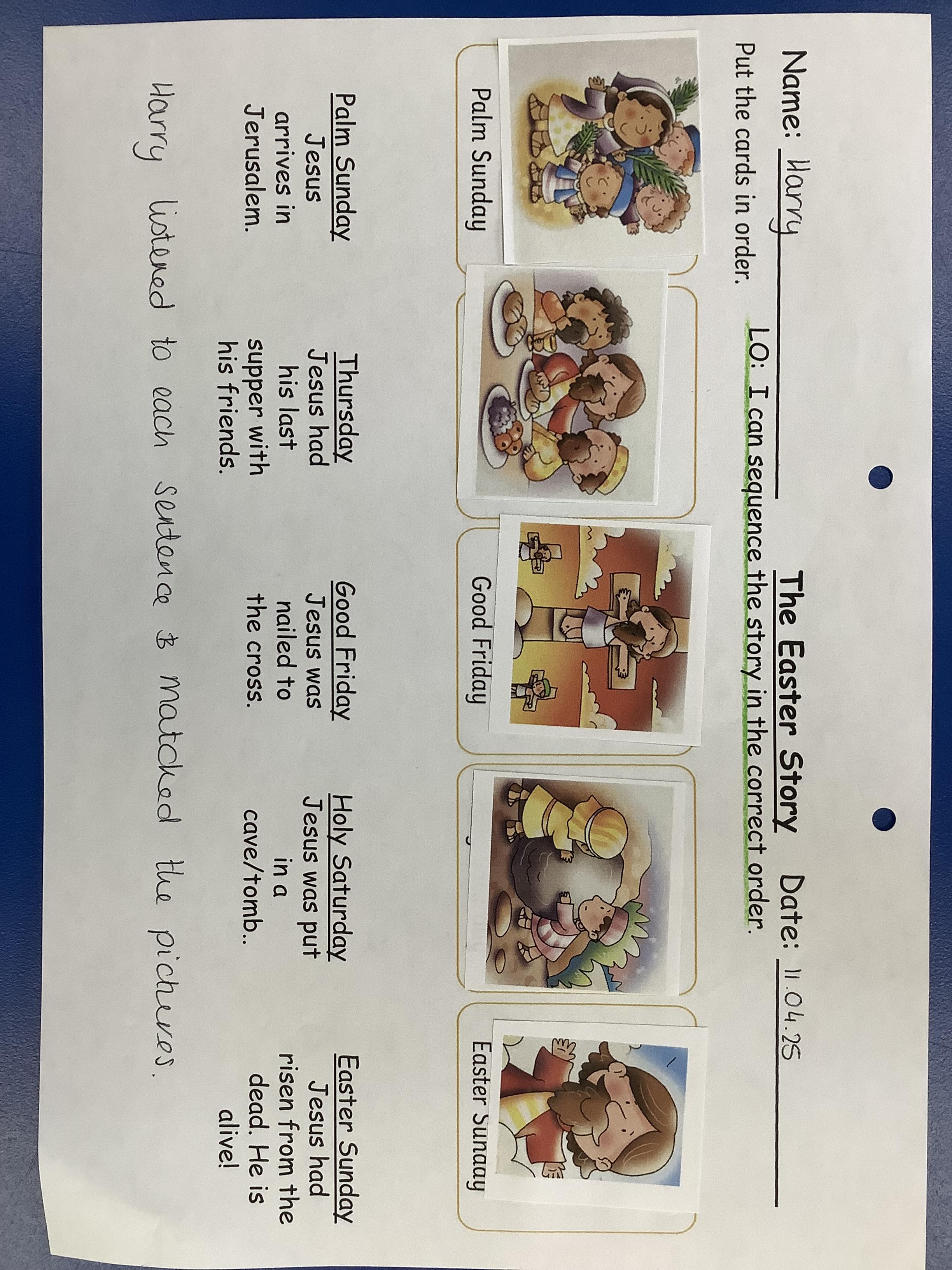 11.04.25 RE/LITERACY: EASTER The children have enjoyed listening to their teacher Jane, reading them the story of Easter. They have been answering comprehension questions using a variety of communication in print symbols. We identified all the different characters in the story. We had our very own last supper together, eating bread and drinking red juice. We then looked at some picture cards and sequenced them in the correct order of the story.