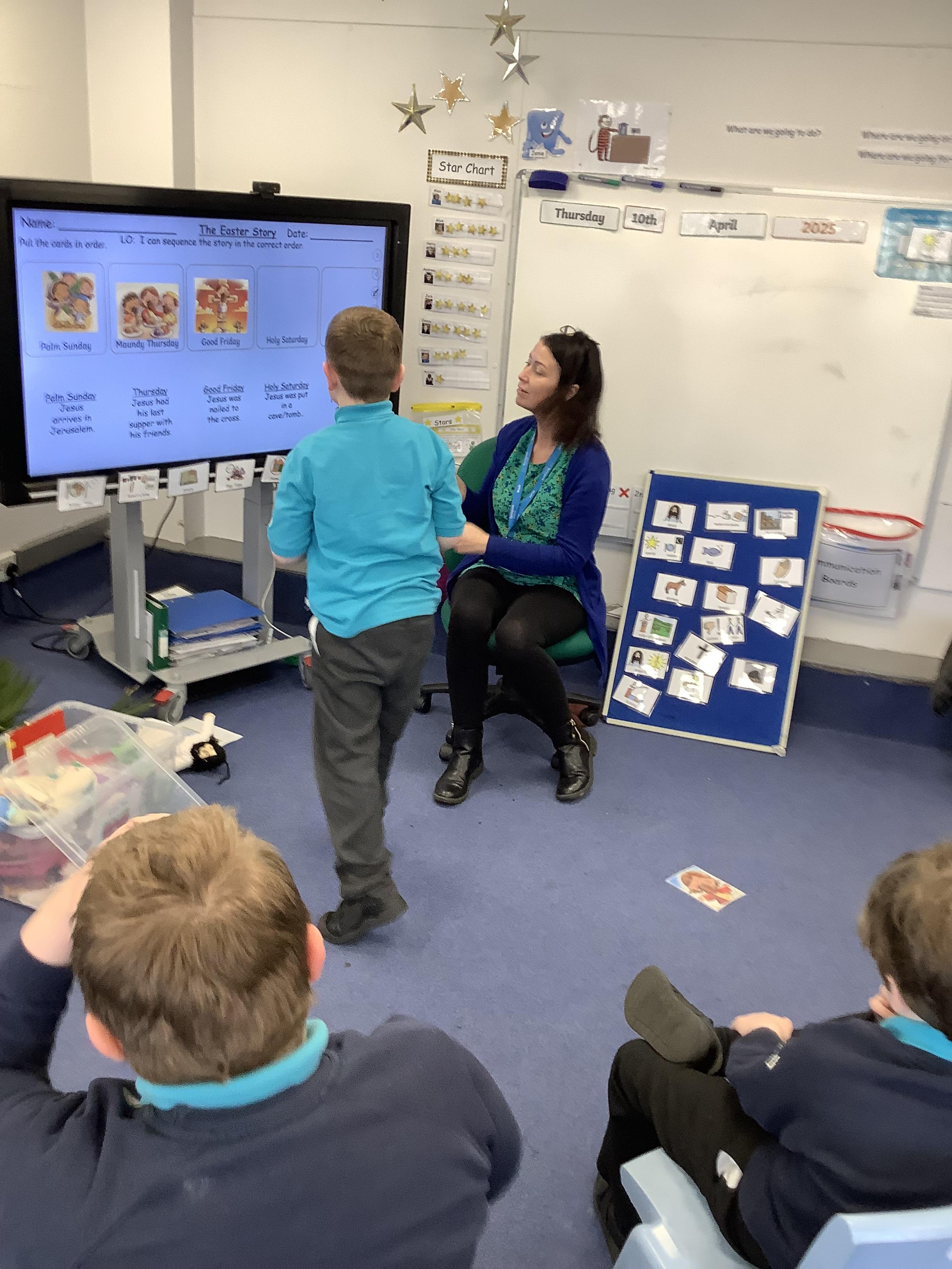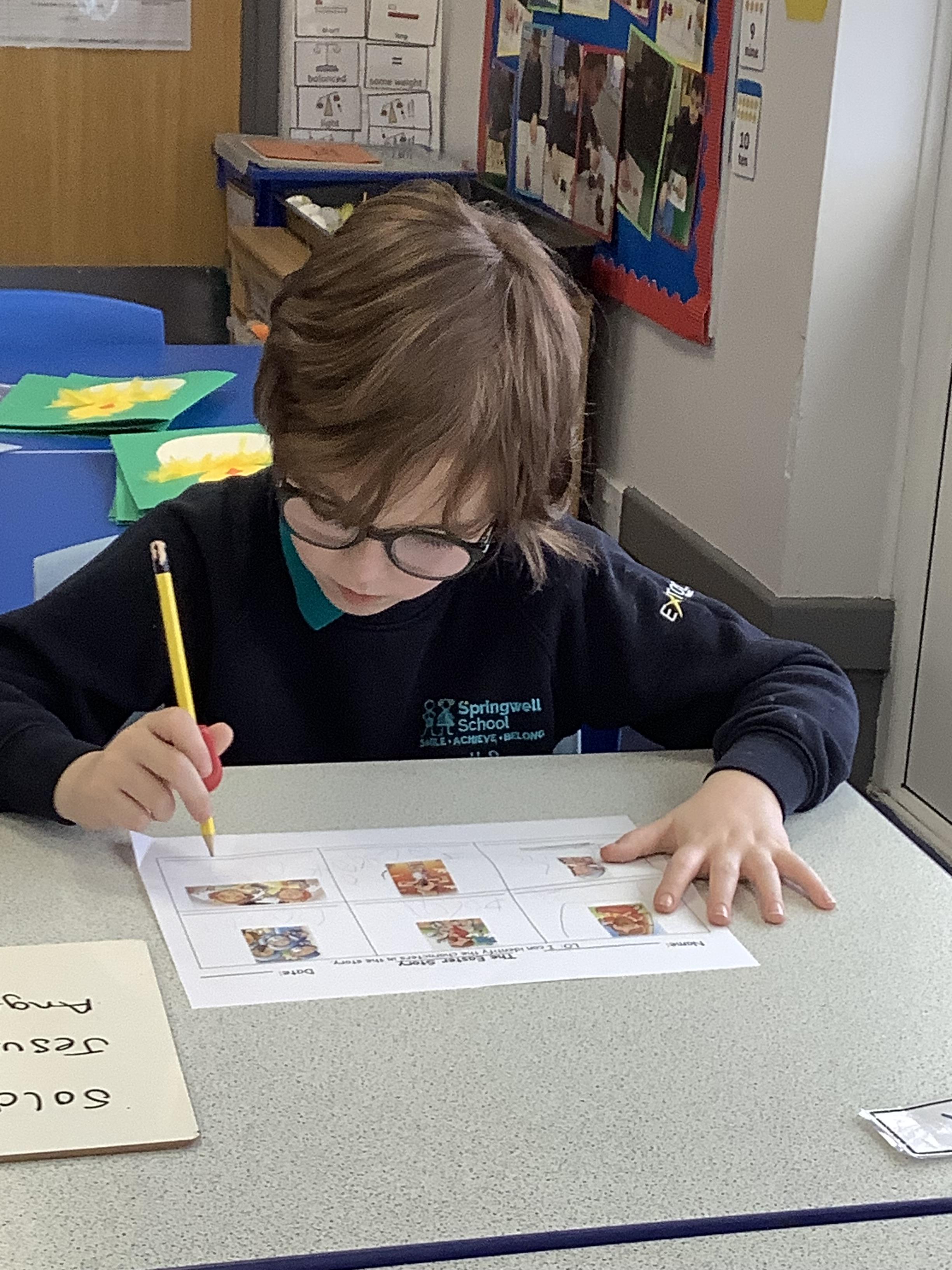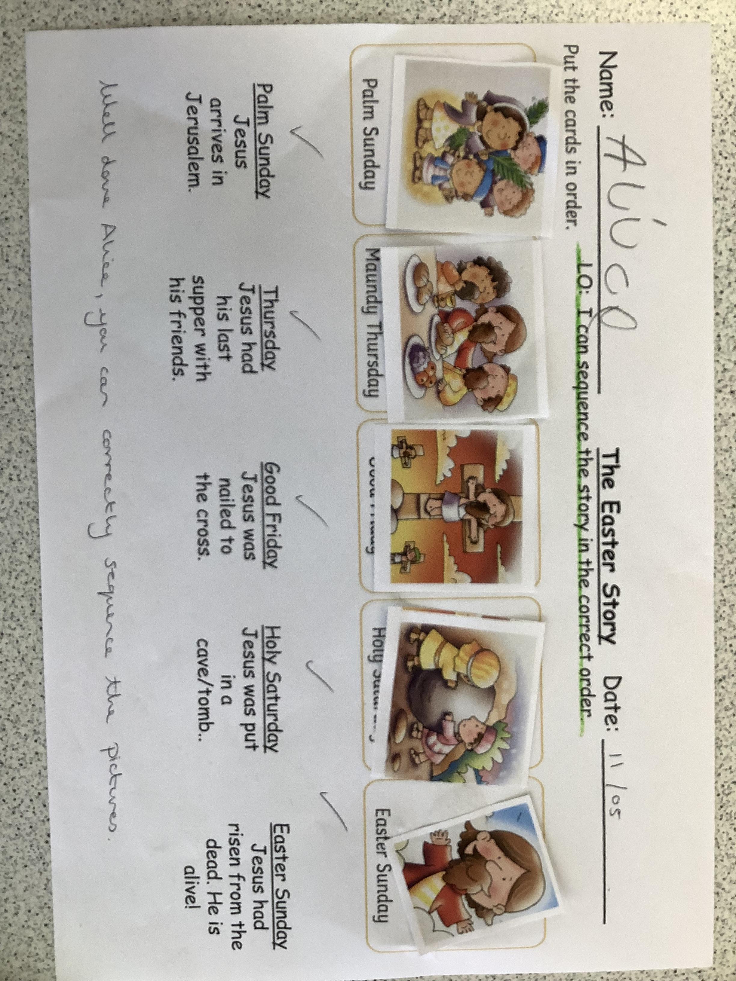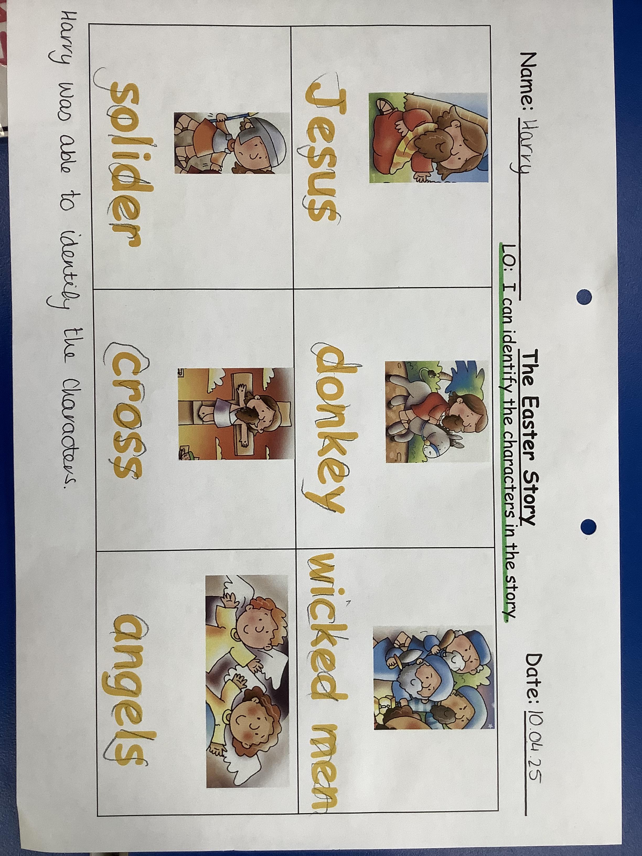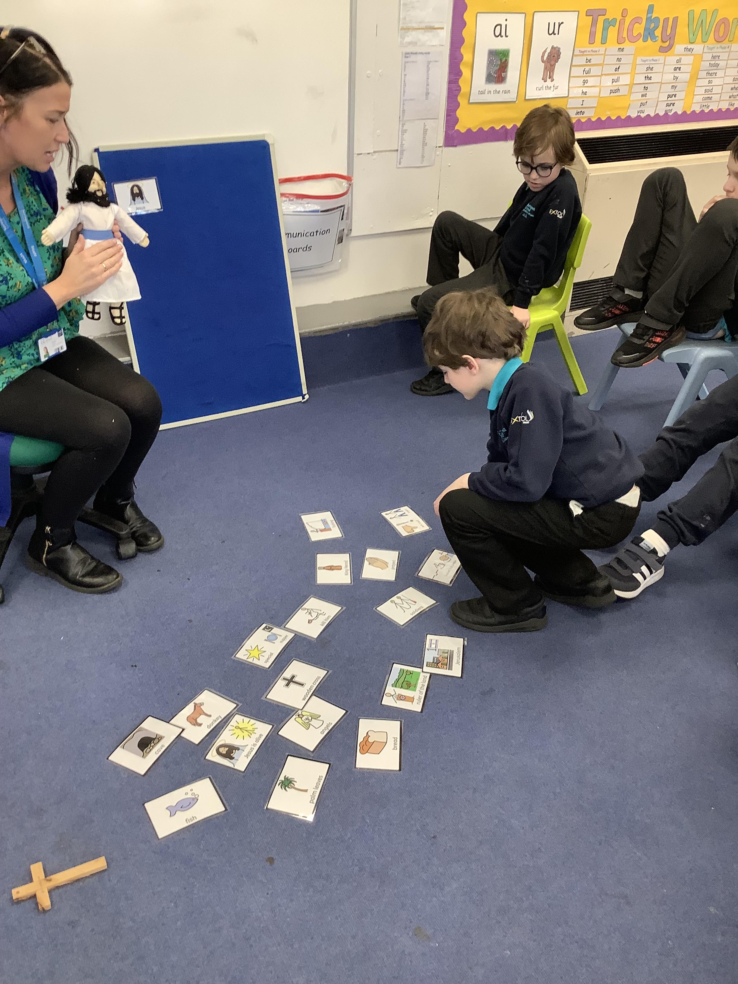 11.04.25 RE/LITERACY: EASTER The children have enjoyed listening to their teacher Jane, reading them the story of Easter. They have been answering comprehension questions using a variety of communication in print symbols. We identified all the different characters in the story. We had our very own last supper together, eating bread and drinking red juice. We then looked at some picture cards and sequenced them in the correct order of the story.