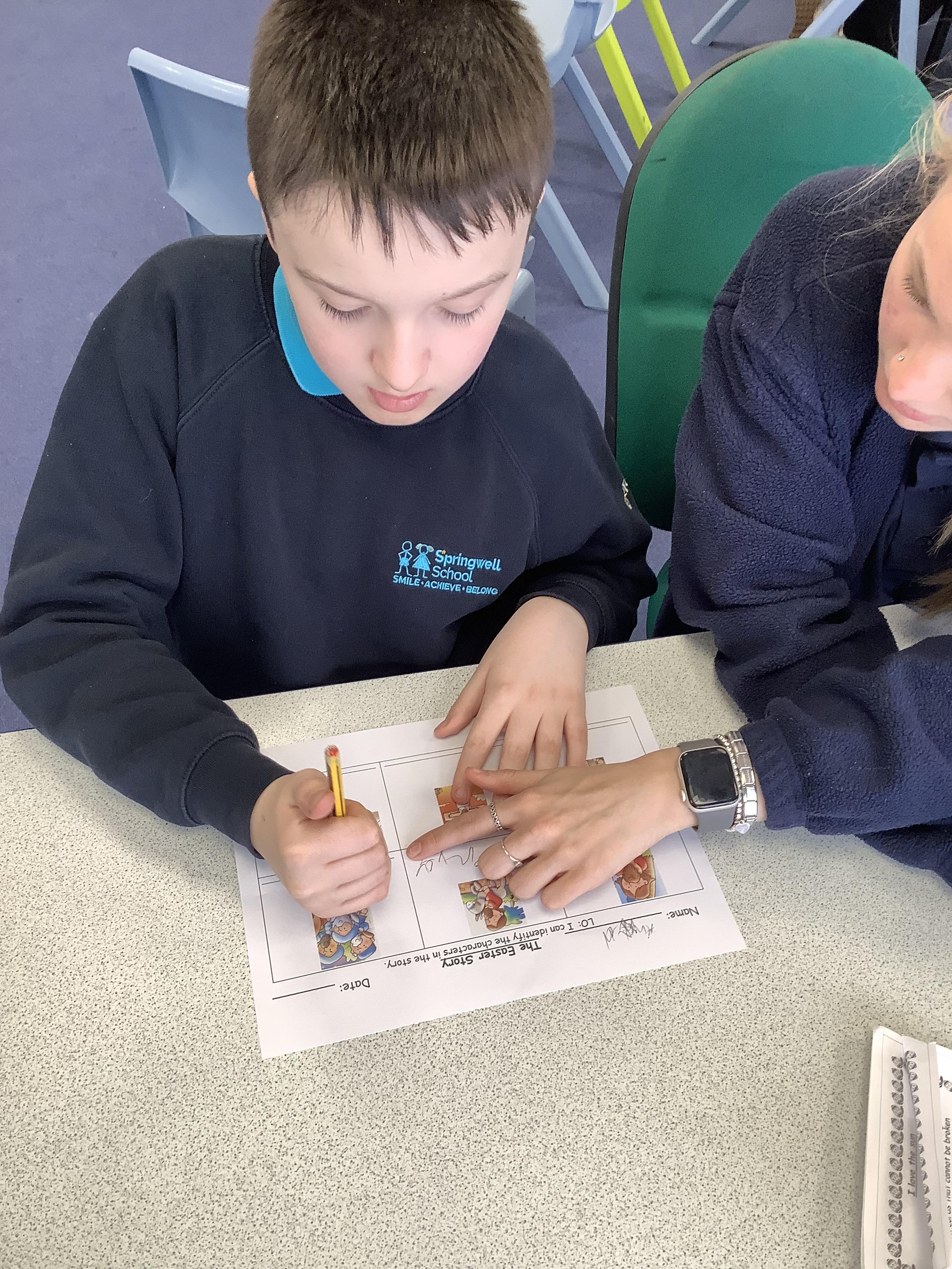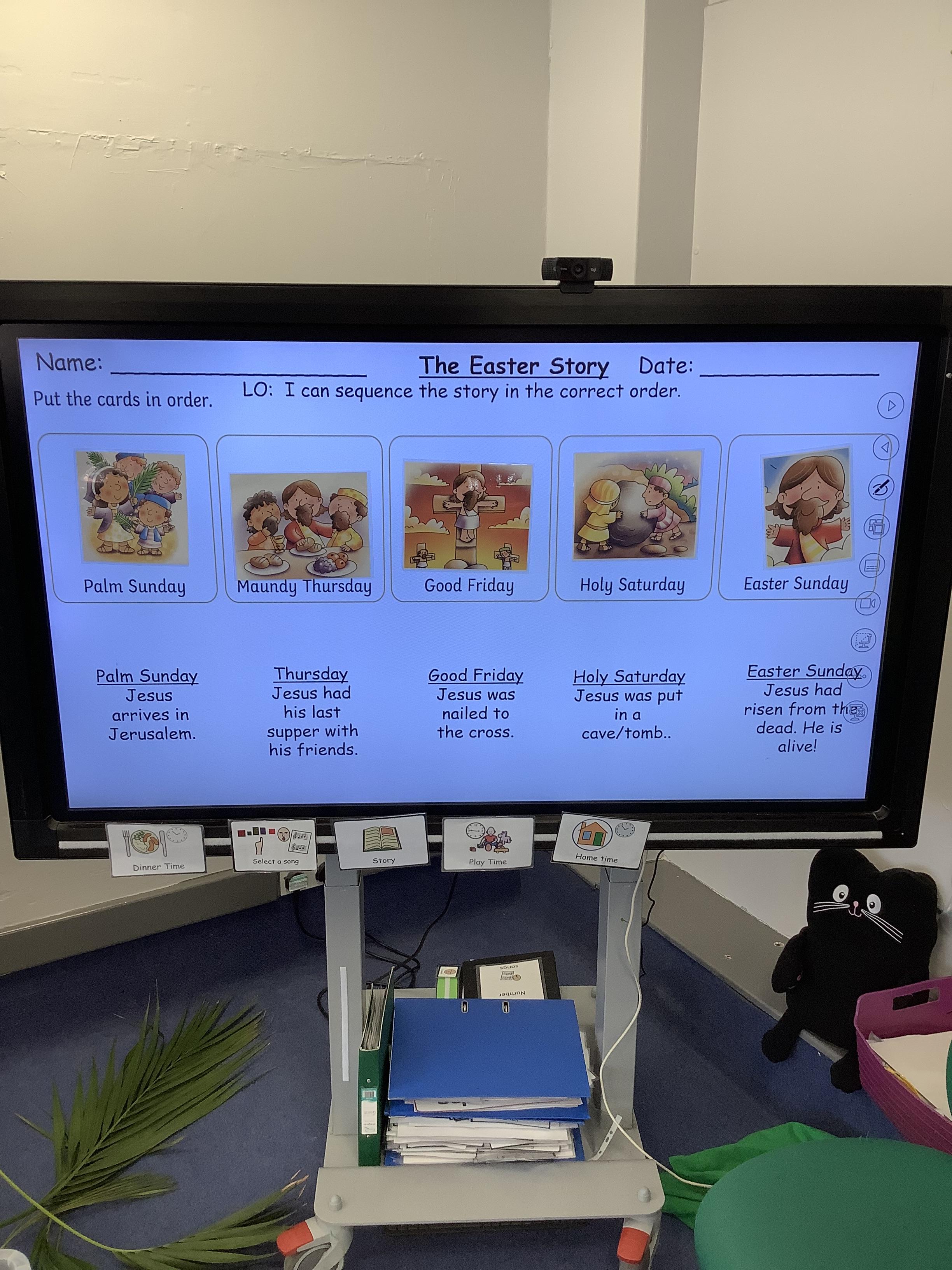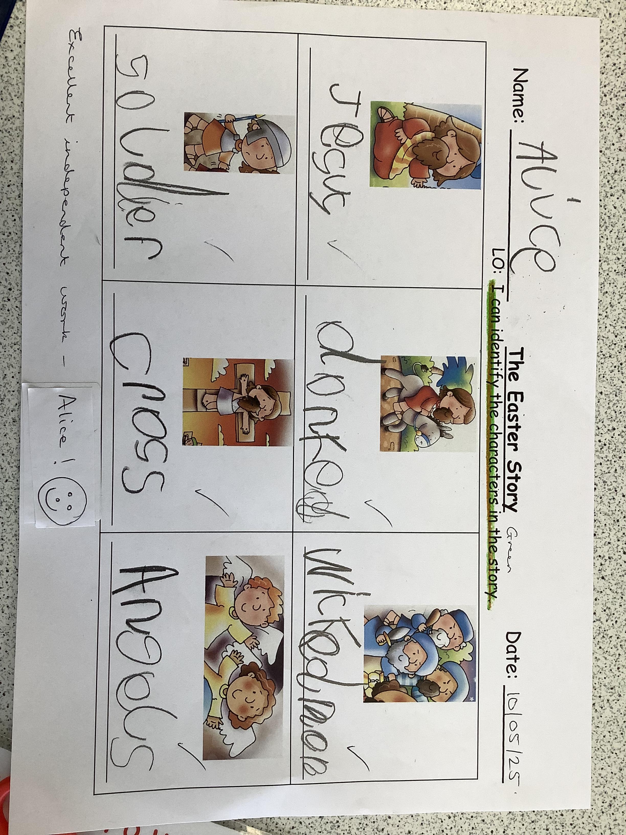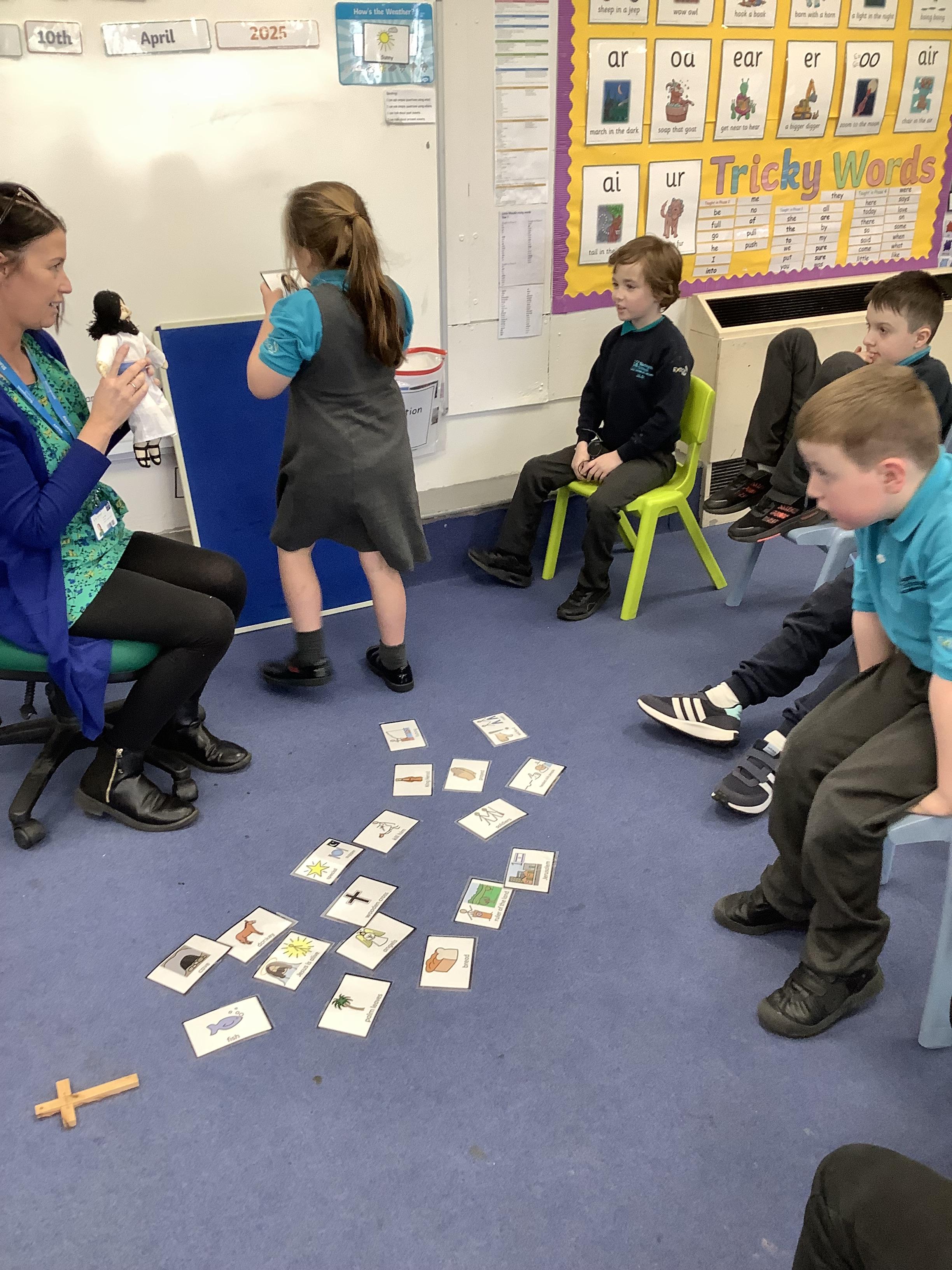 11.04.25 RE/LITERACY: EASTER The children have enjoyed listening to their teacher Jane, reading them the story of Easter. They have been answering comprehension questions using a variety of communication in print symbols. We identified all the different characters in the story. We had our very own last supper together, eating bread and drinking red juice. We then looked at some picture cards and sequenced them in the correct order of the story.