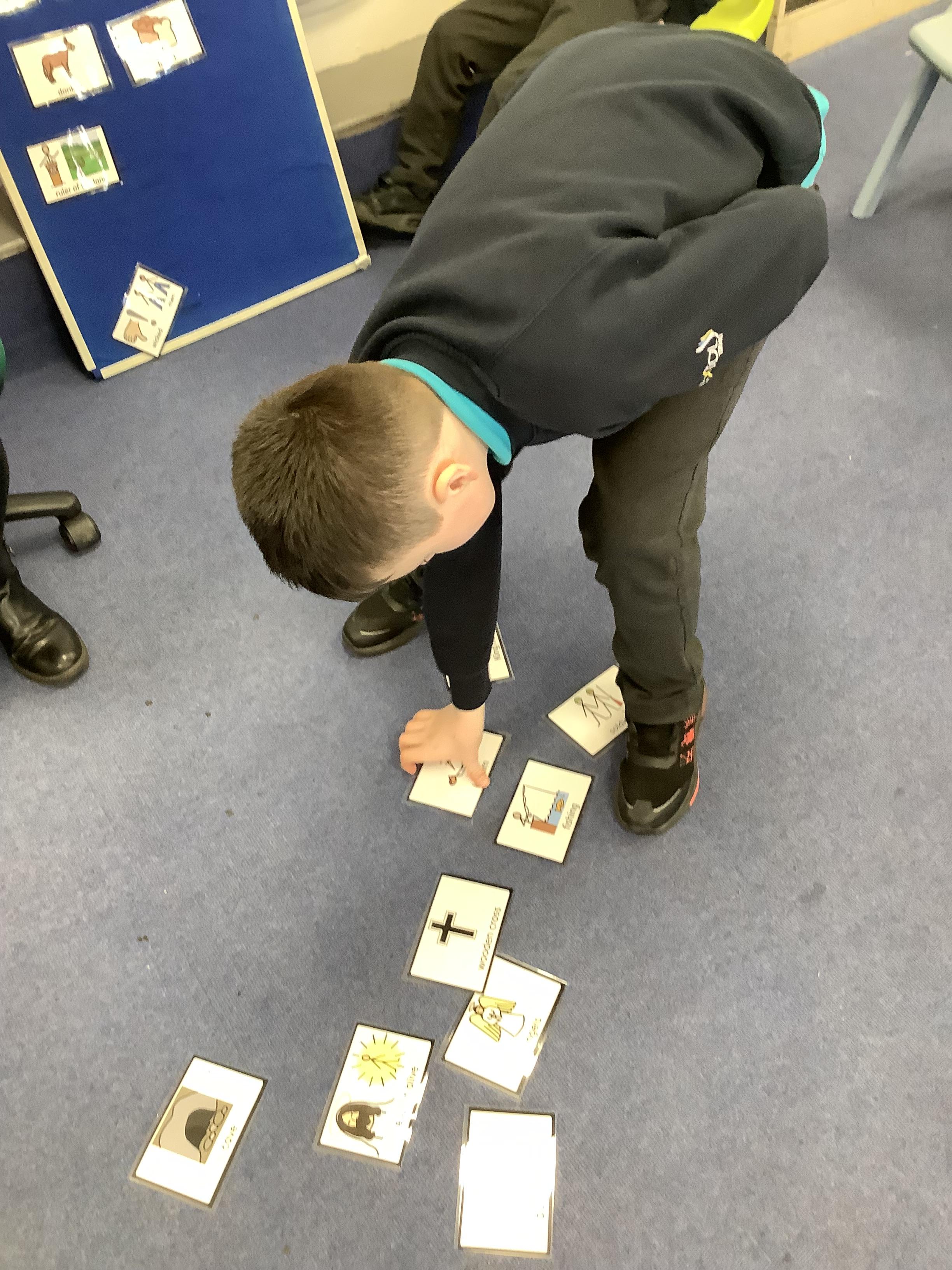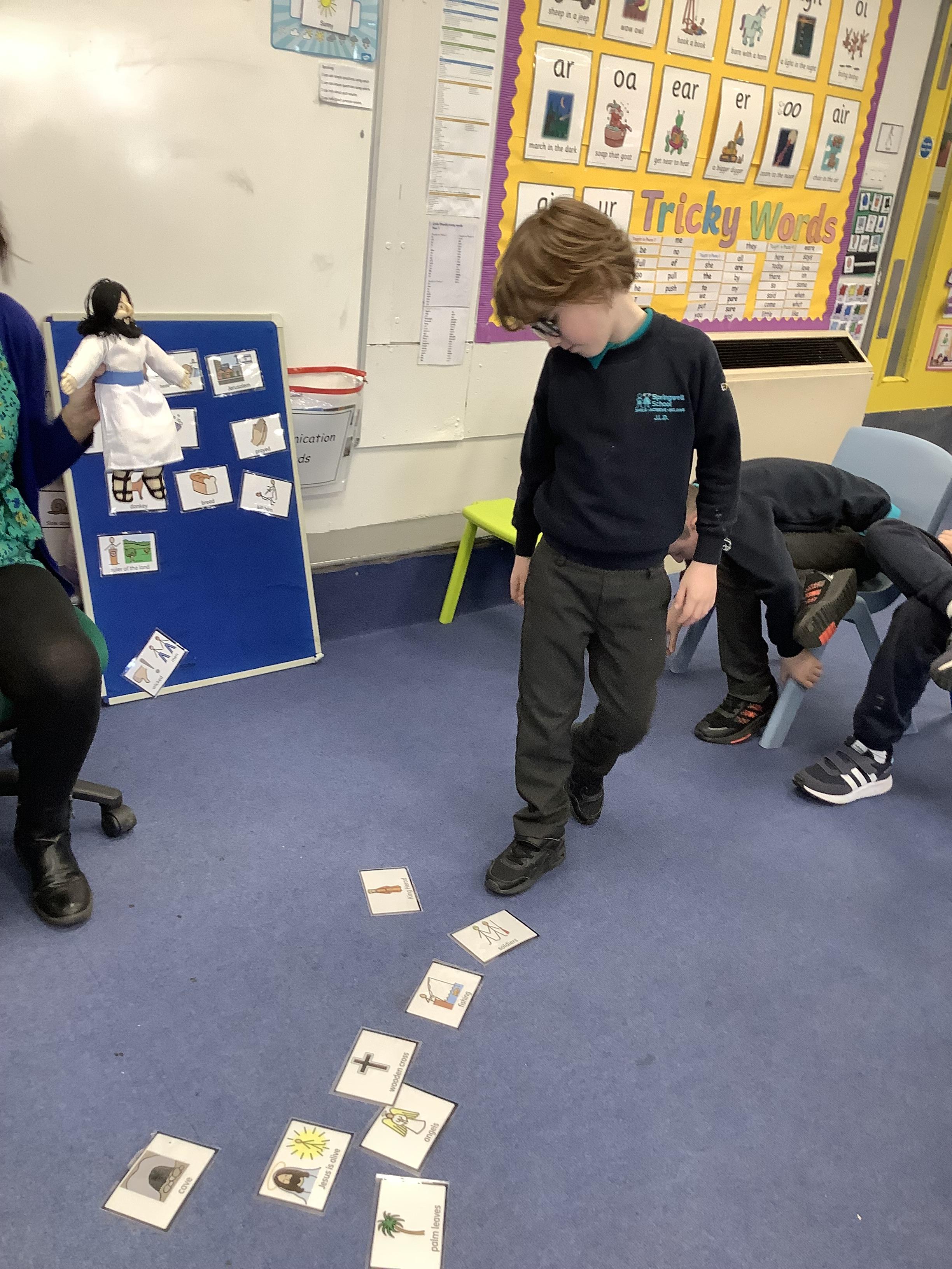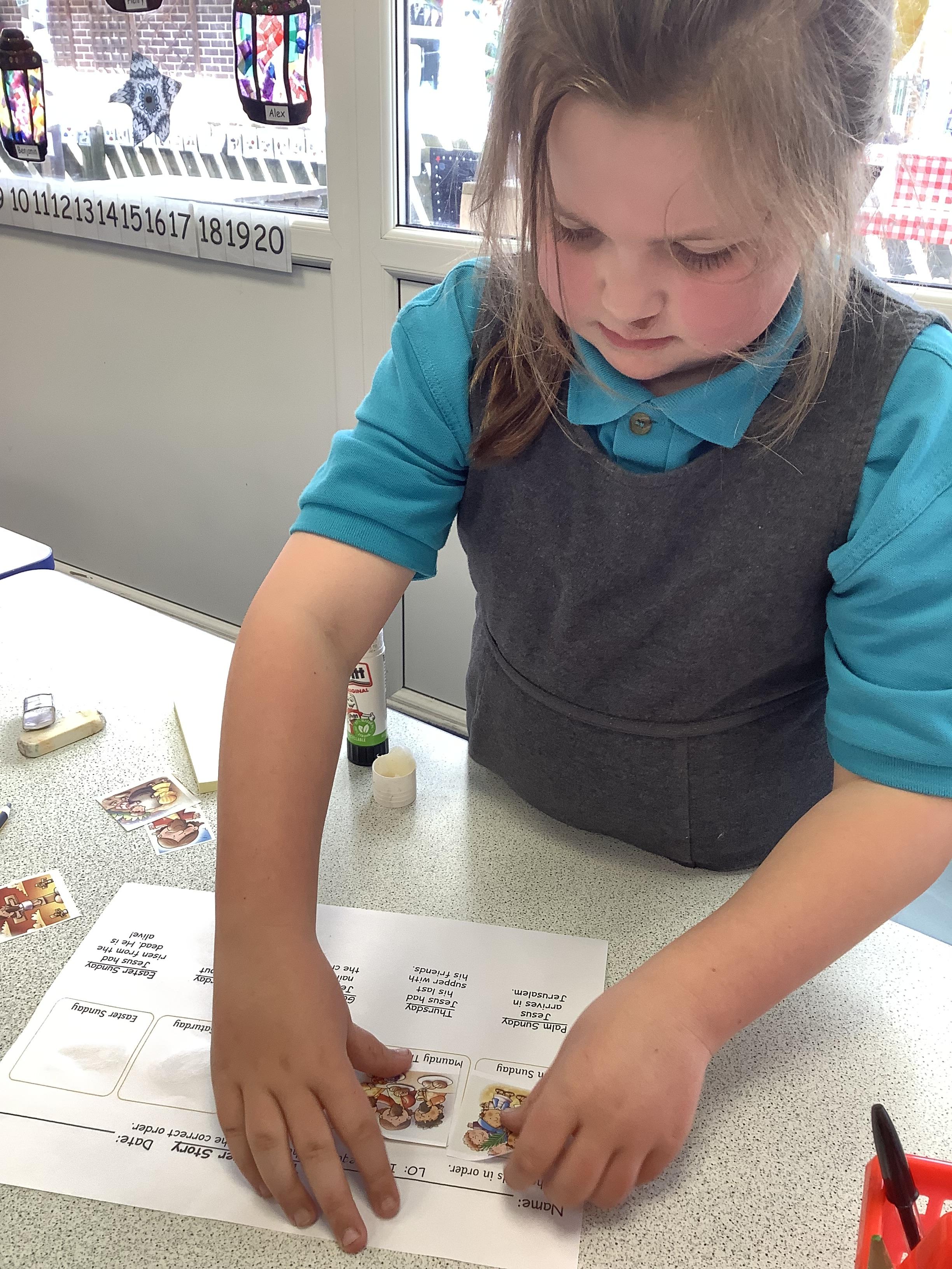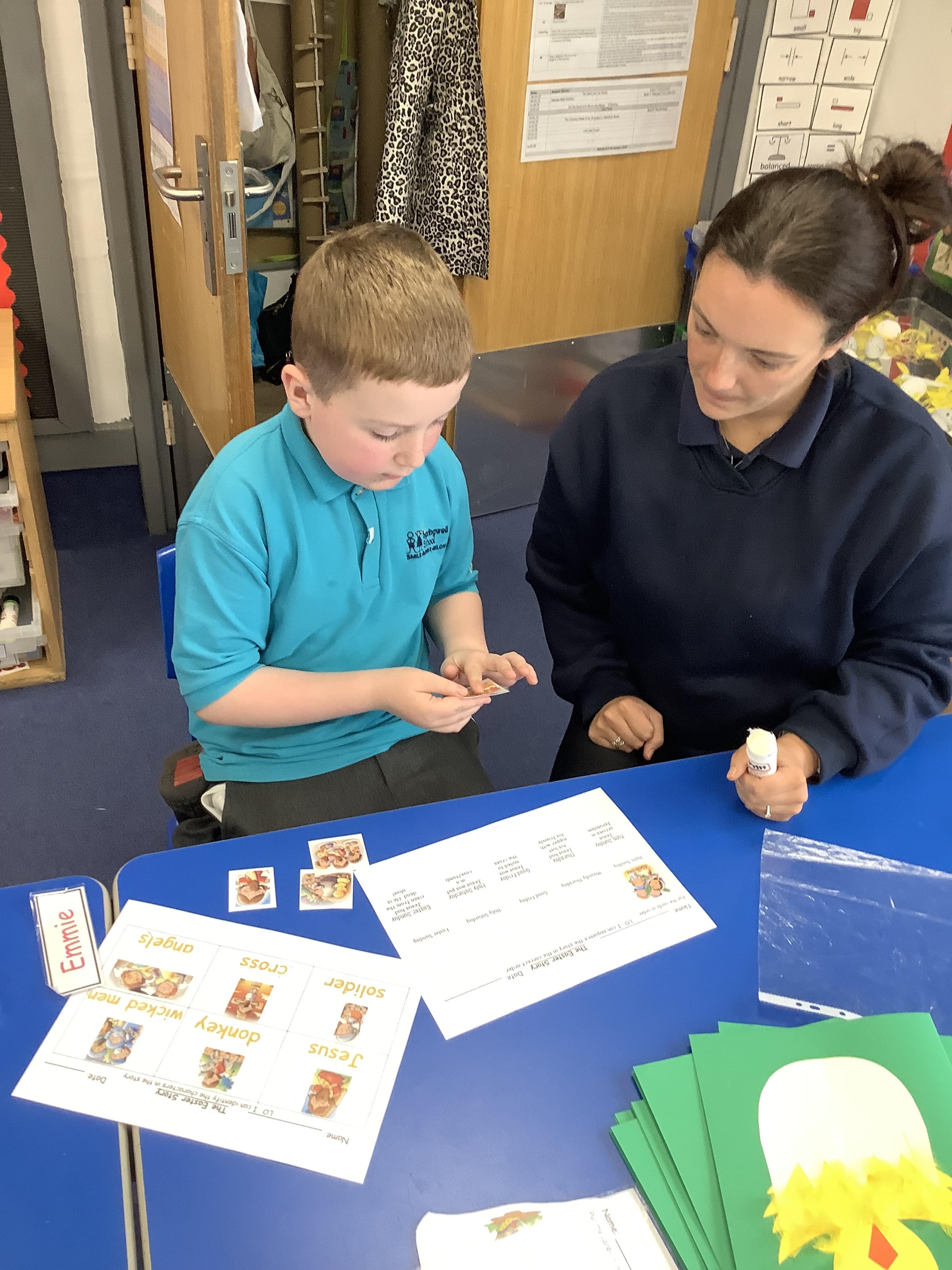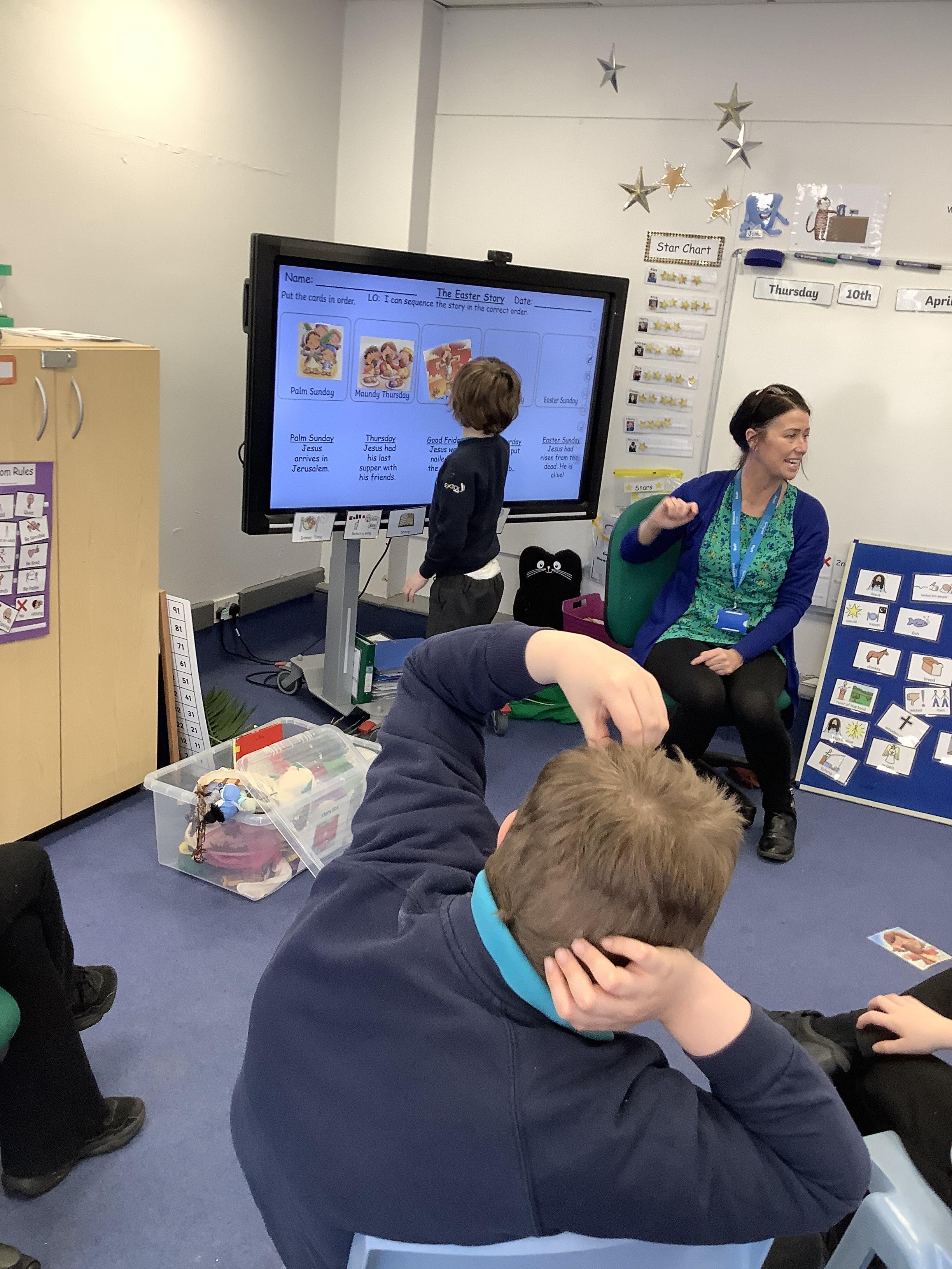 11.04.25 RE/LITERACY: EASTER The children have enjoyed listening to their teacher Jane, reading them the story of Easter. They have been answering comprehension questions using a variety of communication in print symbols. We identified all the different characters in the story. We had our very own last supper together, eating bread and drinking red juice. We then looked at some picture cards and sequenced them in the correct order of the story.