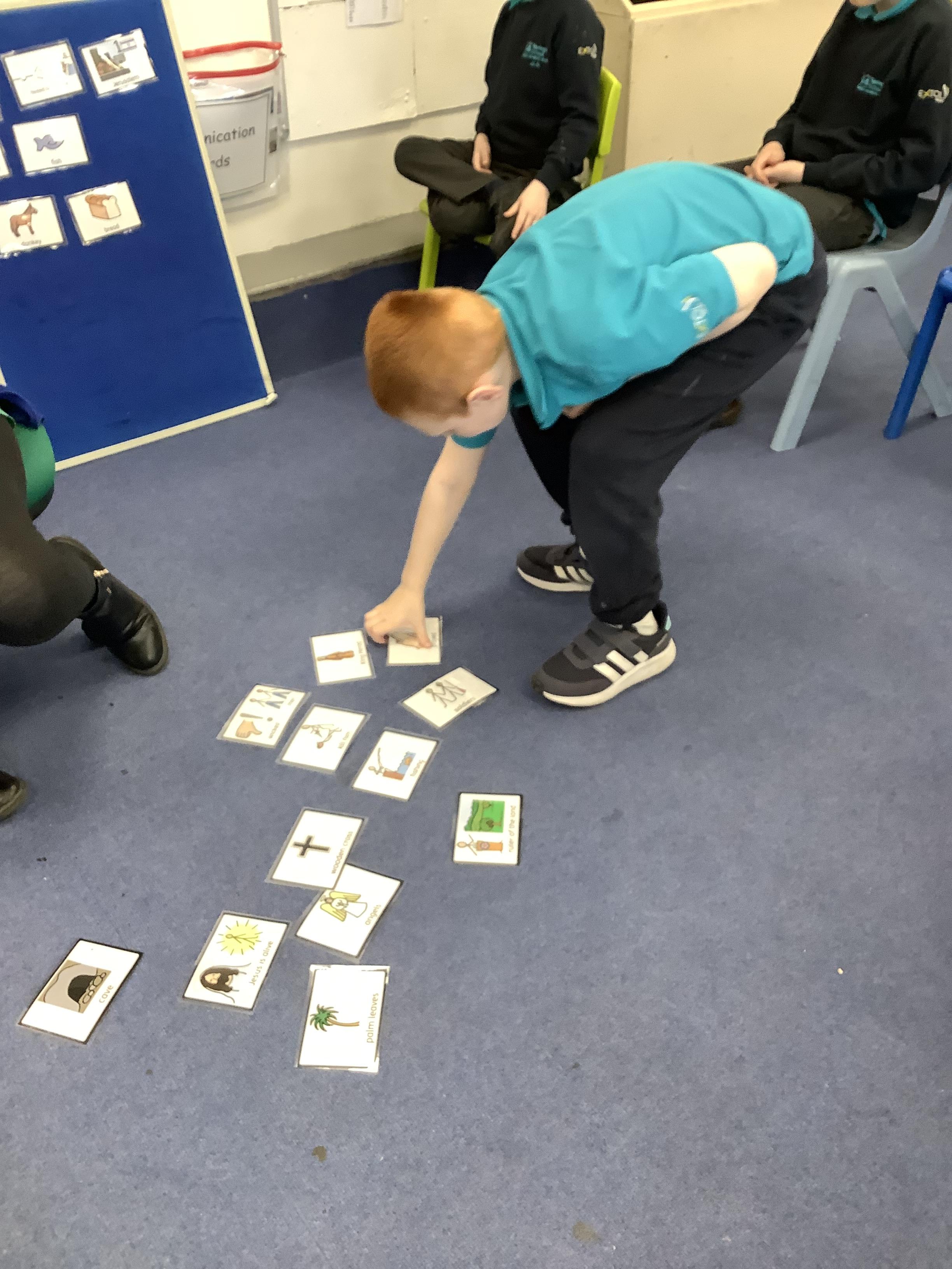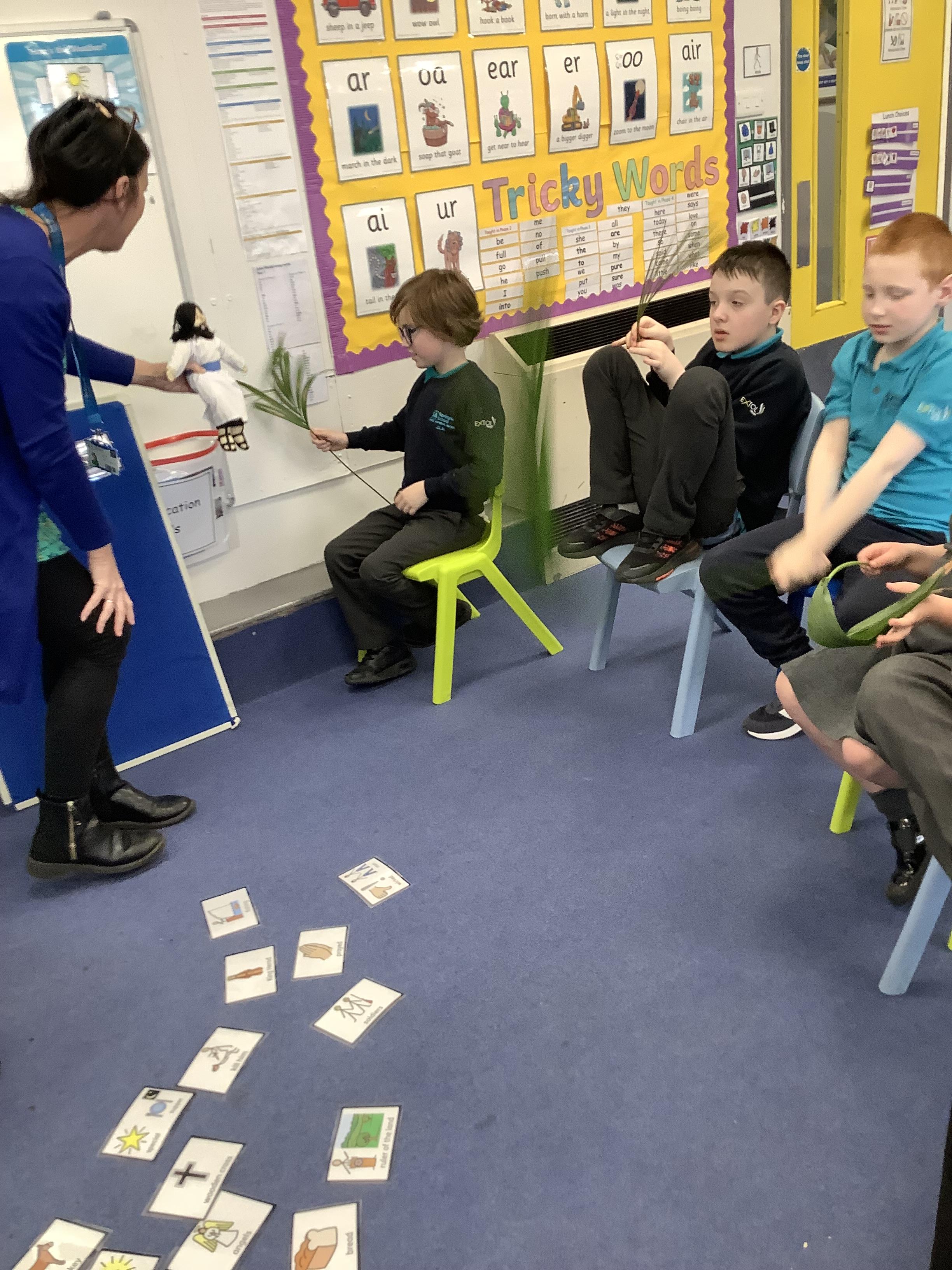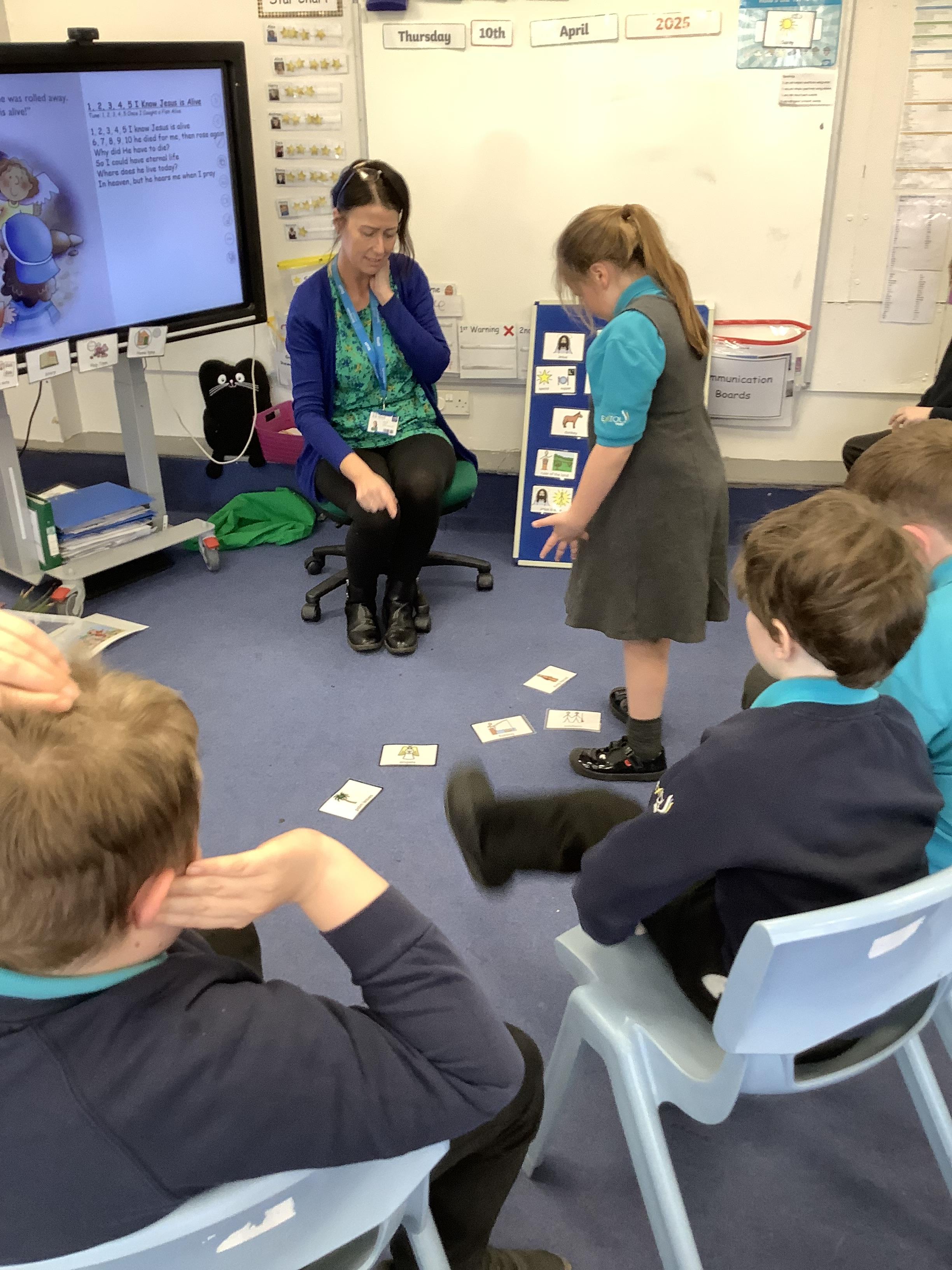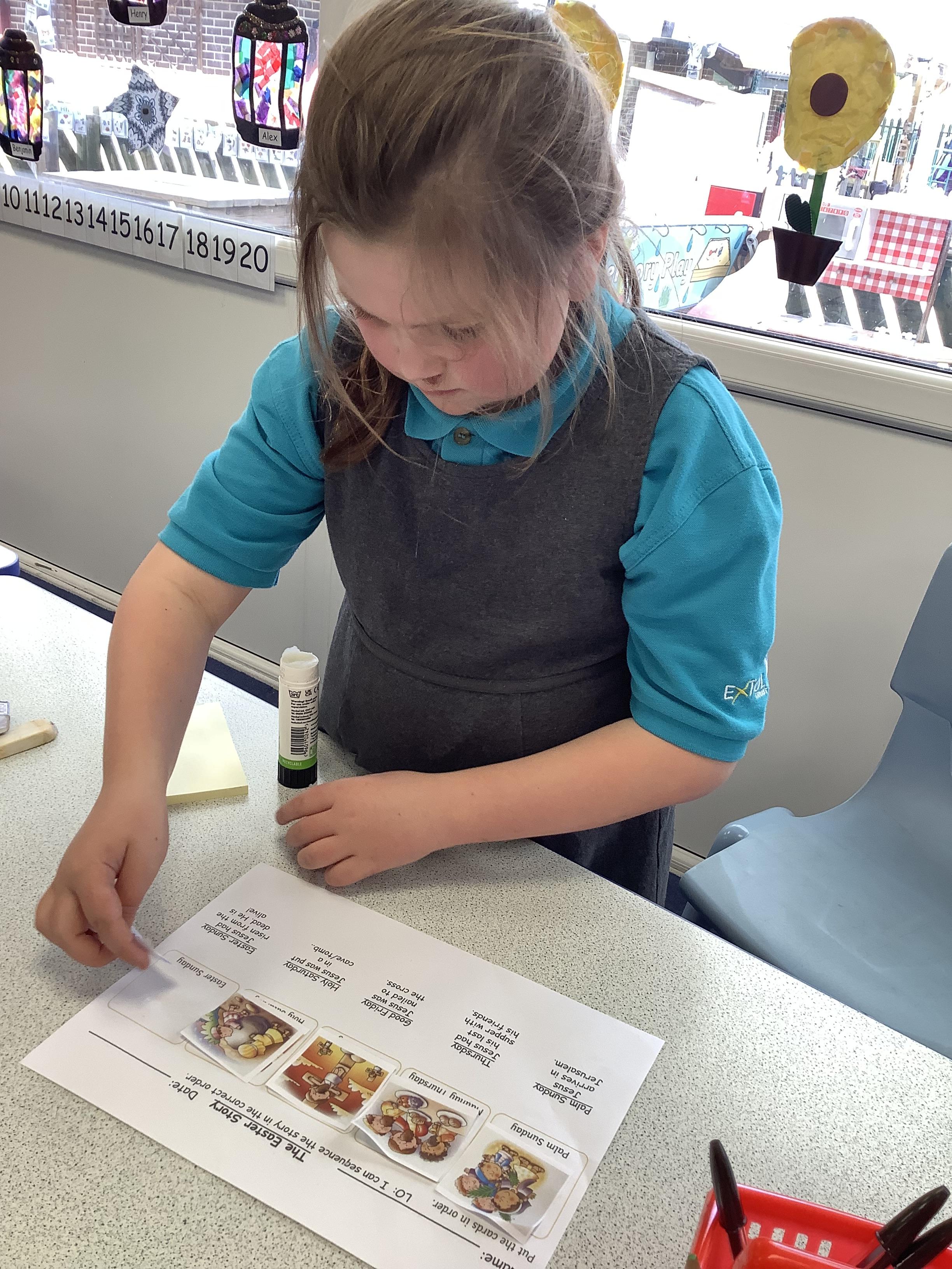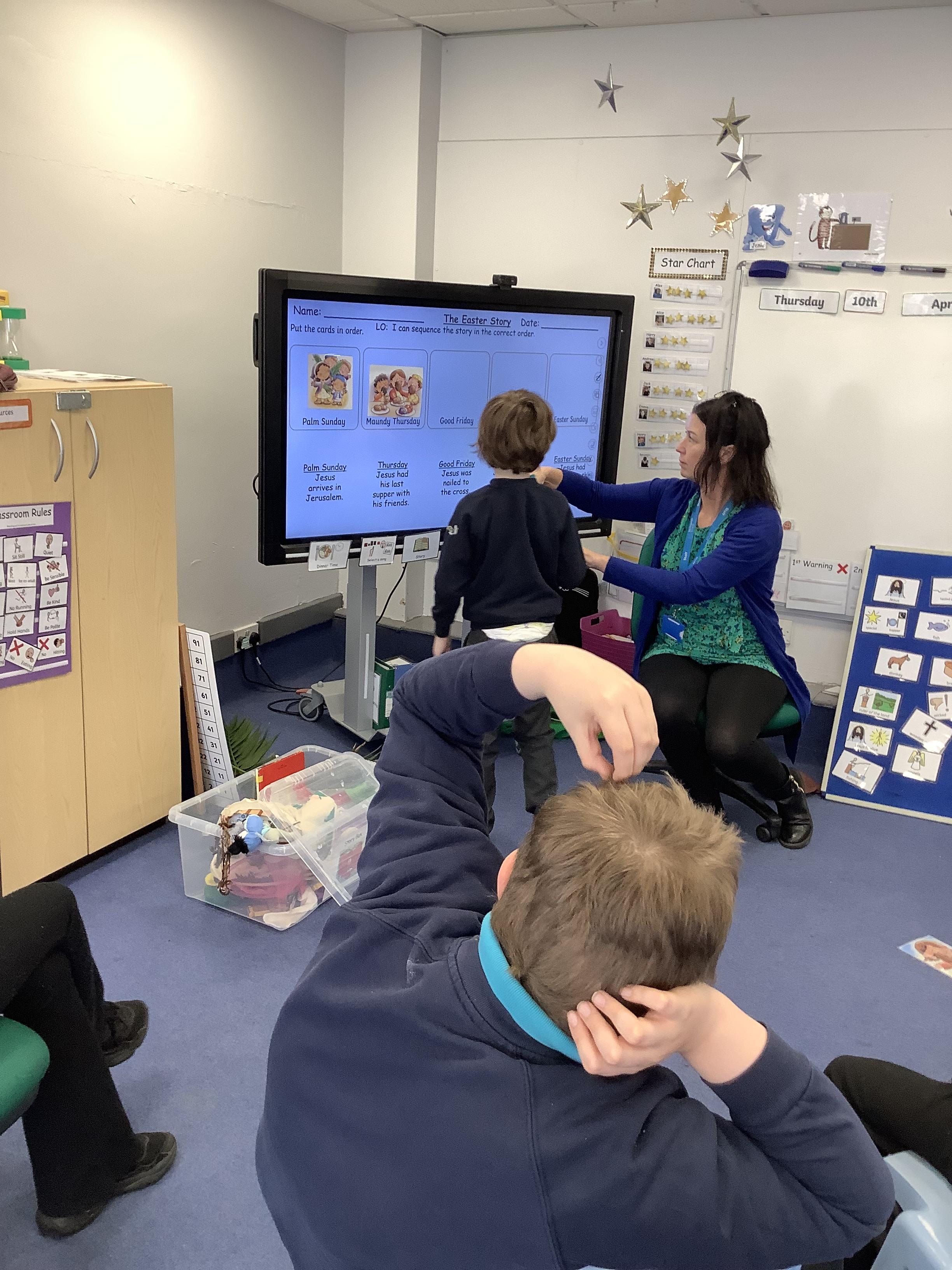 11.04.25 RE/LITERACY: EASTER The children have enjoyed listening to their teacher Jane, reading them the story of Easter. They have been answering comprehension questions using a variety of communication in print symbols. We identified all the different characters in the story. We had our very own last supper together, eating bread and drinking red juice. We then looked at some picture cards and sequenced them in the correct order of the story.