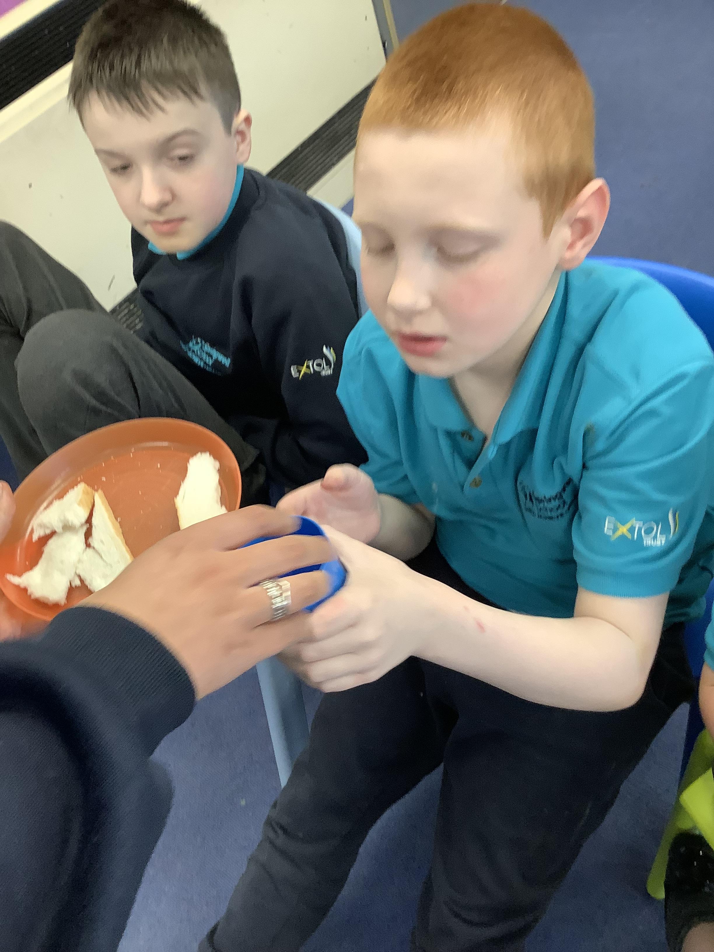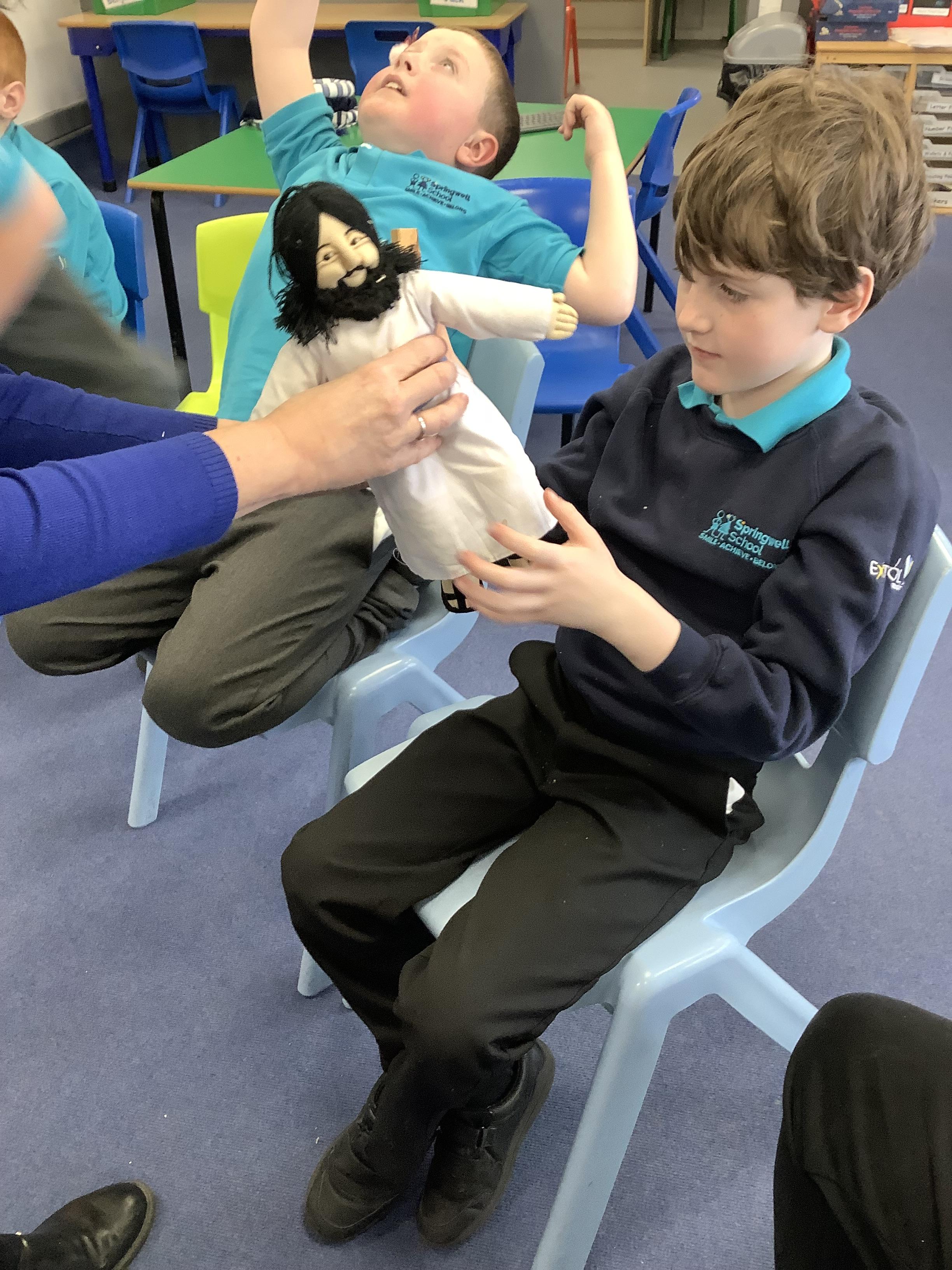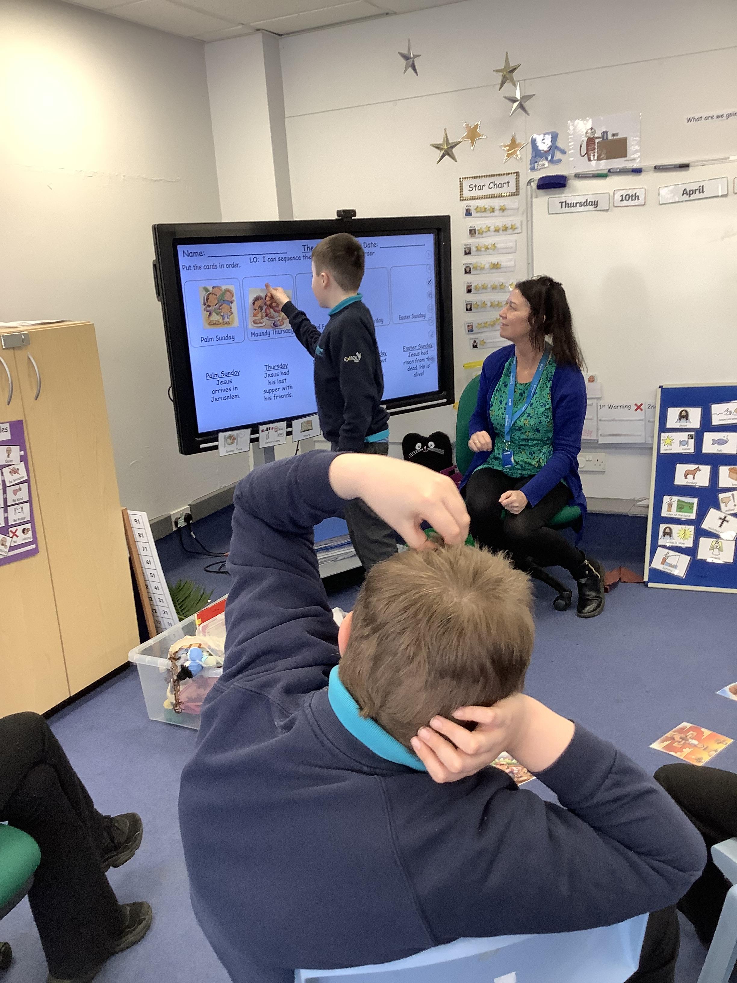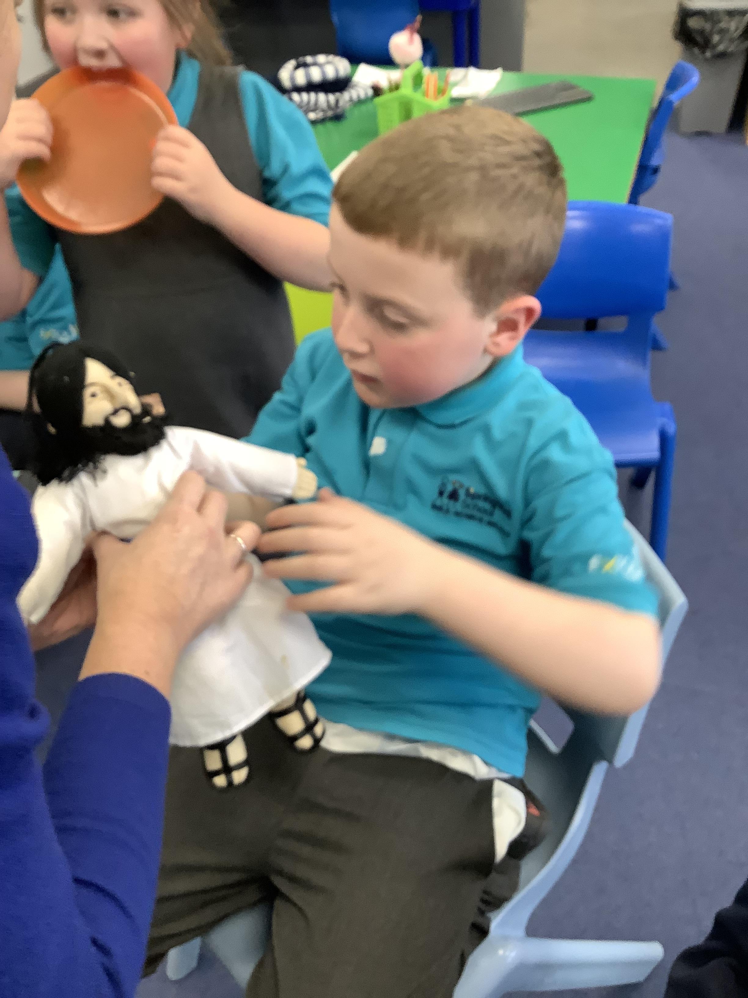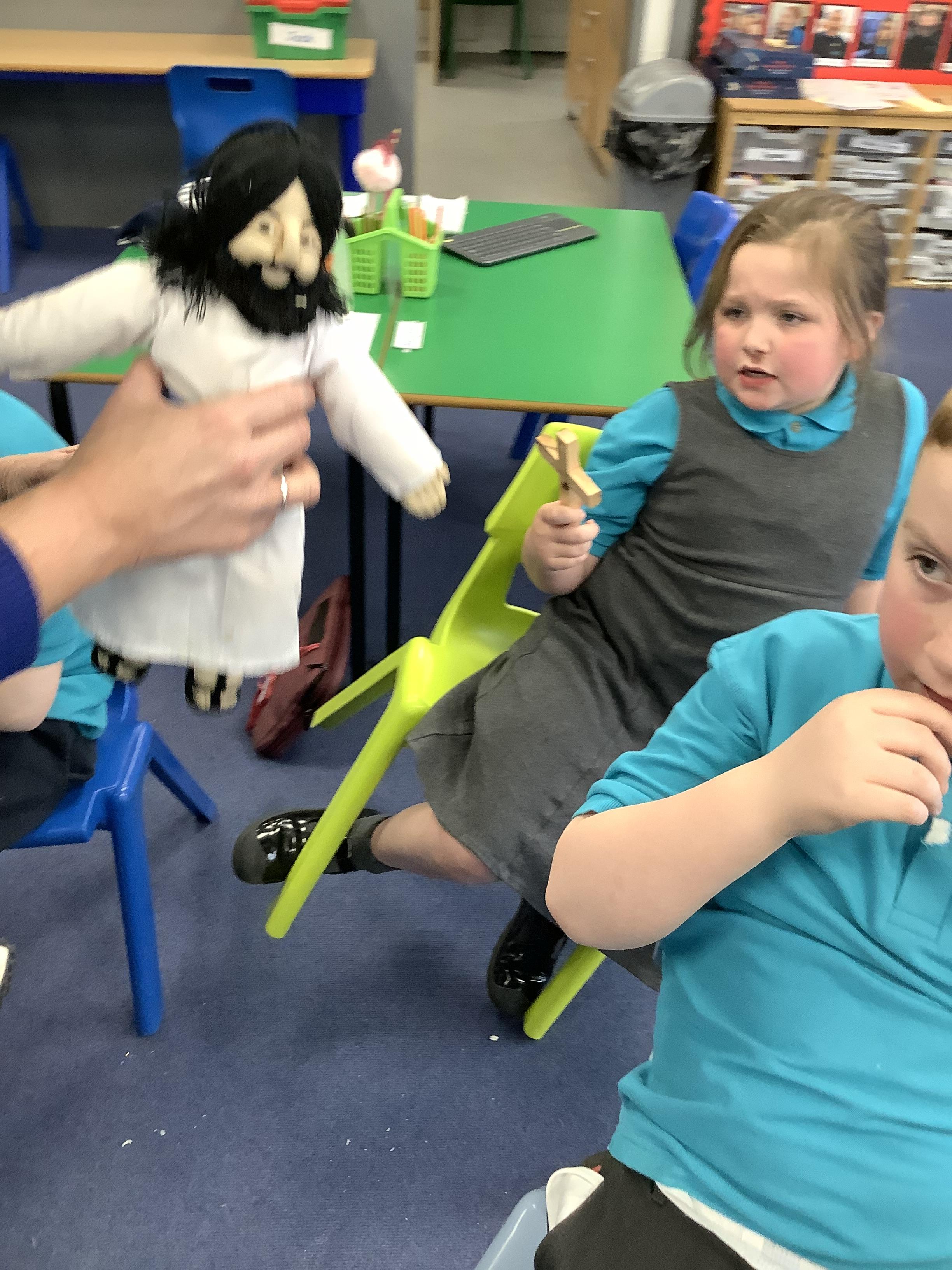 11.04.25 RE/LITERACY: EASTER The children have enjoyed listening to their teacher Jane, reading them the story of Easter. They have been answering comprehension questions using a variety of communication in print symbols. We identified all the different characters in the story. We had our very own last supper together, eating bread and drinking red juice. We then looked at some picture cards and sequenced them in the correct order of the story.
