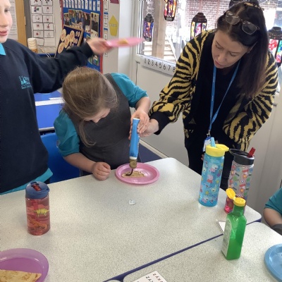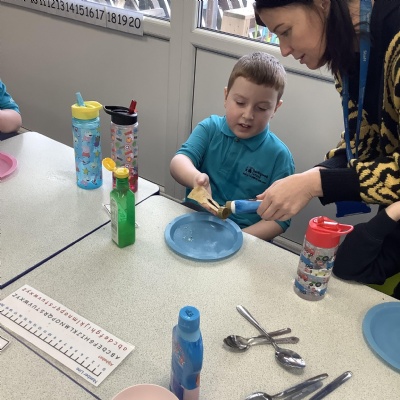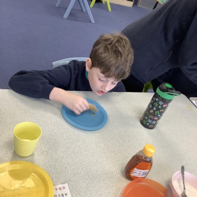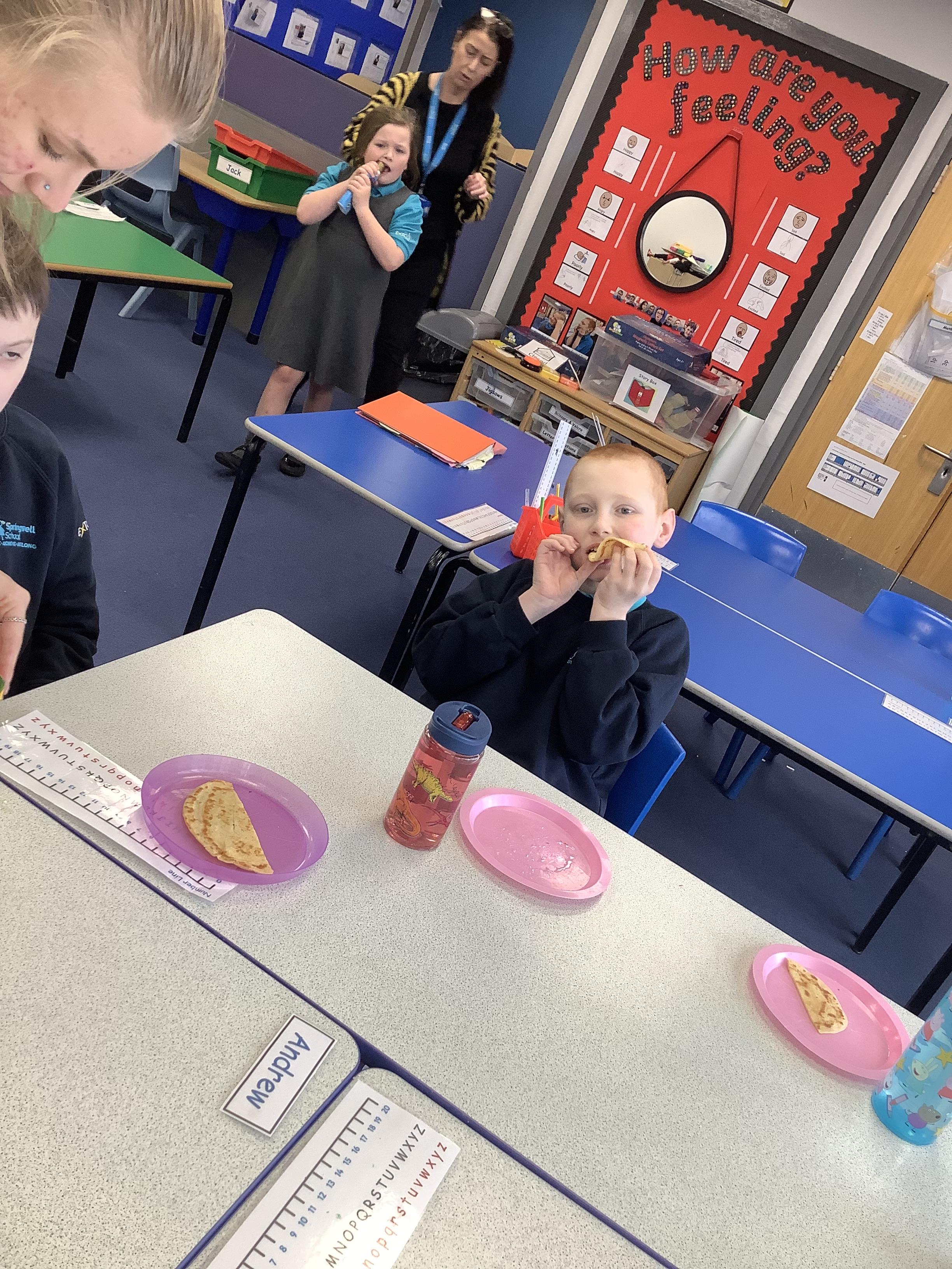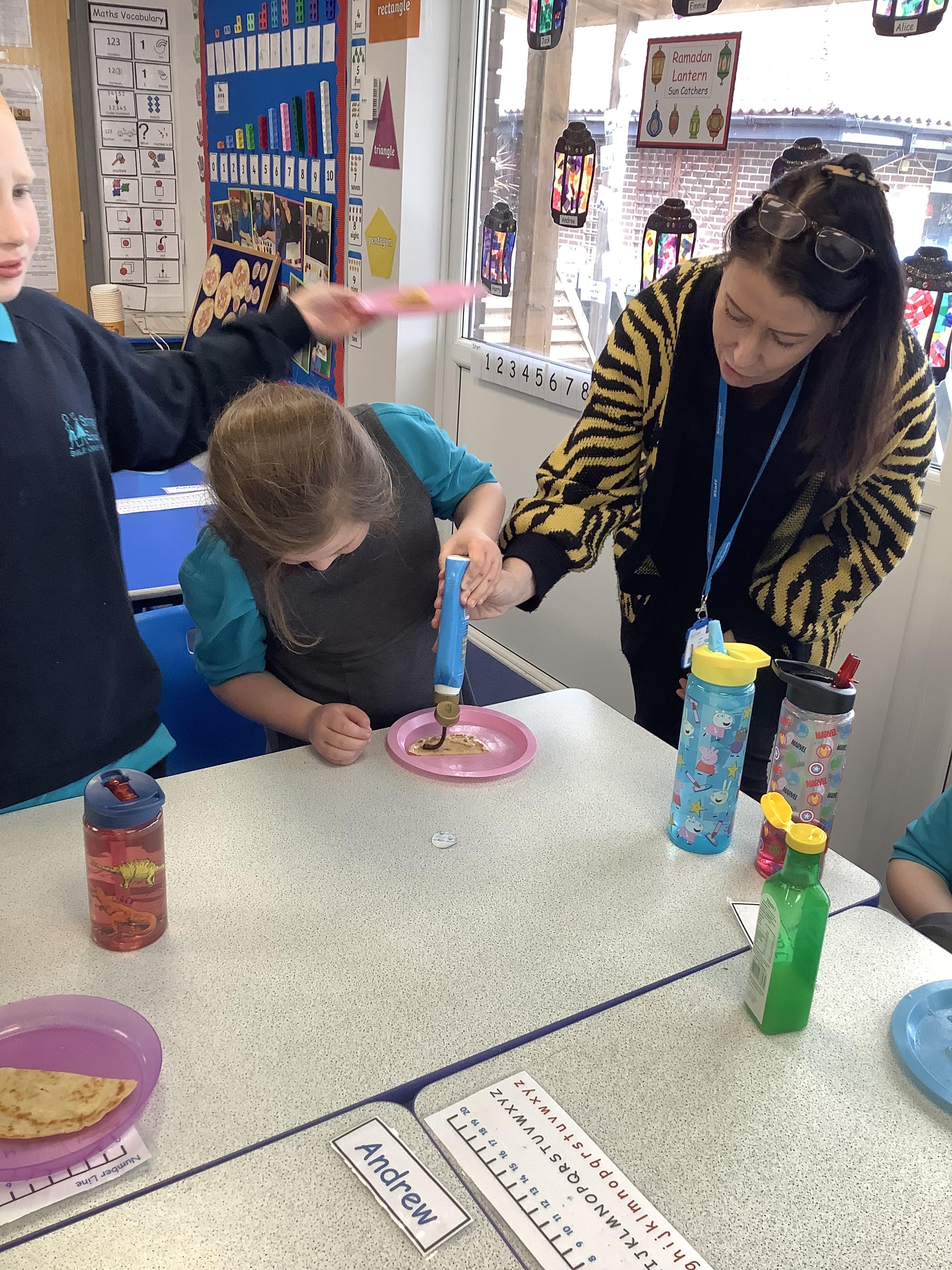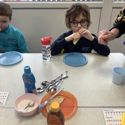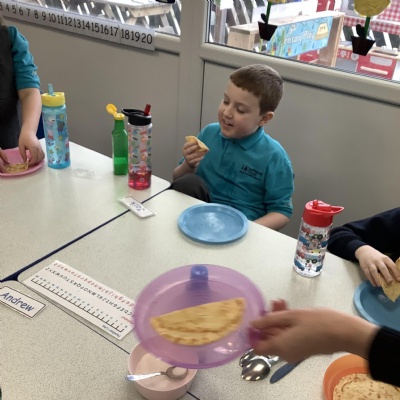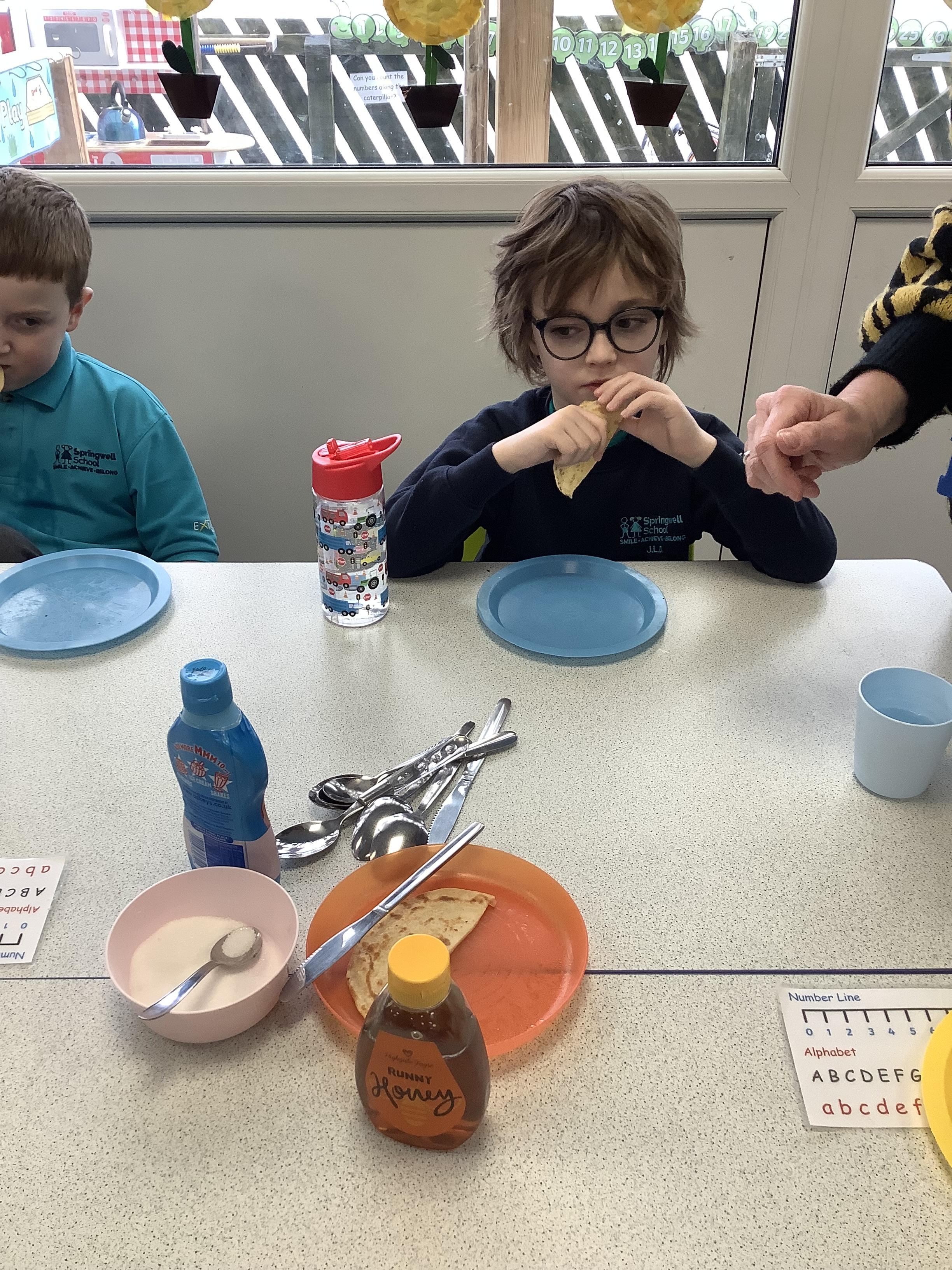05.03.25 PANCAKE DAY: We followed a recipe, weighed out ingredients and made our own delicious pancakes in class today! Our teacher brought in lots of different toppings for us to taste (e,g, sugar, sliced bananas and oranges, honey, lemon, strawberry and chocolate sauce) and we chose our preferred topping to put on our pancakes.
