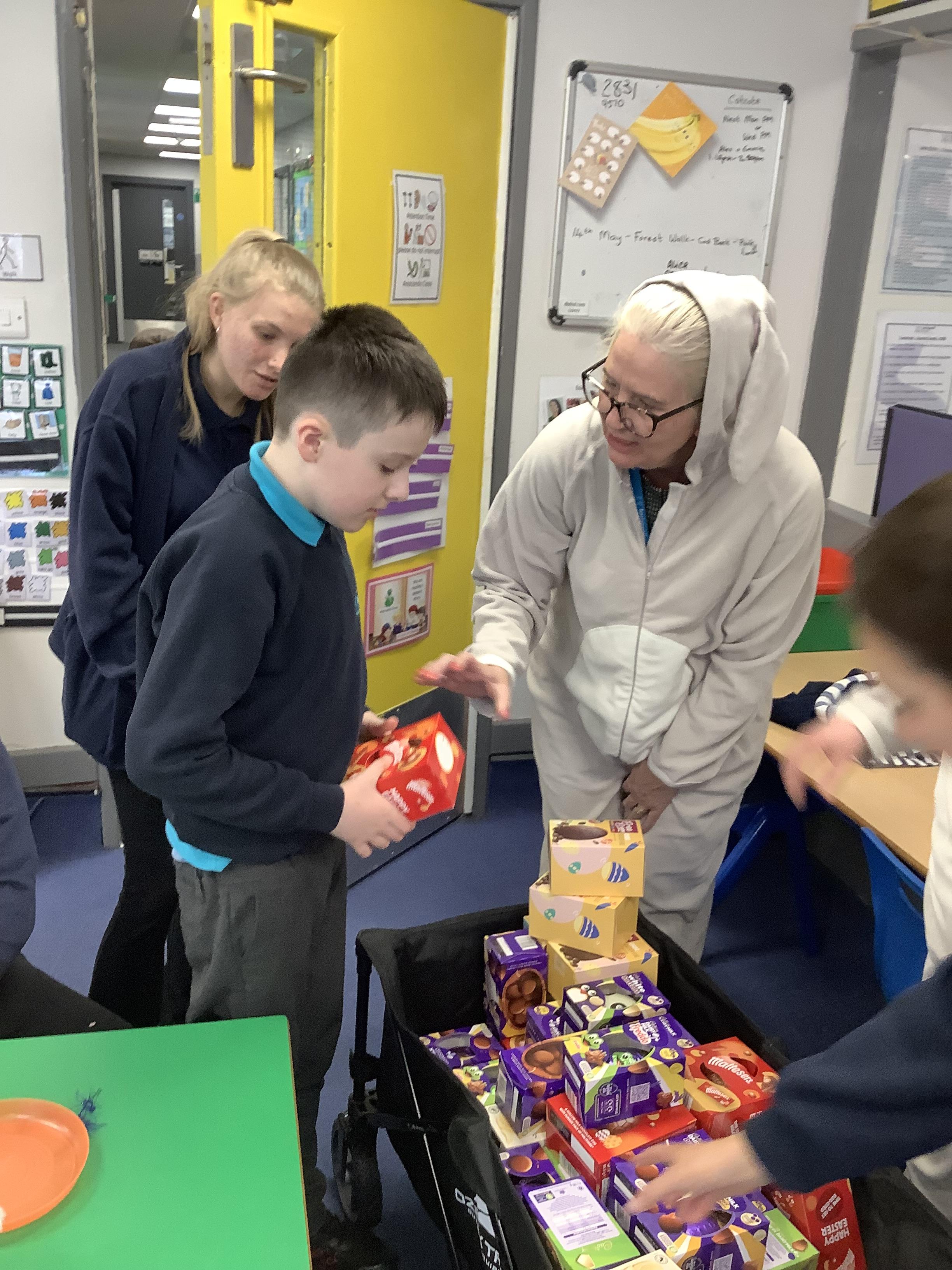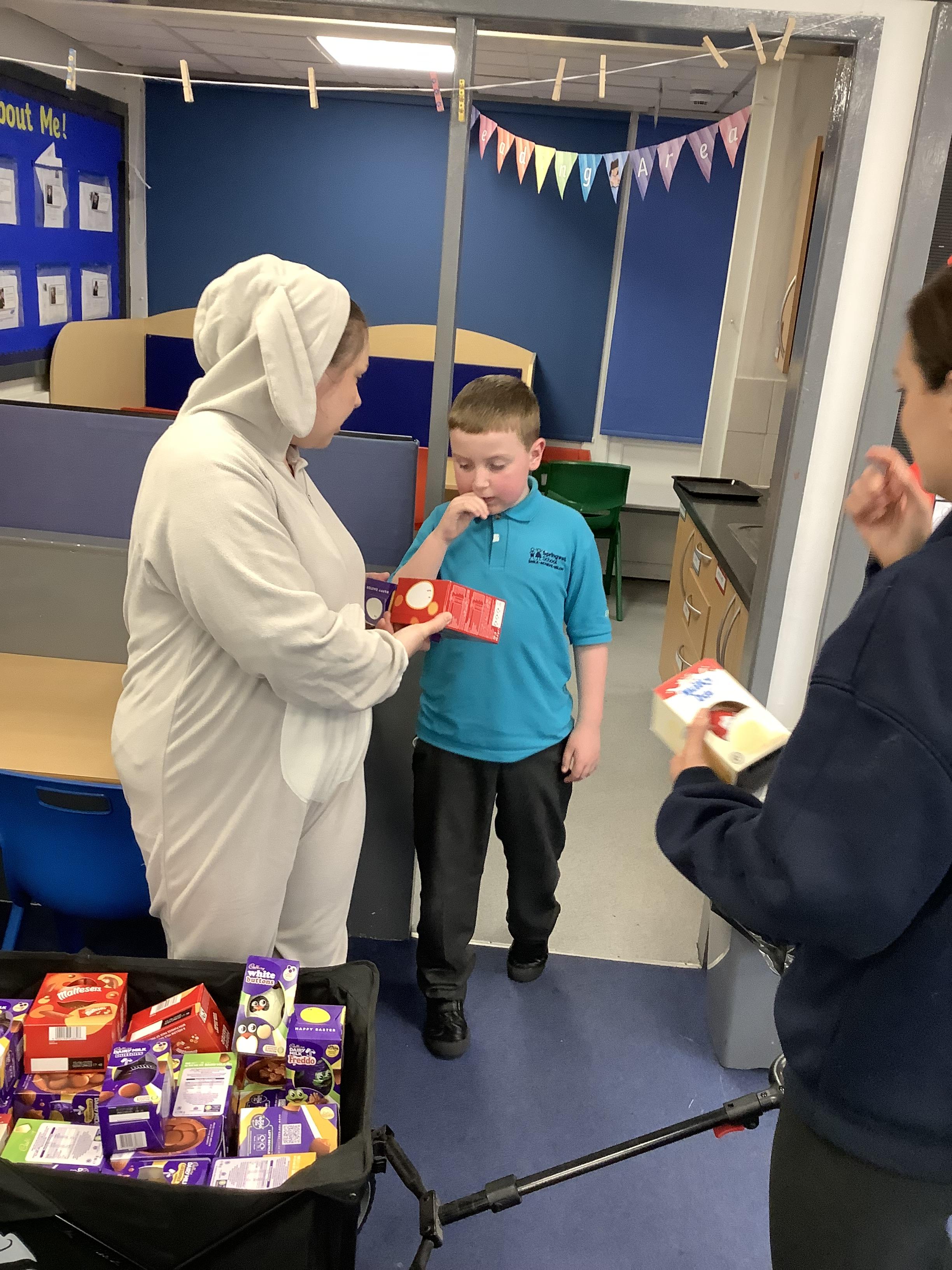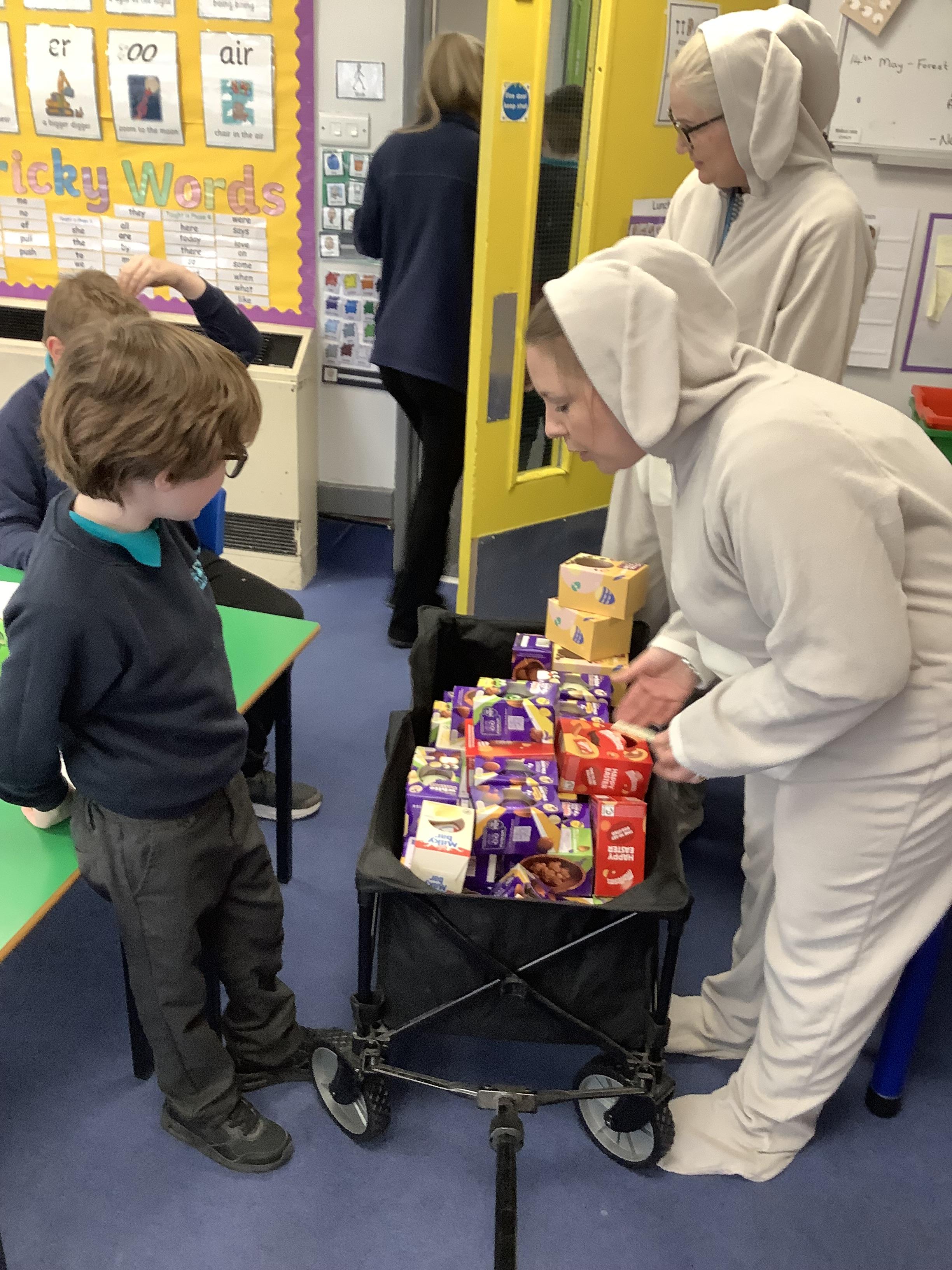 10.04.25 Easter Bunnies! We were pleasantly suprised this afternoon when two Easter Bunnies hopped into our classroom with a trailer full of chocolate Easter Eggs. We were able to choose our favourite one each!