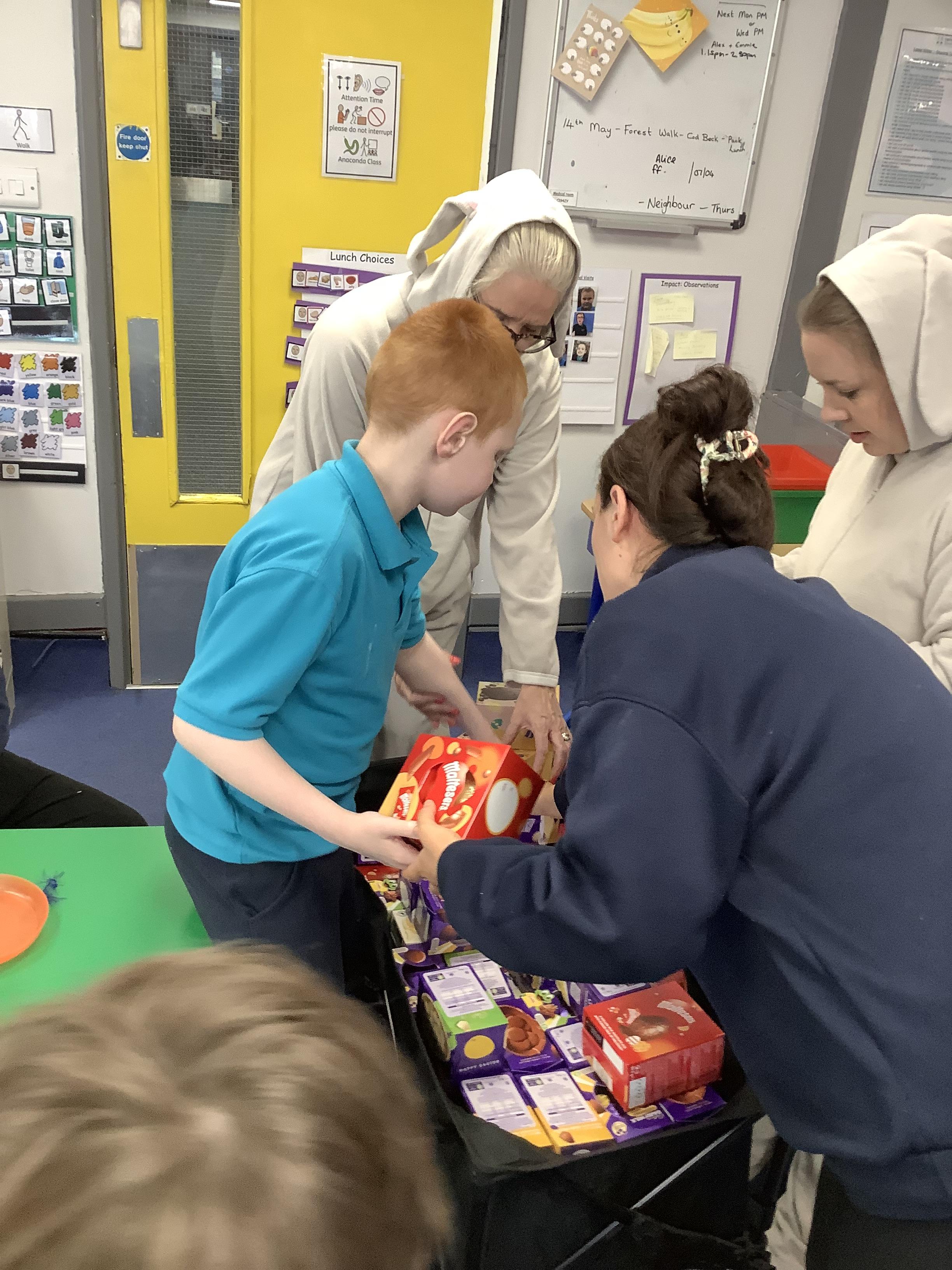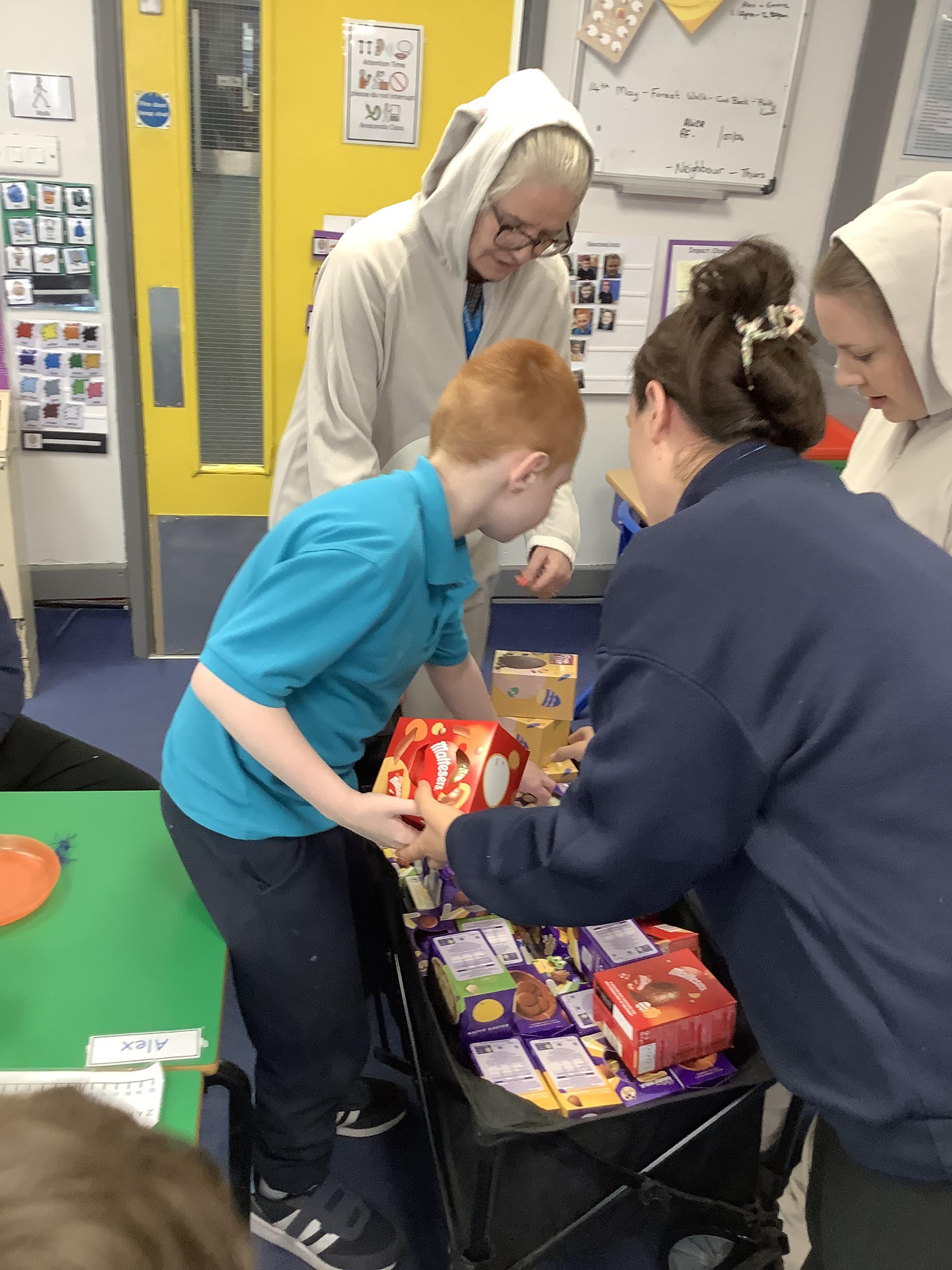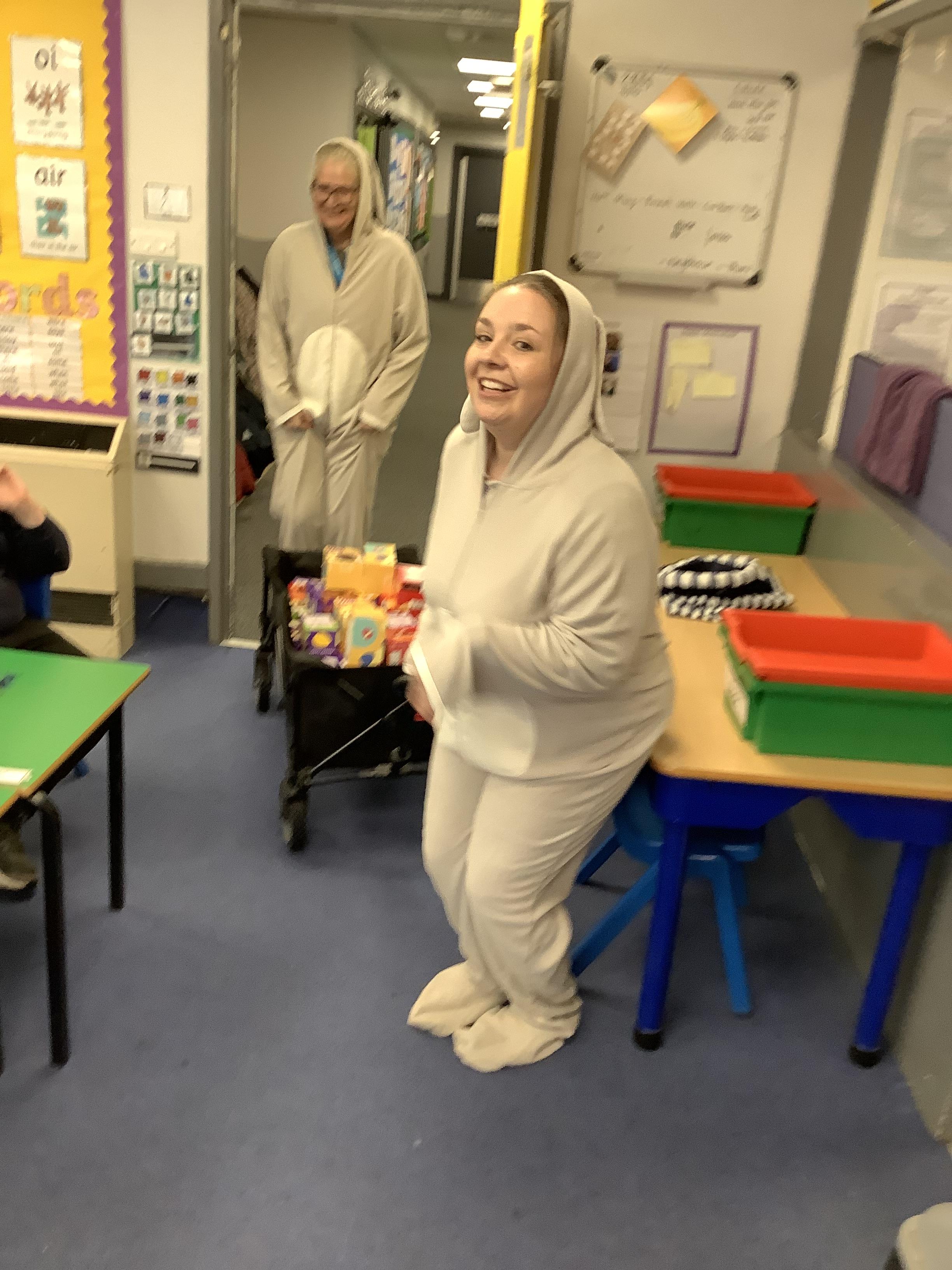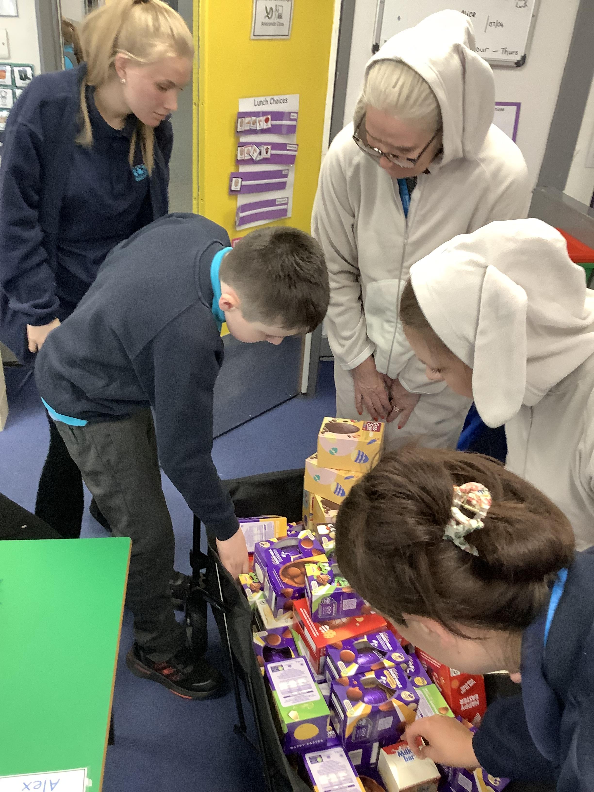 10.04.25 Easter Bunnies! We were pleasantly suprised this afternoon when two Easter Bunnies hopped into our classroom with a trailer full of chocolate Easter Eggs. We were able to choose our favourite one each!