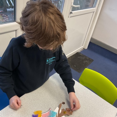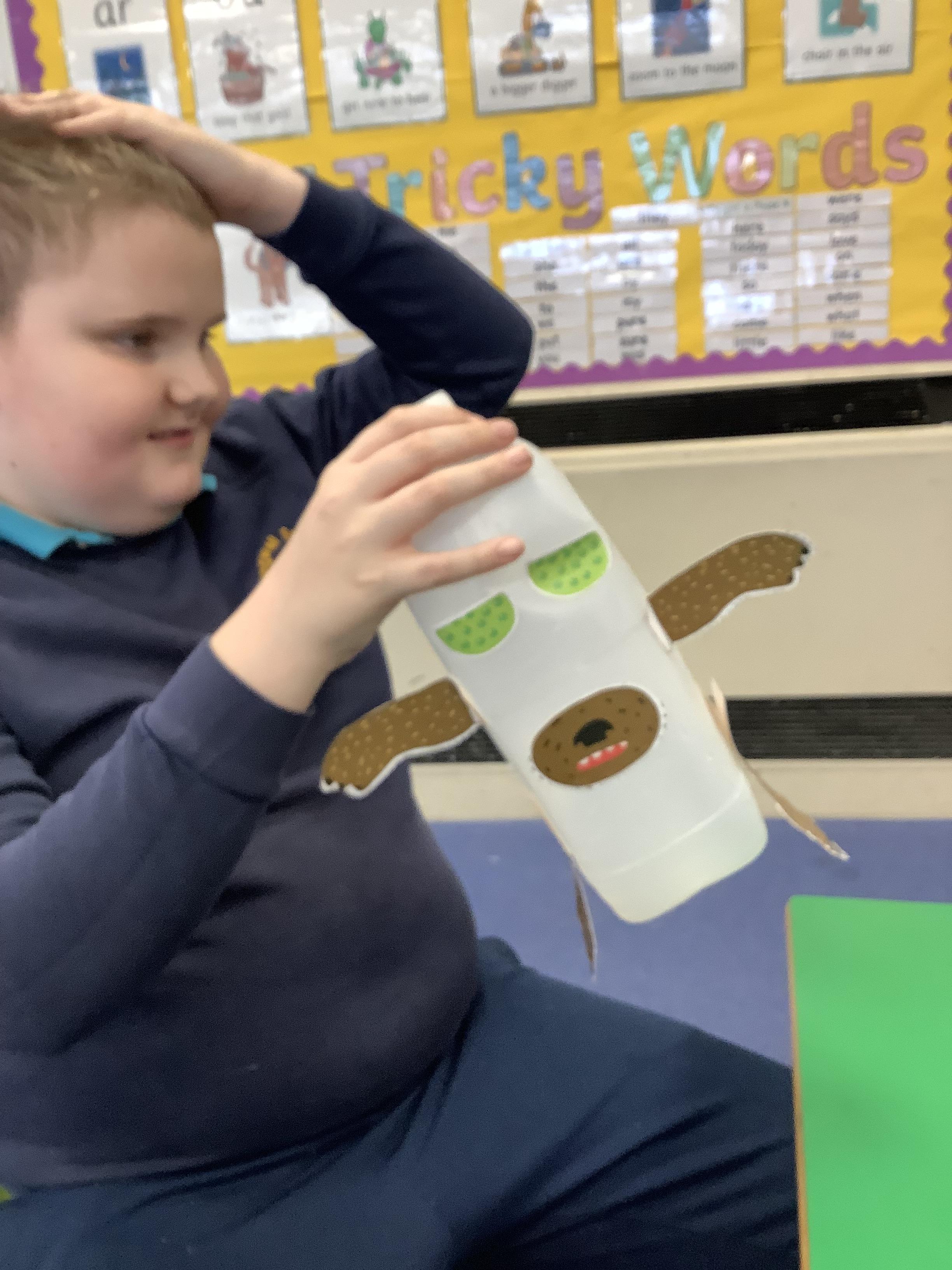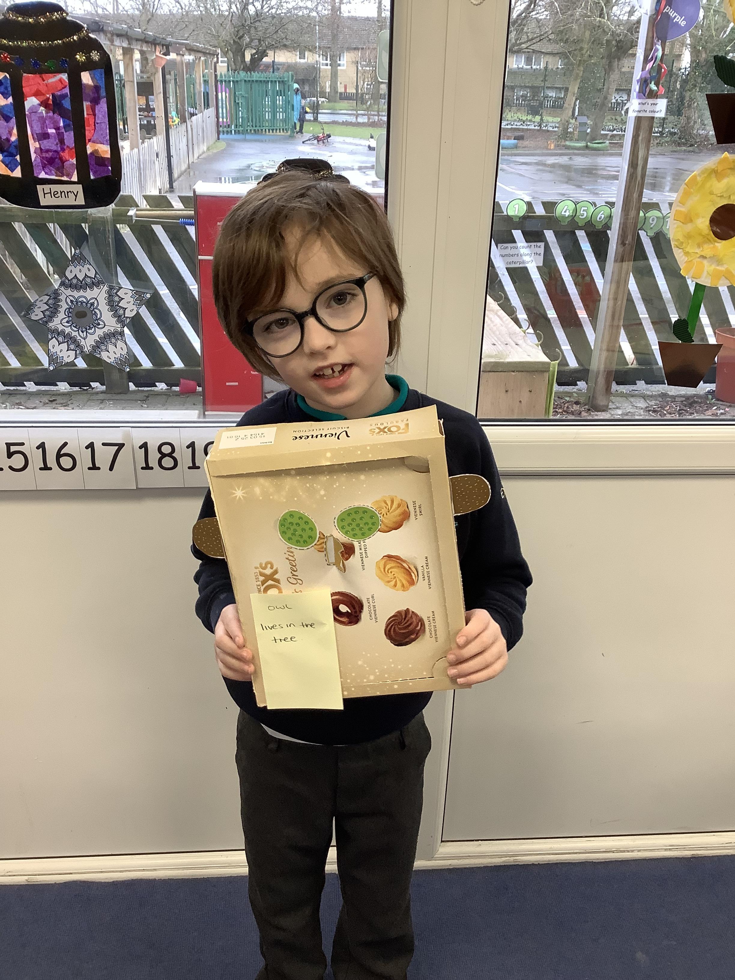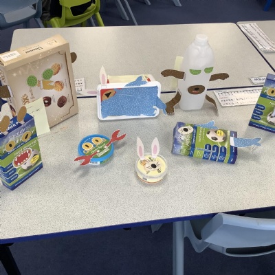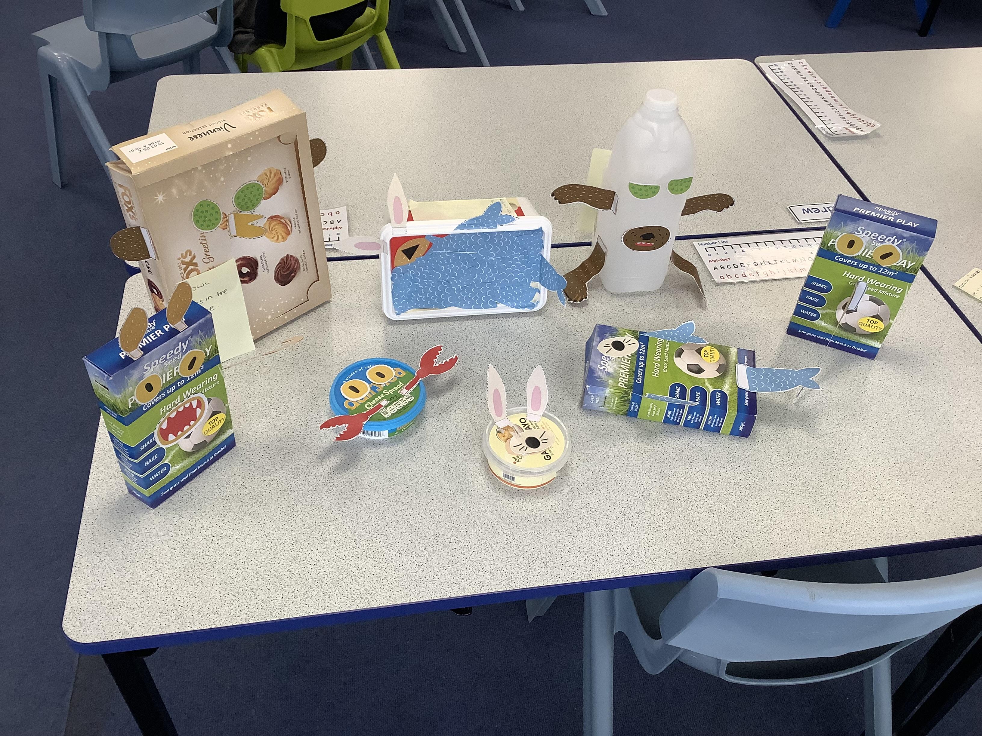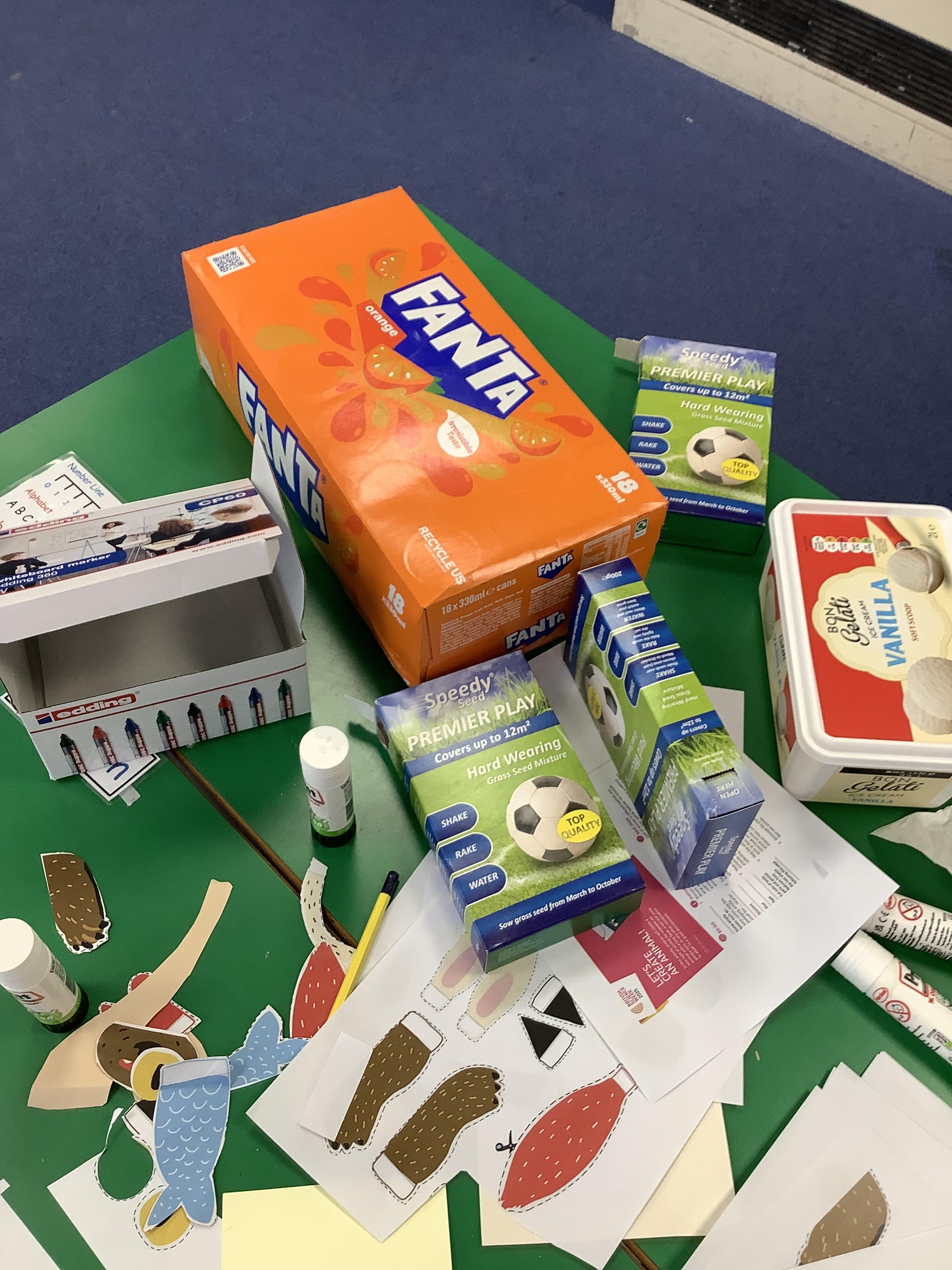11.03.25 BRITISH SCIENCE WEEK: LET'S CREATE AN ANIMAL The children created a new type of animal using empty recycling boxes that can adapt to a given environment. We cut out body parts and animal features from British Science pack and glued them onto the boxes. The children named their new animal and discussed which environment they lived in e.g. desert, forest, Arctic, sea or hot/cold place.