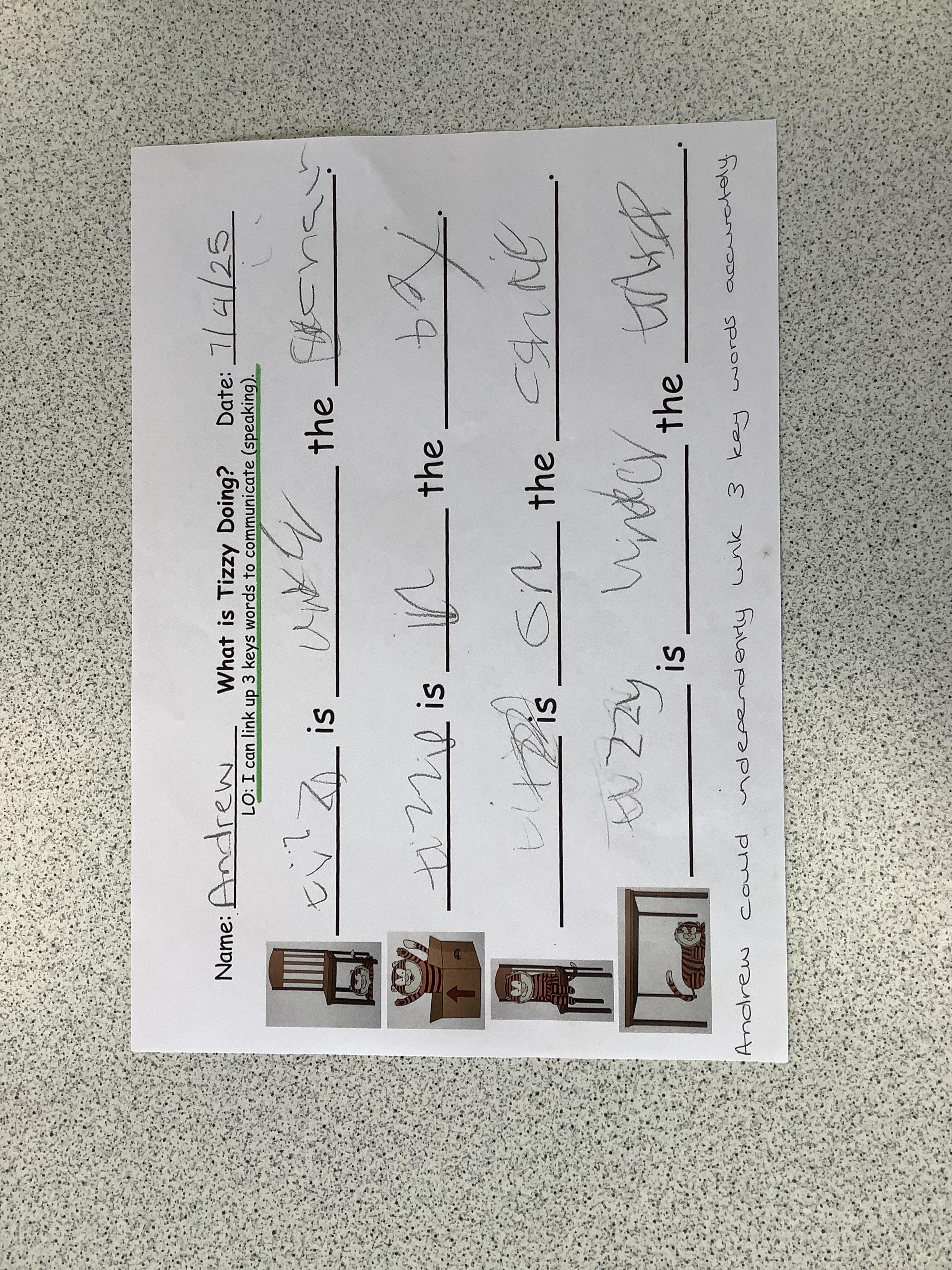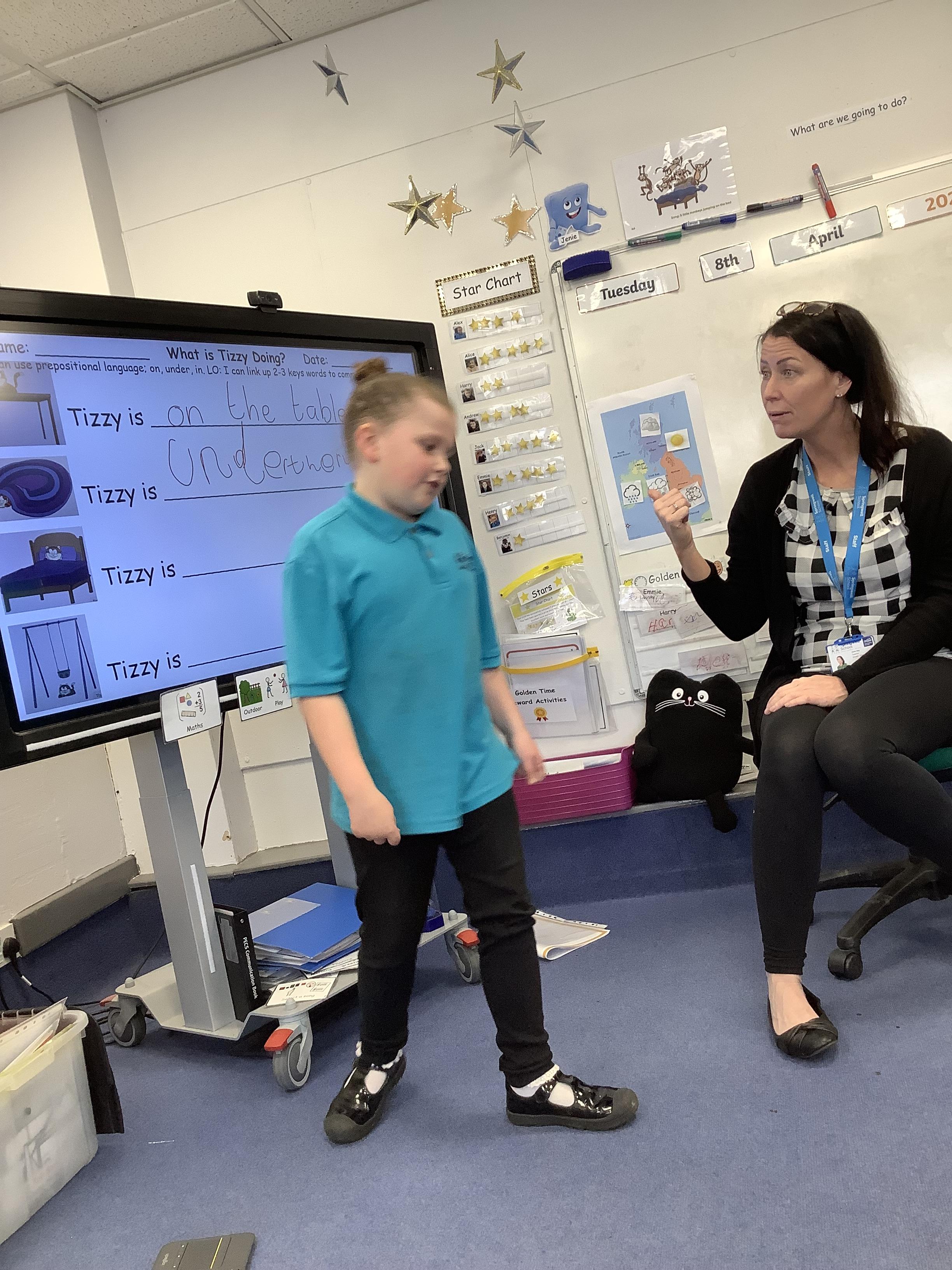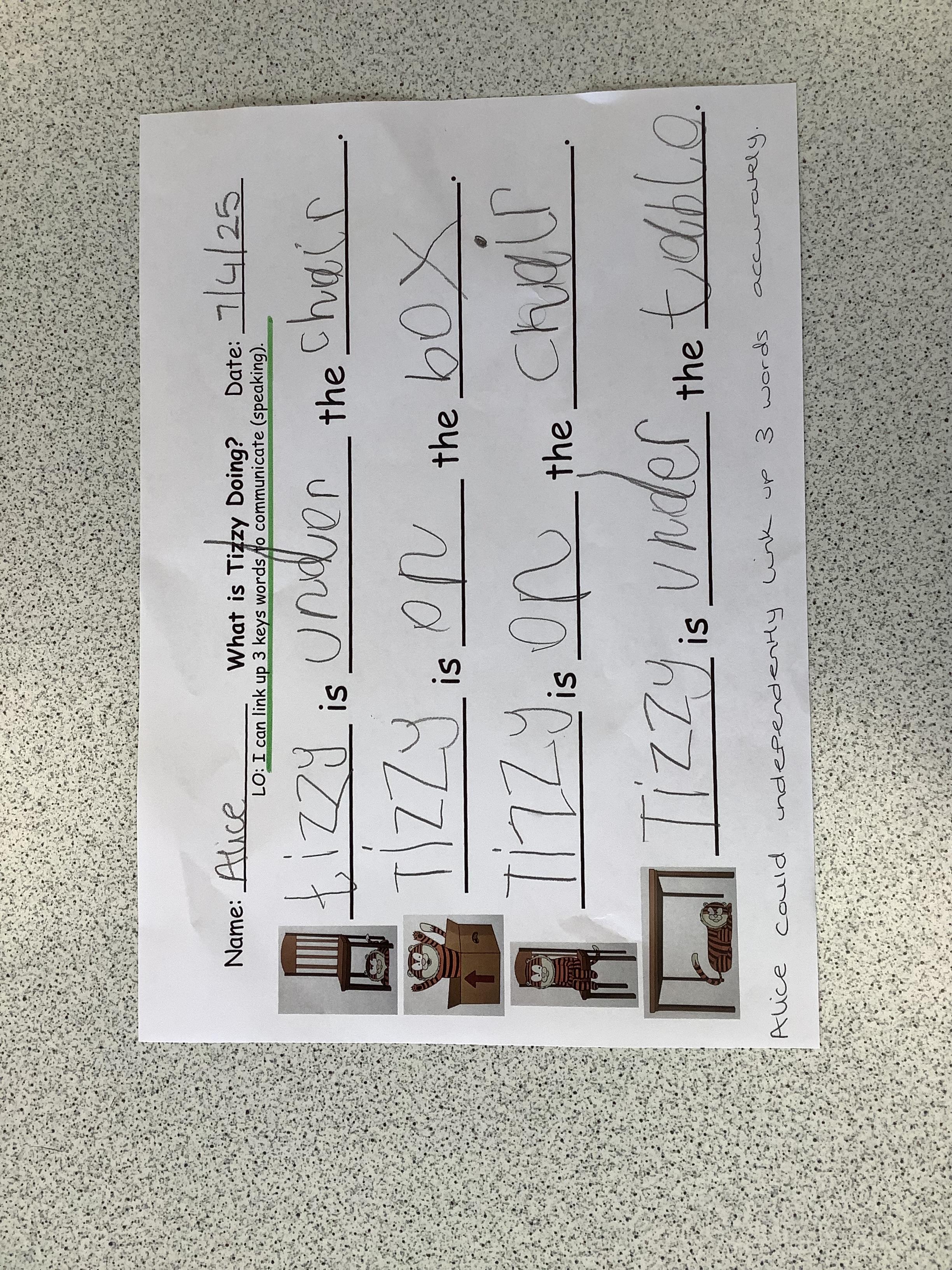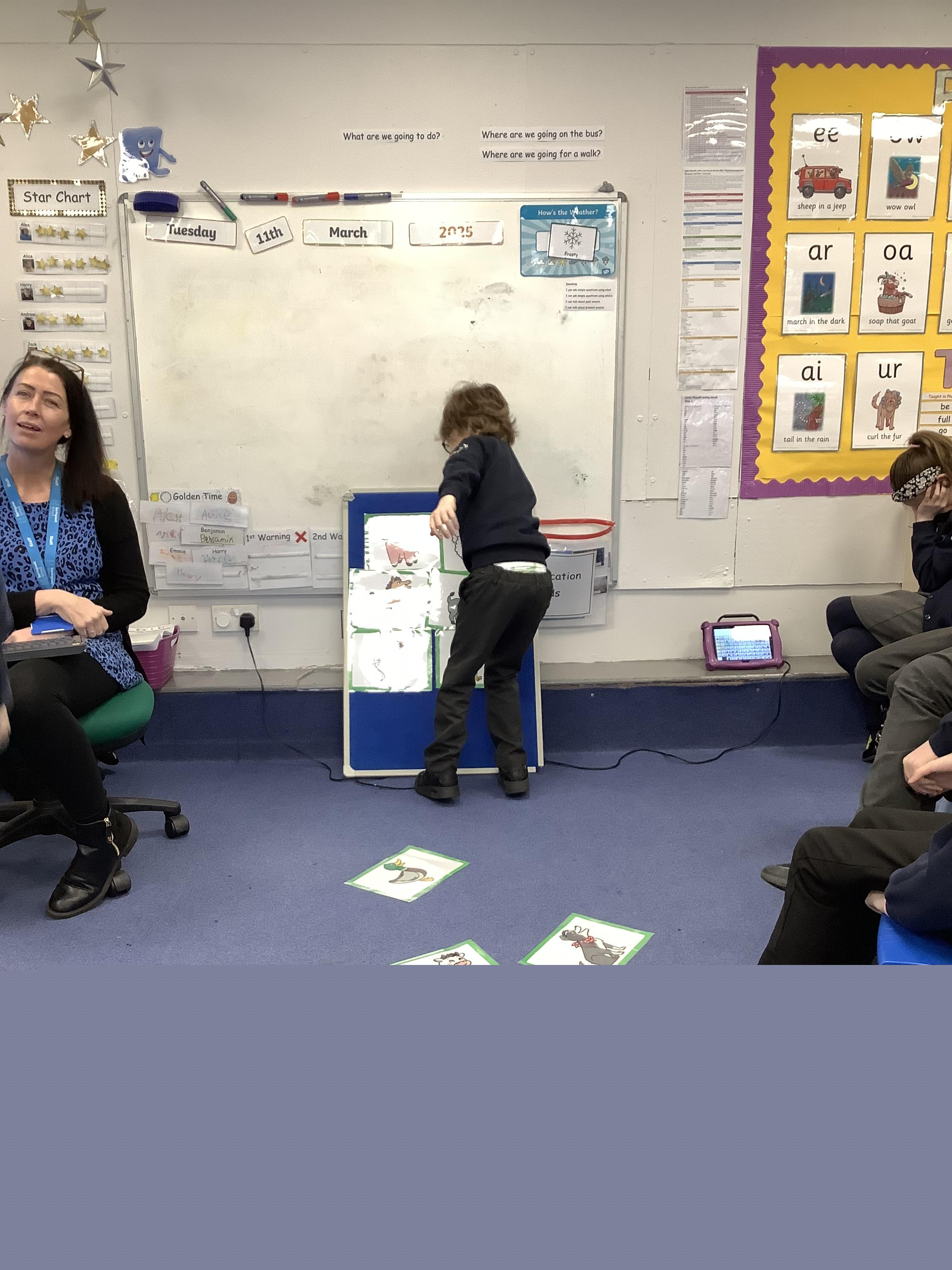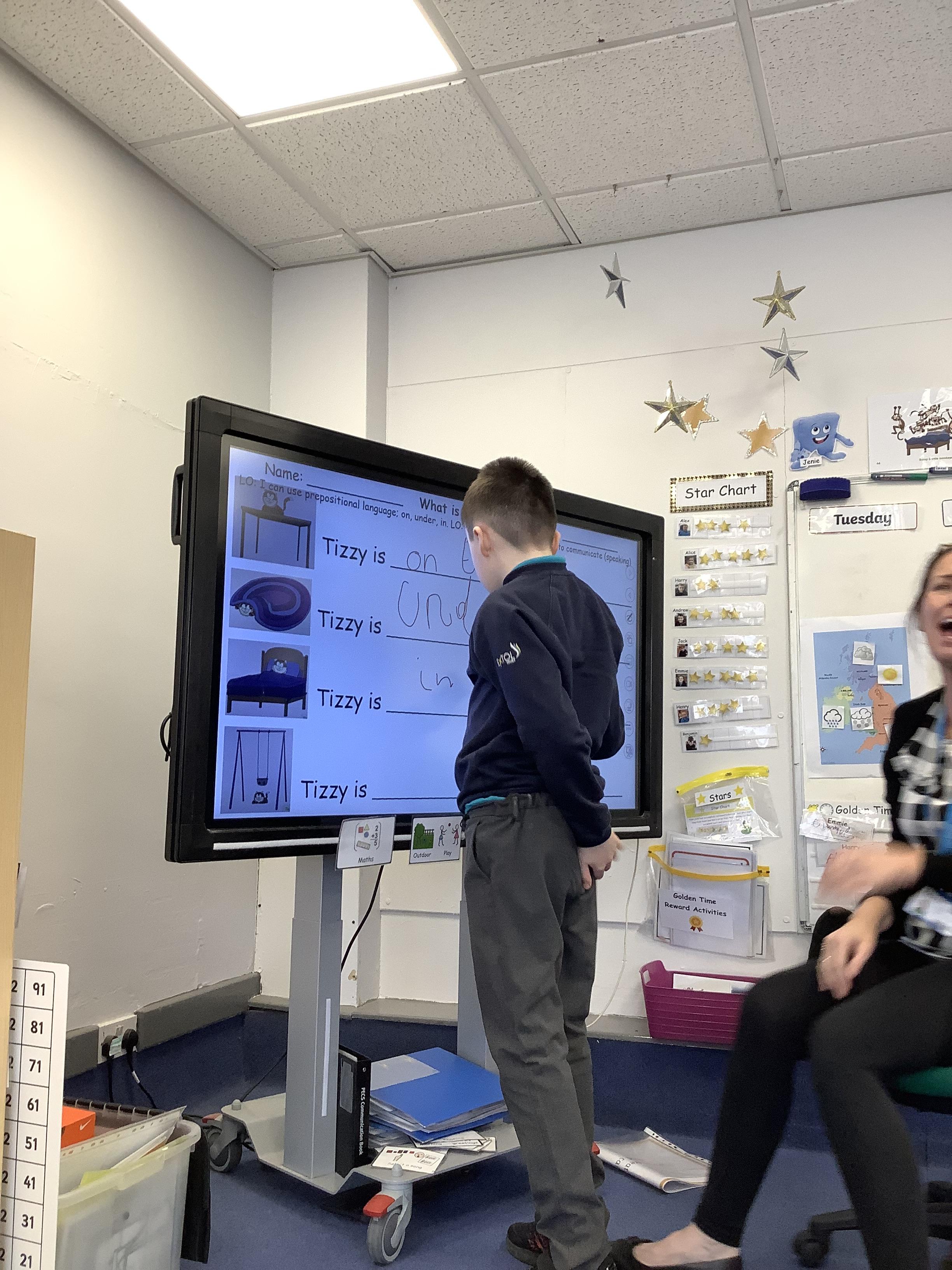 08.04.25 EARLY TALK BOOST Jake and Tizzy Book 6 Hide and Seek - The children have been building sentences using positional language e.g. on, under and in. We have been looking closely at the Tizzy picture cards. Our teacher has been modelling the language for each card, e.g, 'Tizzy is on the chair' or 'Tizzy is under the rug' etc. We have enjoyed singing and acting out the song: 'Five Little Monkeys Jumping on the Bed'.The children have loved playing their own game of hide and seek in our classroom!
