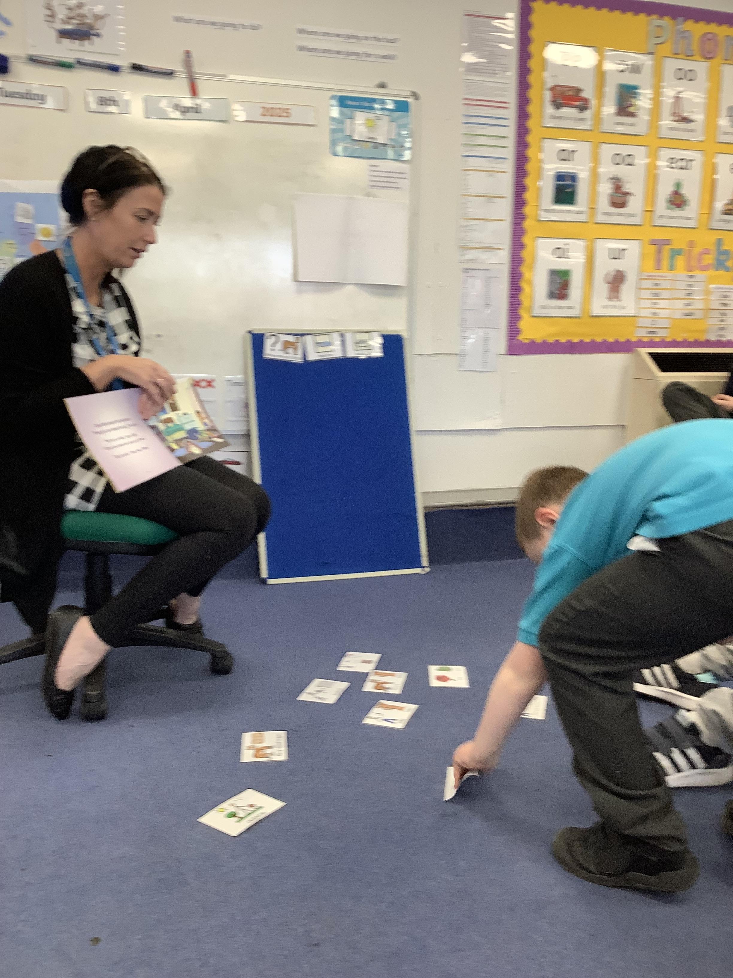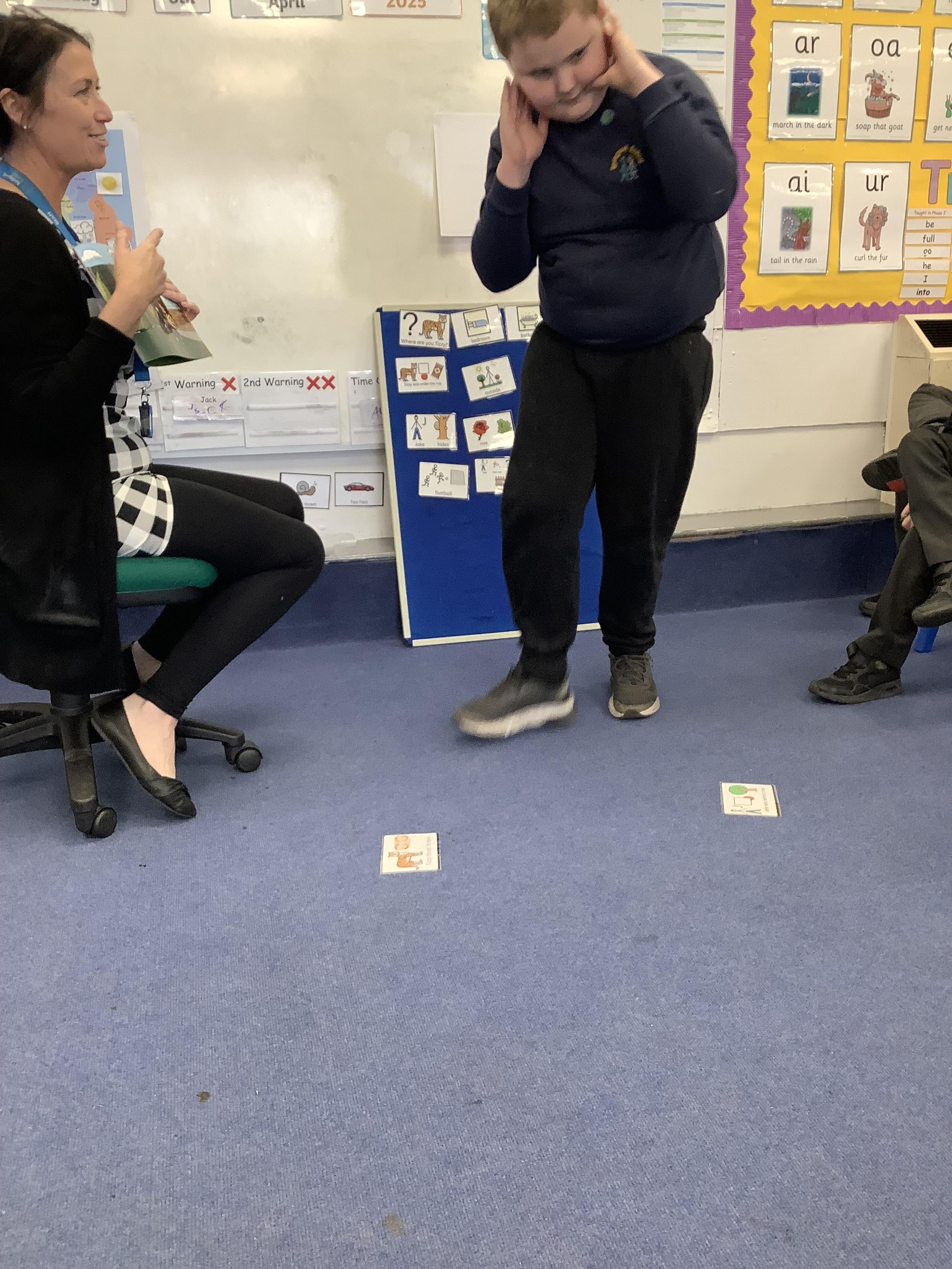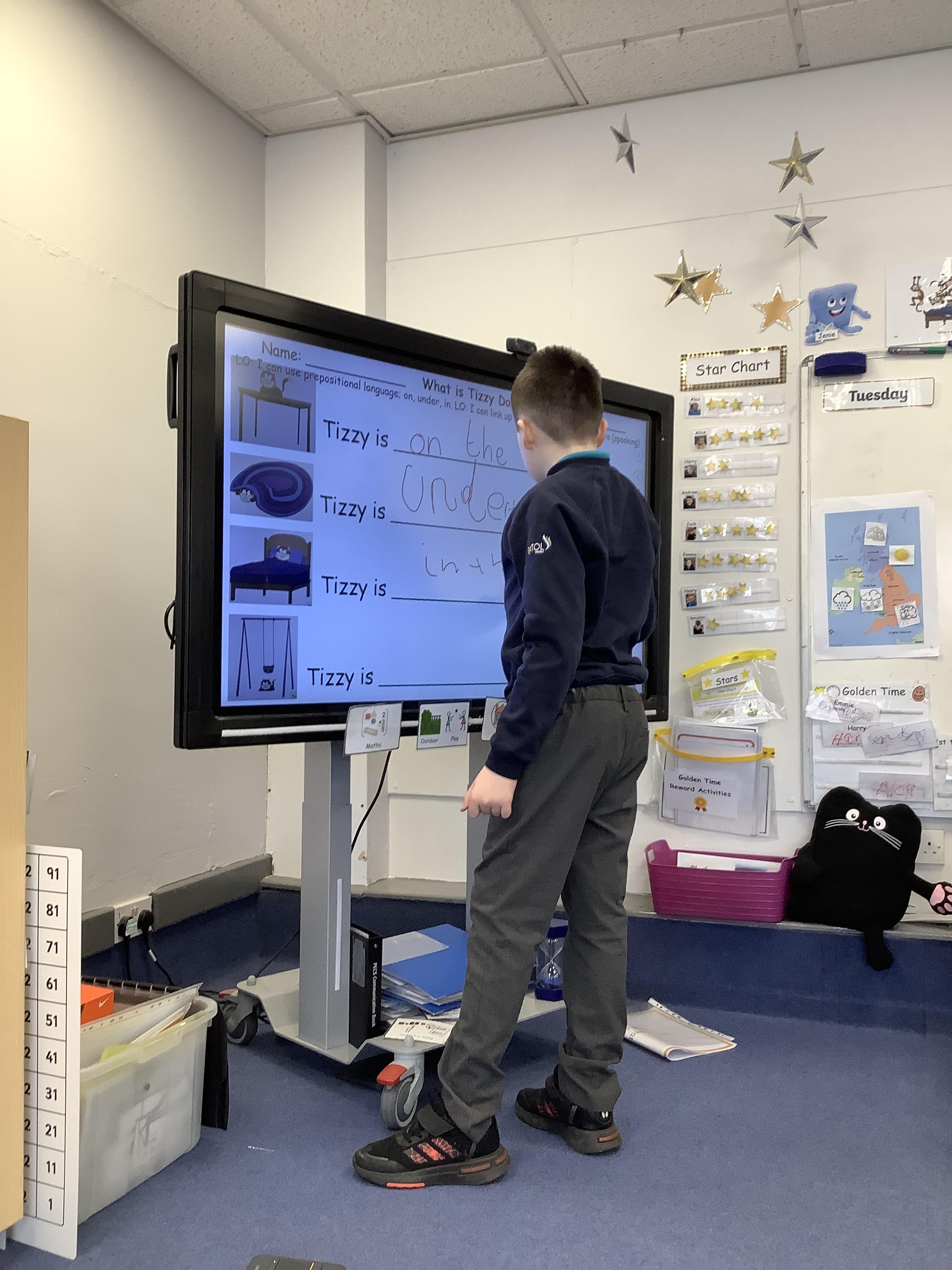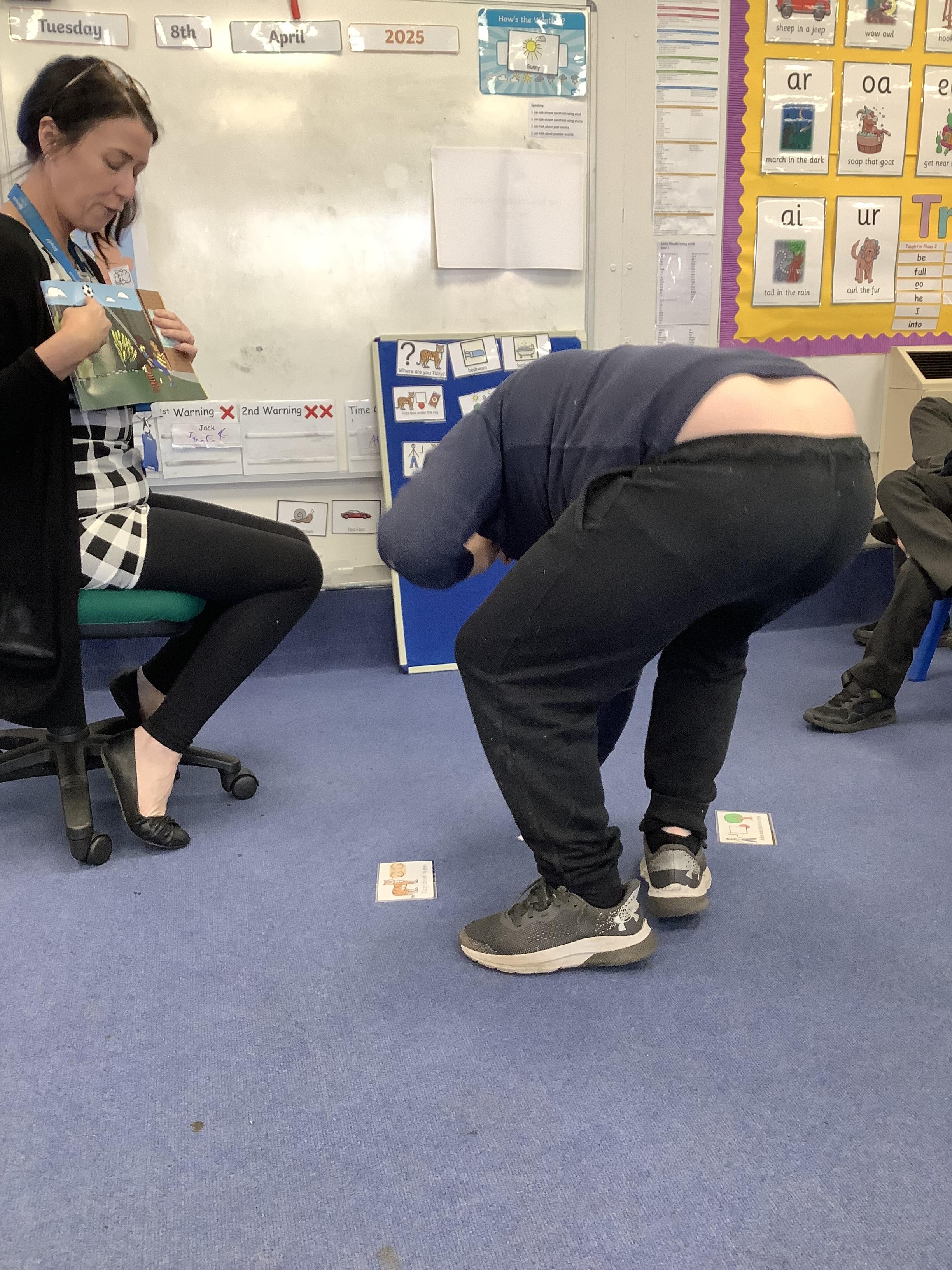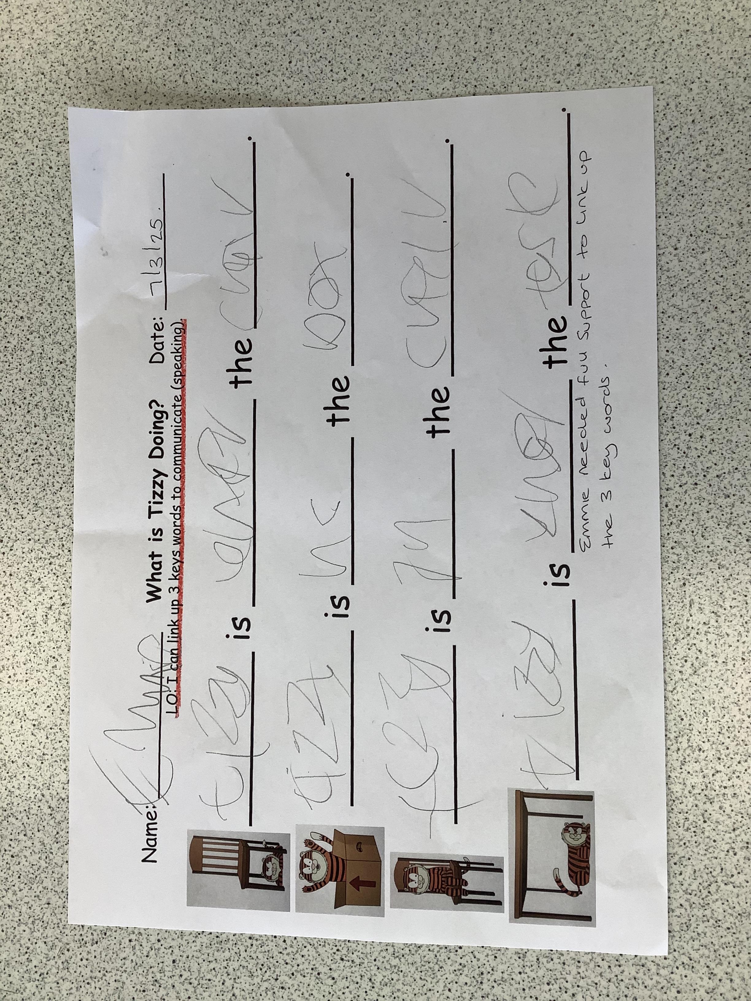 08.04.25 EARLY TALK BOOST Jake and Tizzy Book 6 Hide and Seek - The children have been building sentences using positional language e.g. on, under and in. We have been looking closely at the Tizzy picture cards. Our teacher has been modelling the language for each card, e.g, 'Tizzy is on the chair' or 'Tizzy is under the rug' etc. We have enjoyed singing and acting out the song: 'Five Little Monkeys Jumping on the Bed'.The children have loved playing their own game of hide and seek in our classroom!