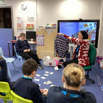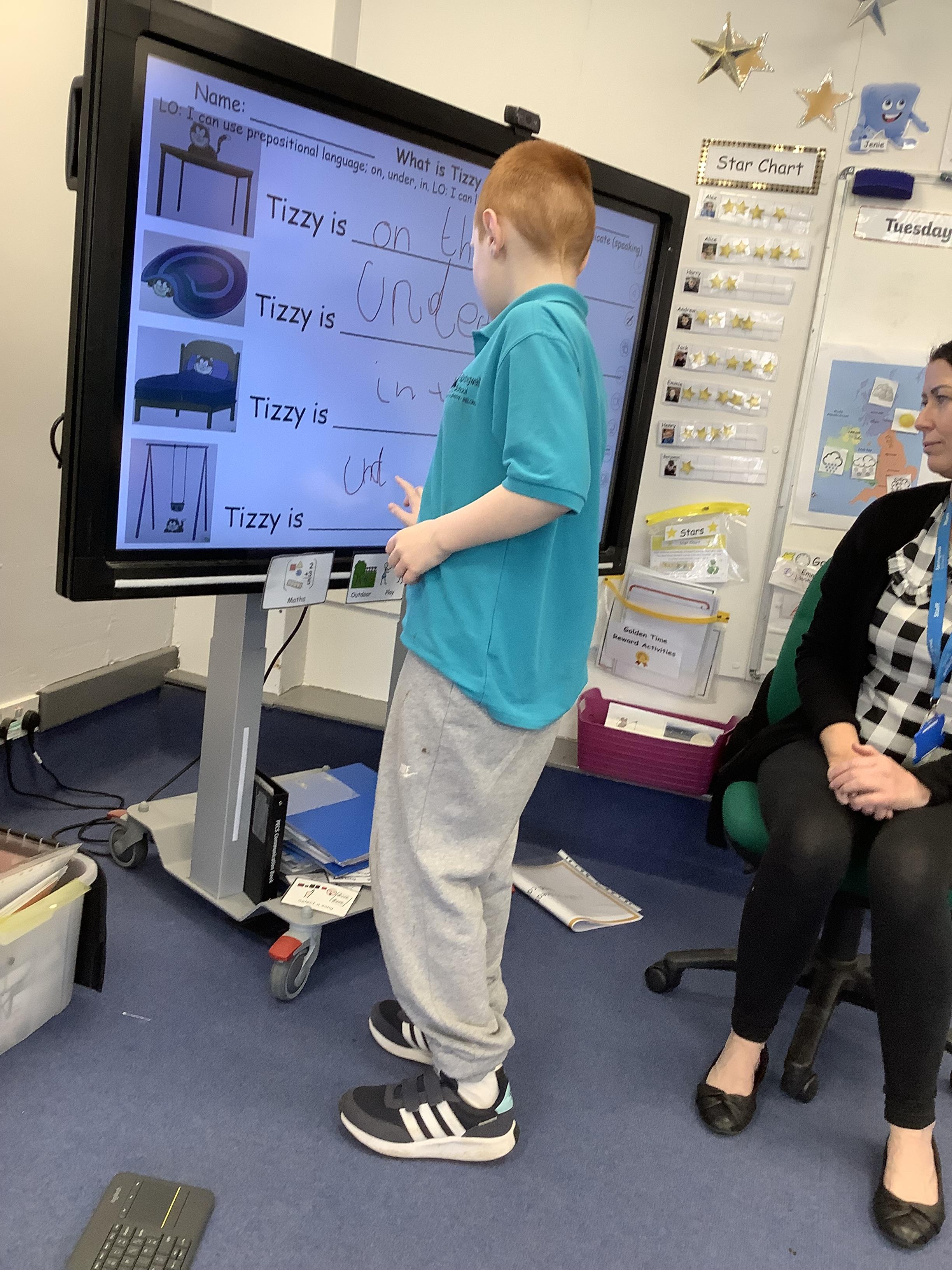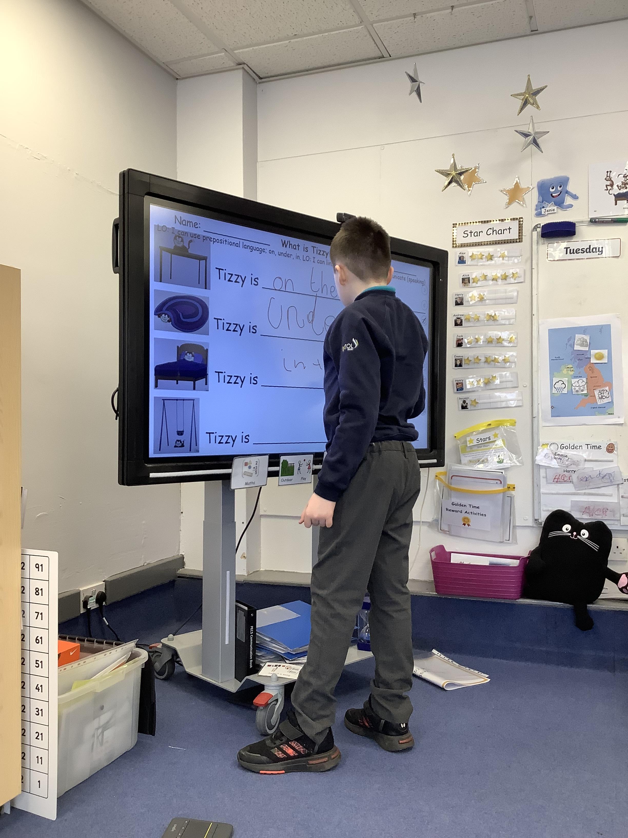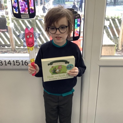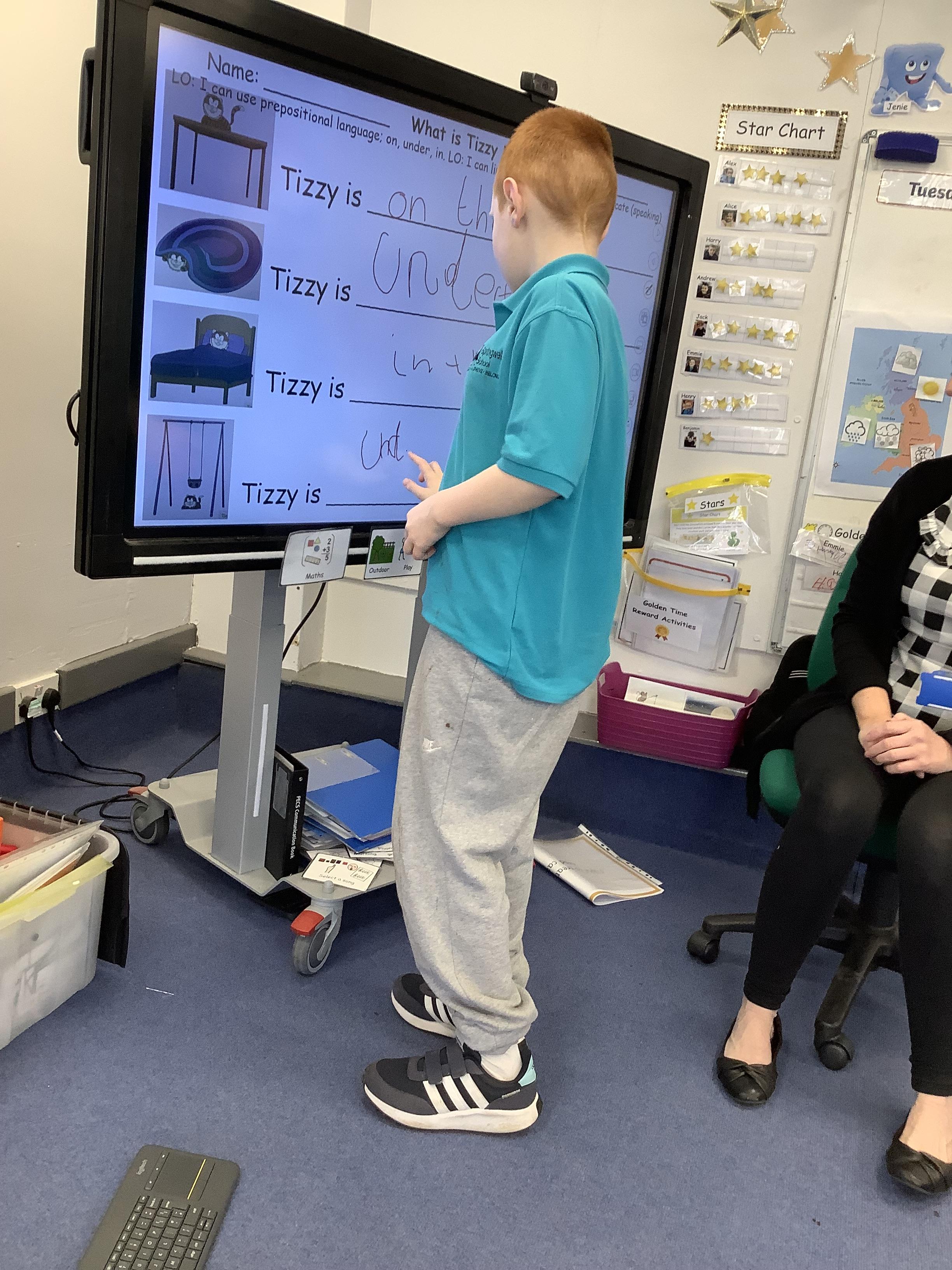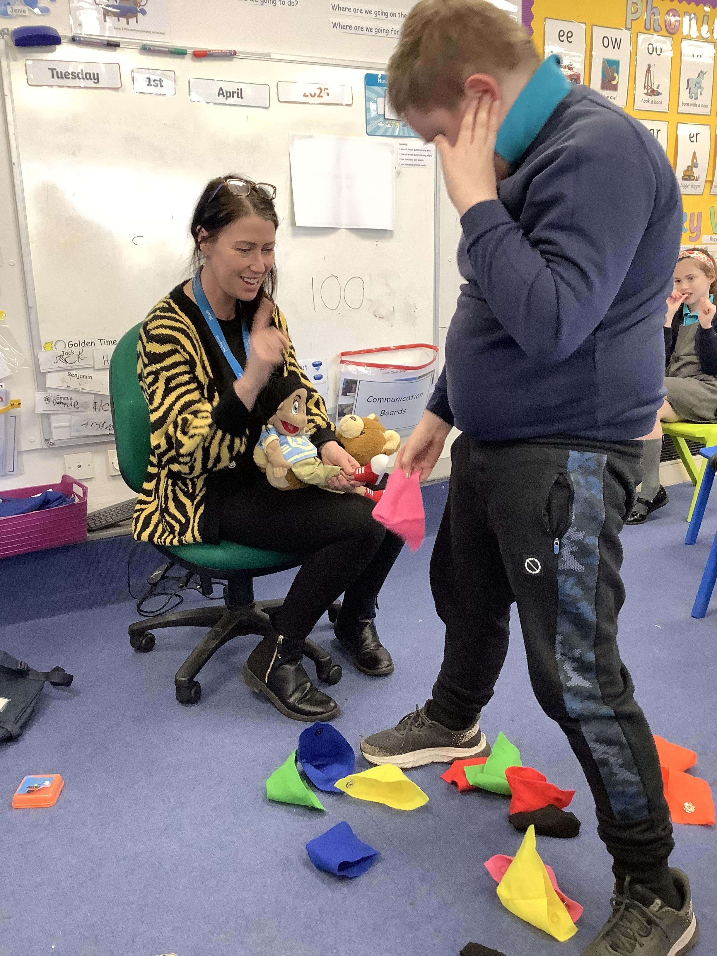 08.04.25 EARLY TALK BOOST Jake and Tizzy Book 6 Hide and Seek - The children have been building sentences using positional language e.g. on, under and in. We have been looking closely at the Tizzy picture cards. Our teacher has been modelling the language for each card, e.g, 'Tizzy is on the chair' or 'Tizzy is under the rug' etc. We have enjoyed singing and acting out the song: 'Five Little Monkeys Jumping on the Bed'.The children have loved playing their own game of hide and seek in our classroom!