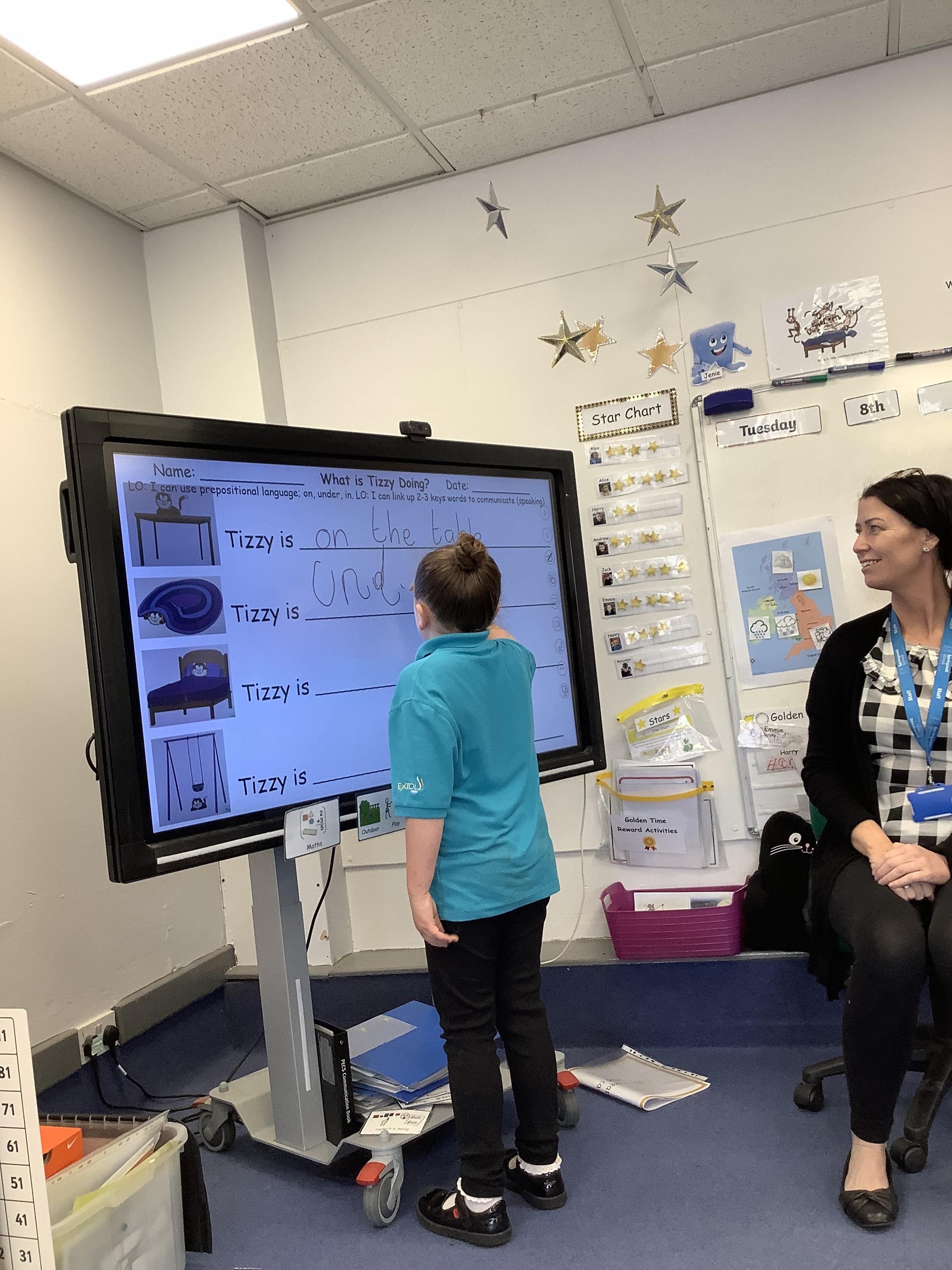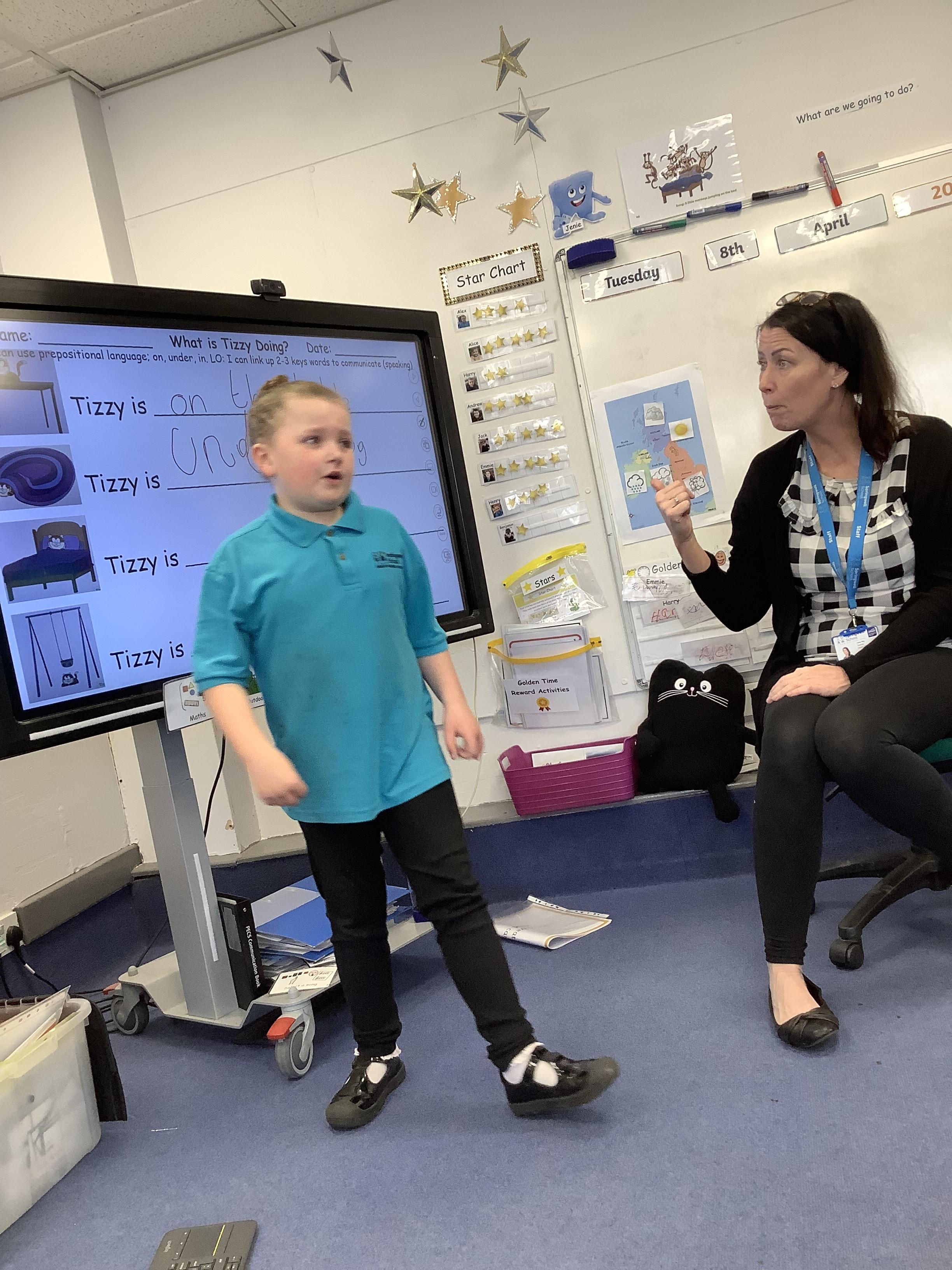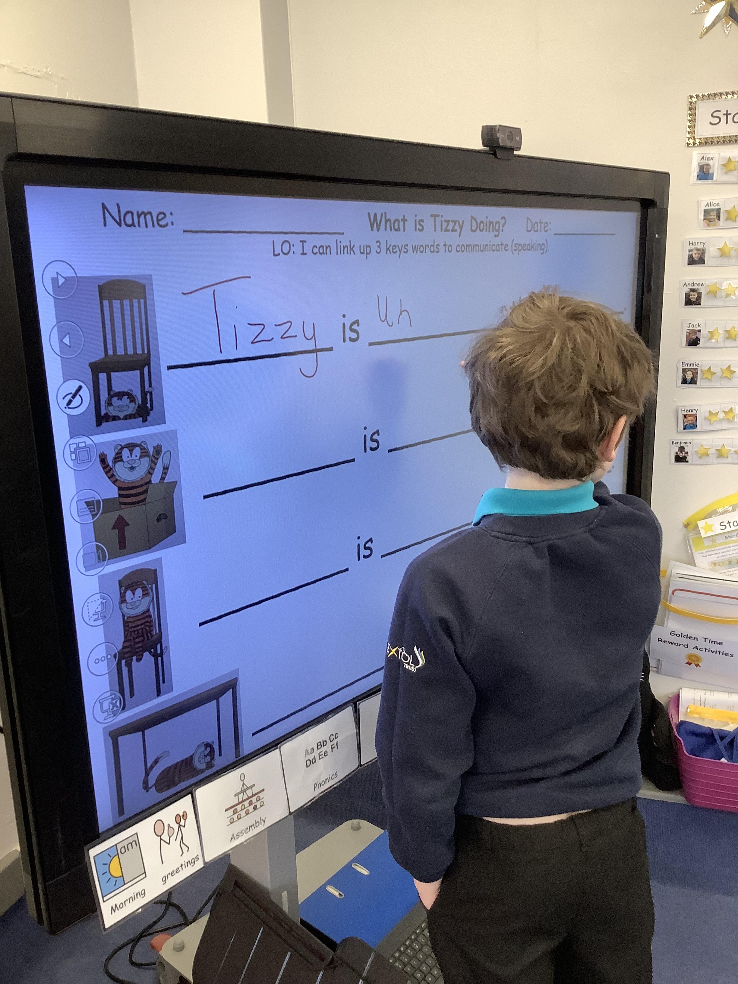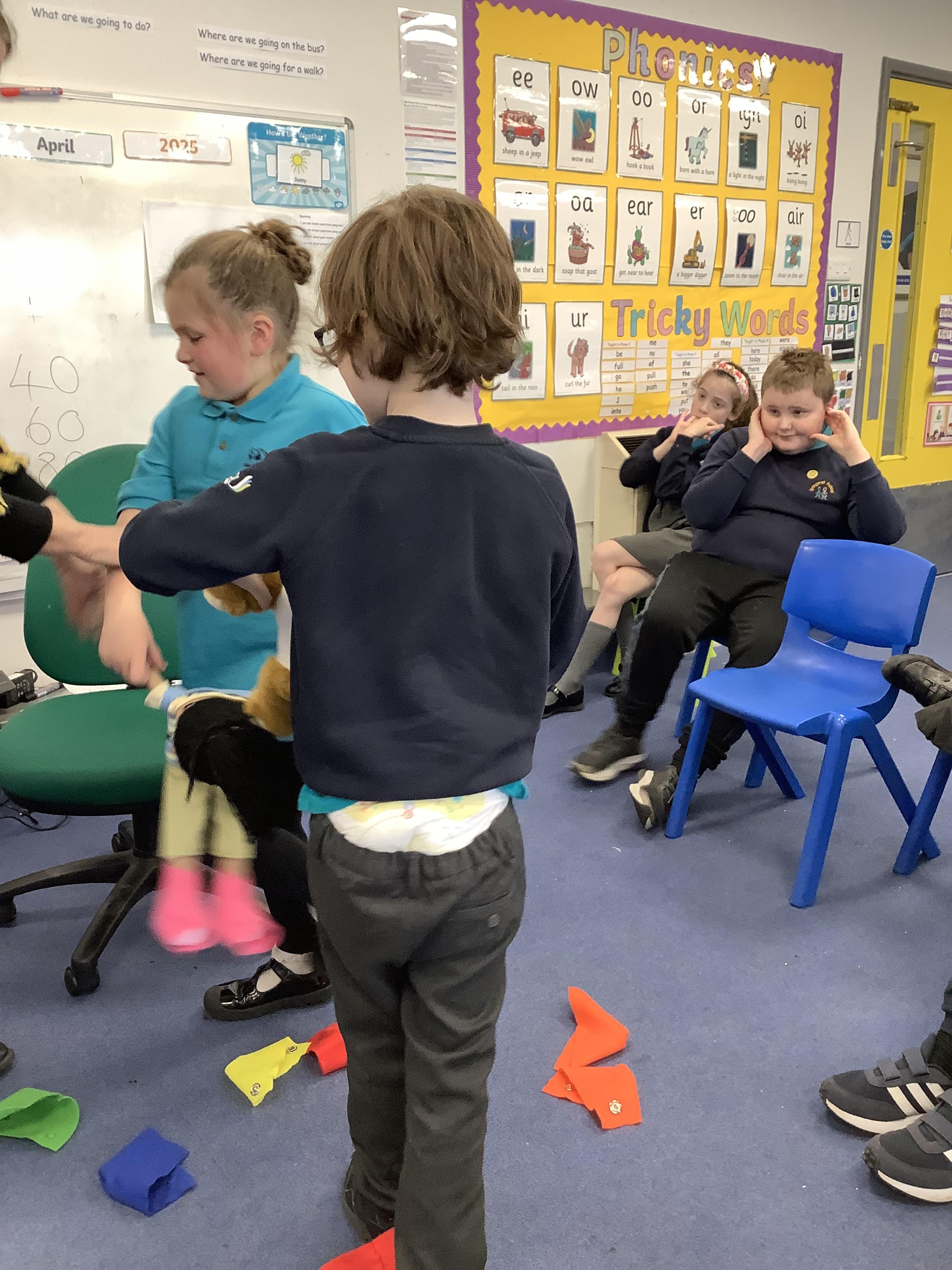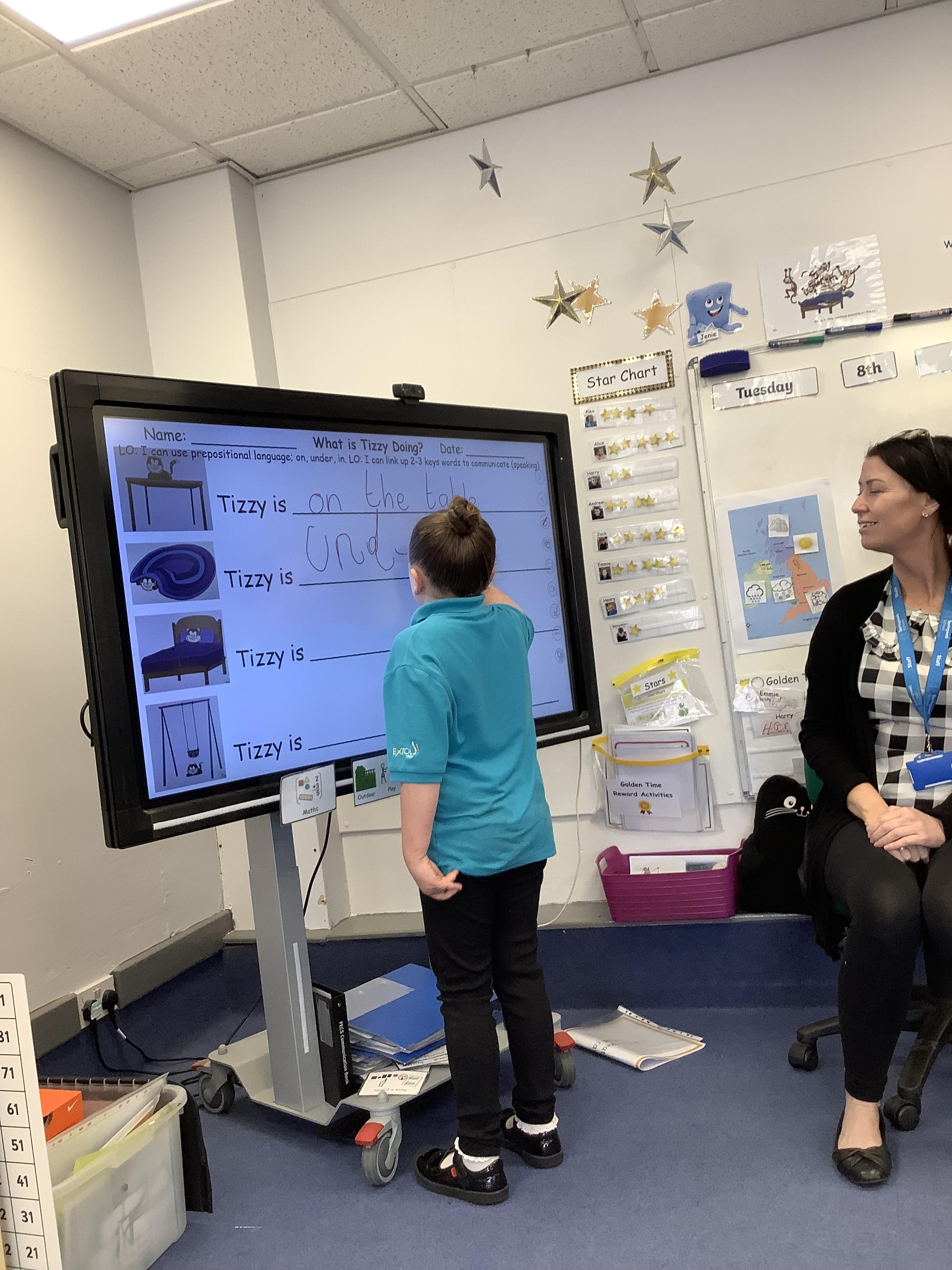 08.04.25 EARLY TALK BOOST Jake and Tizzy Book 6 Hide and Seek - The children have been building sentences using positional language e.g. on, under and in. We have been looking closely at the Tizzy picture cards. Our teacher has been modelling the language for each card, e.g, 'Tizzy is on the chair' or 'Tizzy is under the rug' etc. We have enjoyed singing and acting out the song: 'Five Little Monkeys Jumping on the Bed'.The children have loved playing their own game of hide and seek in our classroom!