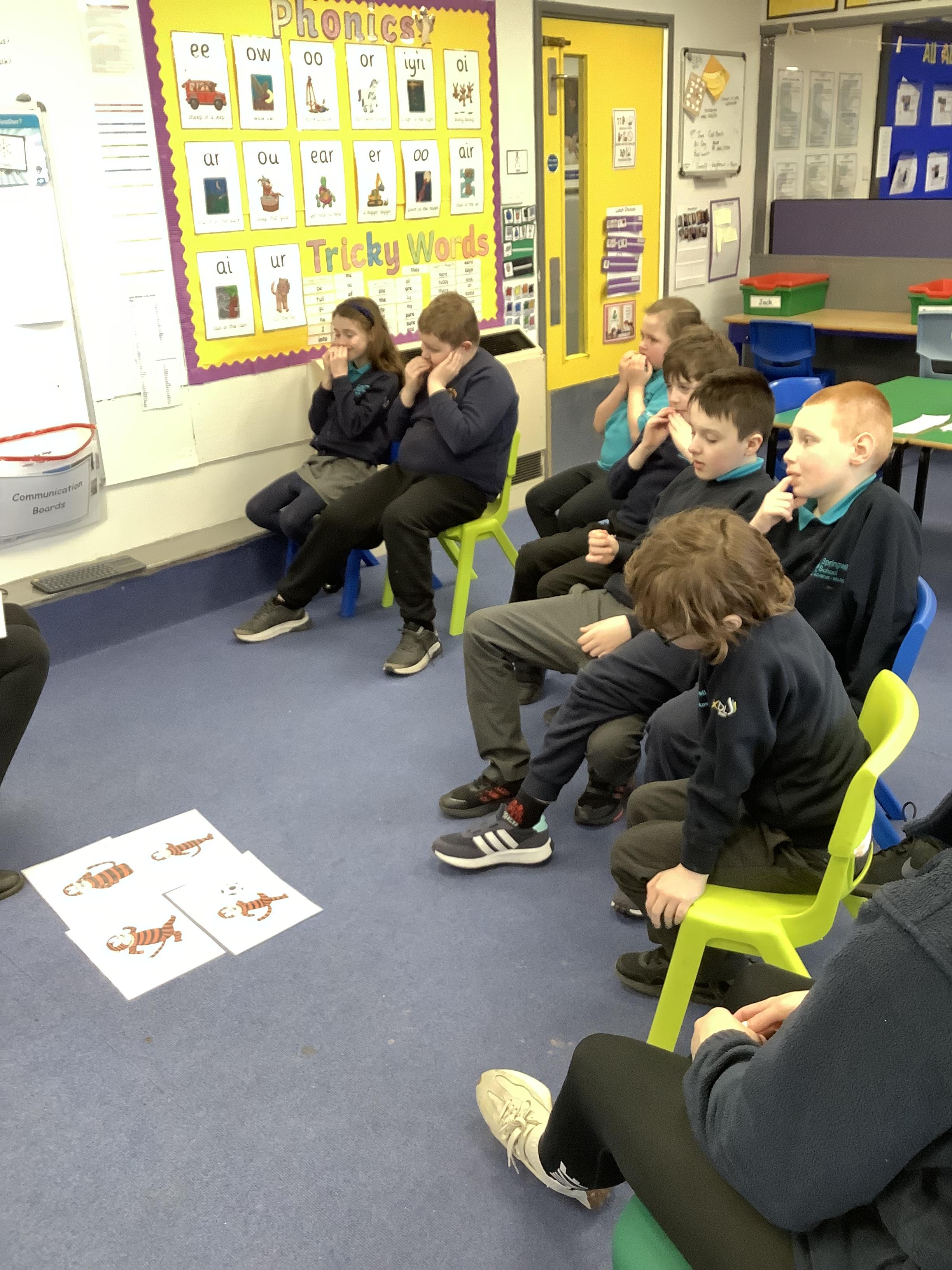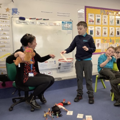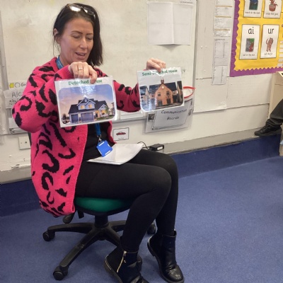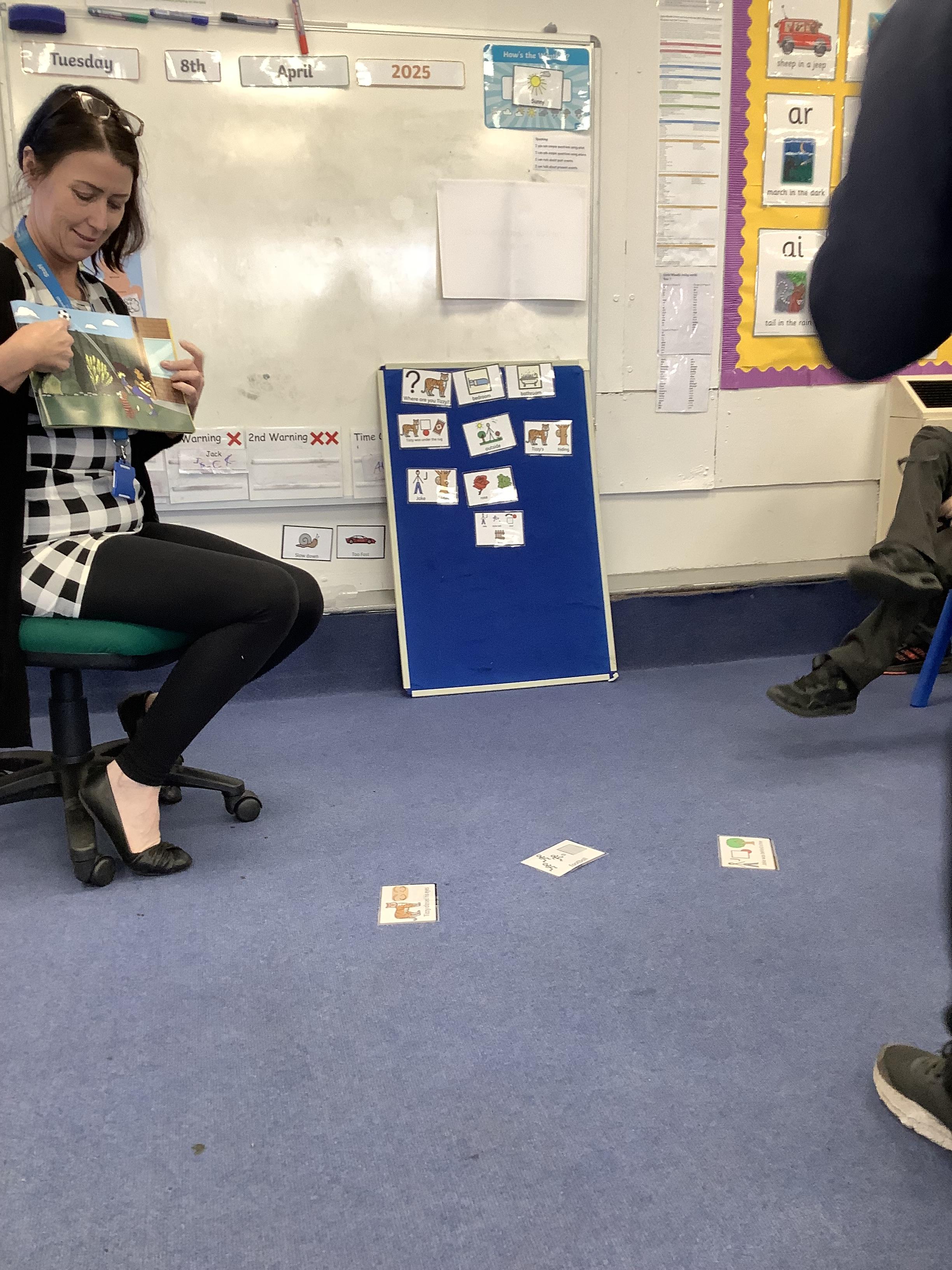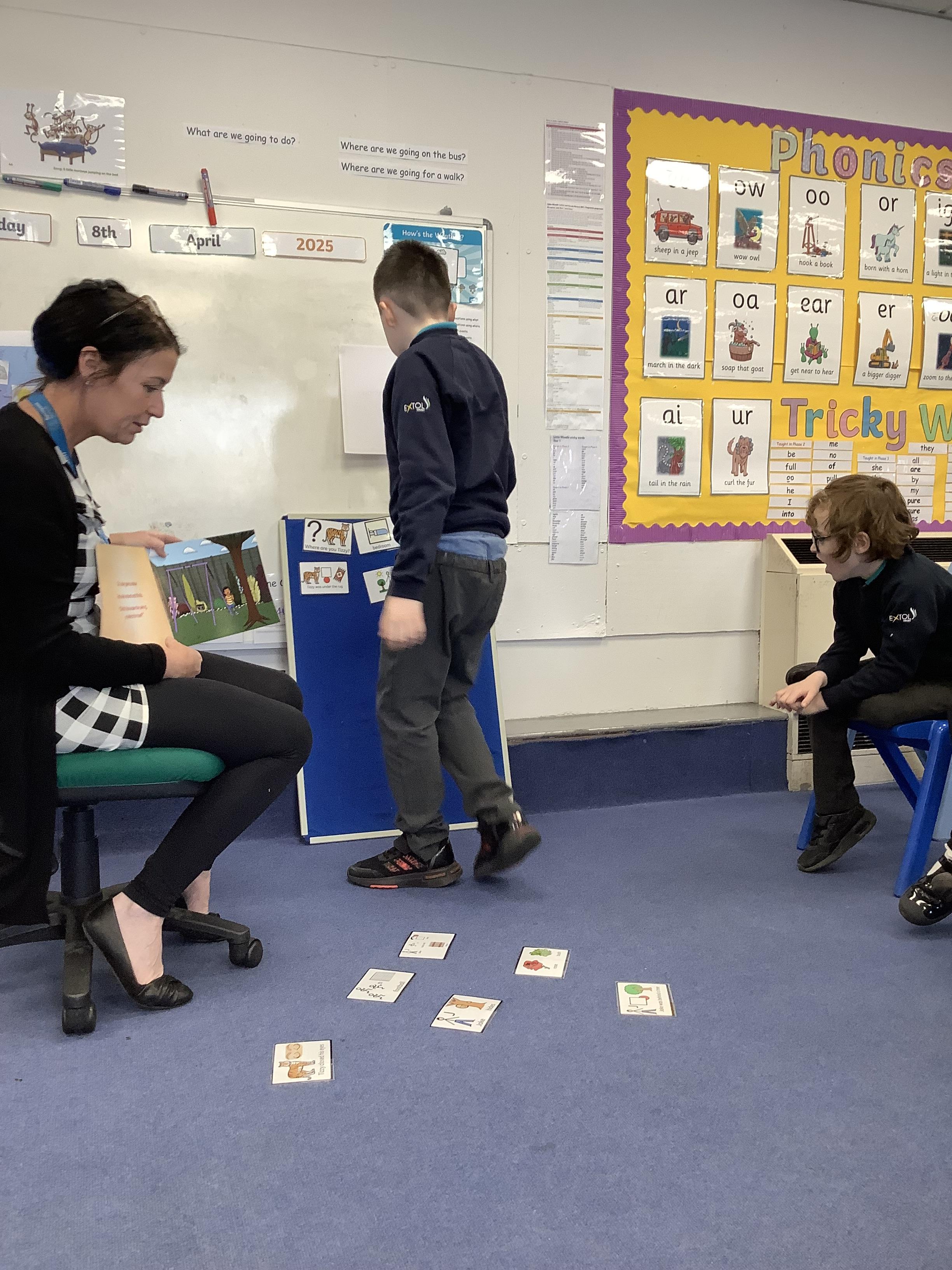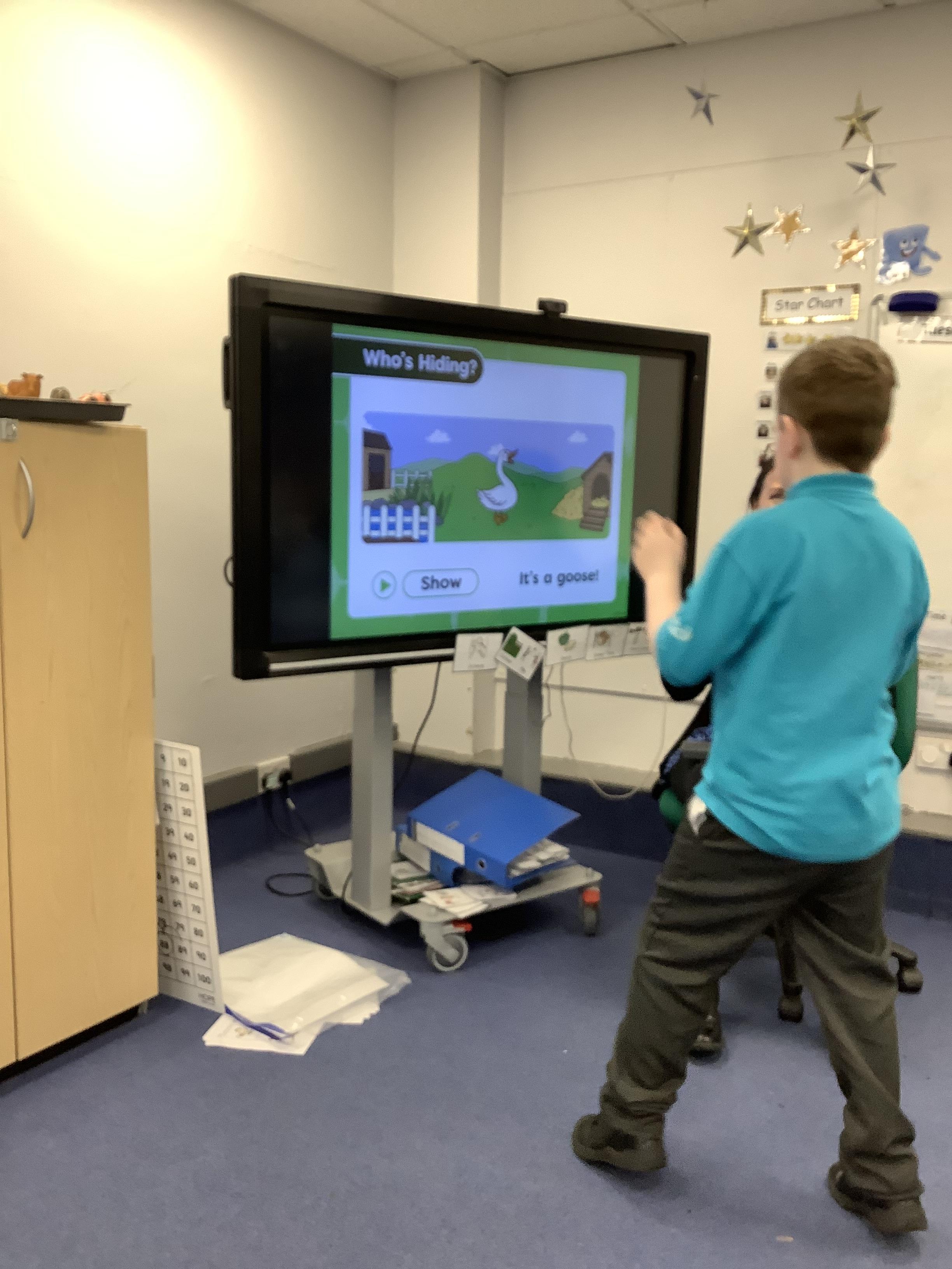 08.04.25 EARLY TALK BOOST Jake and Tizzy Book 6 Hide and Seek - The children have been building sentences using positional language e.g. on, under and in. We have been looking closely at the Tizzy picture cards. Our teacher has been modelling the language for each card, e.g, 'Tizzy is on the chair' or 'Tizzy is under the rug' etc. We have enjoyed singing and acting out the song: 'Five Little Monkeys Jumping on the Bed'.The children have loved playing their own game of hide and seek in our classroom!