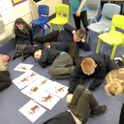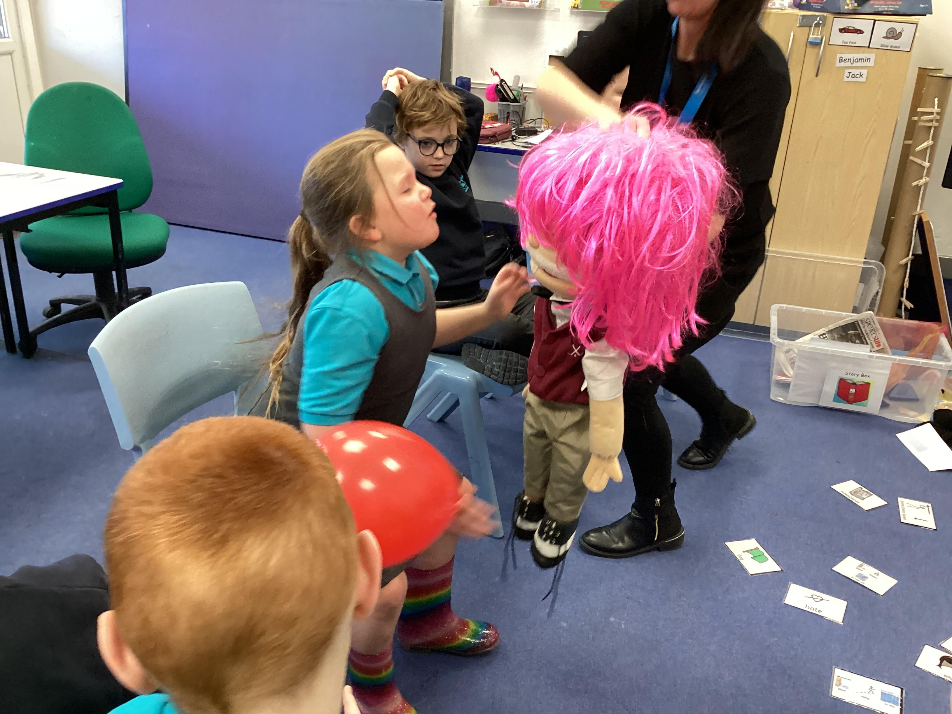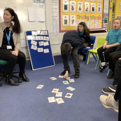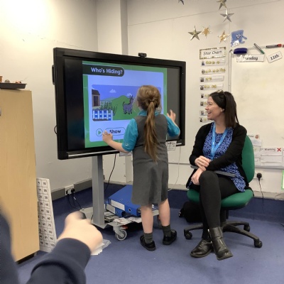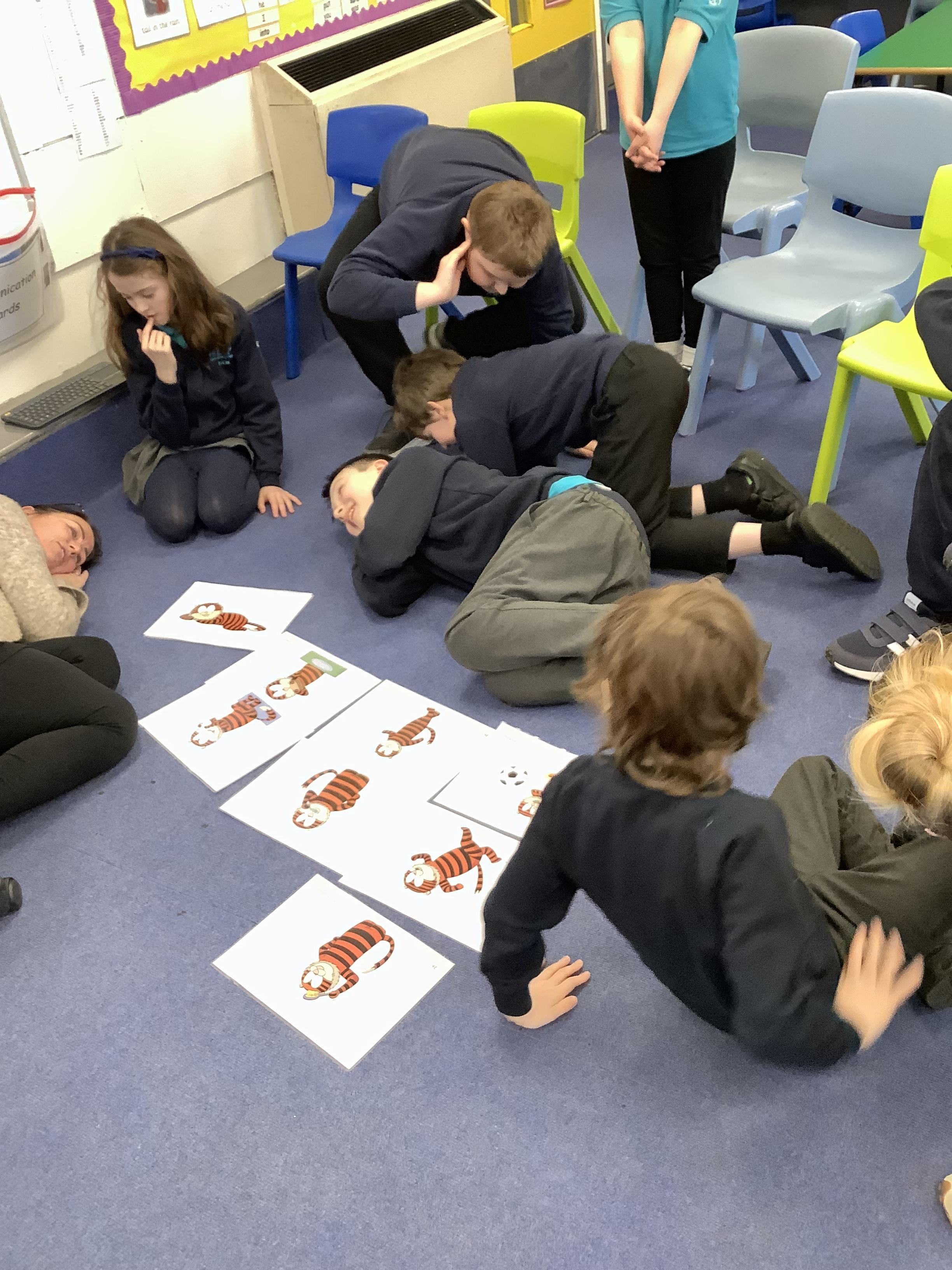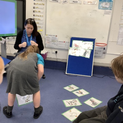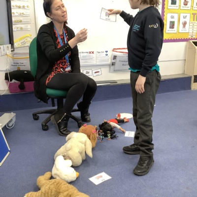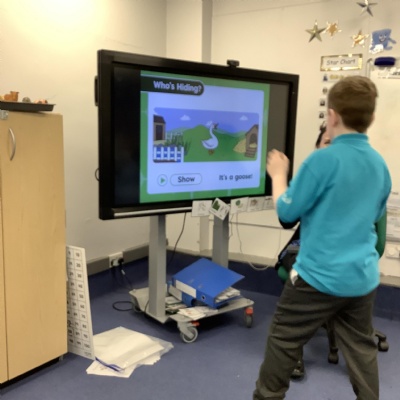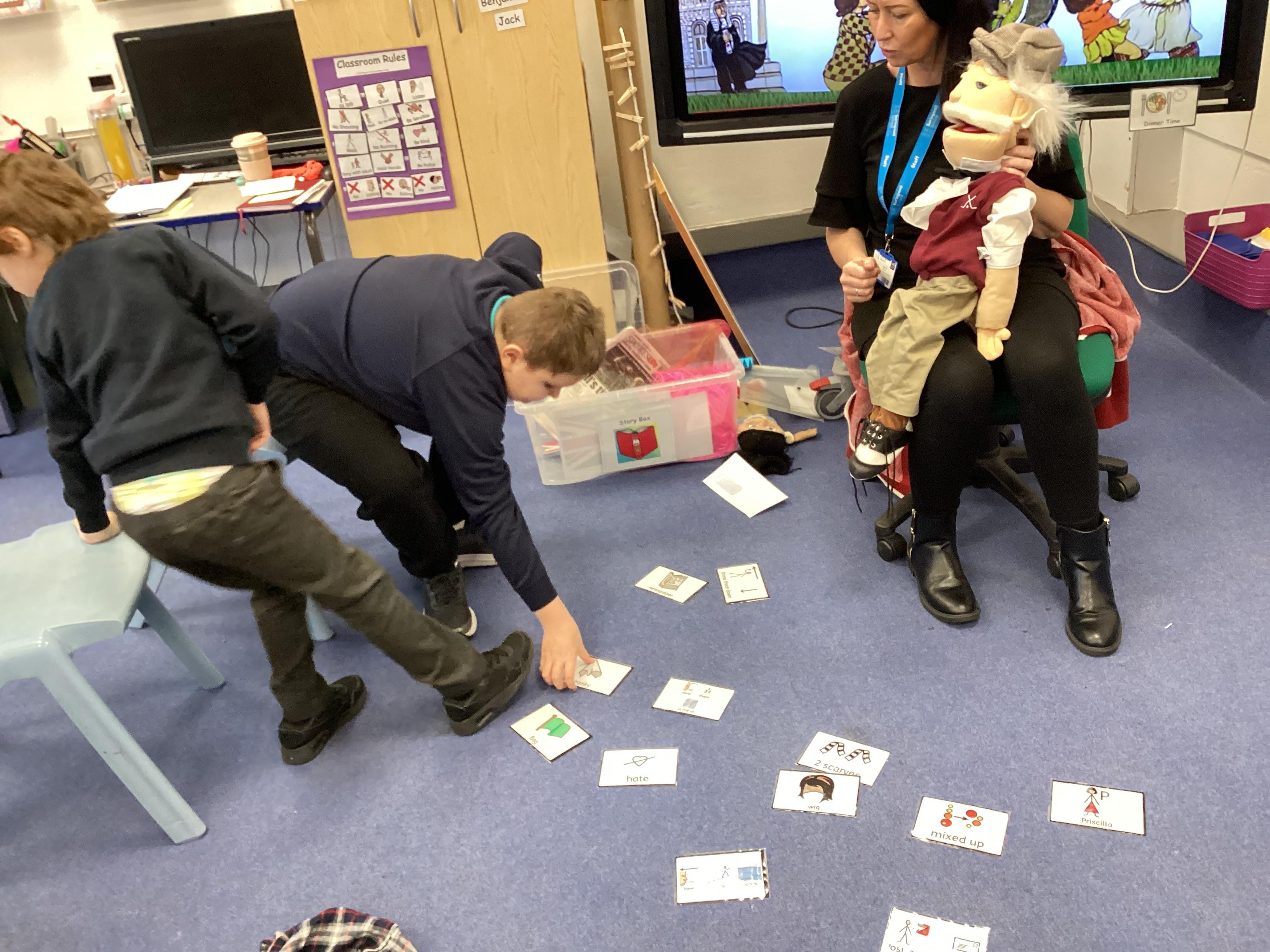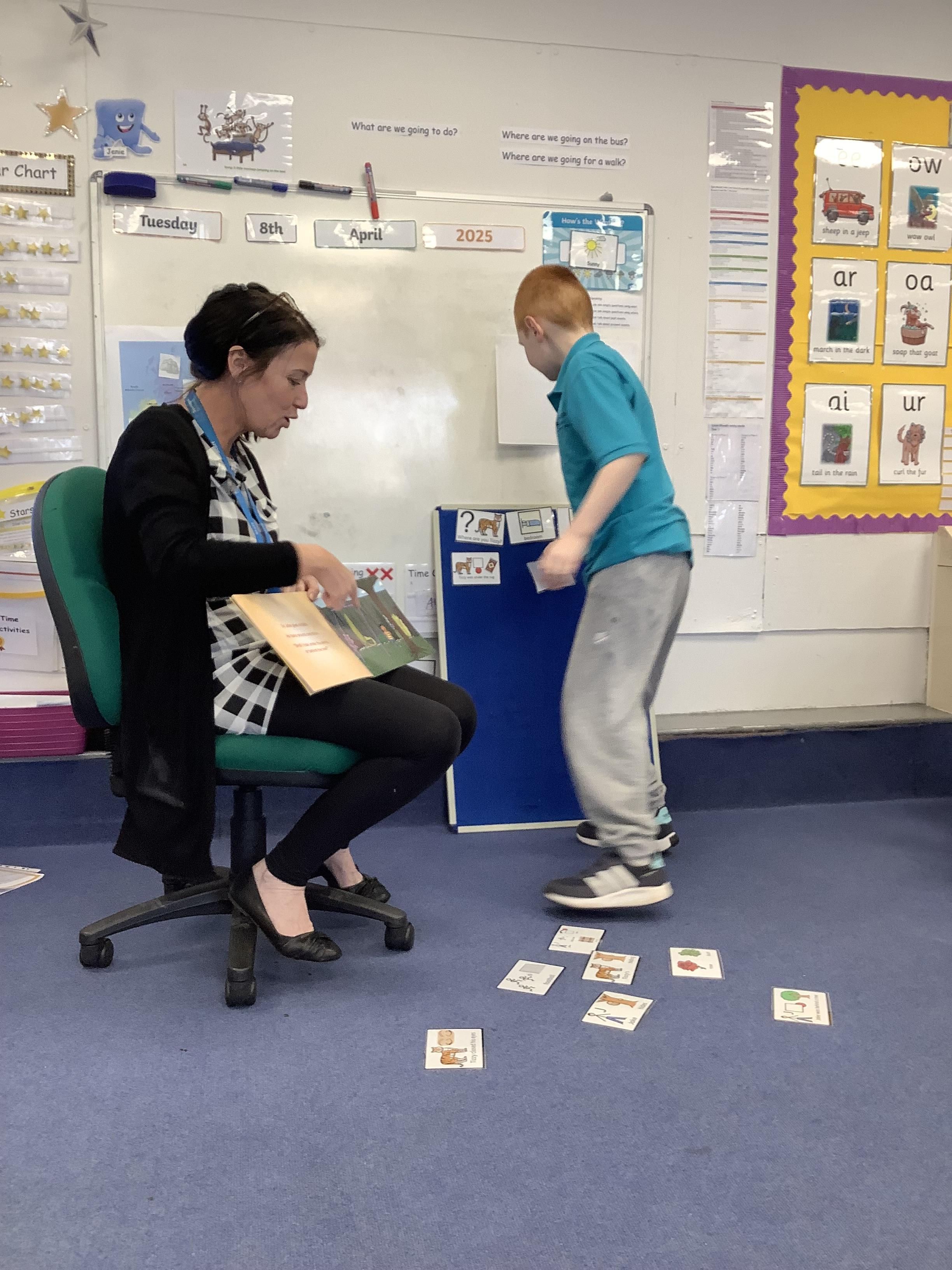 08.04.25 EARLY TALK BOOST Jake and Tizzy Book 6 Hide and Seek - The children have been building sentences using positional language e.g. on, under and in. We have been looking closely at the Tizzy picture cards. Our teacher has been modelling the language for each card, e.g, 'Tizzy is on the chair' or 'Tizzy is under the rug' etc. We have enjoyed singing and acting out the song: 'Five Little Monkeys Jumping on the Bed'.The children have loved playing their own game of hide and seek in our classroom!