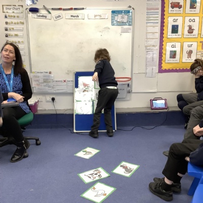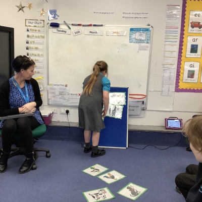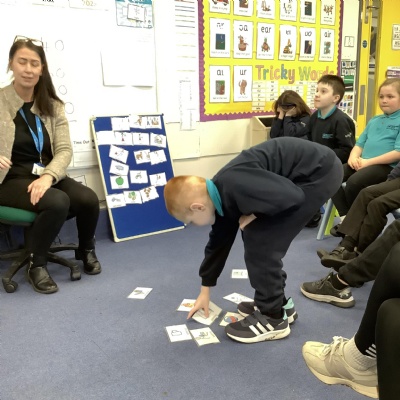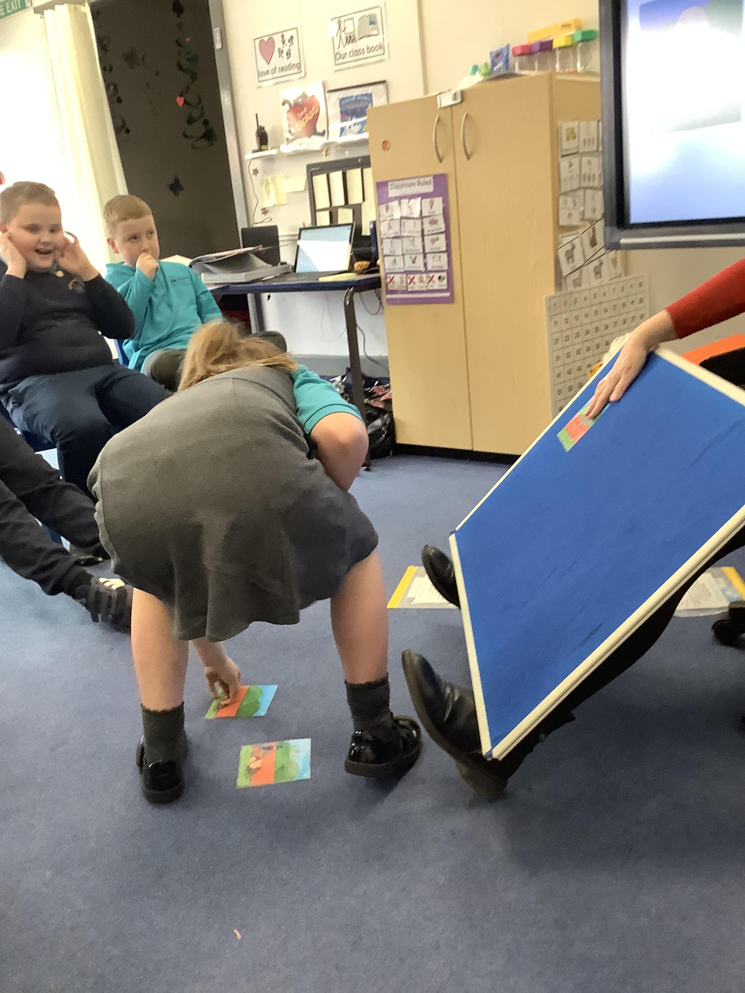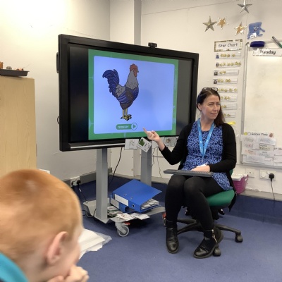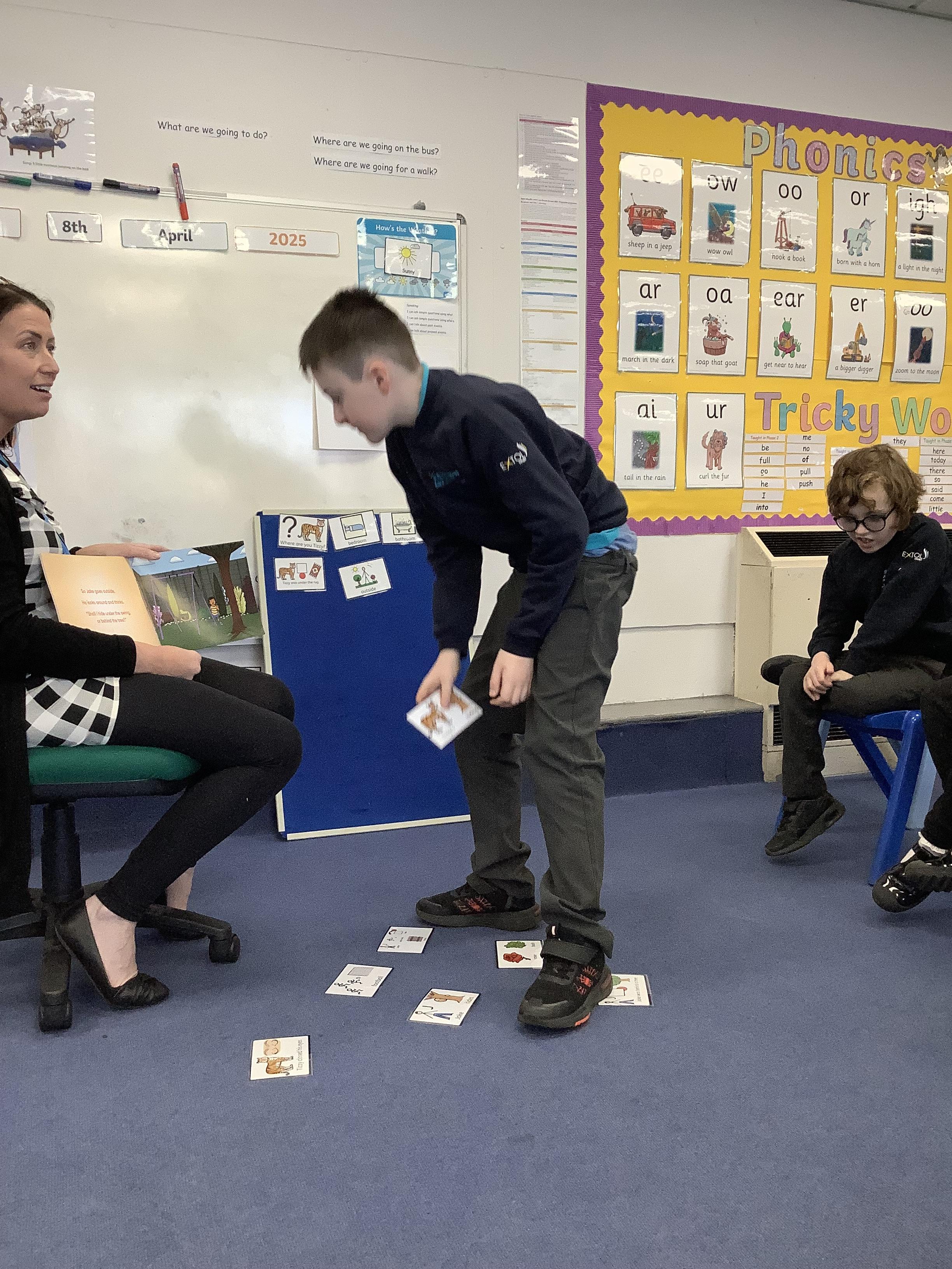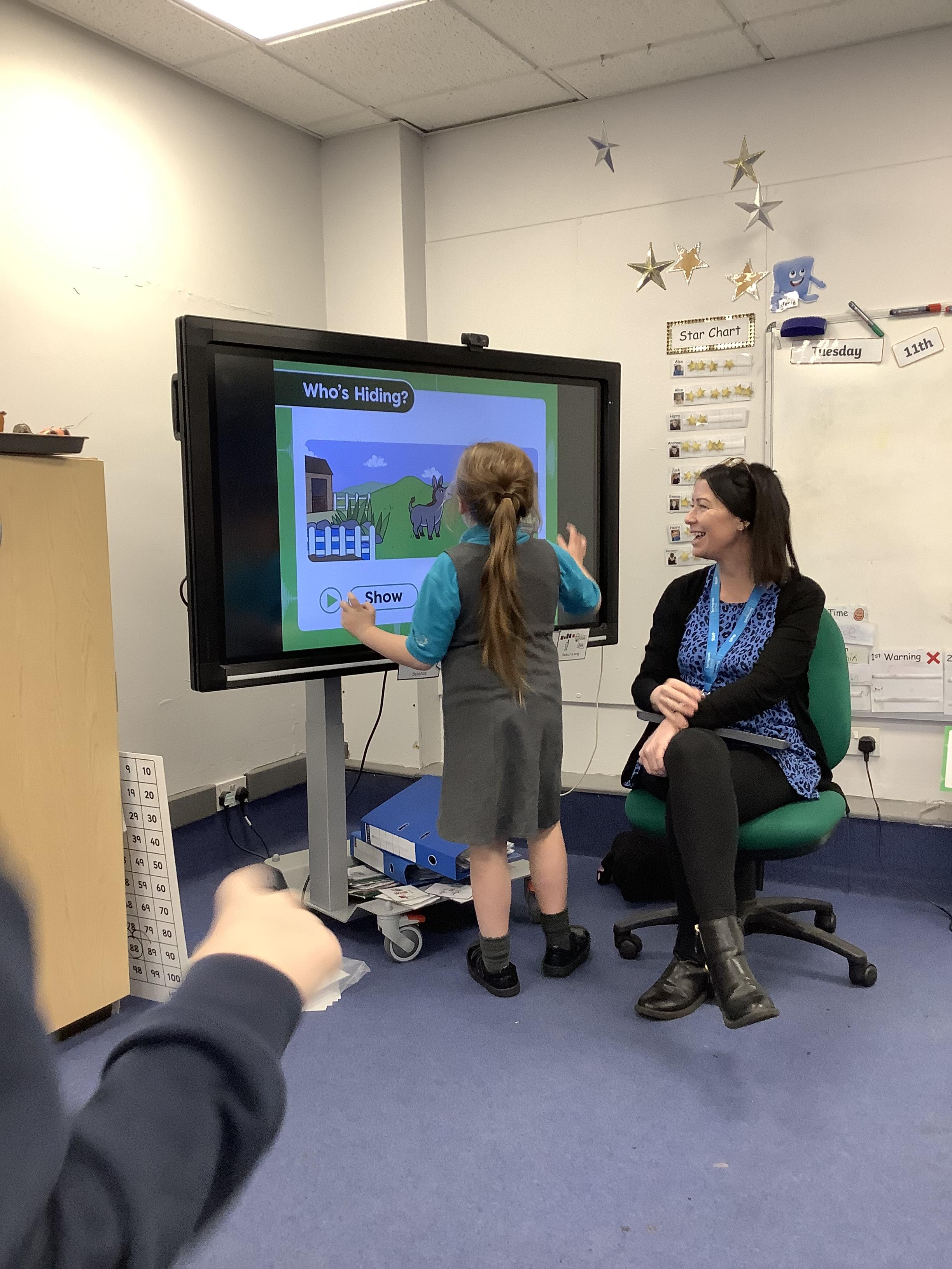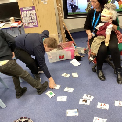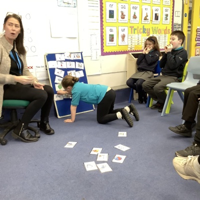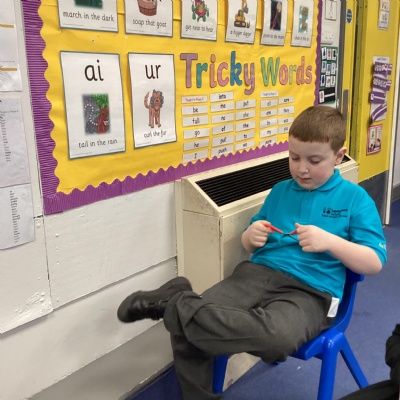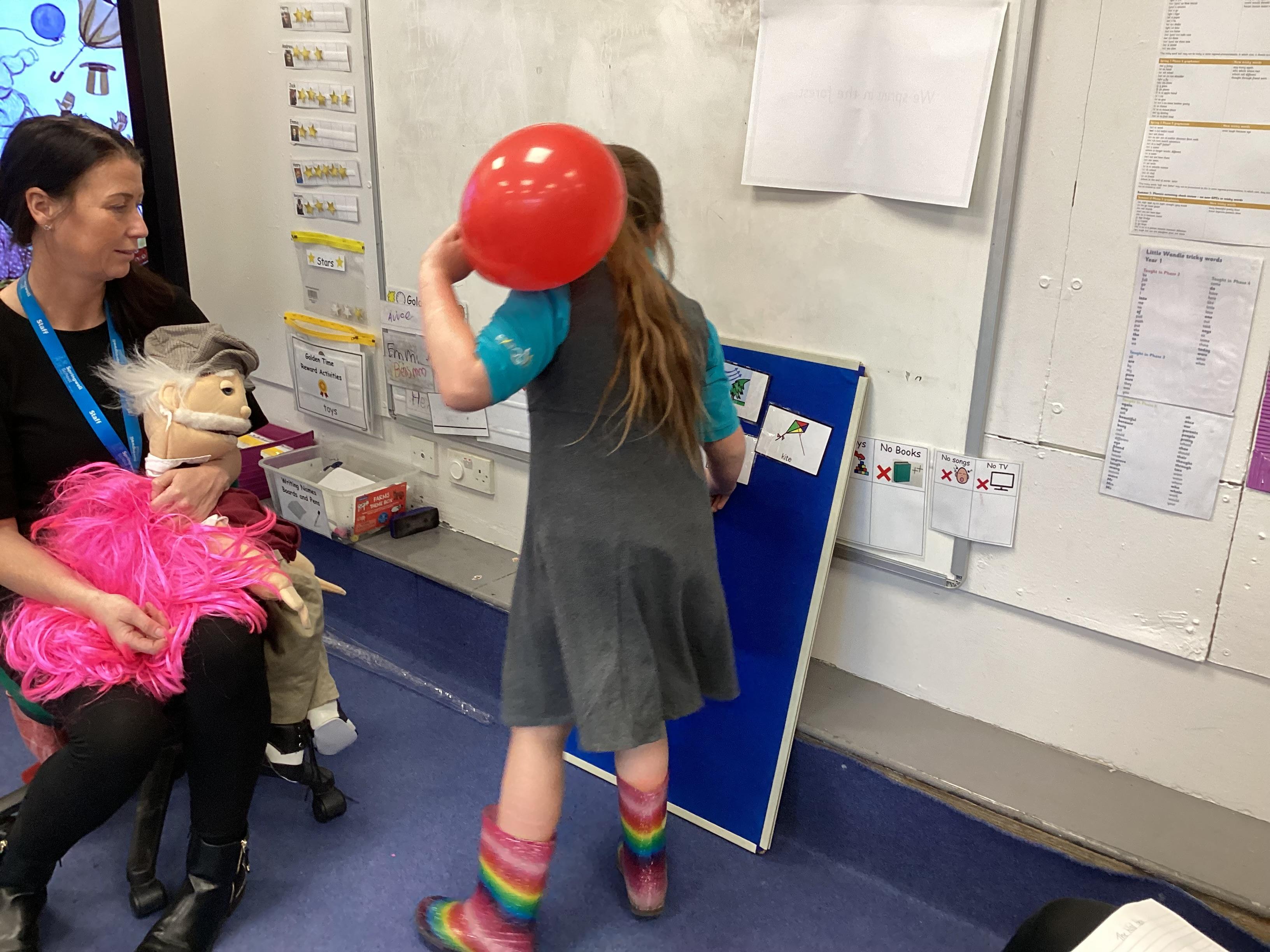 08.04.25 EARLY TALK BOOST Jake and Tizzy Book 6 Hide and Seek - The children have been building sentences using positional language e.g. on, under and in. We have been looking closely at the Tizzy picture cards. Our teacher has been modelling the language for each card, e.g, 'Tizzy is on the chair' or 'Tizzy is under the rug' etc. We have enjoyed singing and acting out the song: 'Five Little Monkeys Jumping on the Bed'.The children have loved playing their own game of hide and seek in our classroom!