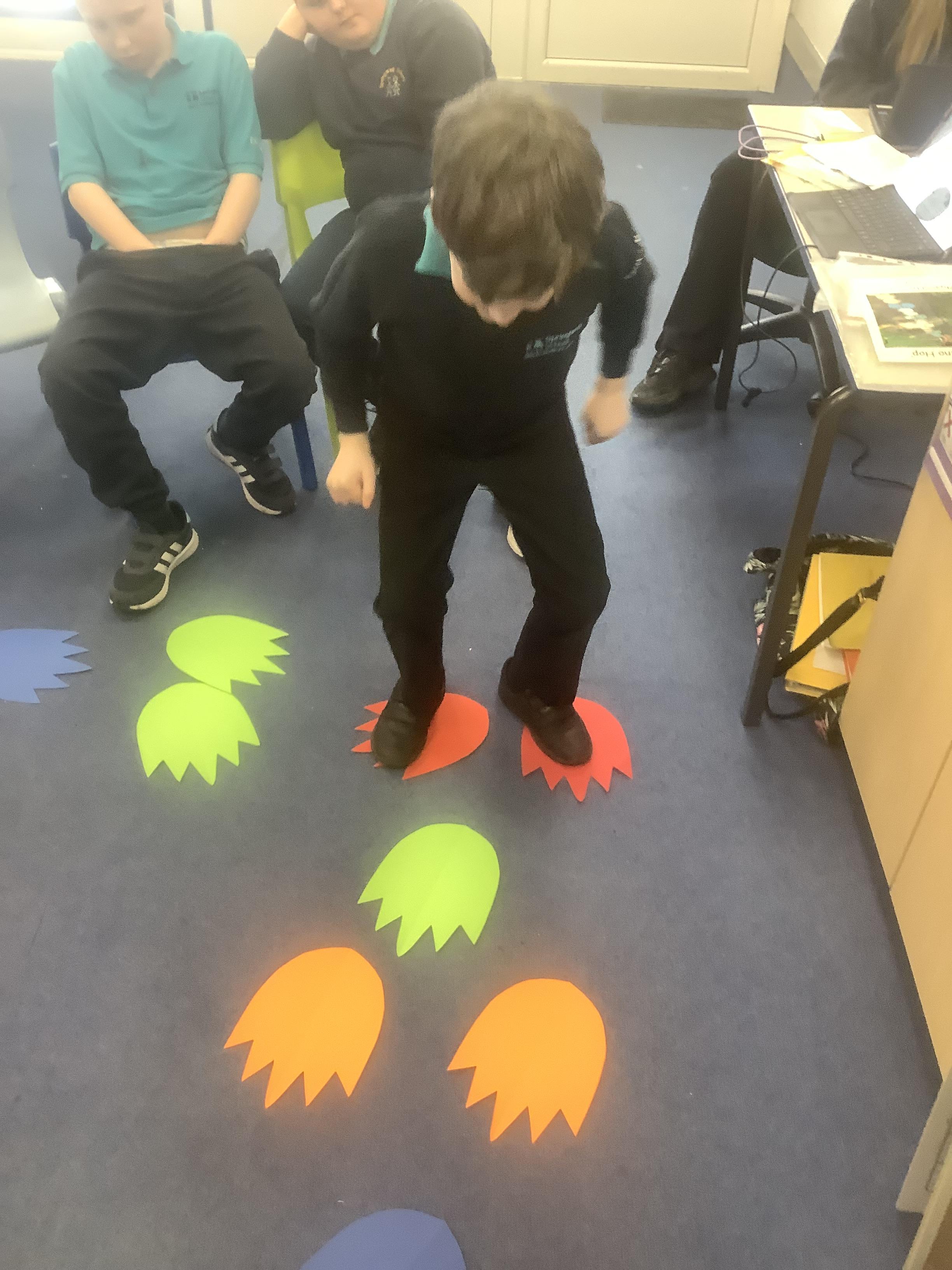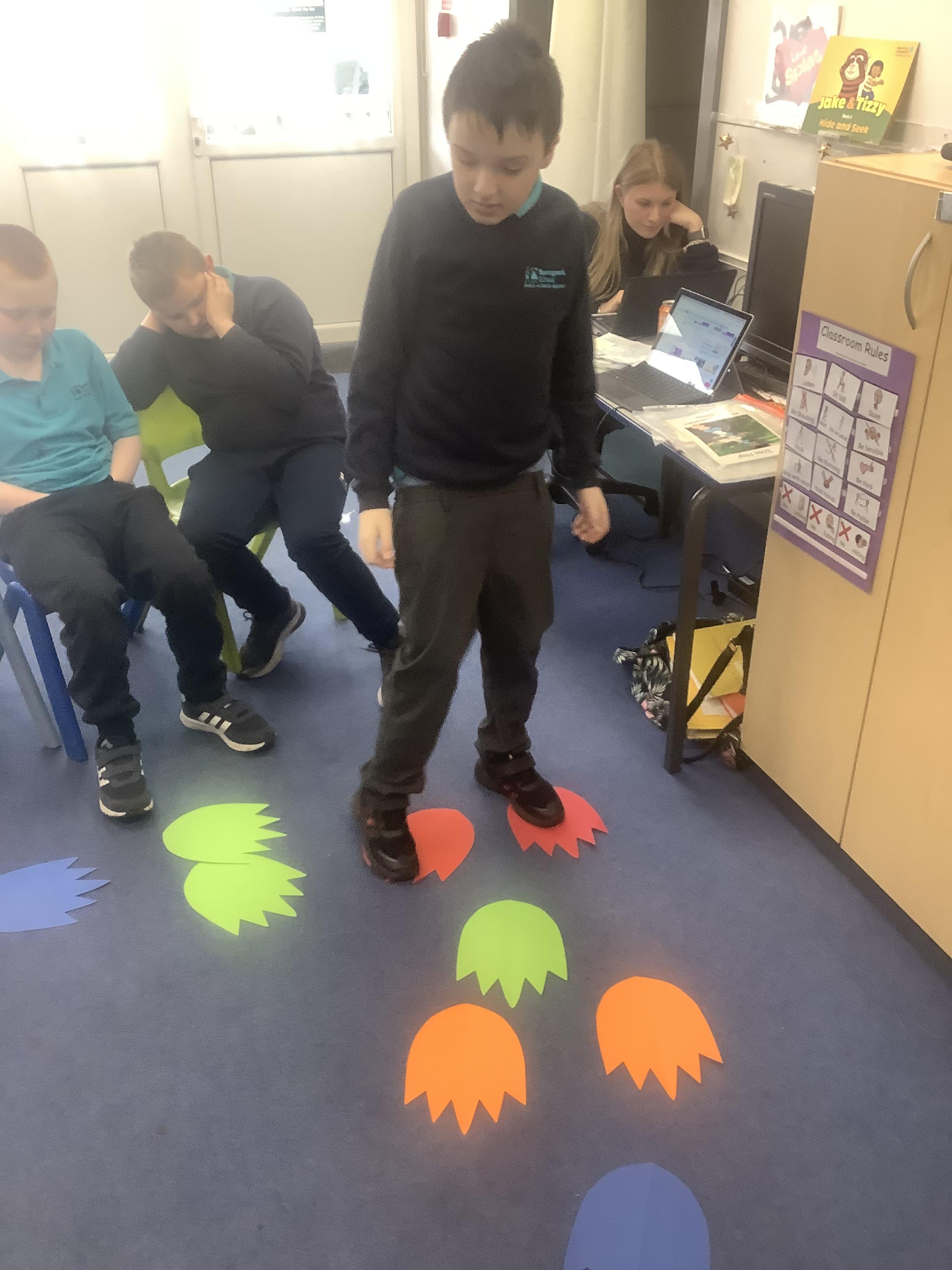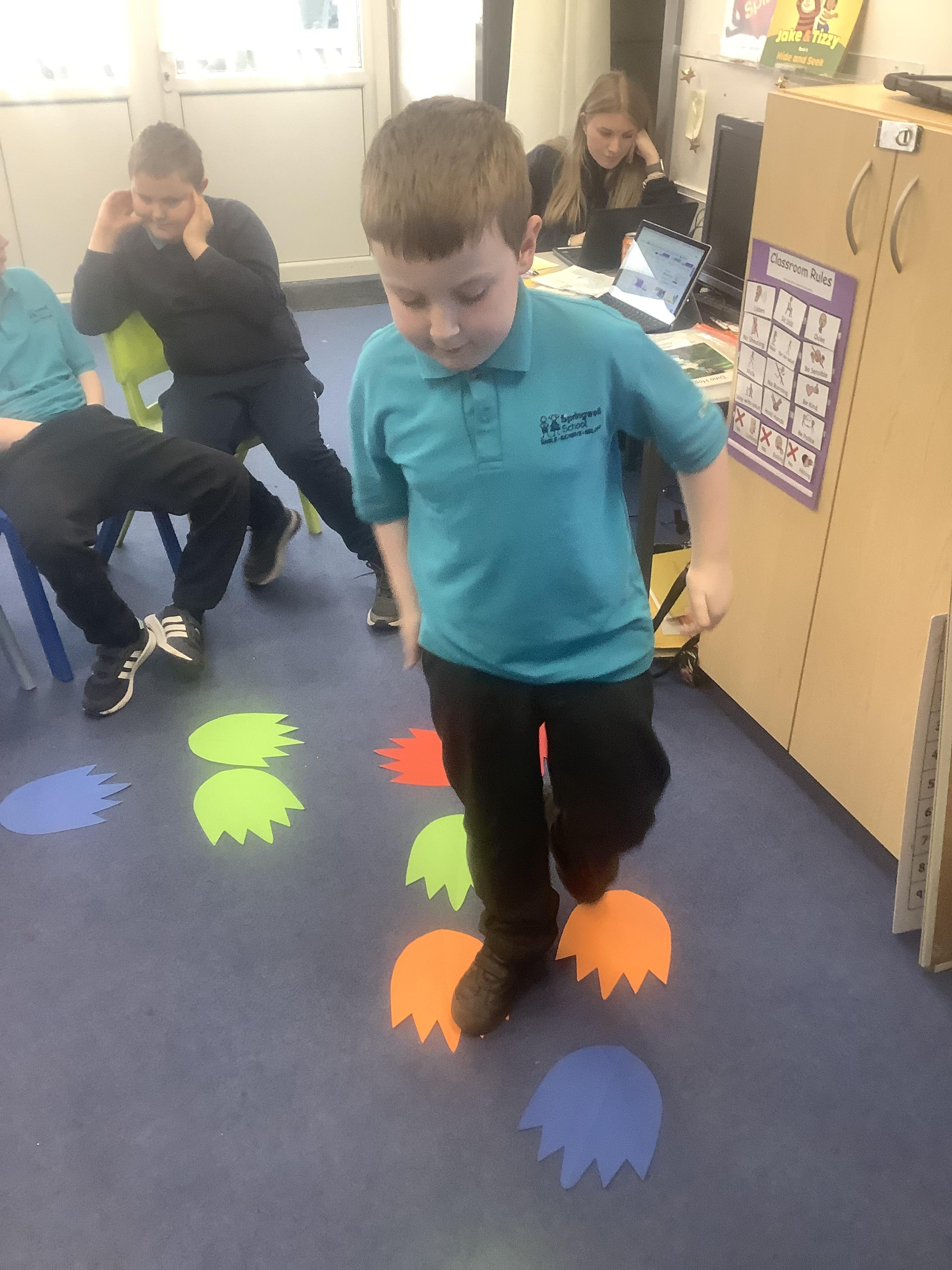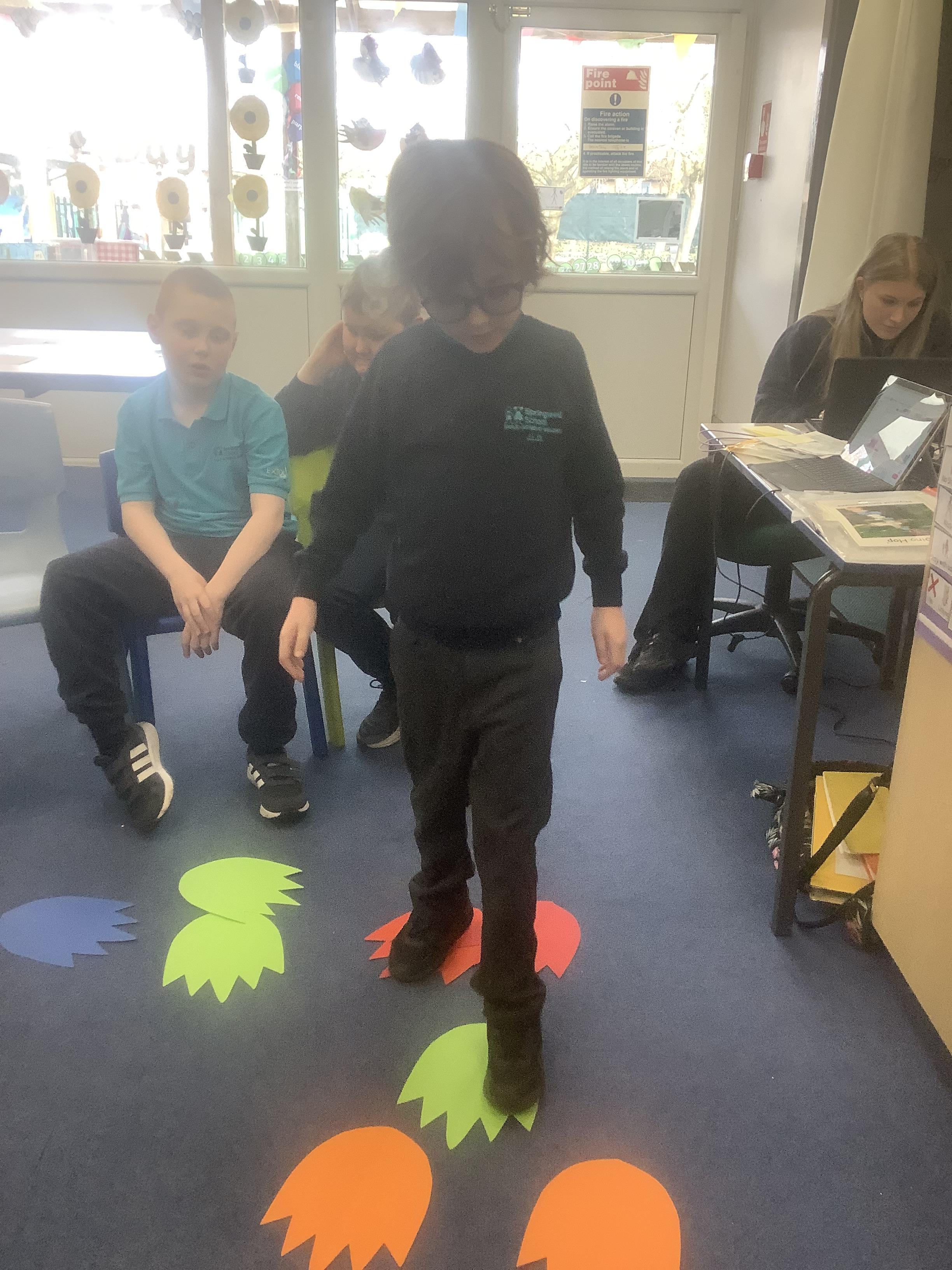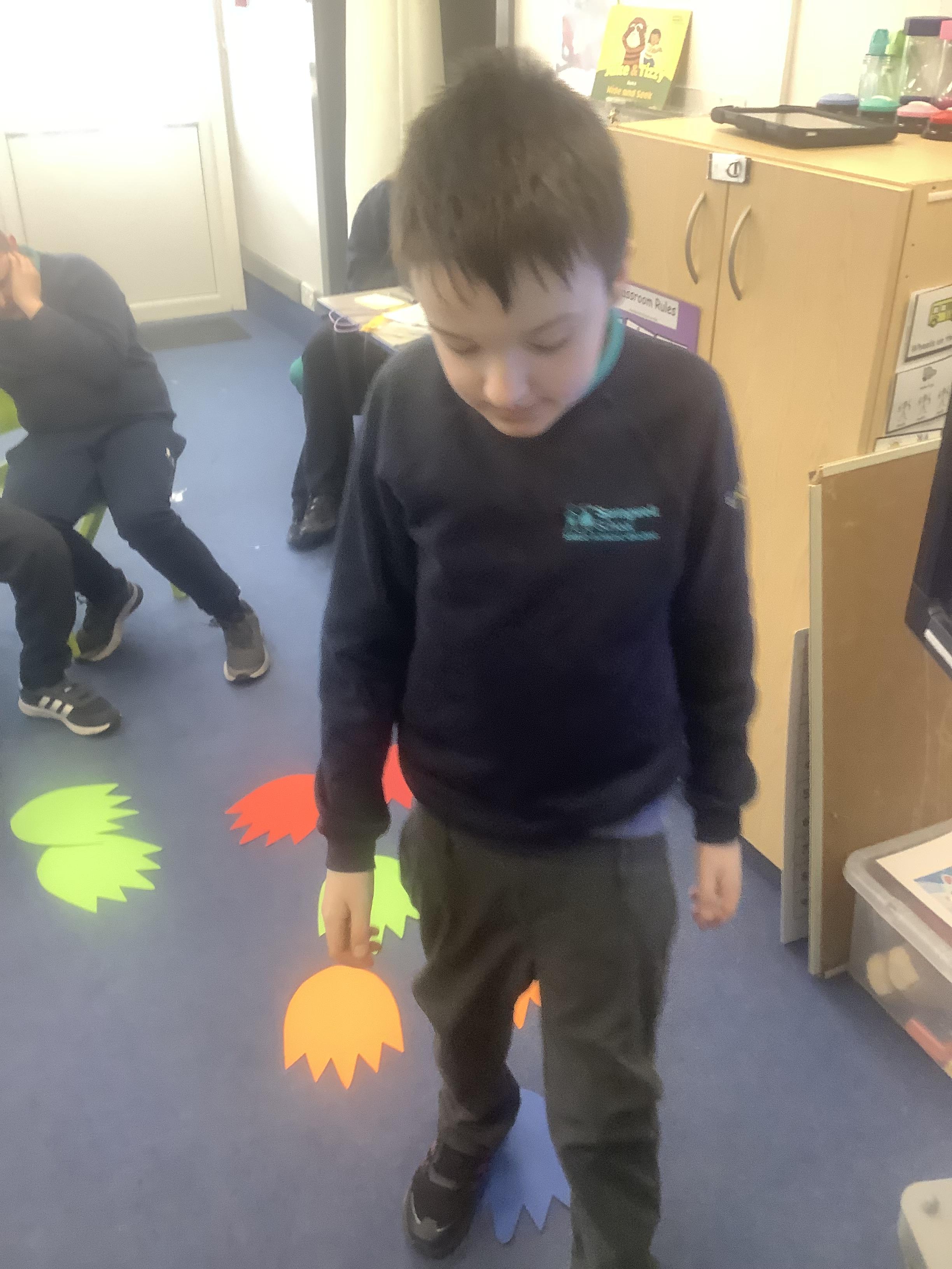 26.03.25 COMPUTING UNPLUGGED: (Physical Development Coding) The children have started following simple pictorial algorithms. They followed the 'Dino Hop' footprints by stepping forward, jumping forwards, hopping, turning etc.