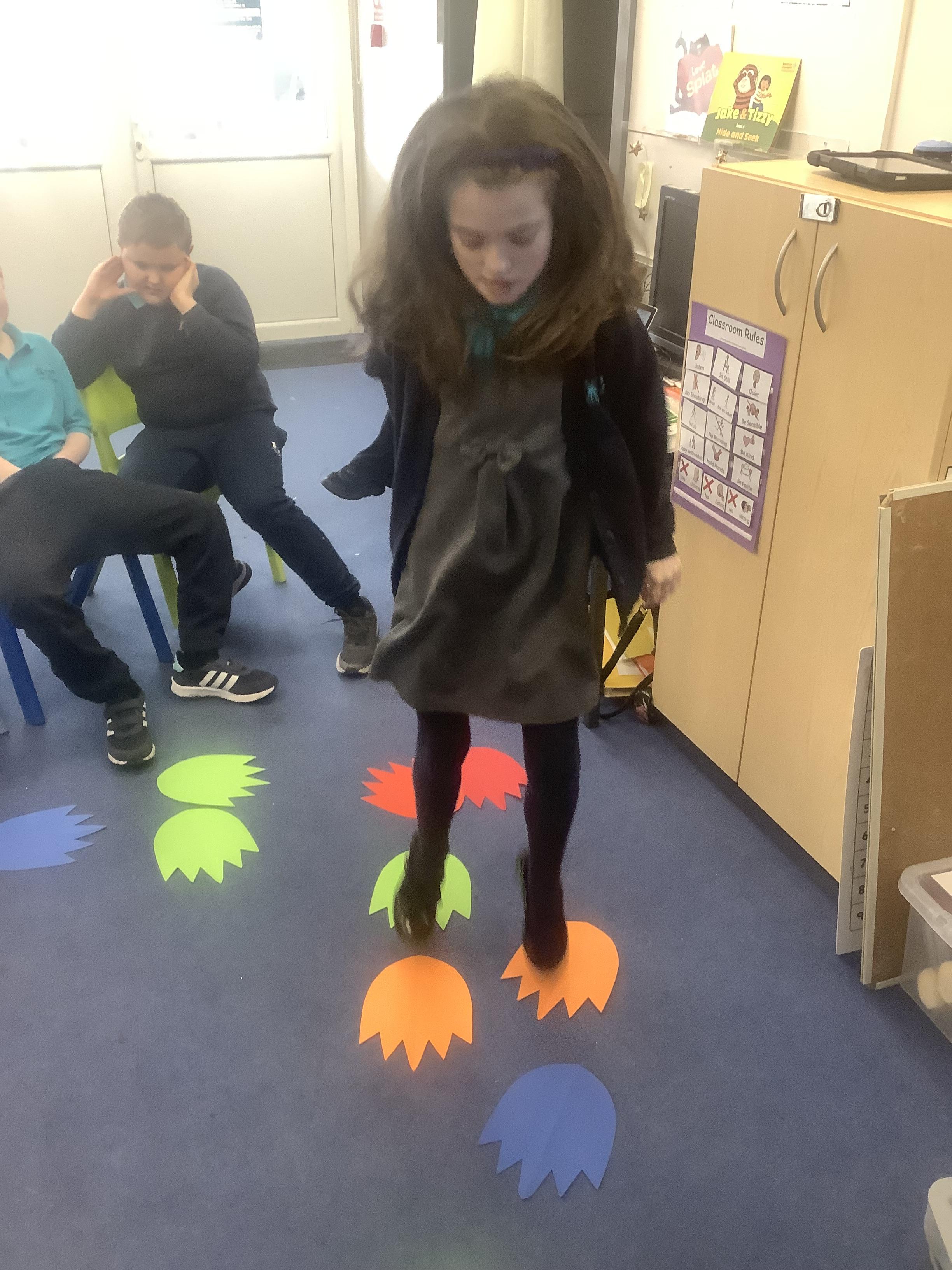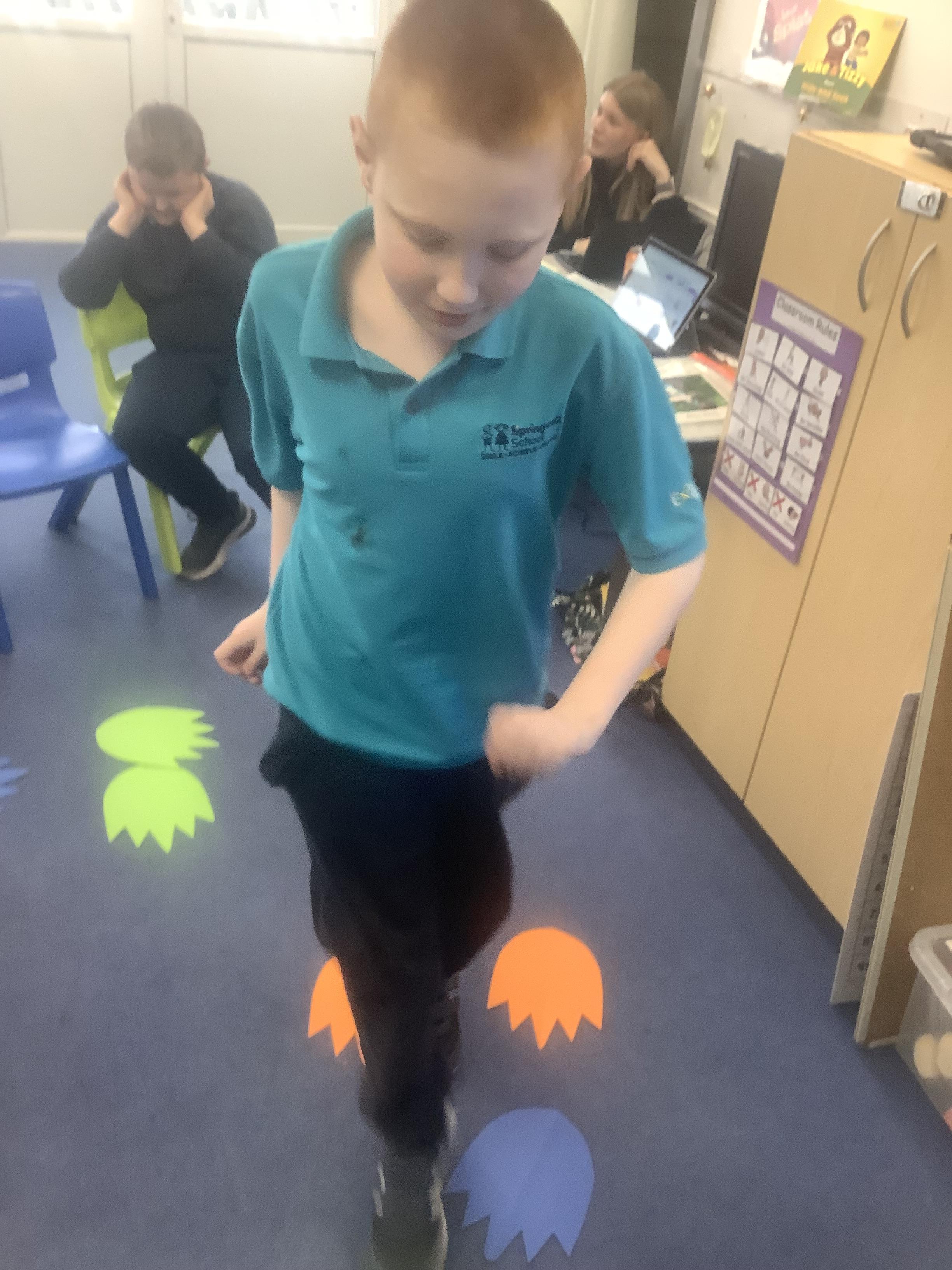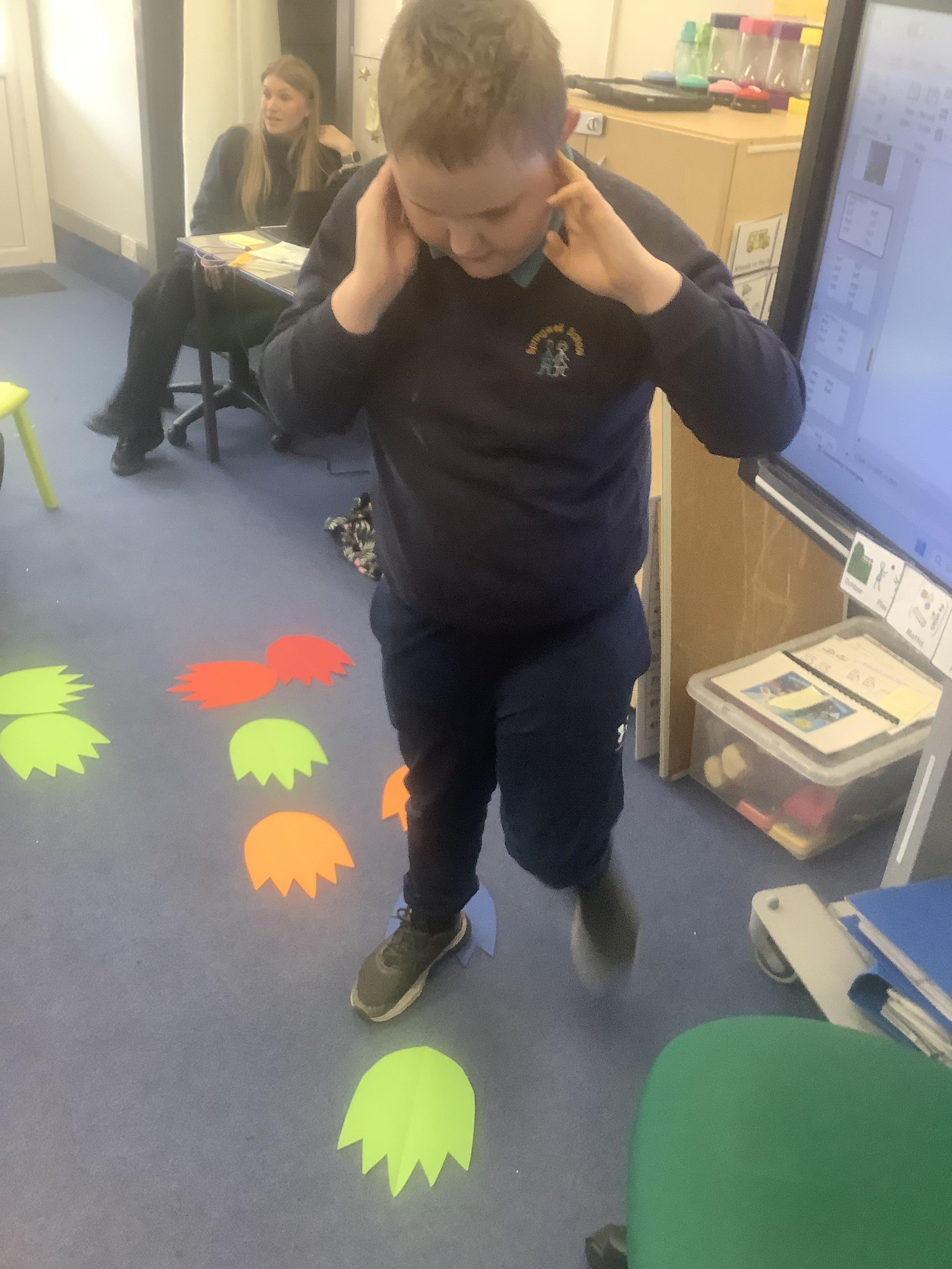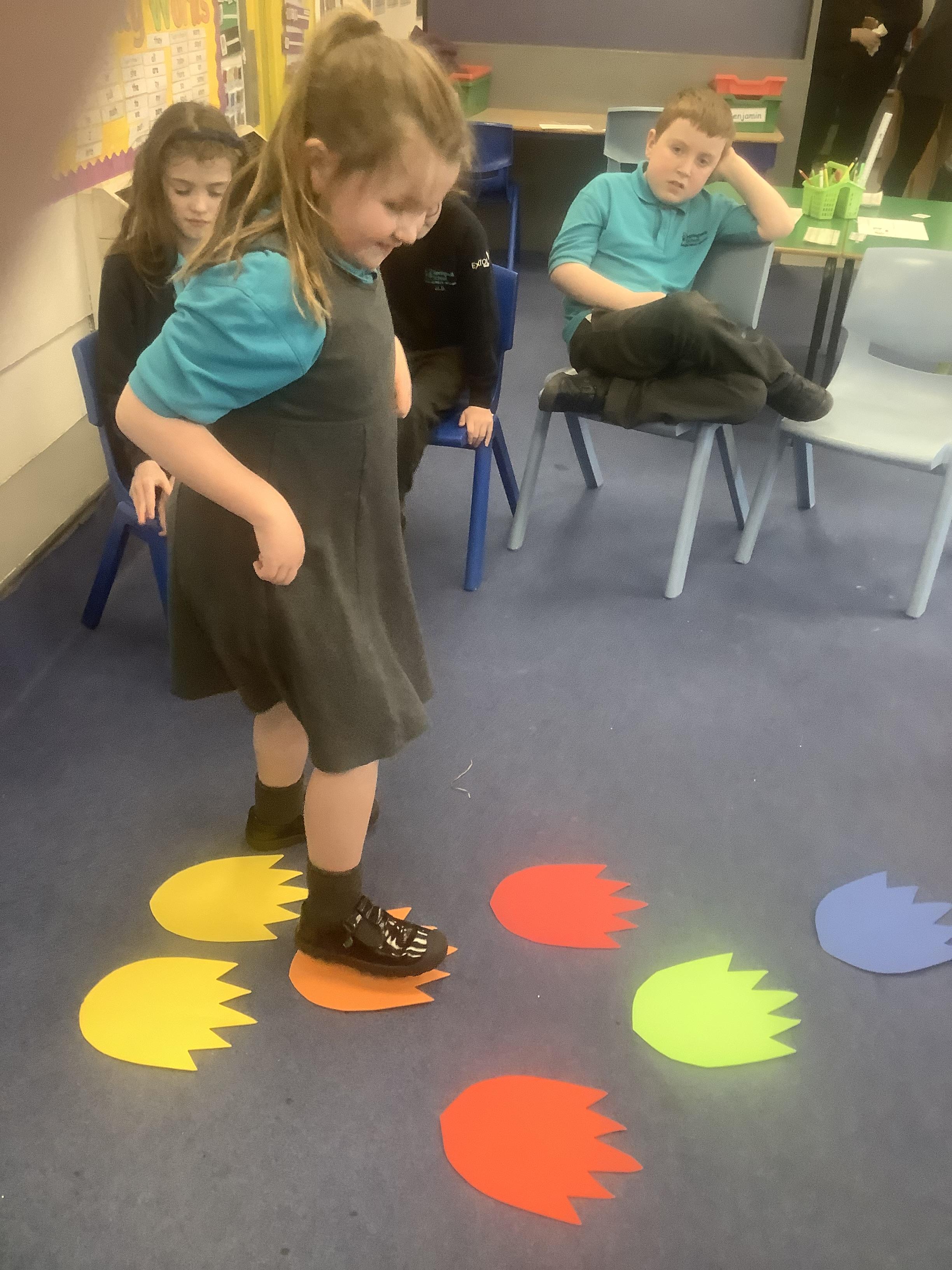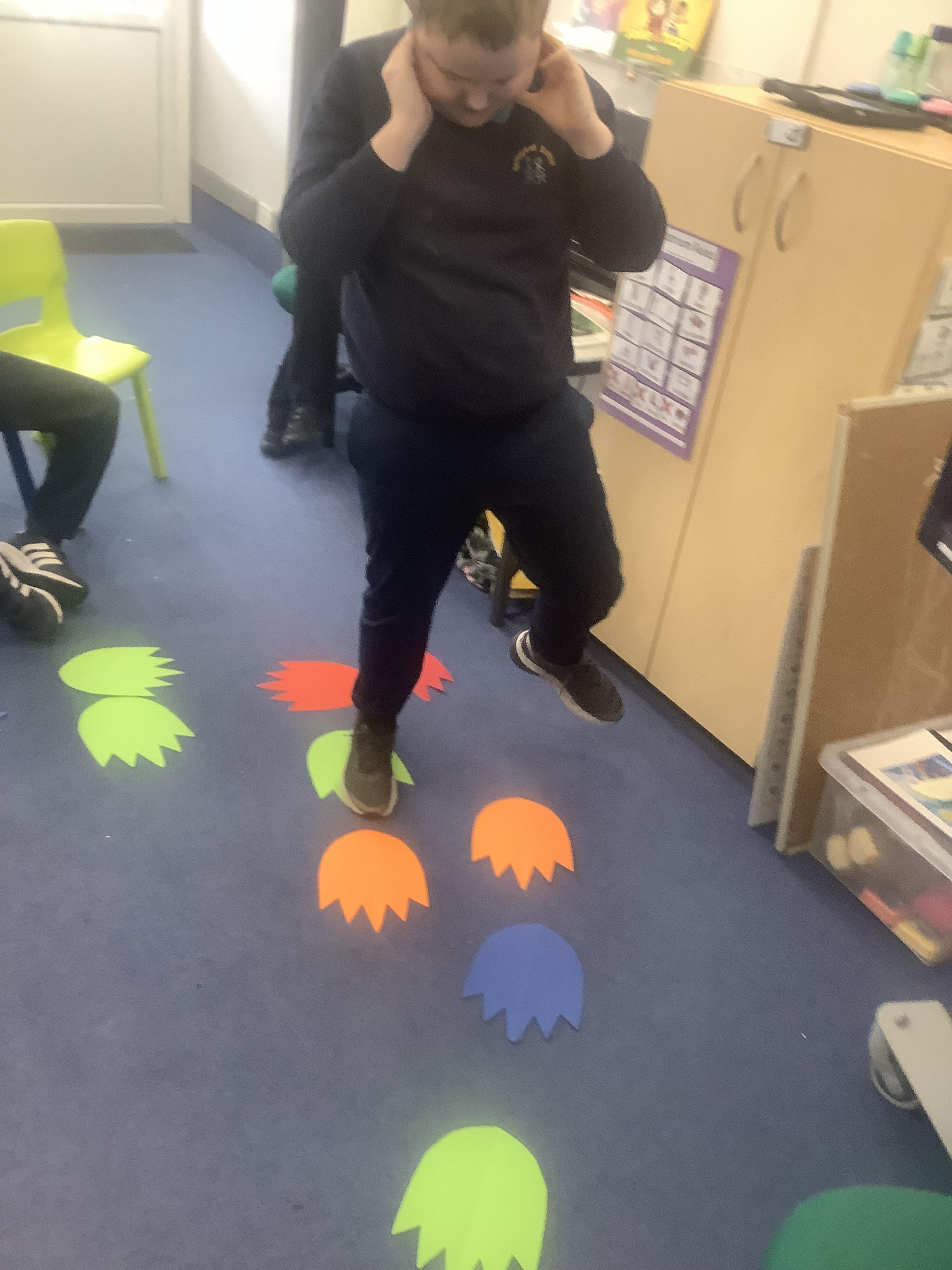 26.03.25 COMPUTING UNPLUGGED: (Physical Development Coding) The children have started following simple pictorial algorithms. They followed the 'Dino Hop' footprints by stepping forward, jumping forwards, hopping, turning etc.