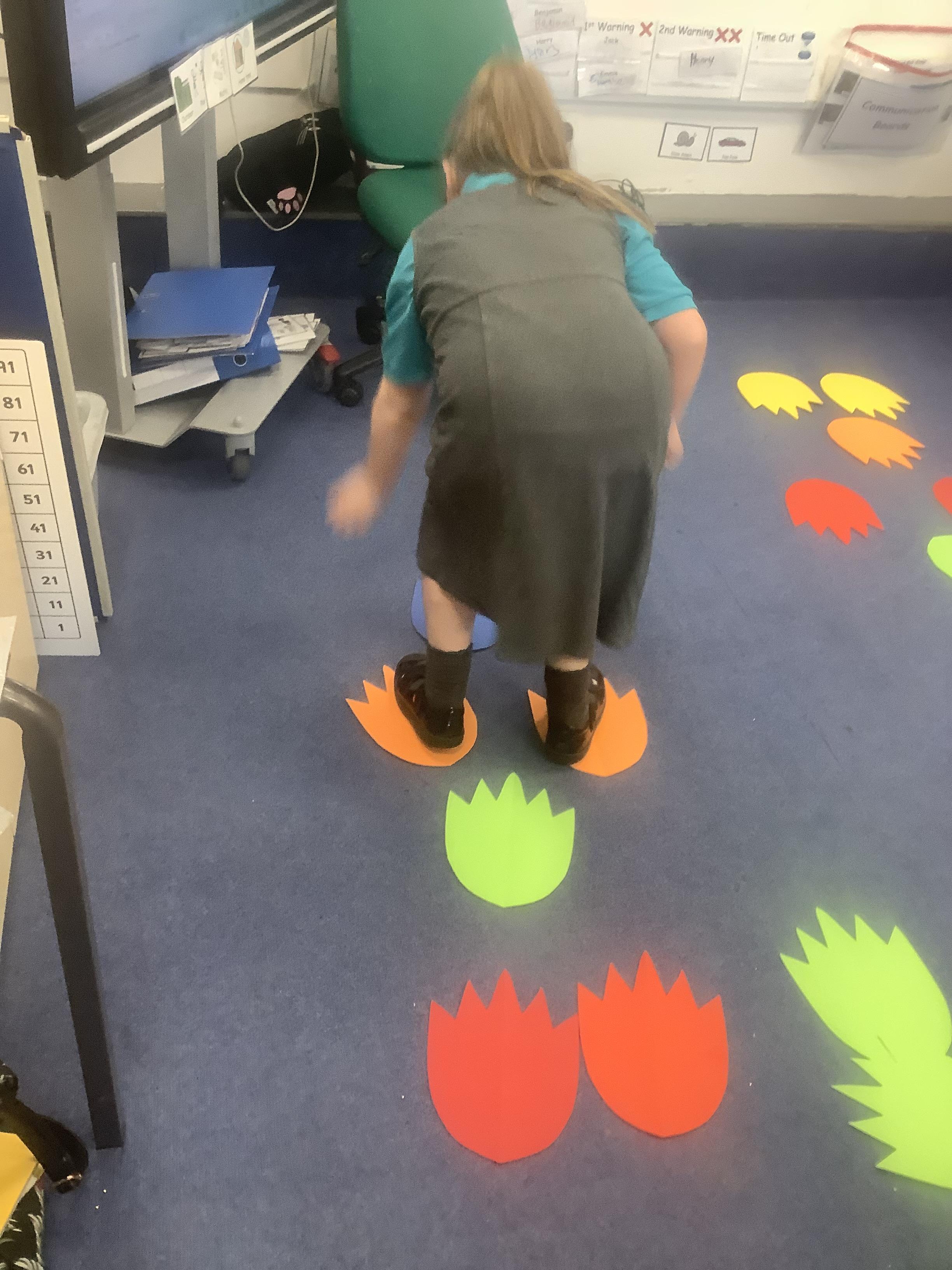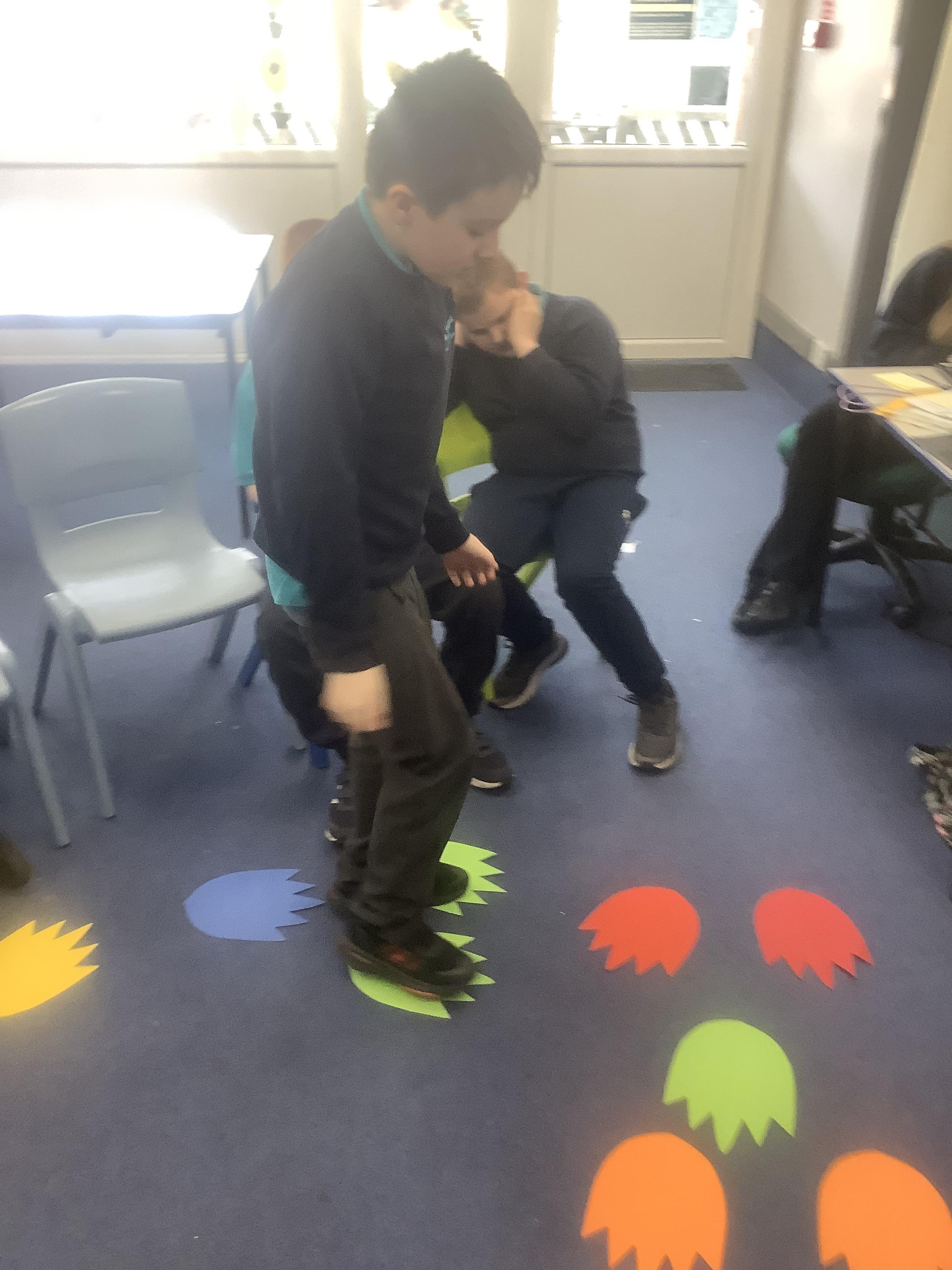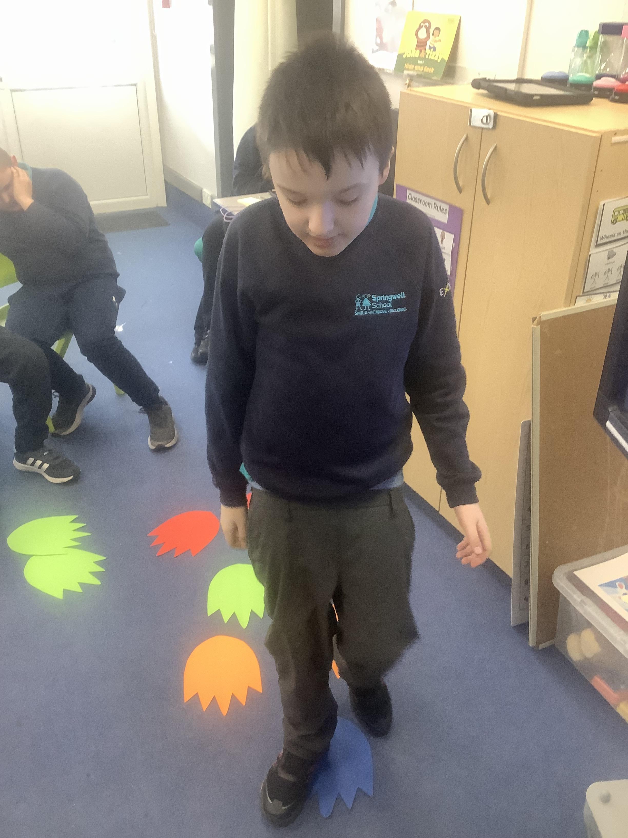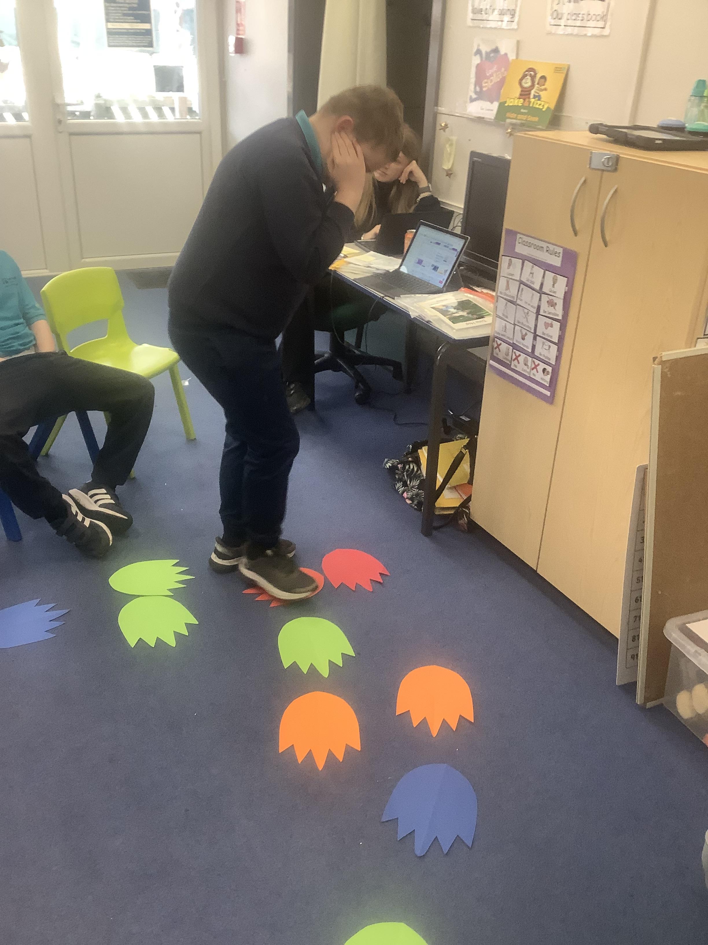 26.03.25 COMPUTING UNPLUGGED: (Physical Development Coding) The children have started following simple pictorial algorithms. They followed the 'Dino Hop' footprints by stepping forward, jumping forwards, hopping, turning etc.
