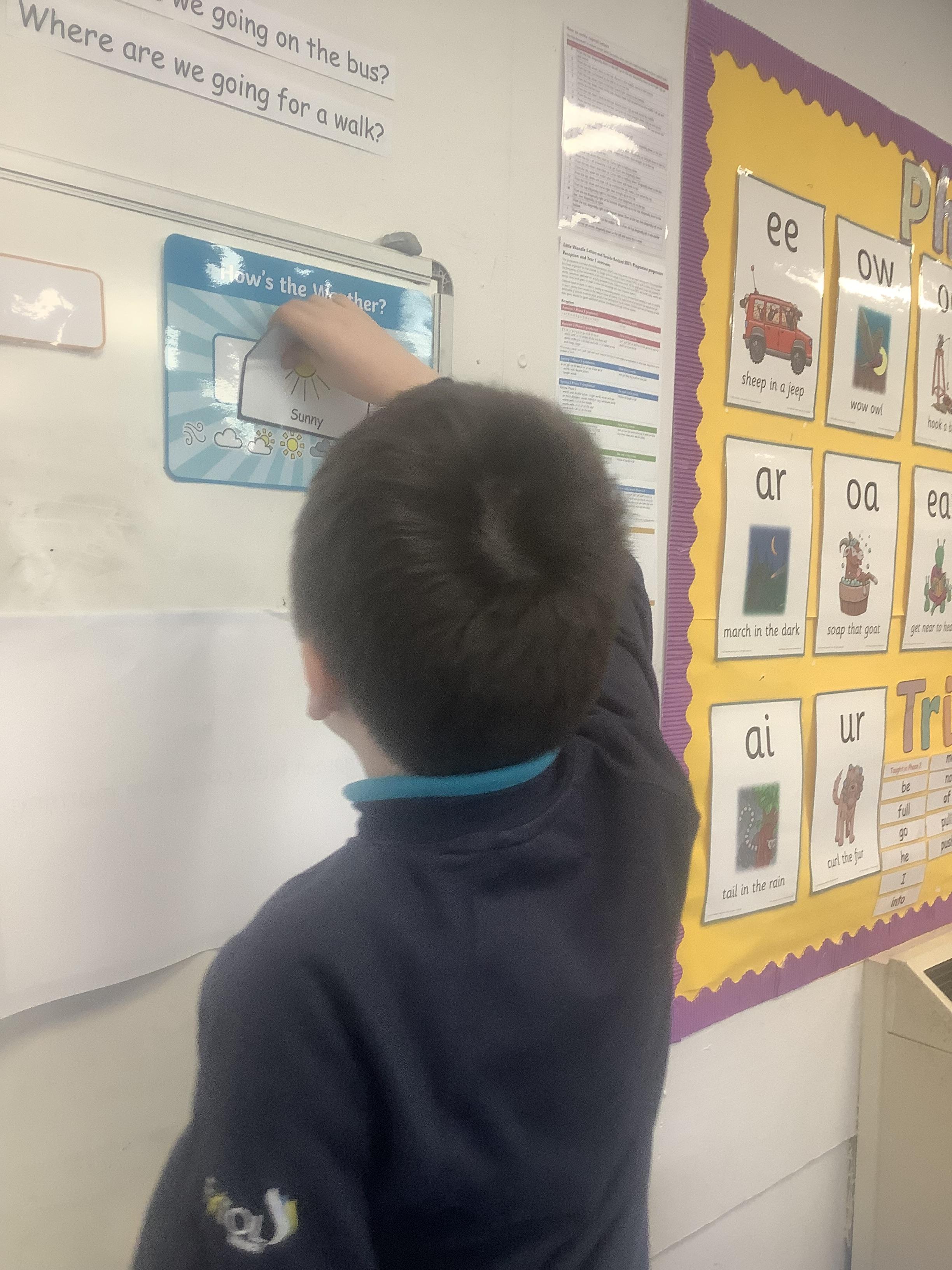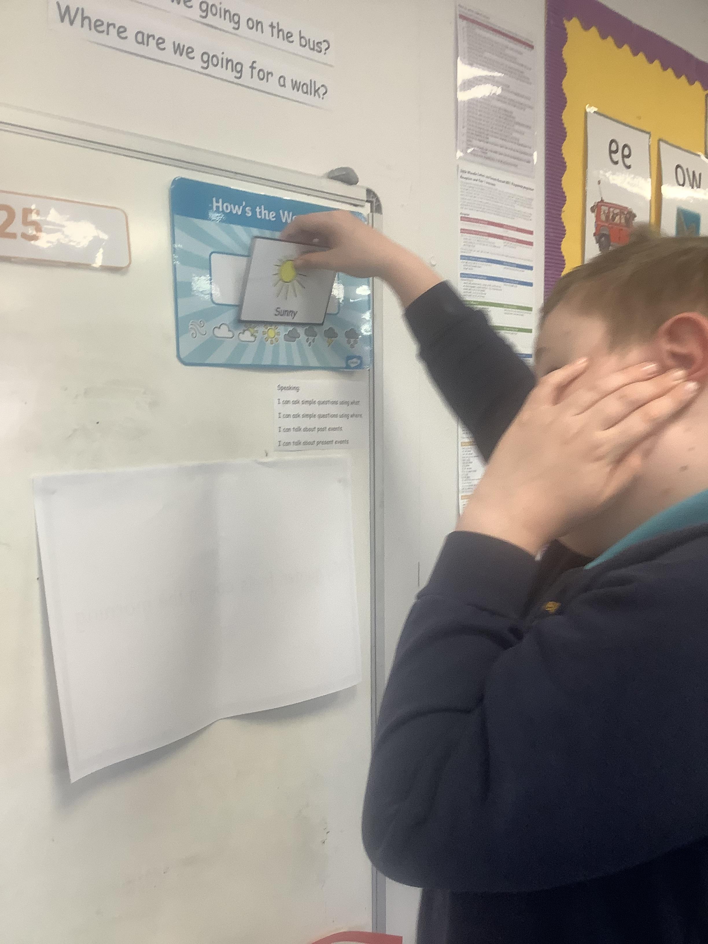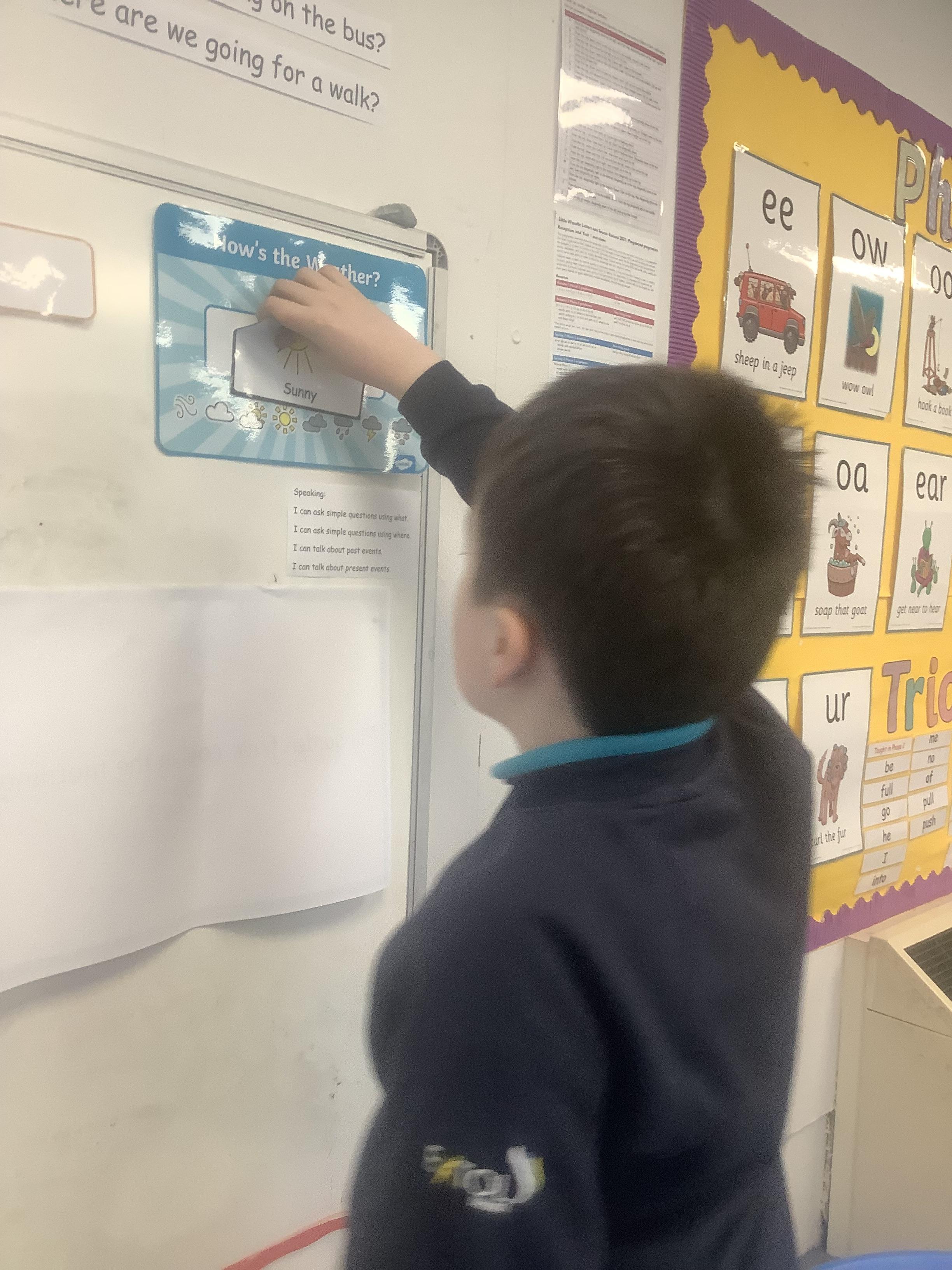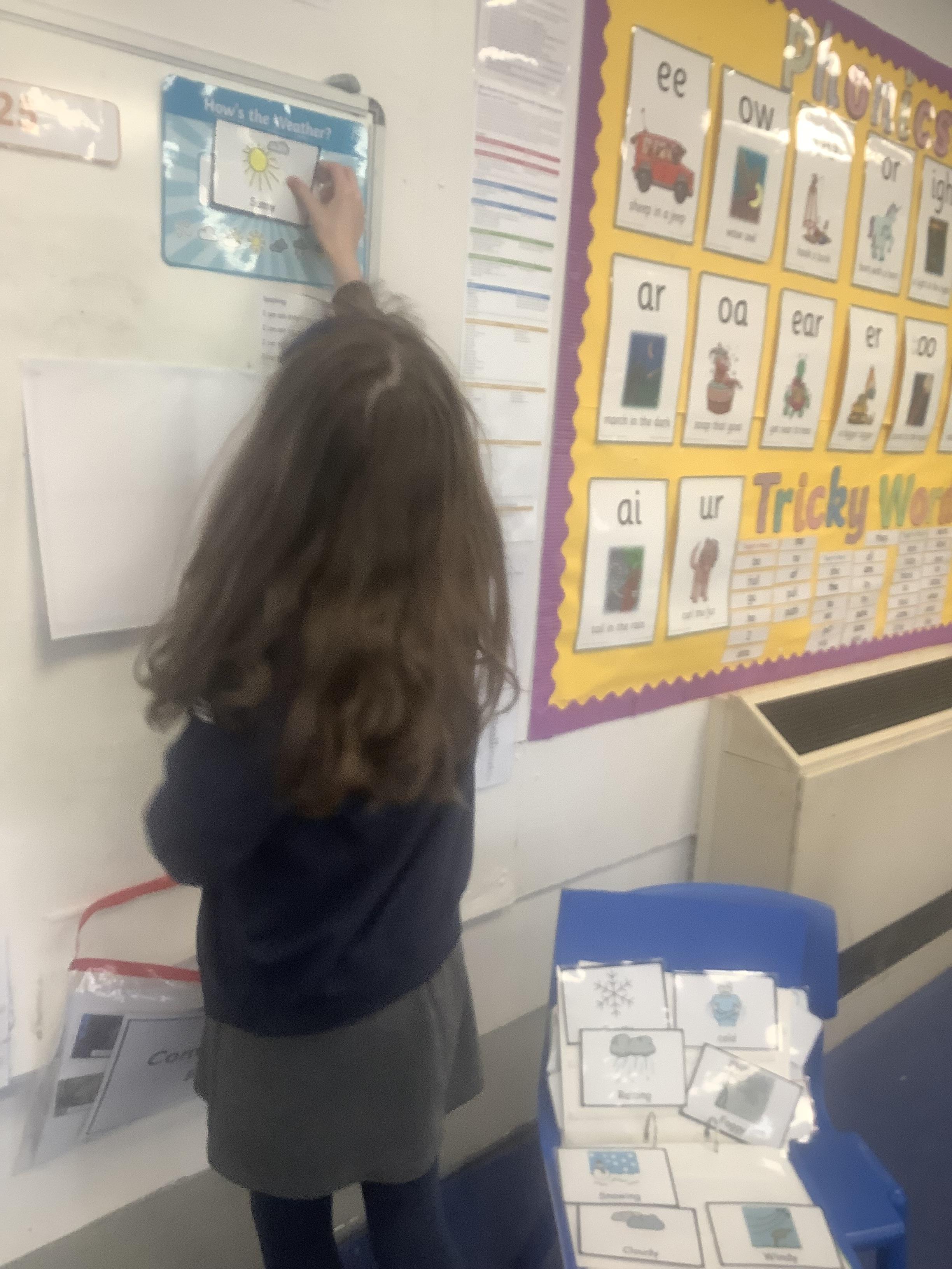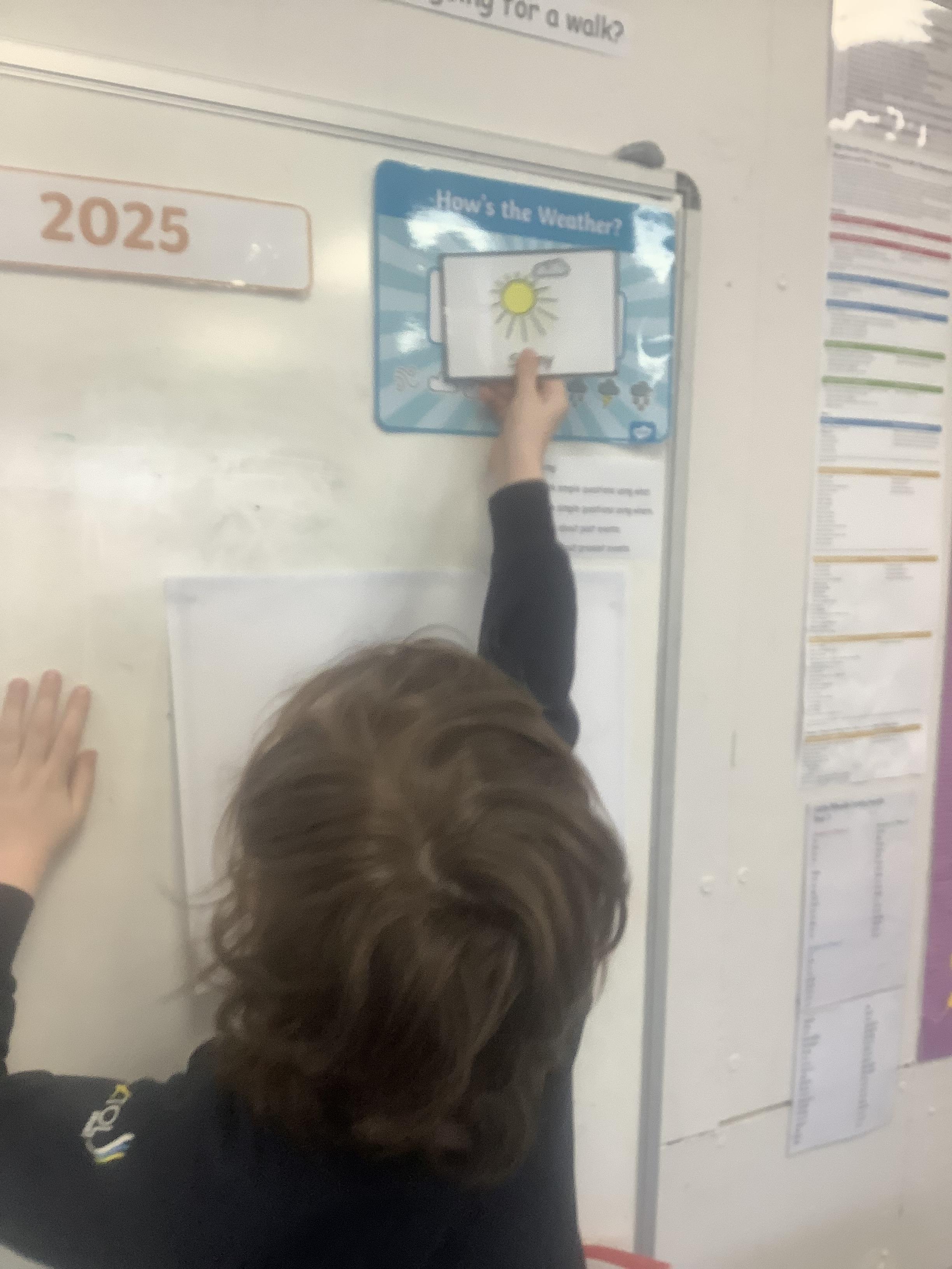 19.03.25 GEOGRAPHY: Each morning, after morning greetings, we sing the weather song. Following this, we all look out the window and discuss what the weather is like today. The children choose the correct weather symbol and place it on our weather chart.