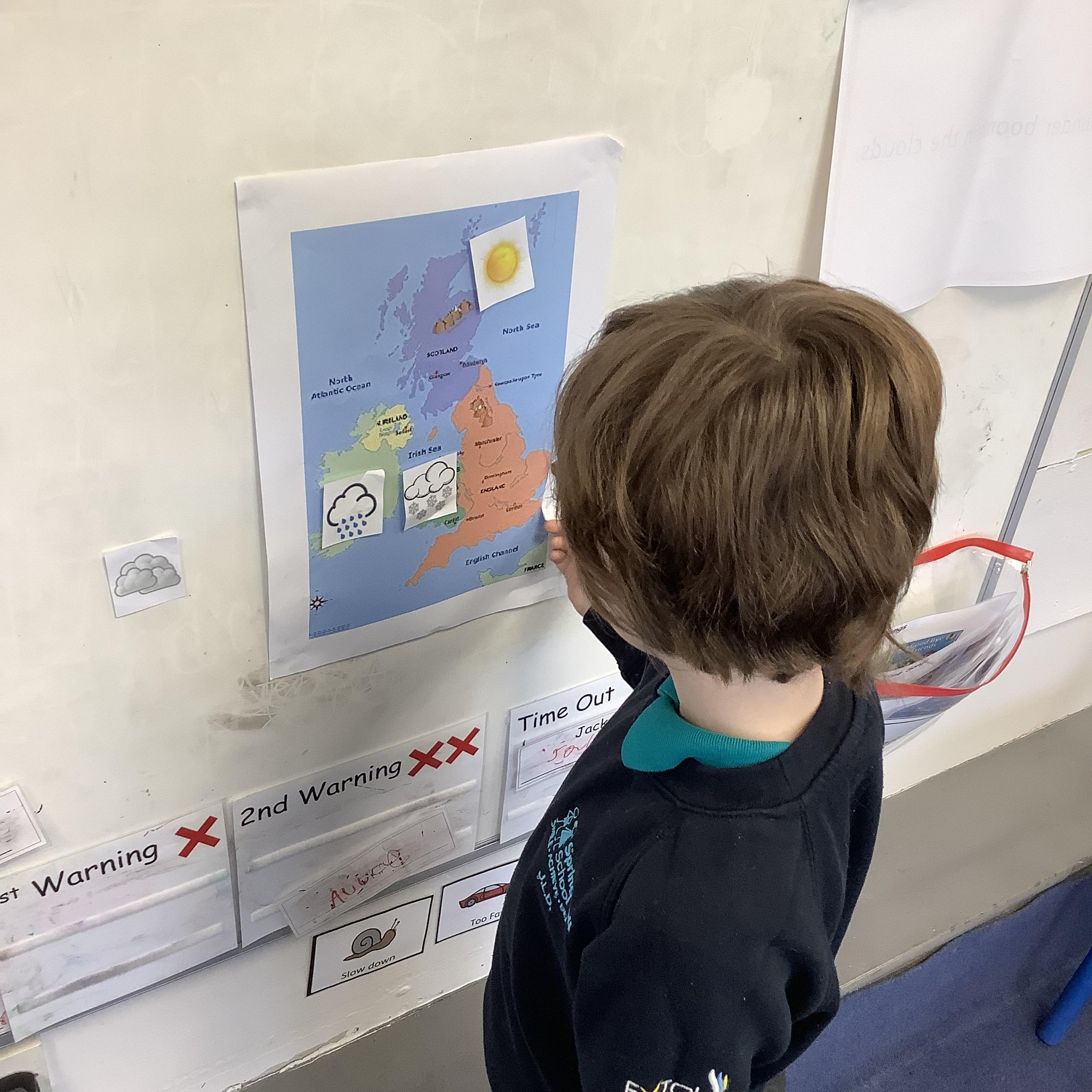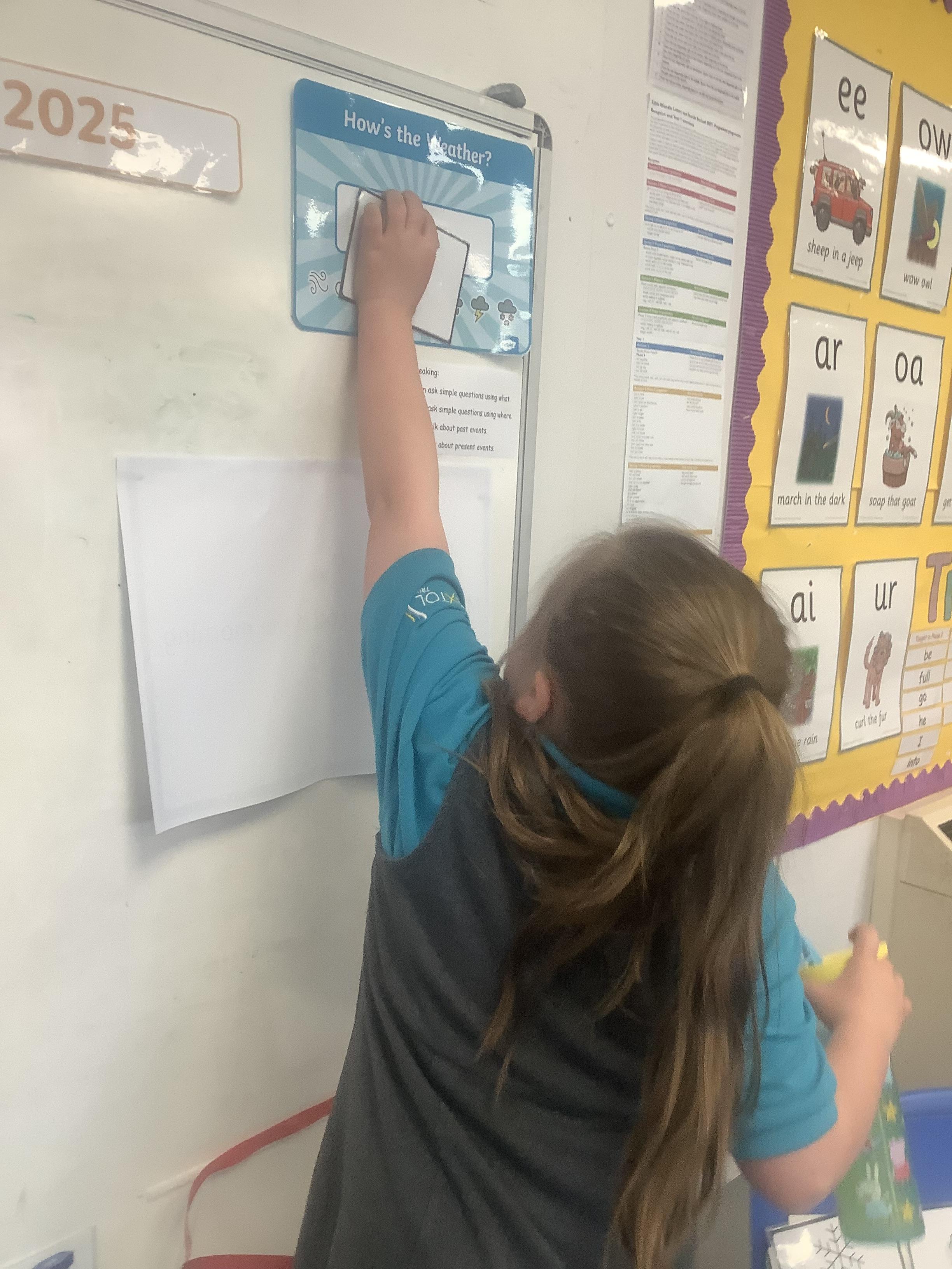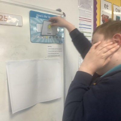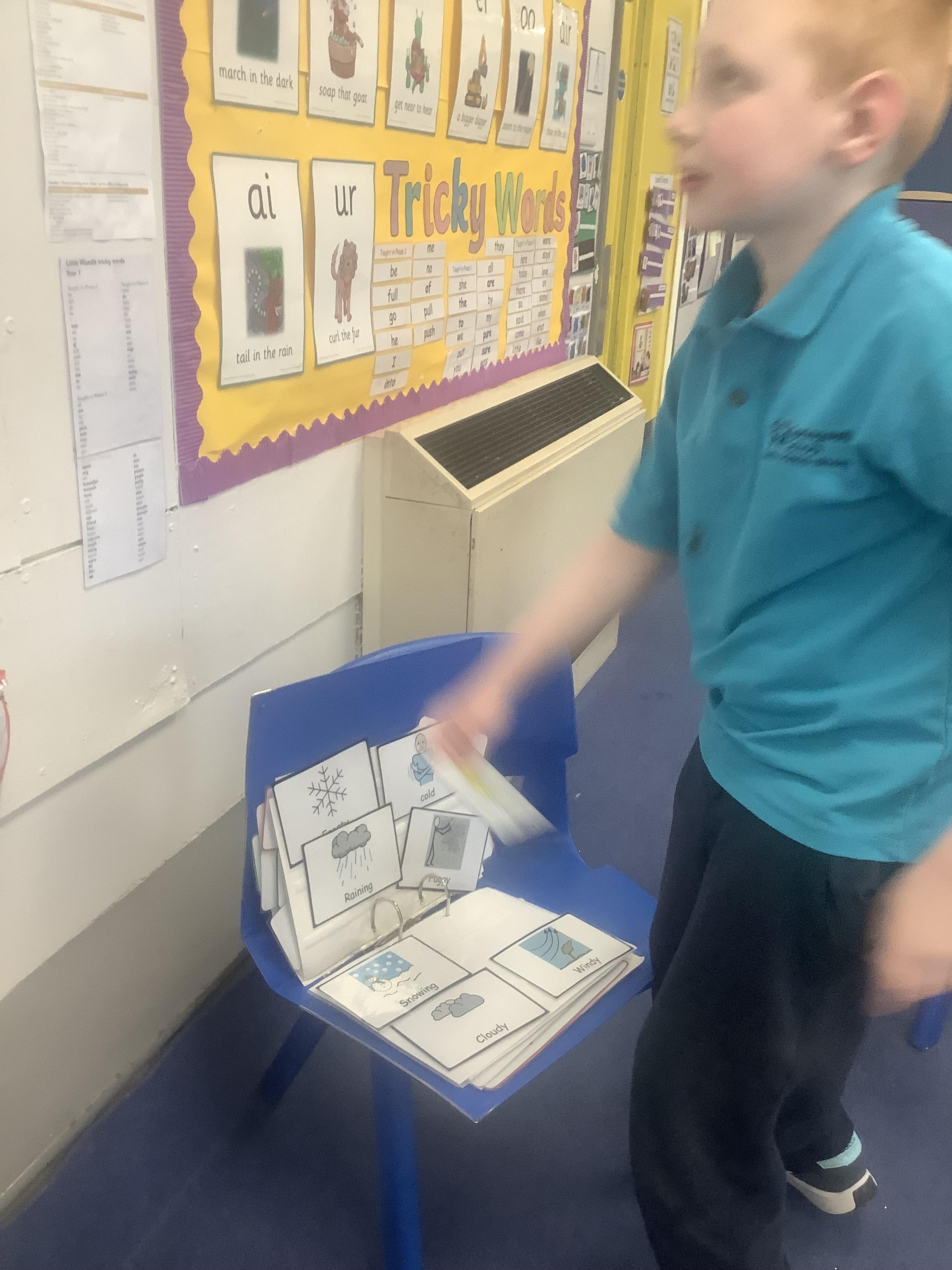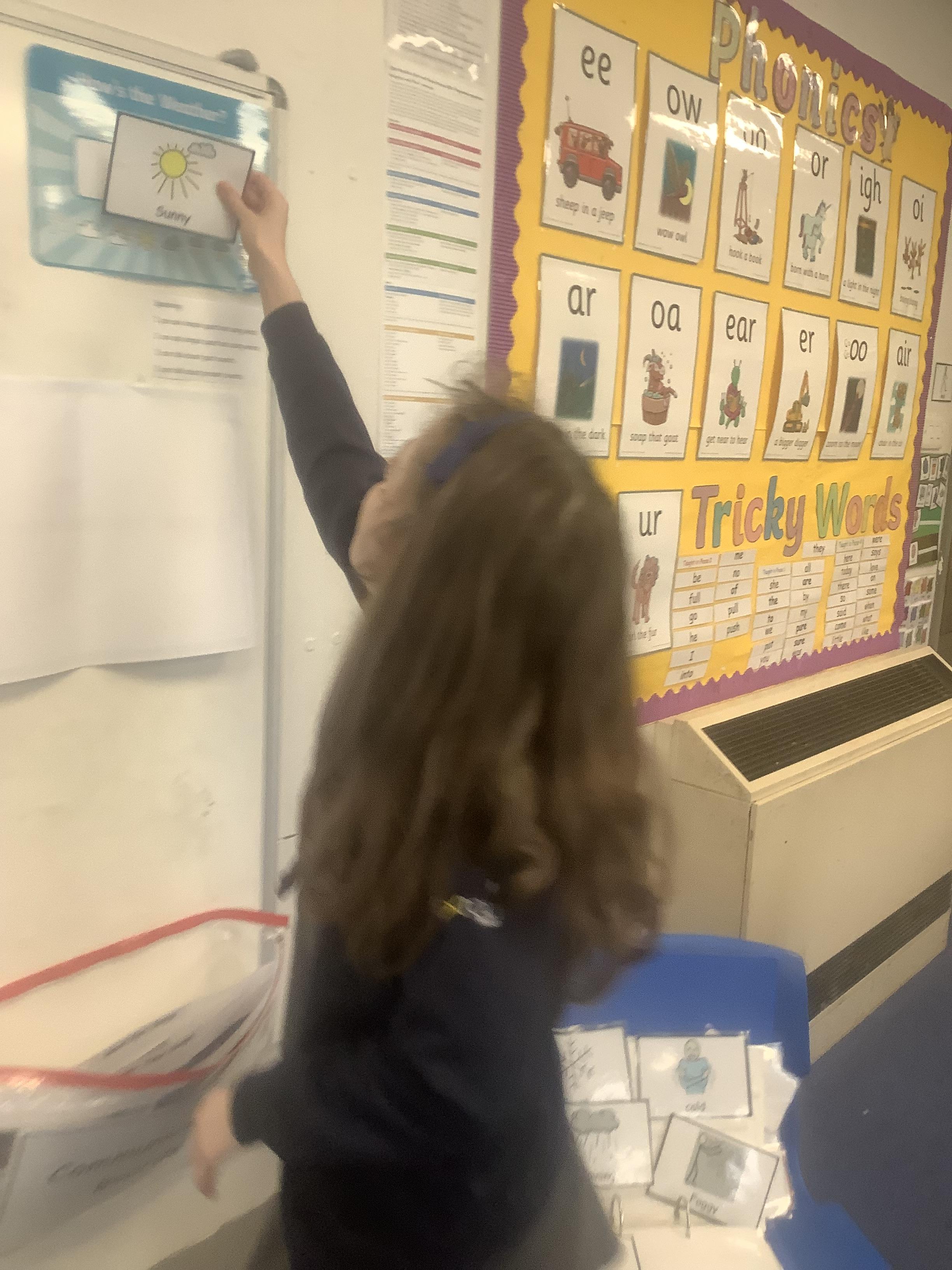 19.03.25 GEOGRAPHY: Each morning, after morning greetings, we sing the weather song. Following this, we all look out the window and discuss what the weather is like today. The children choose the correct weather symbol and place it on our weather chart.