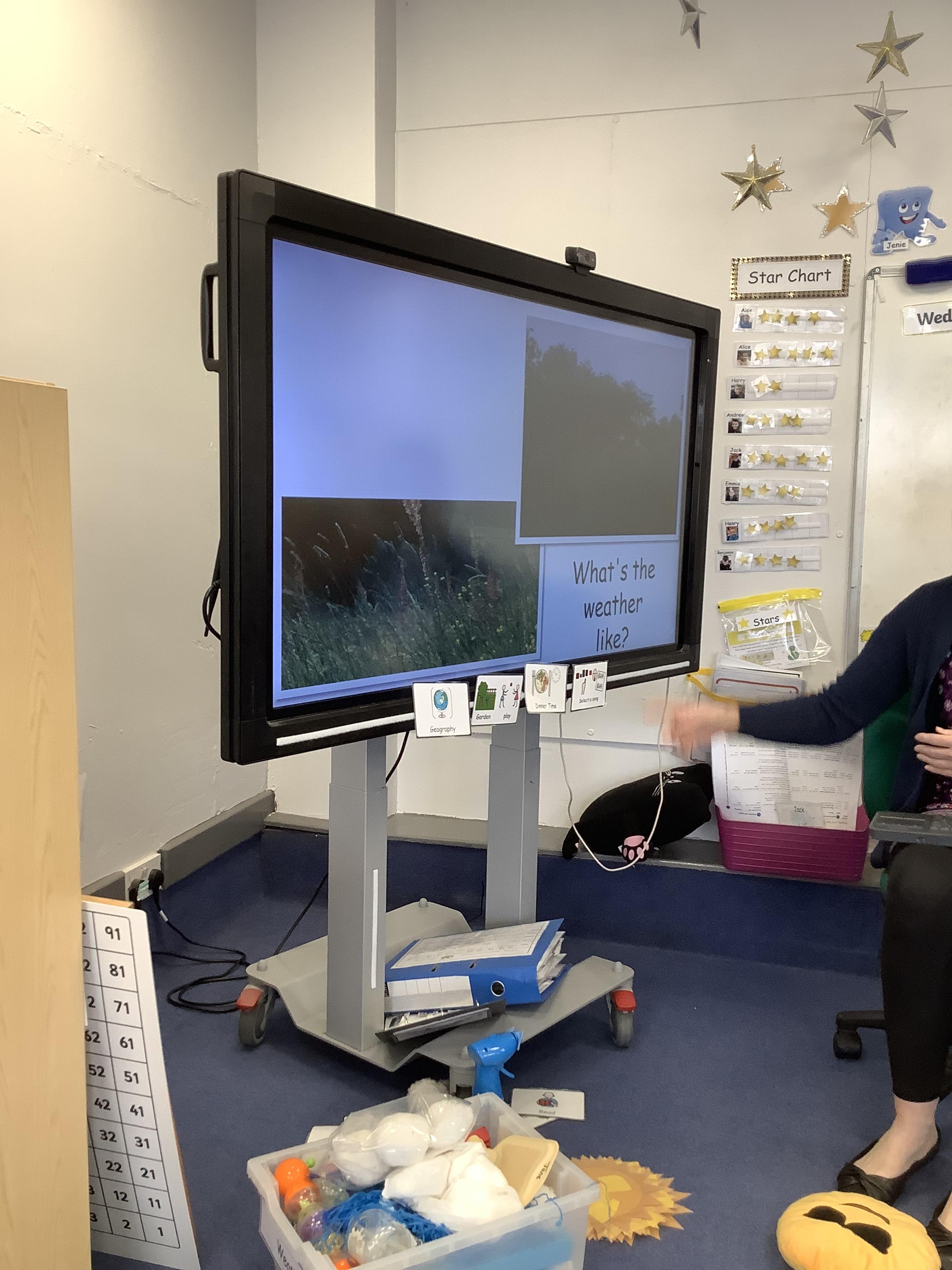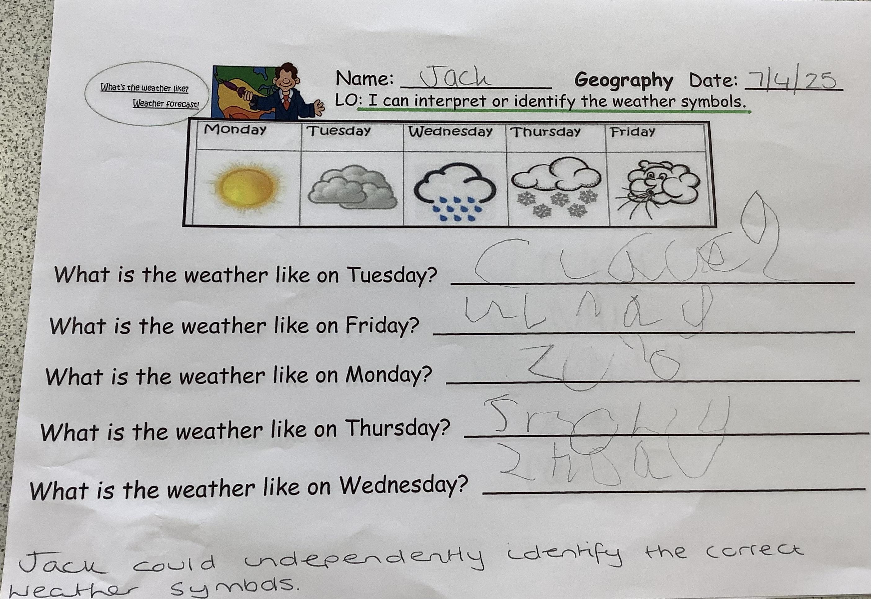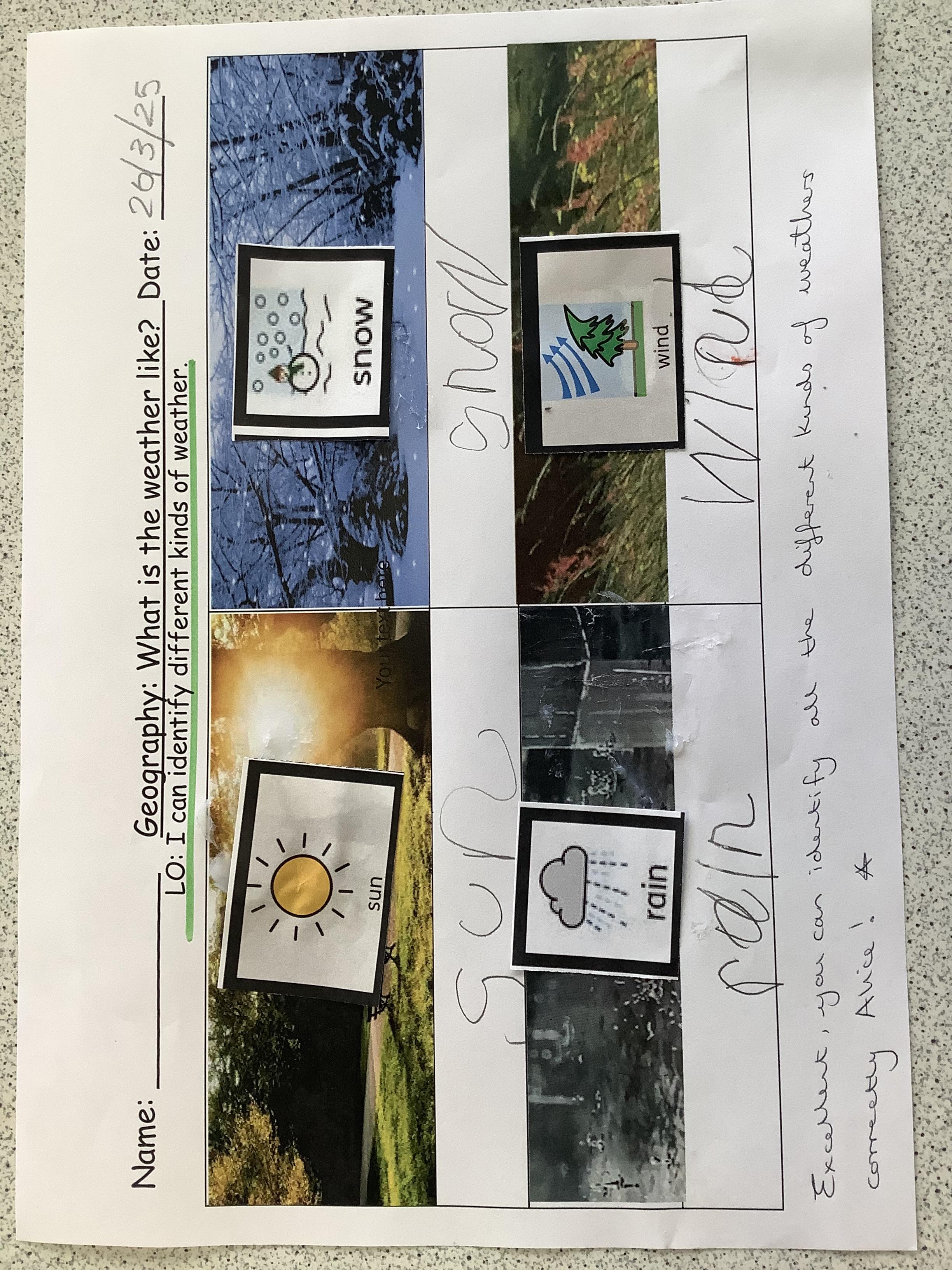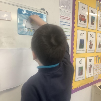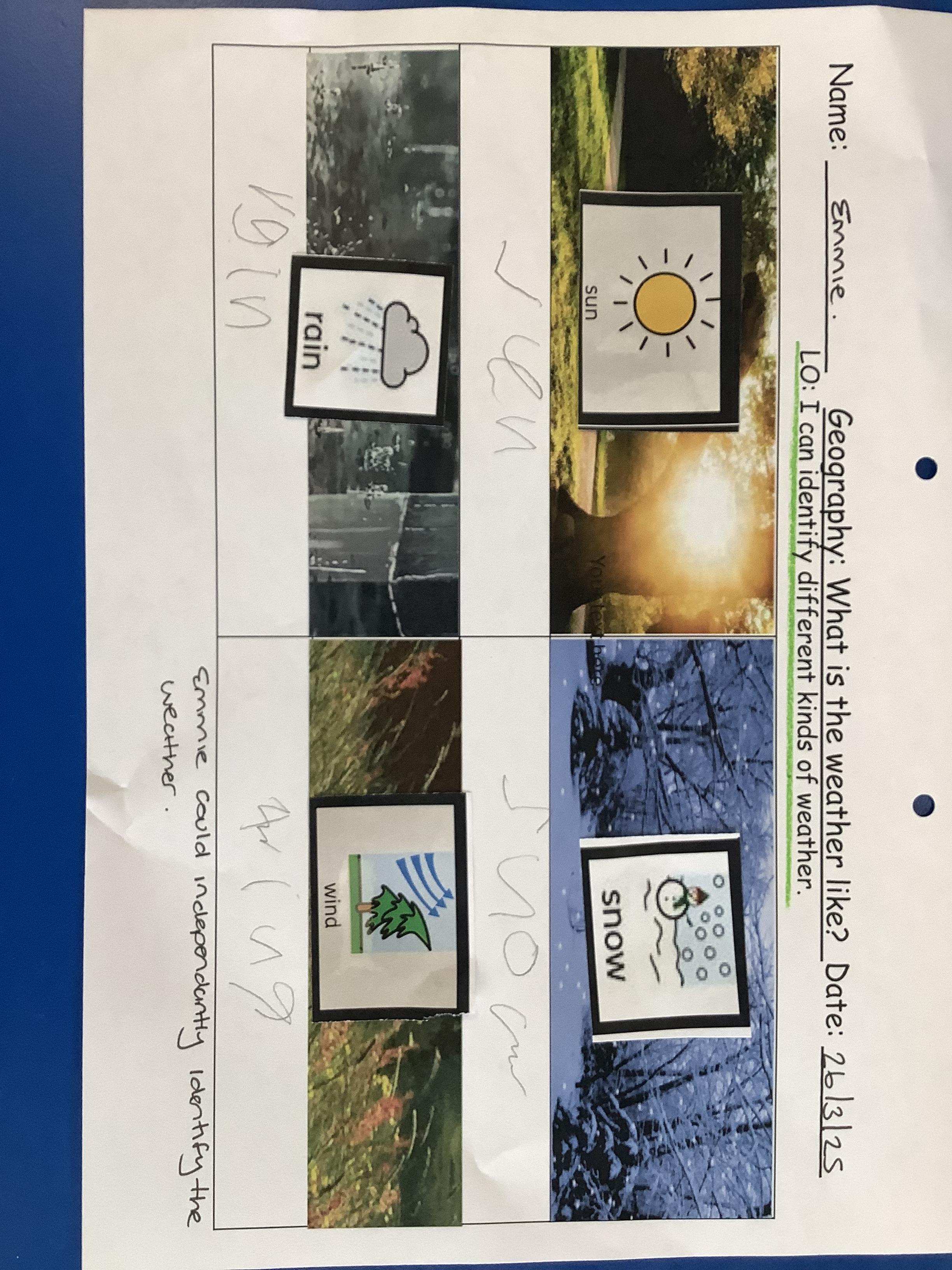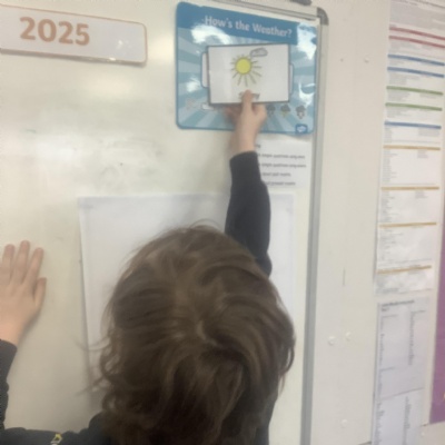 19.03.25 GEOGRAPHY: Each morning, after morning greetings, we sing the weather song. Following this, we all look out the window and discuss what the weather is like today. The children choose the correct weather symbol and place it on our weather chart.