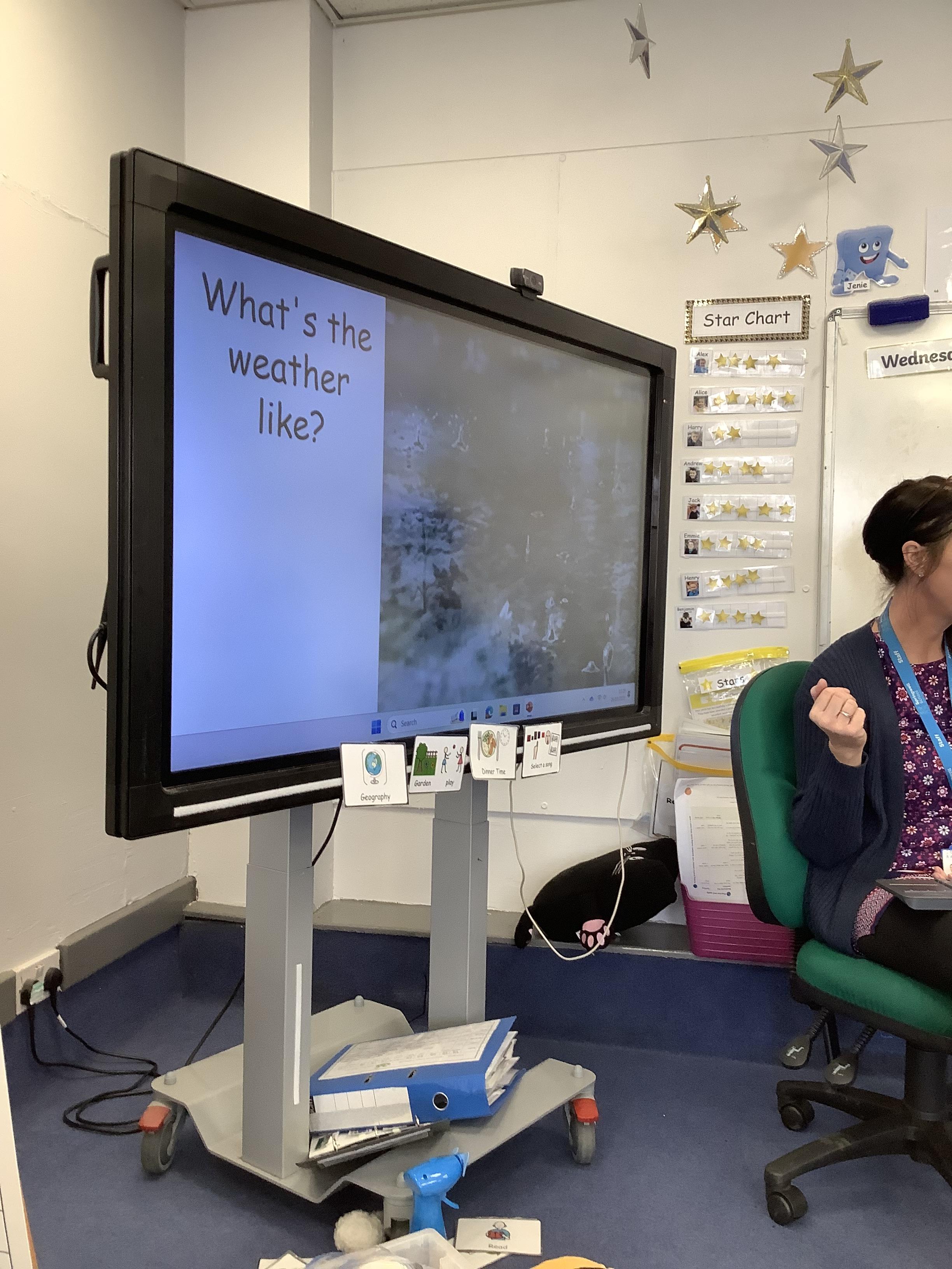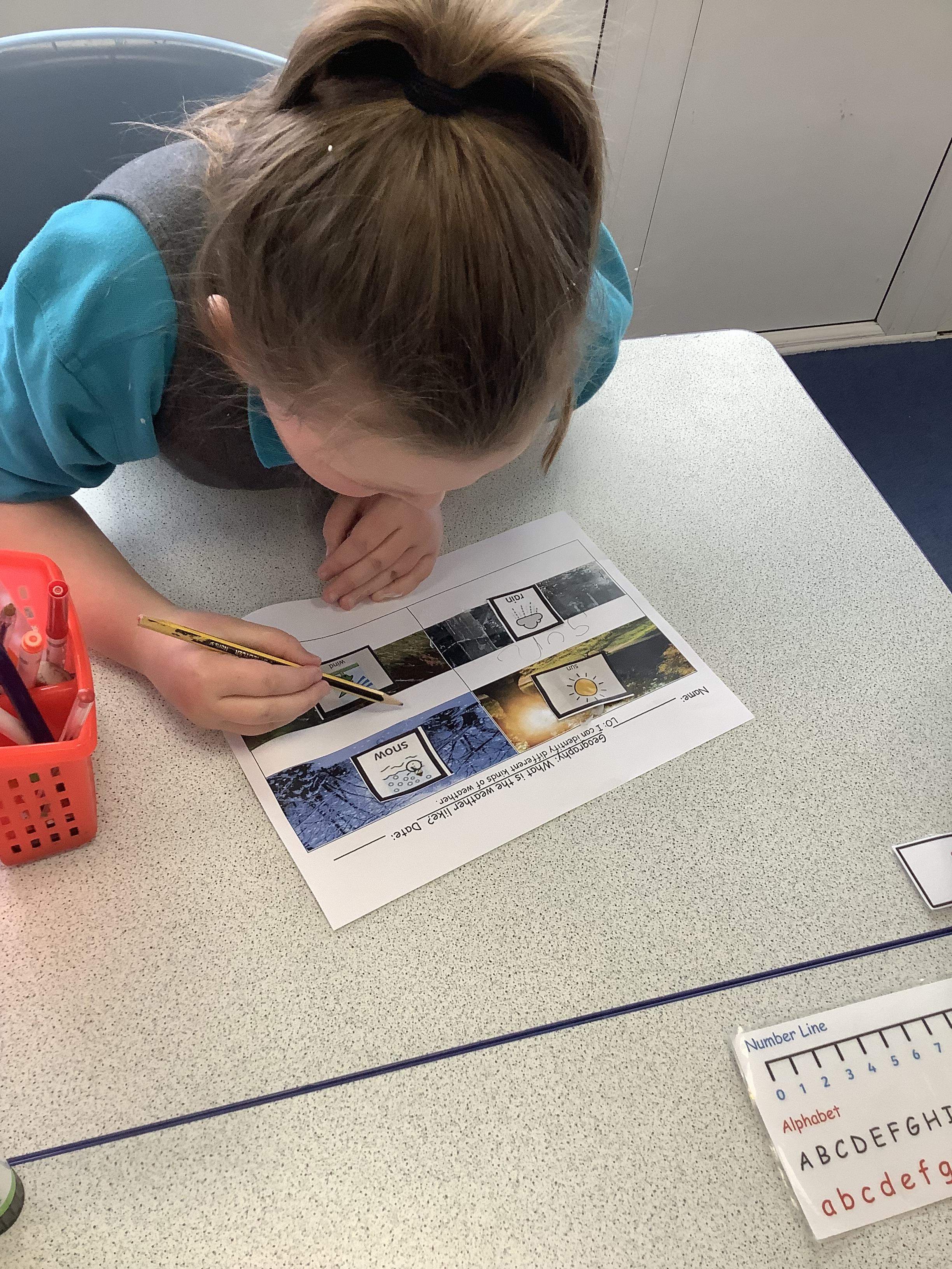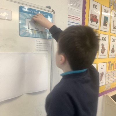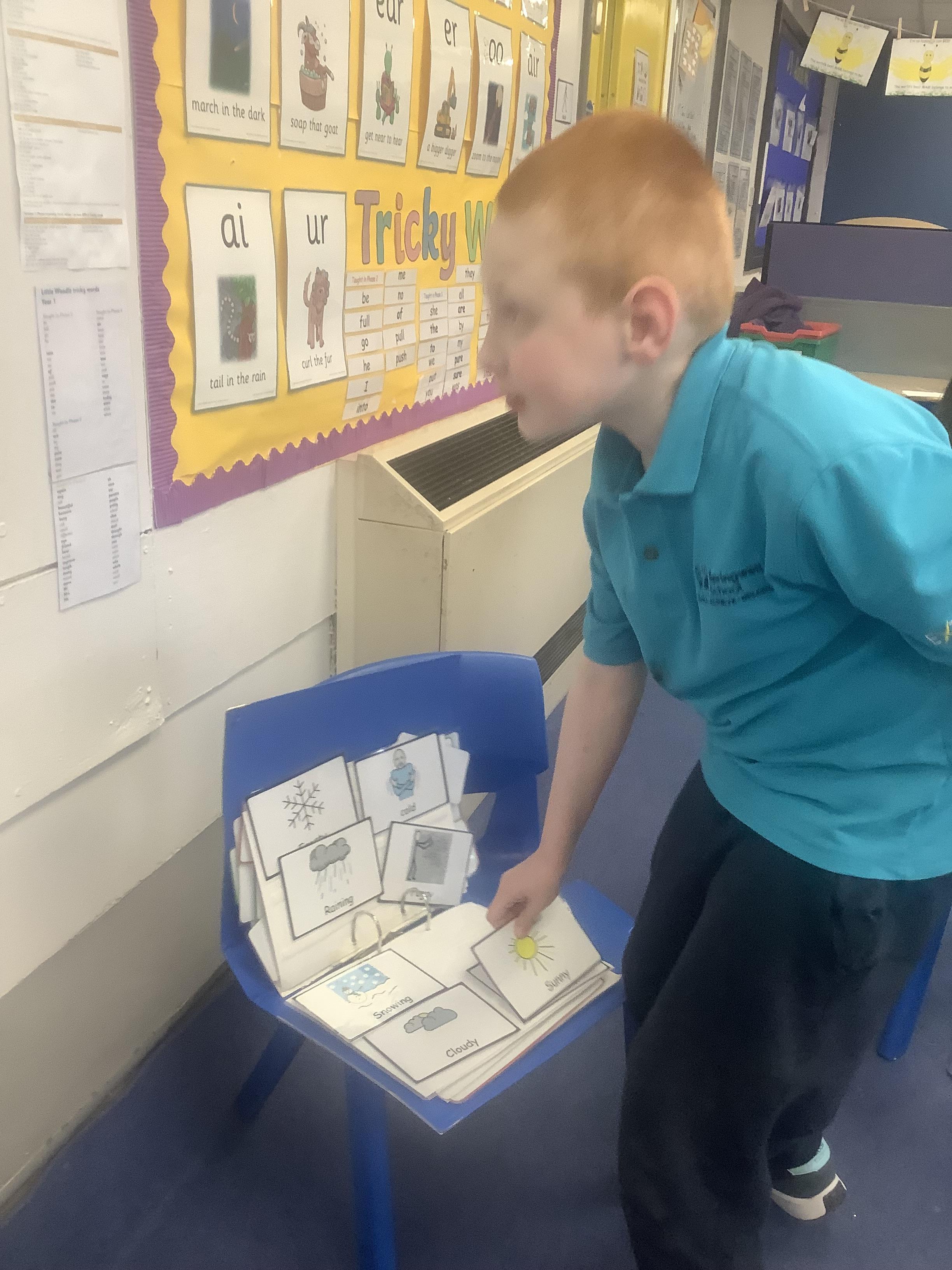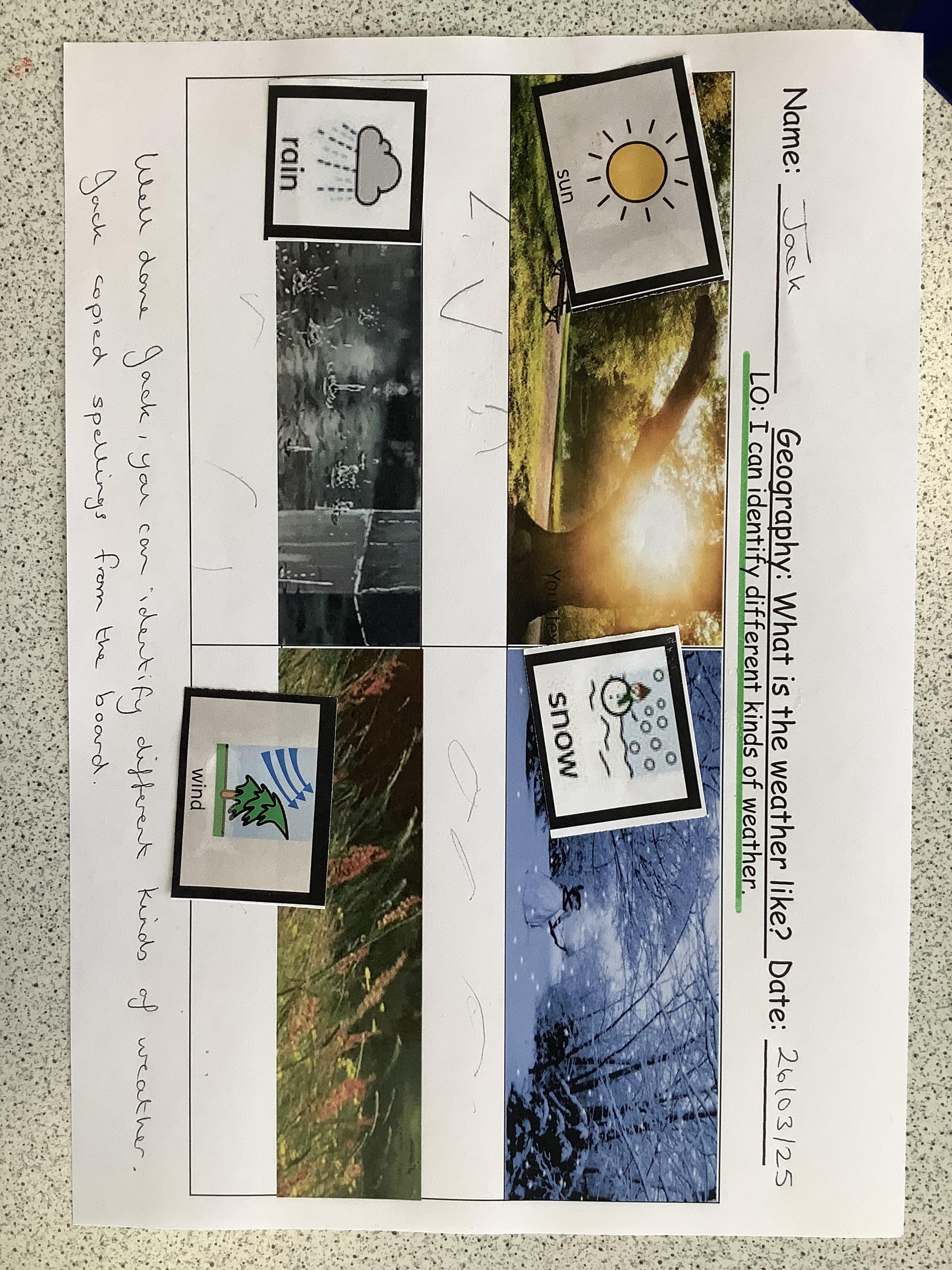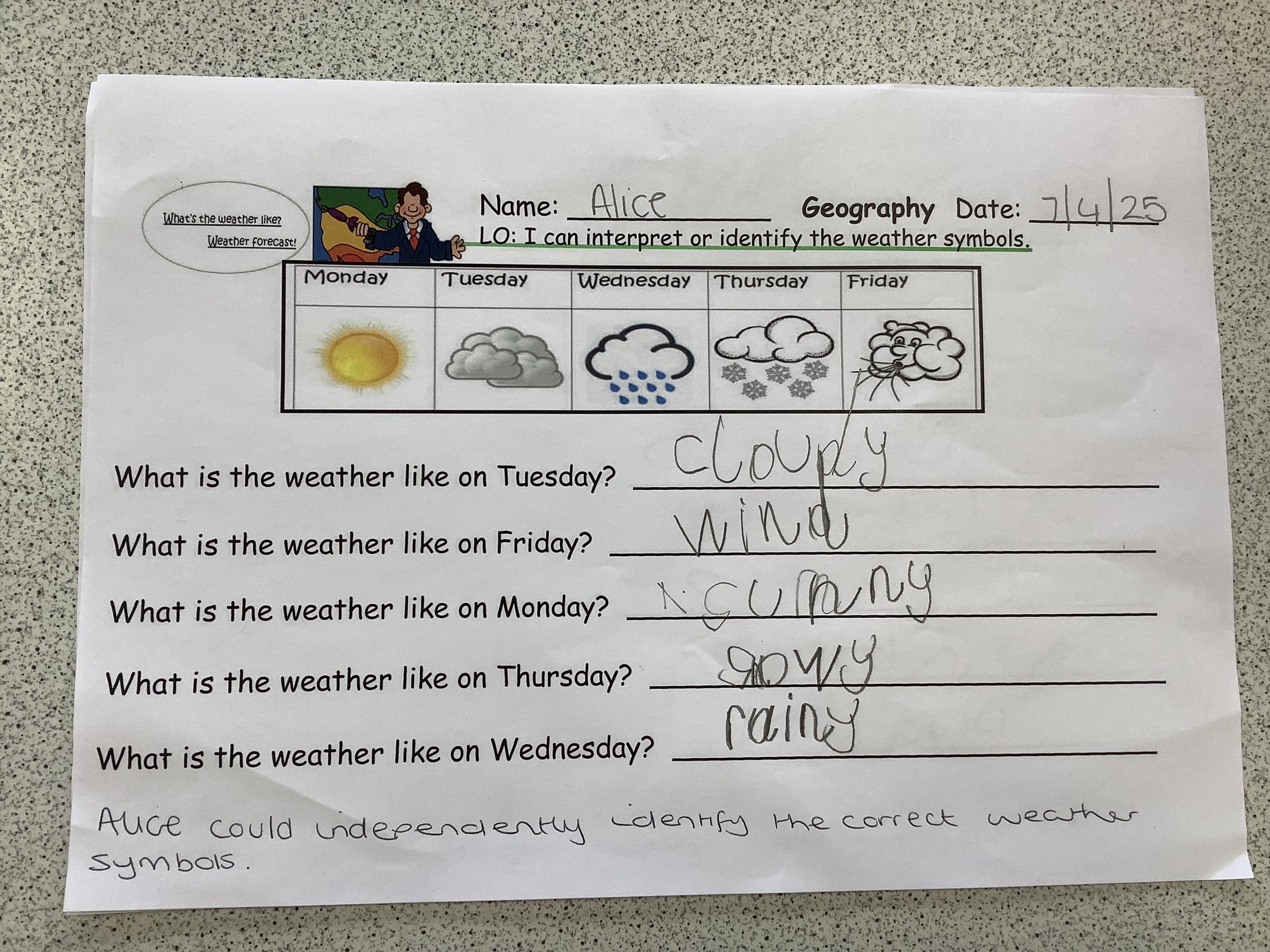 19.03.25 GEOGRAPHY: Each morning, after morning greetings, we sing the weather song. Following this, we all look out the window and discuss what the weather is like today. The children choose the correct weather symbol and place it on our weather chart.
