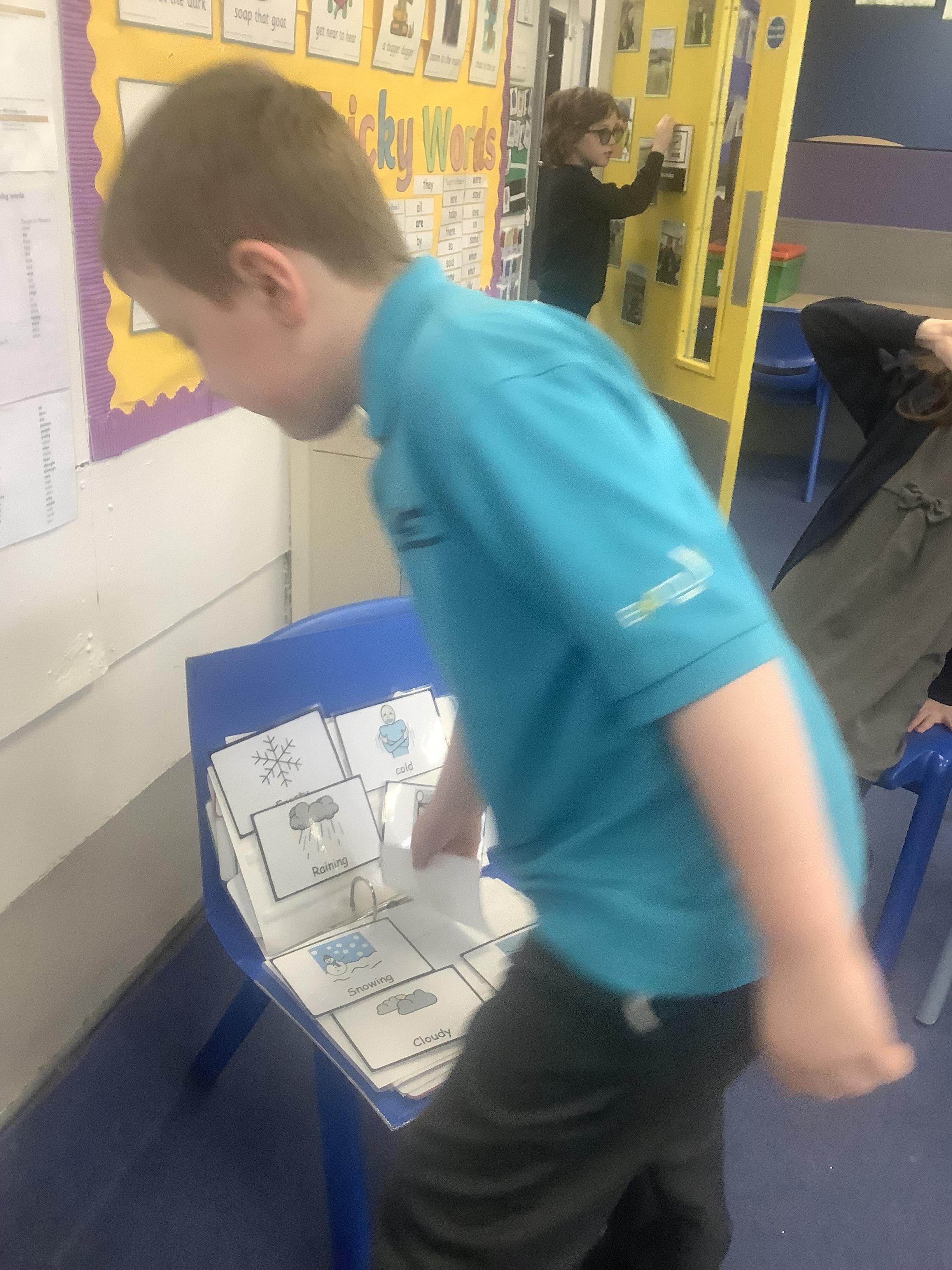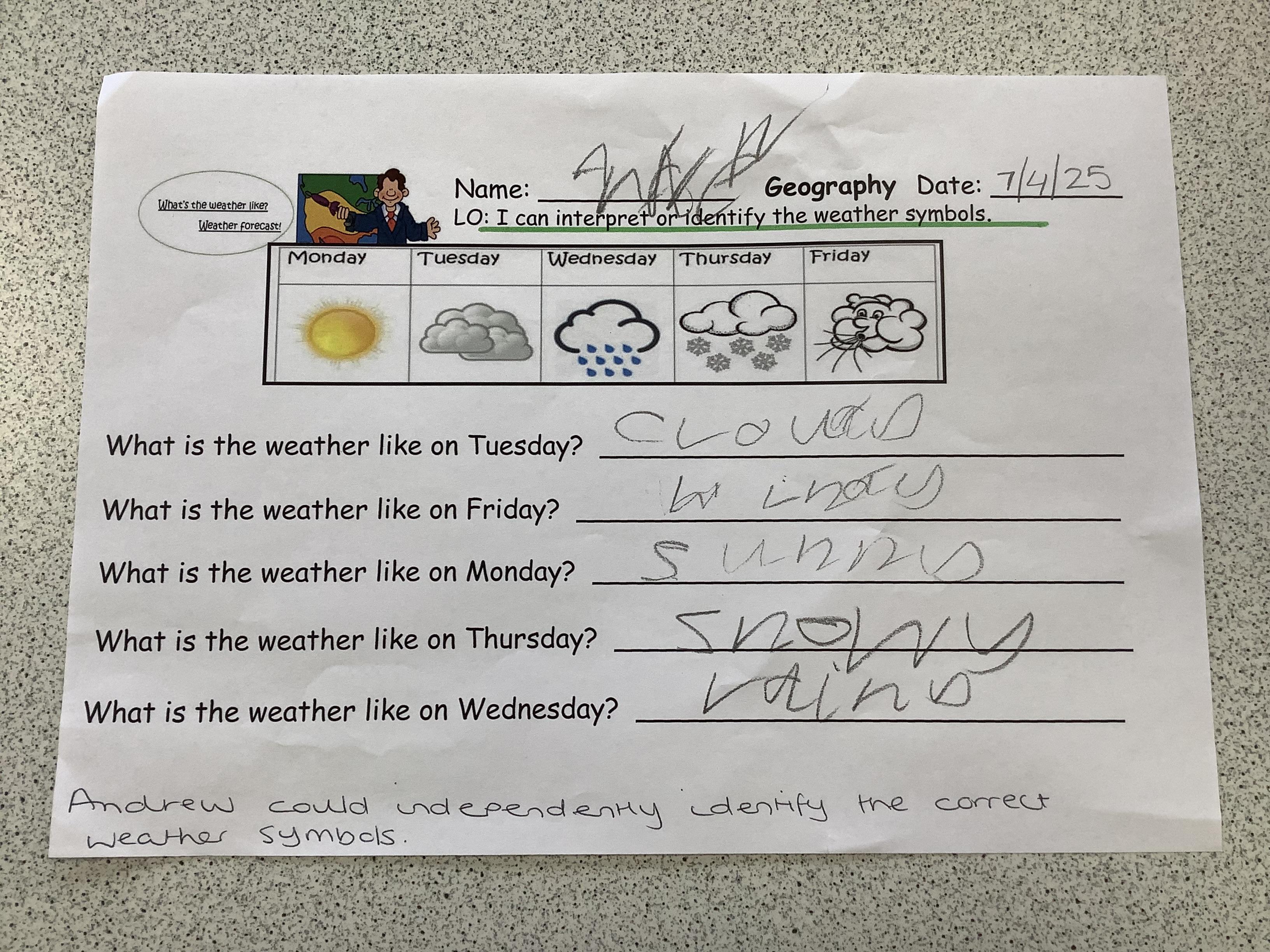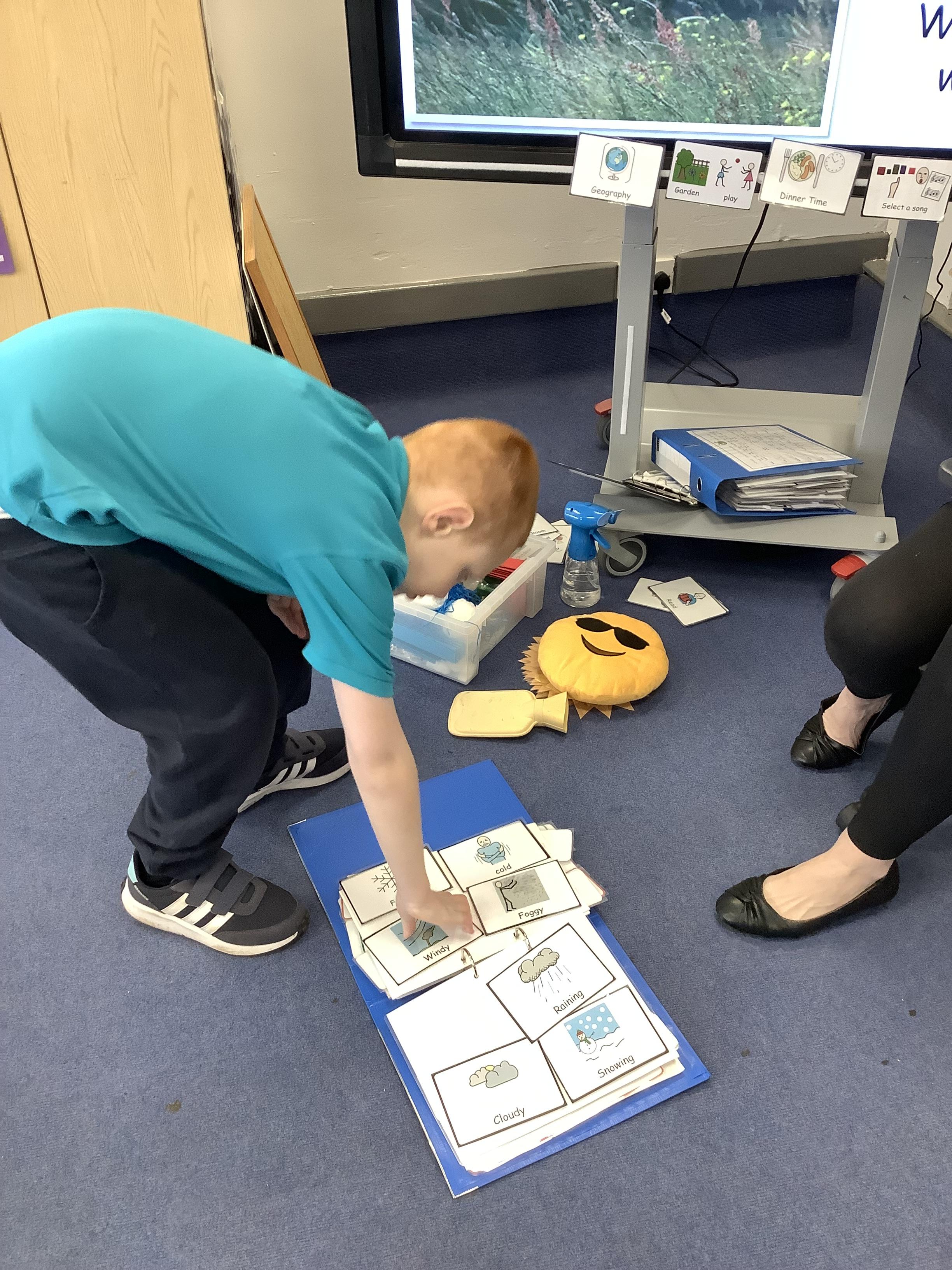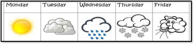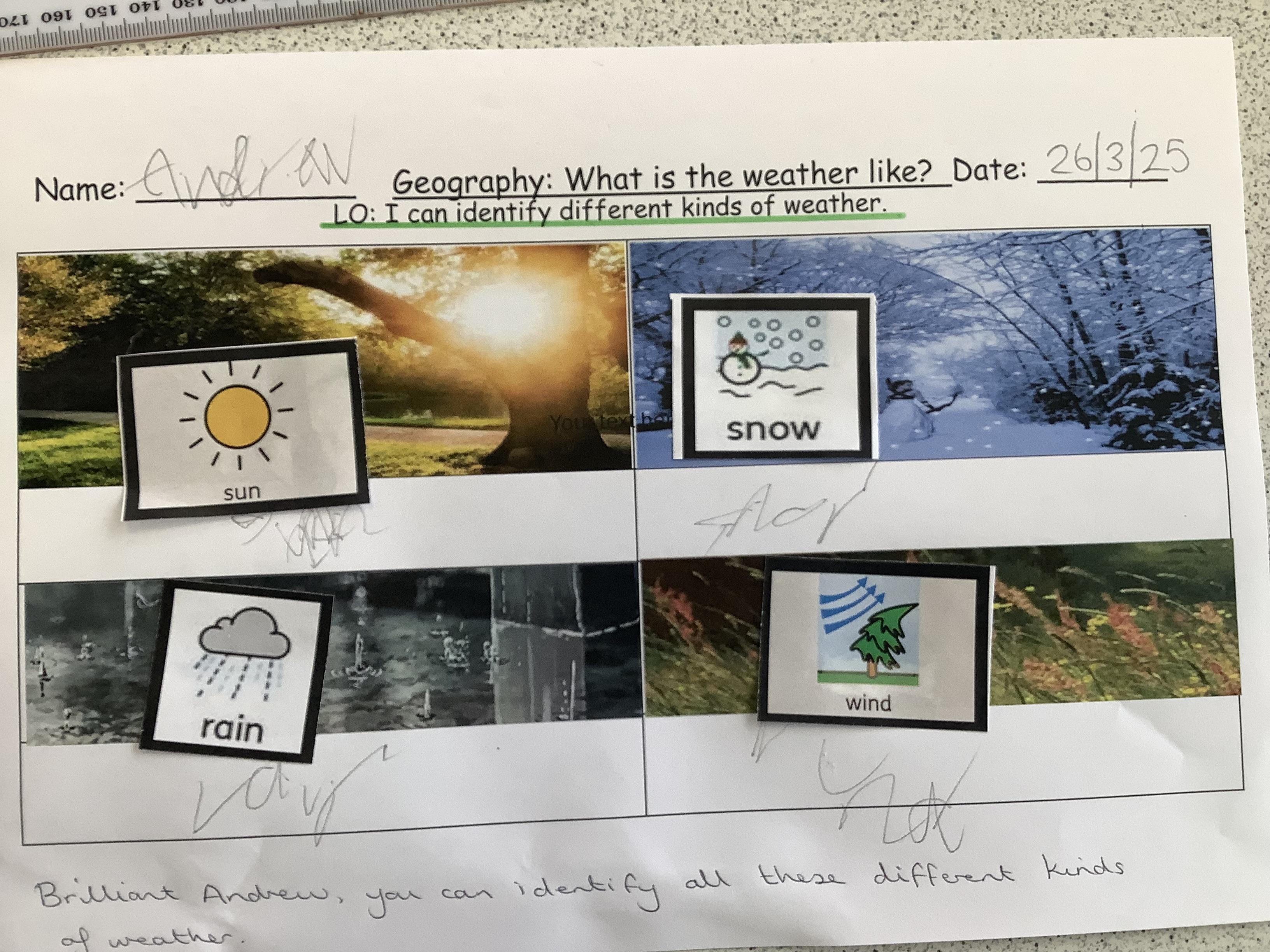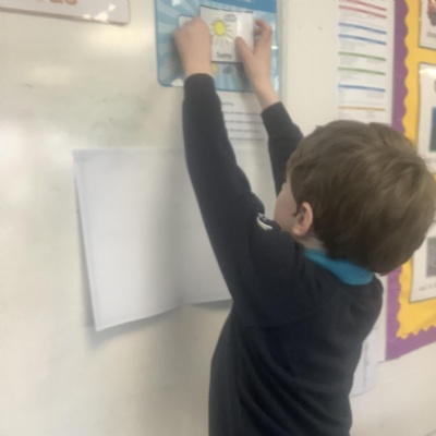 19.03.25 GEOGRAPHY: Each morning, after morning greetings, we sing the weather song. Following this, we all look out the window and discuss what the weather is like today. The children choose the correct weather symbol and place it on our weather chart.