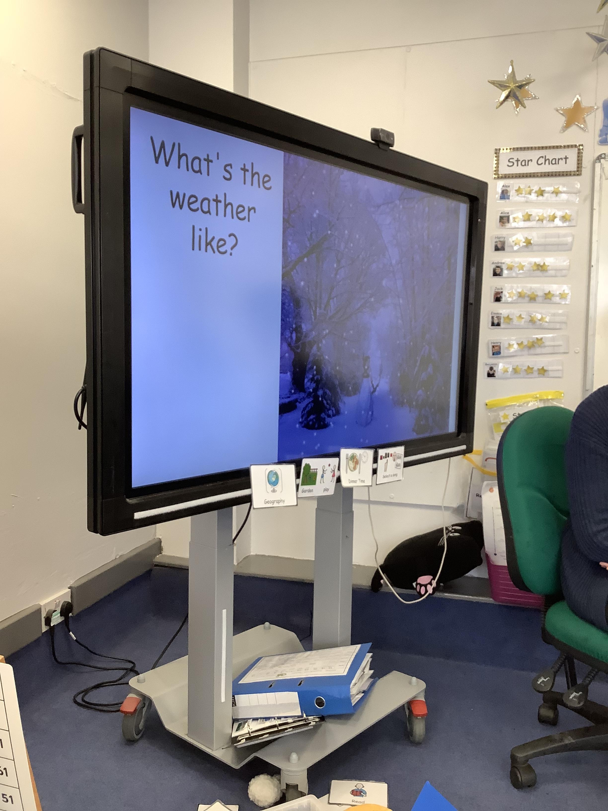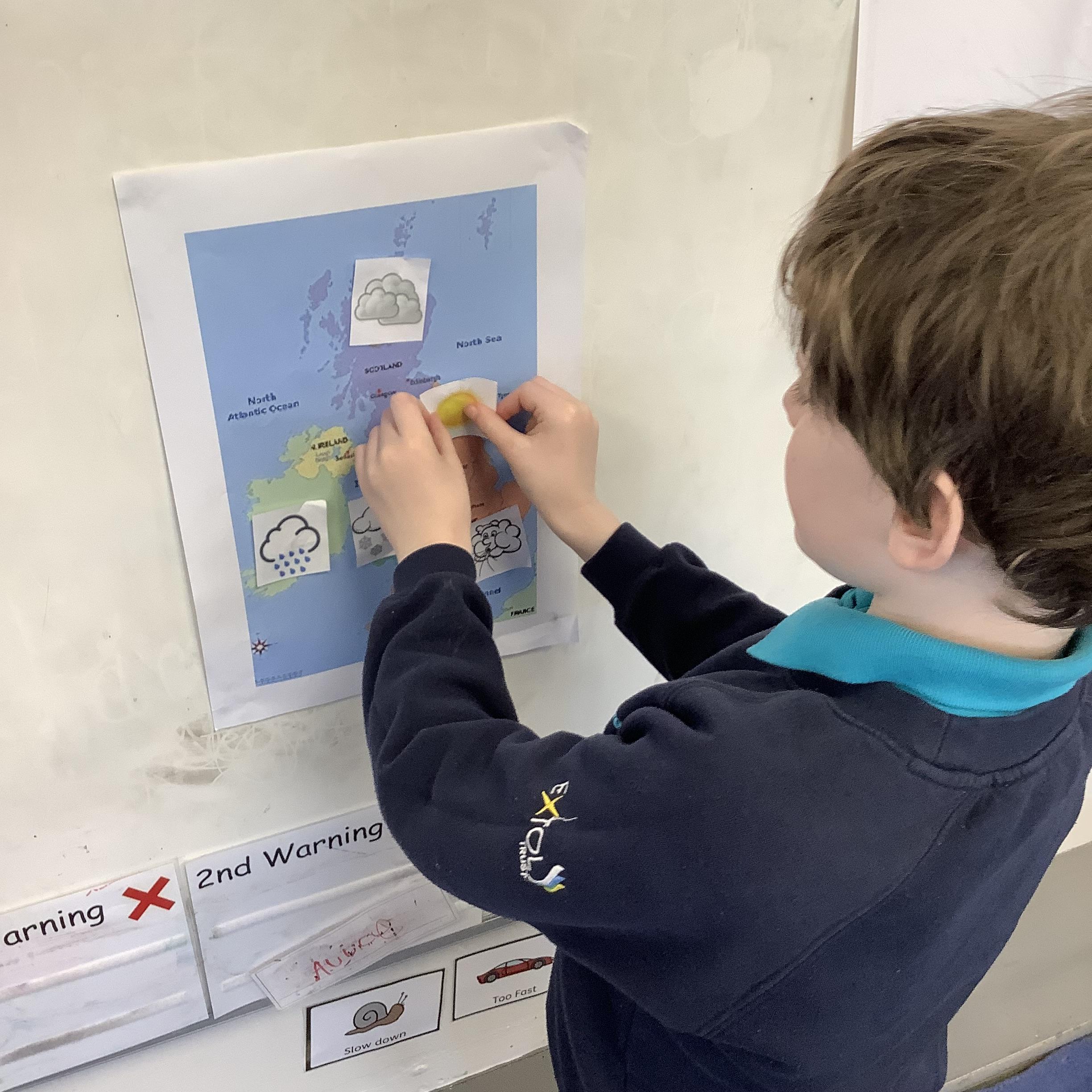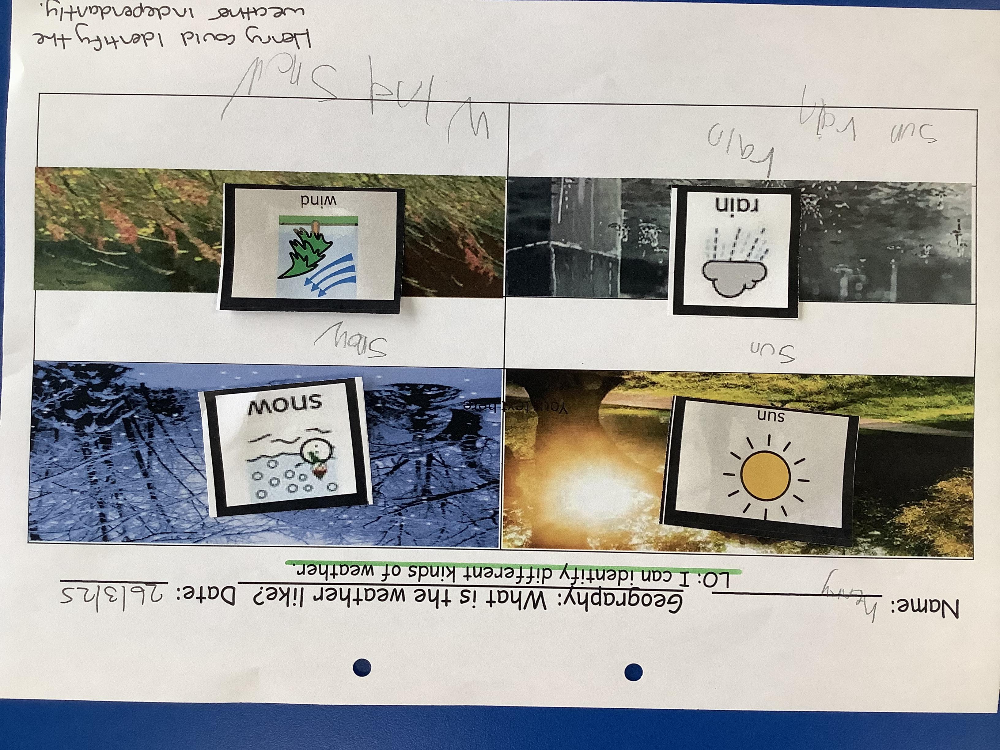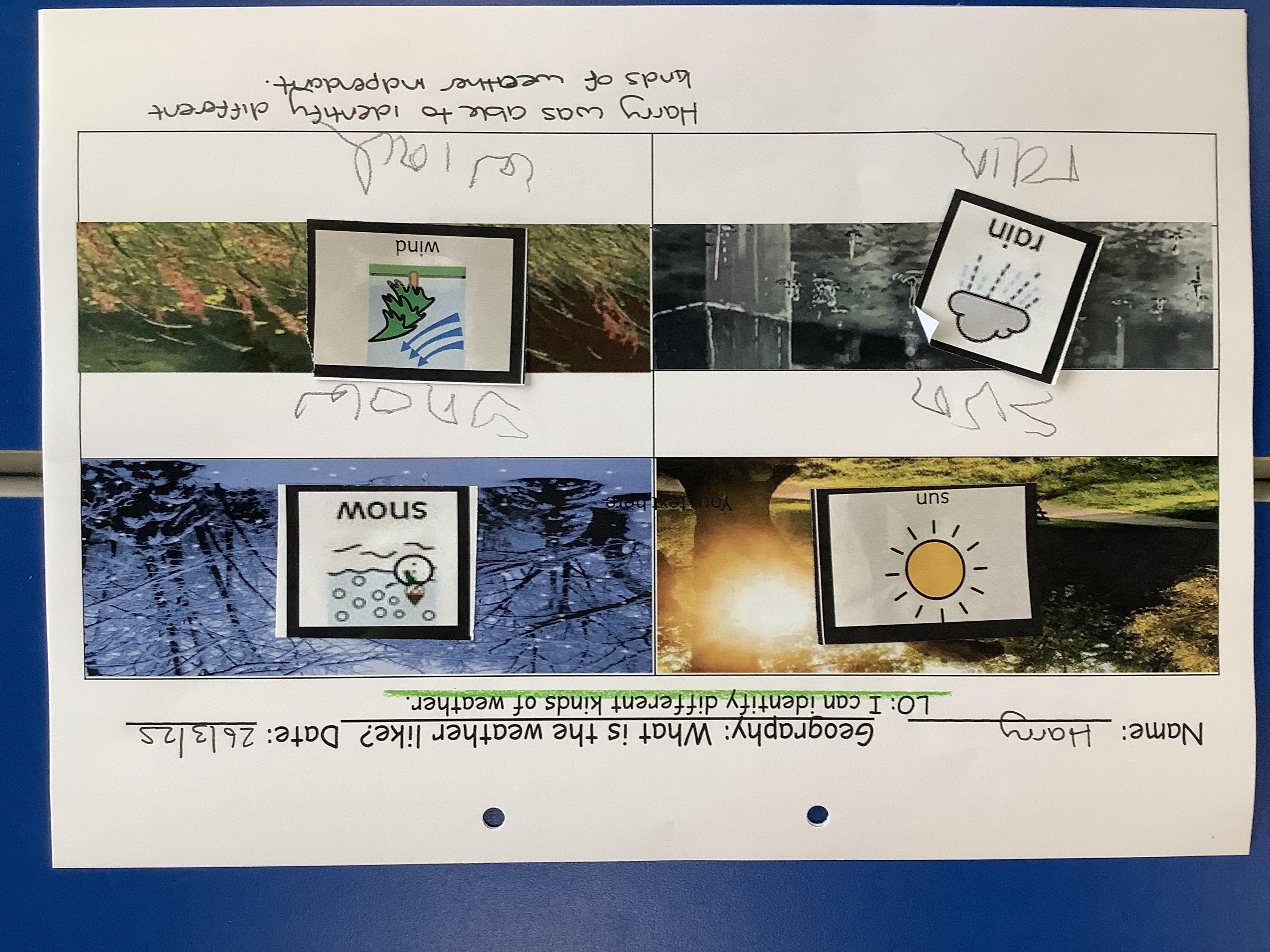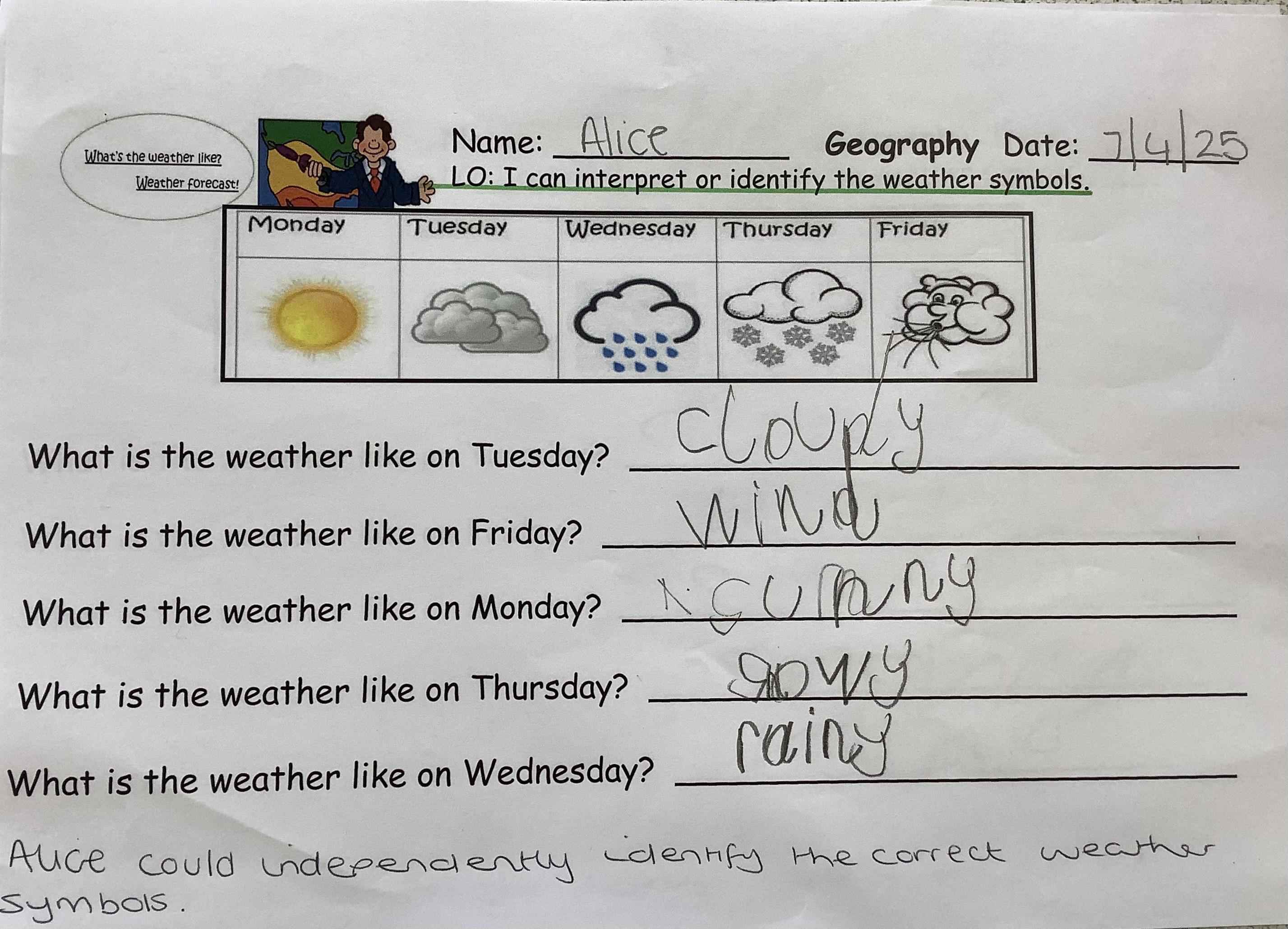 19.03.25 GEOGRAPHY: Each morning, after morning greetings, we sing the weather song. Following this, we all look out the window and discuss what the weather is like today. The children choose the correct weather symbol and place it on our weather chart.
