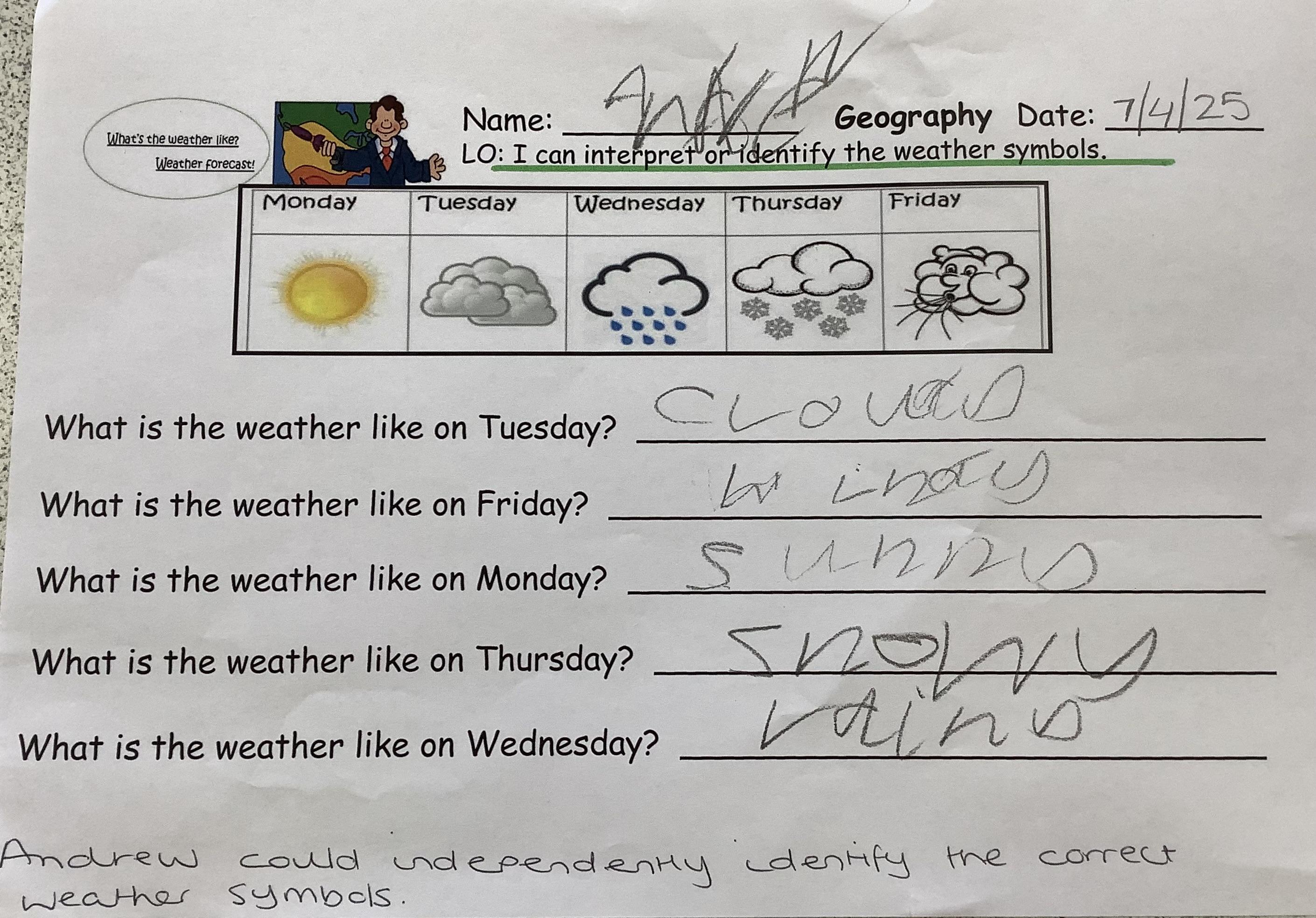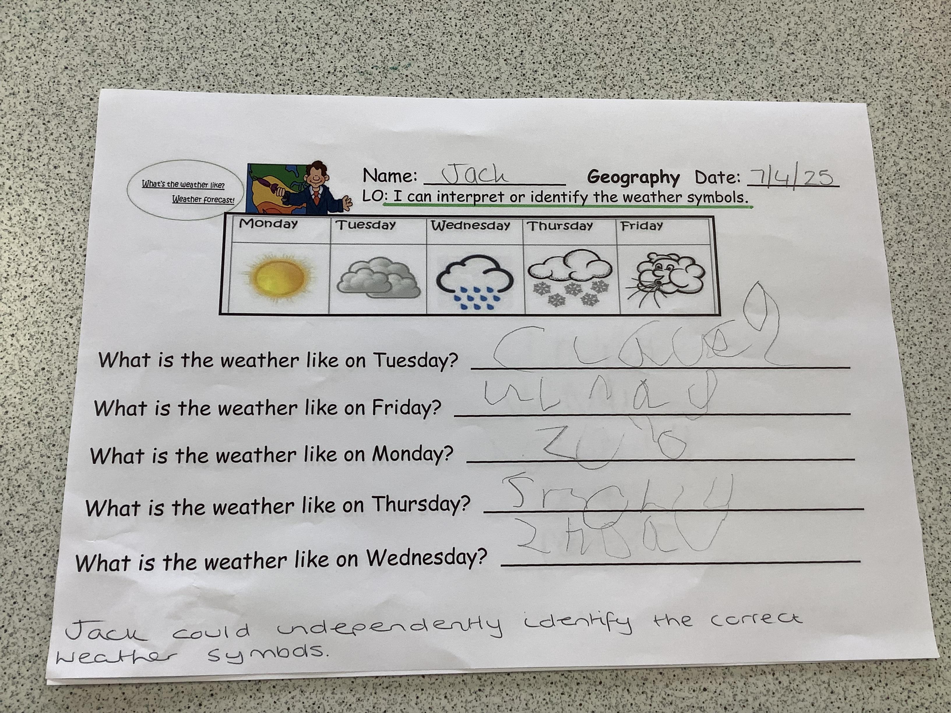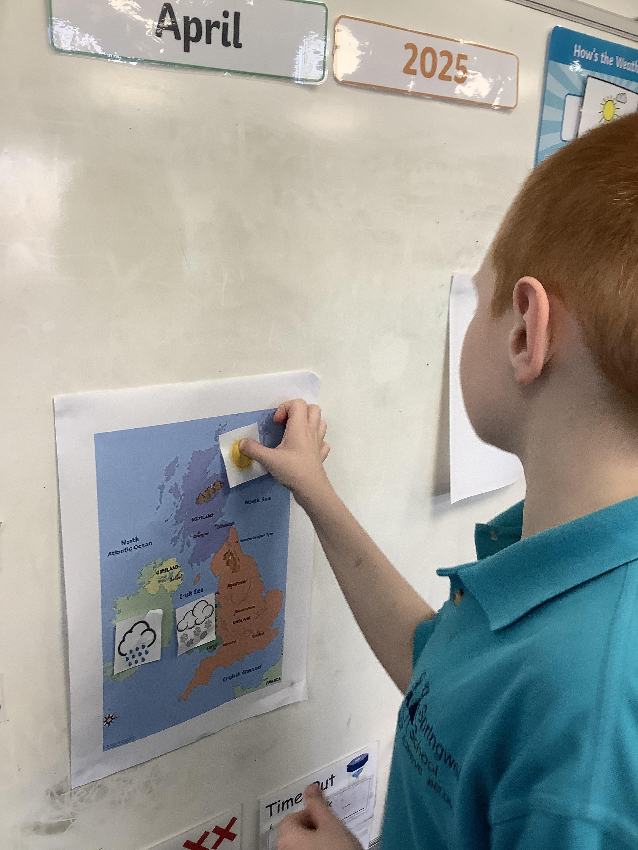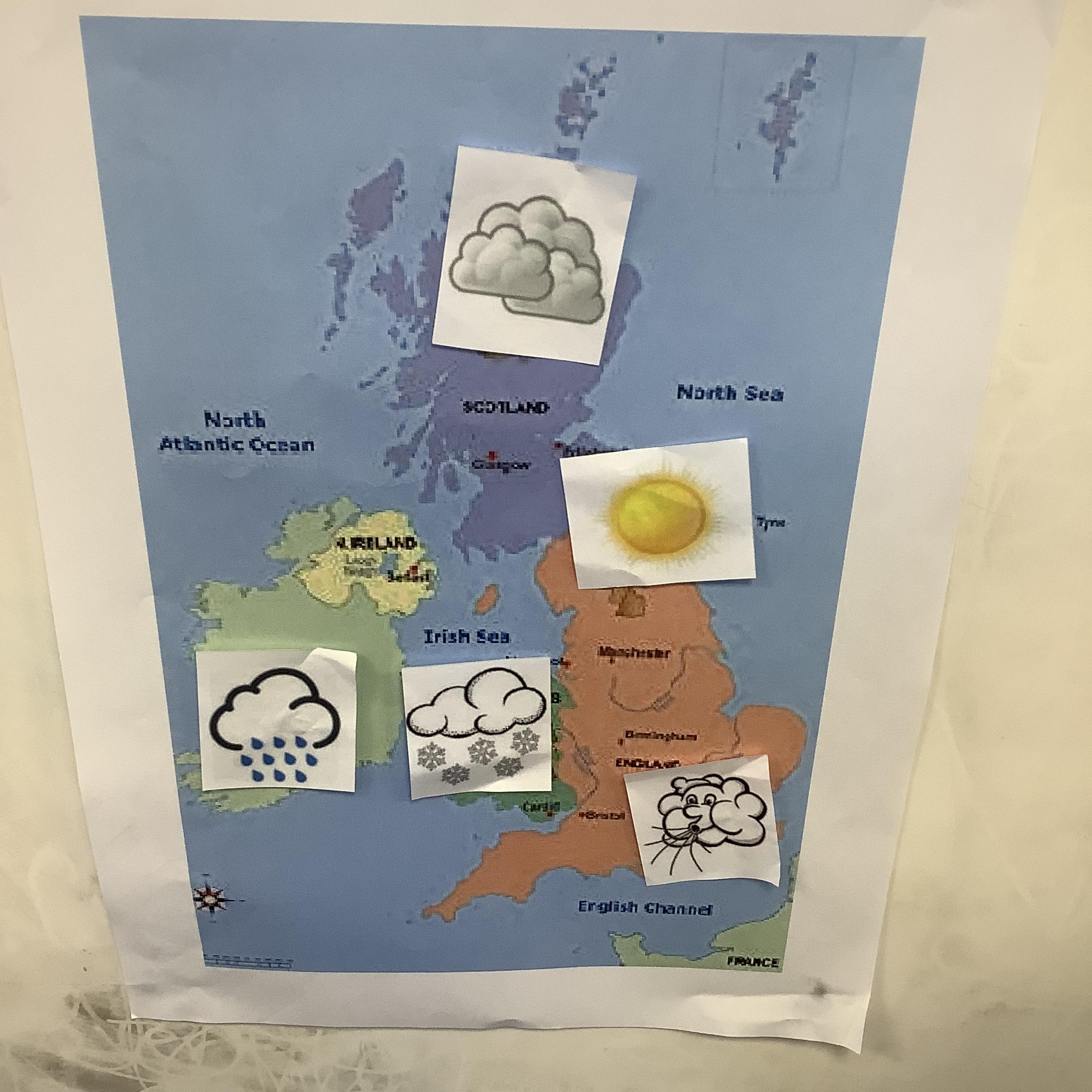 07.04.25 GEOGRAPHY: WEATHER FORECASTS We have been watching a weather forecast on the IWB. We identified all the different weather symbols. We then created our own weather forecast on a UK map. Then the children looked closely at a weekly weather map and together we identified what the weather was going to be like each day.