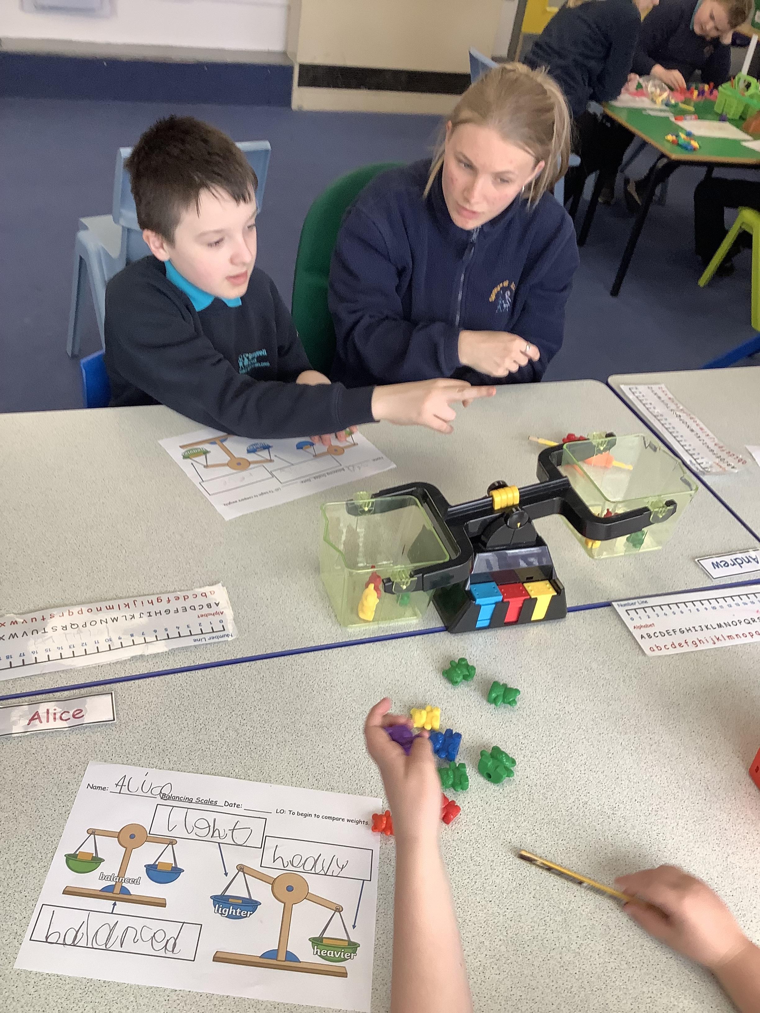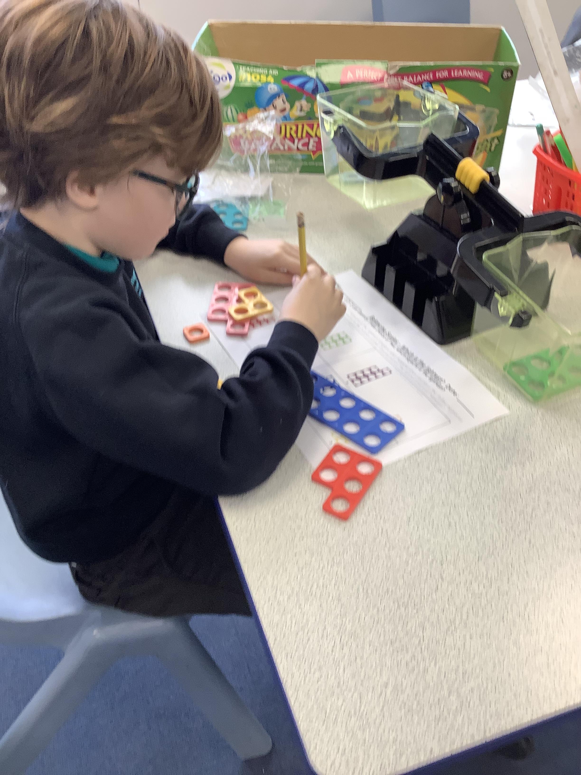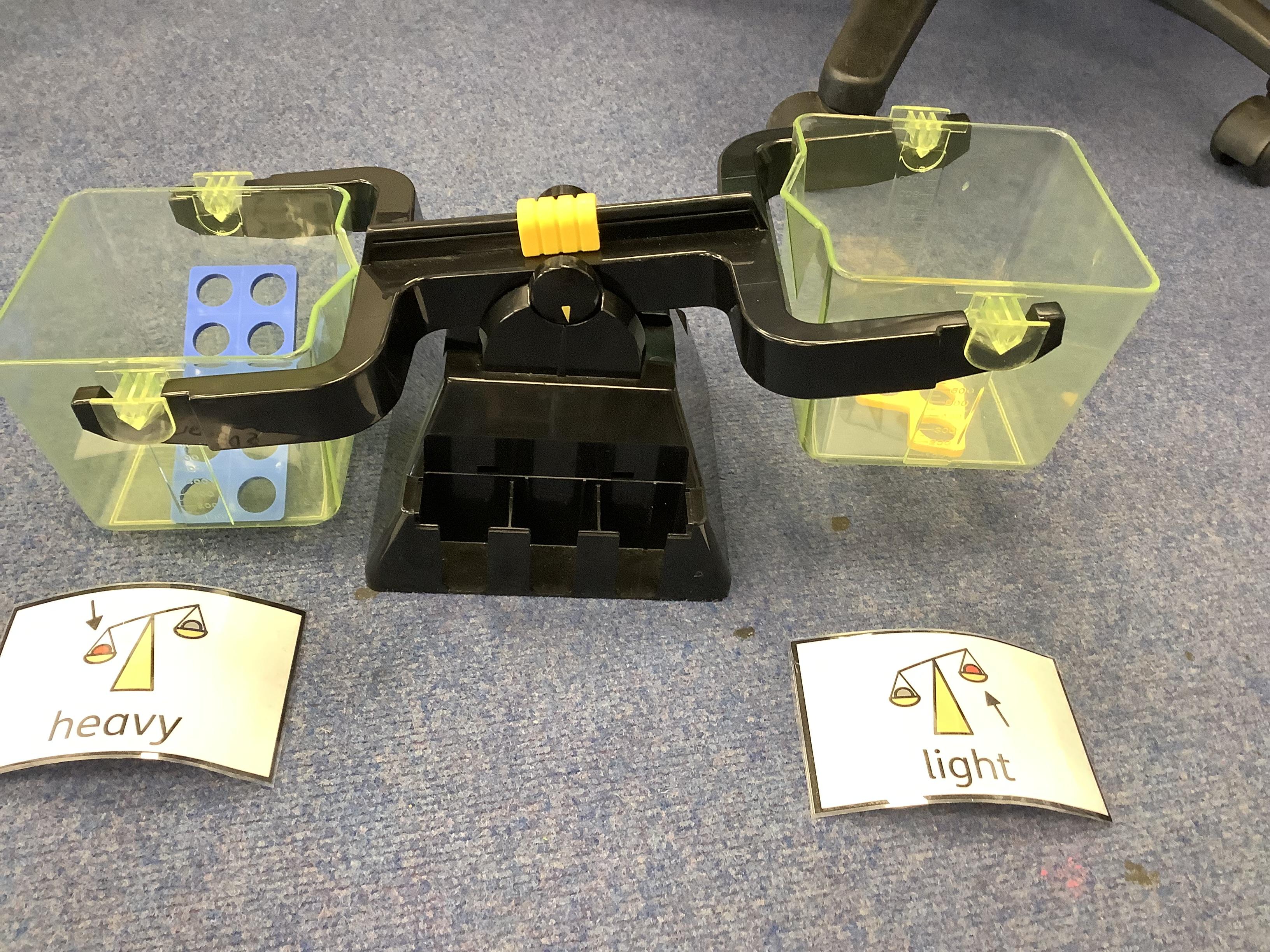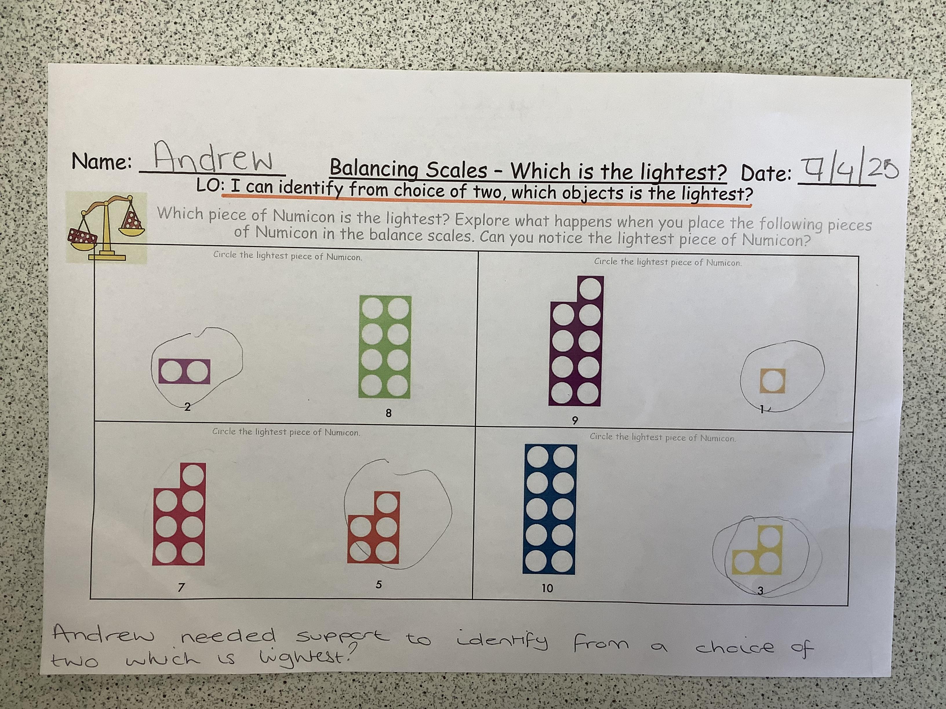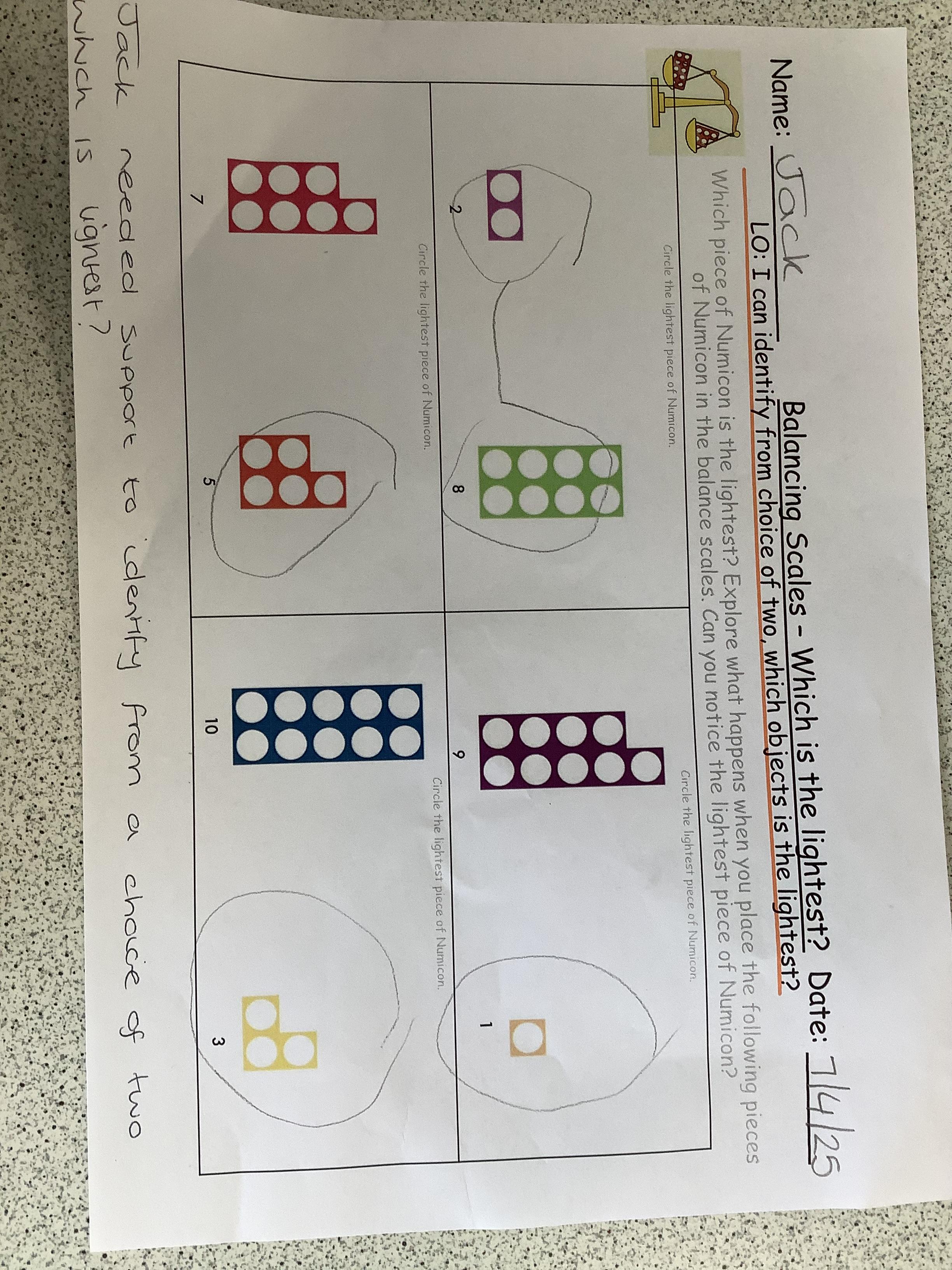 07.04.25 MATHS: MASS The children have been using the balance scales to identify from choice of two, which piece of numicon is the heaviest and which piece is the lighest.