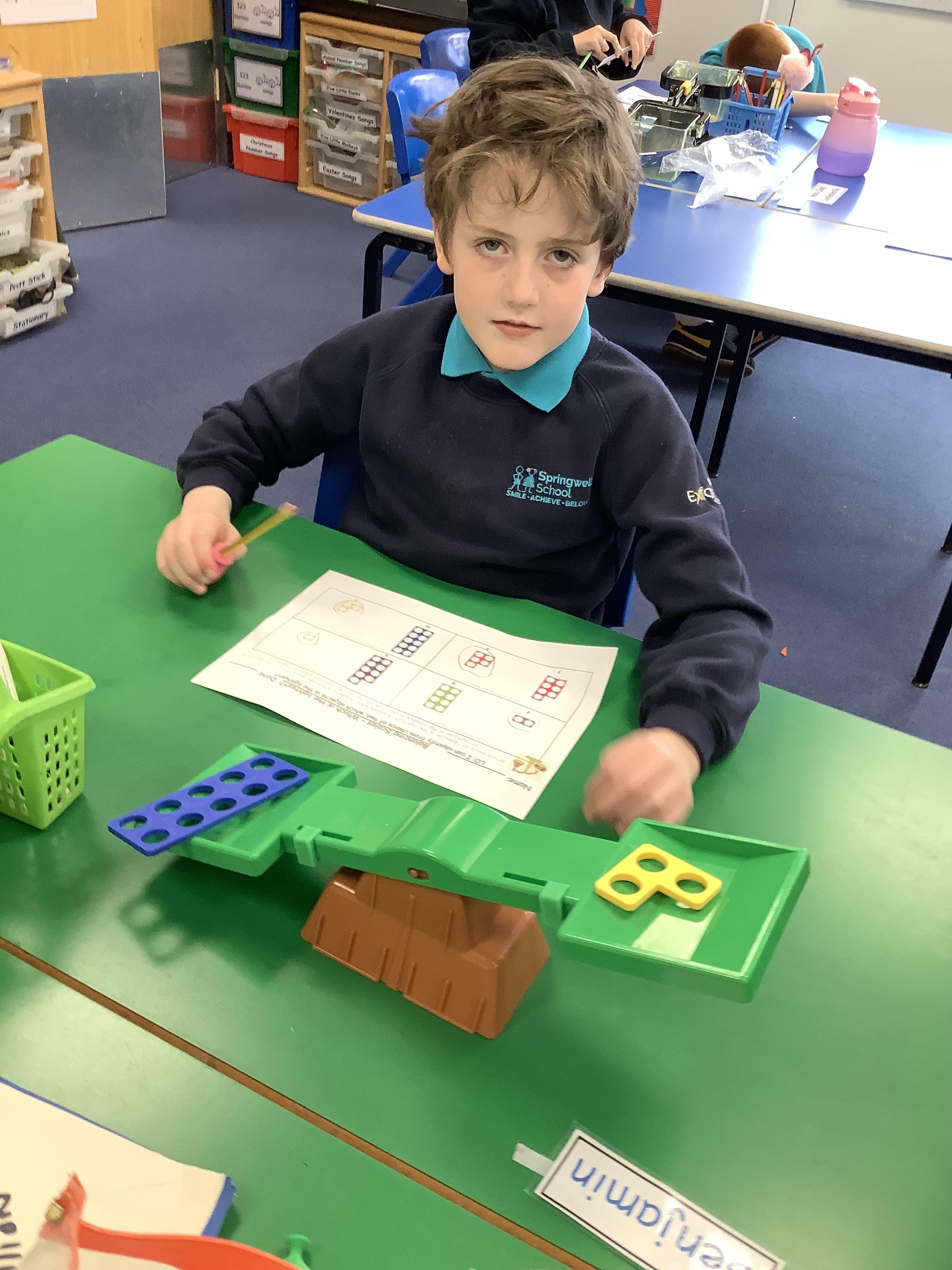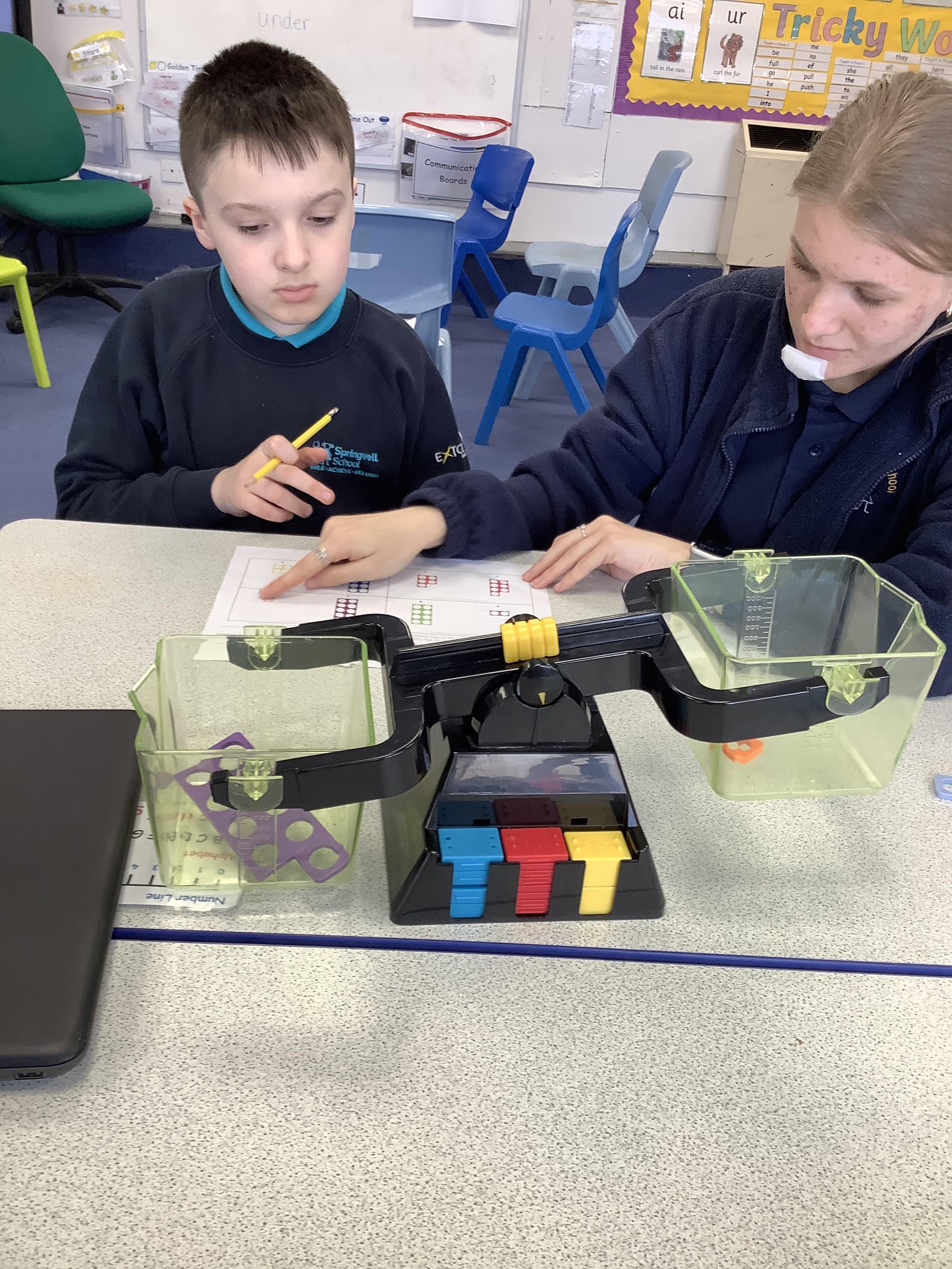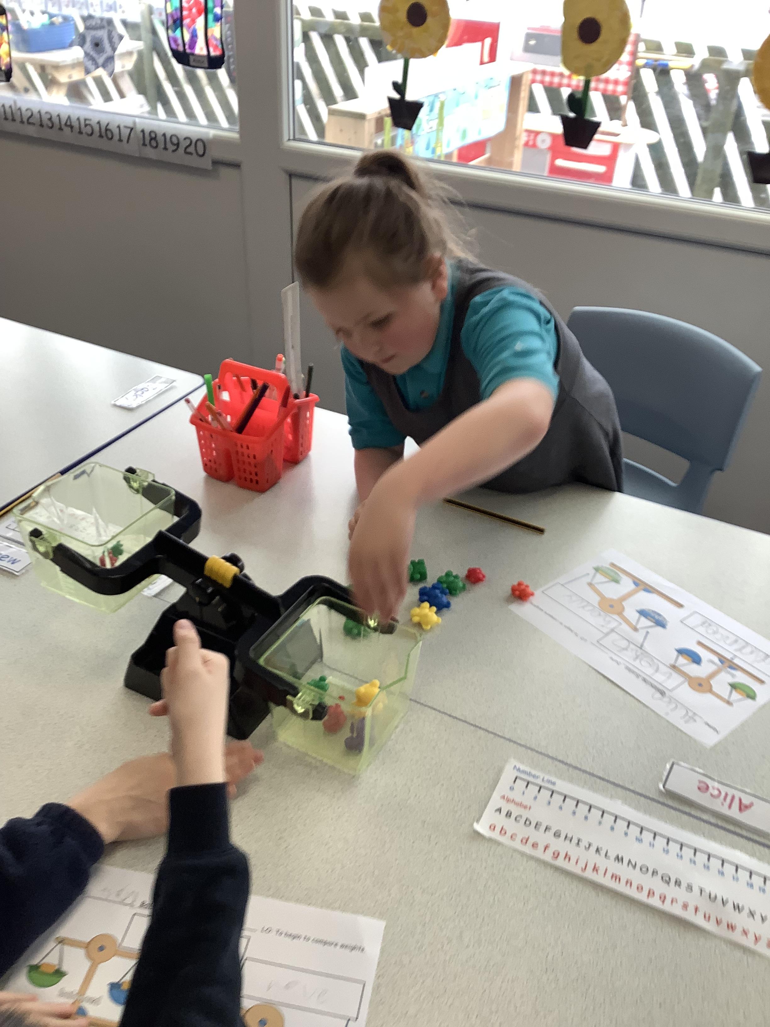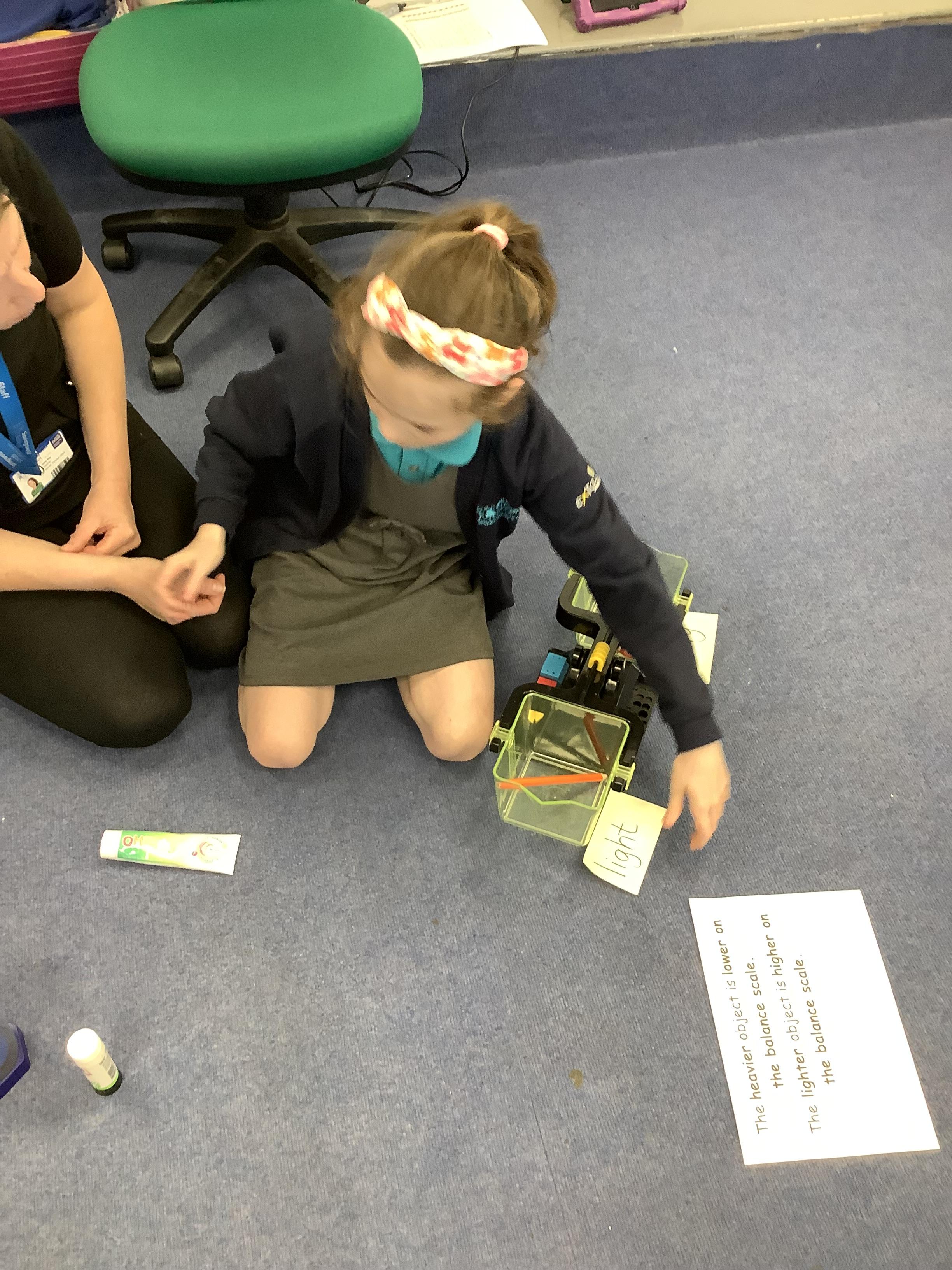 07.04.25 MATHS: MASS The children have been using the balance scales to identify from choice of two, which piece of numicon is the heaviest and which piece is the lighest.