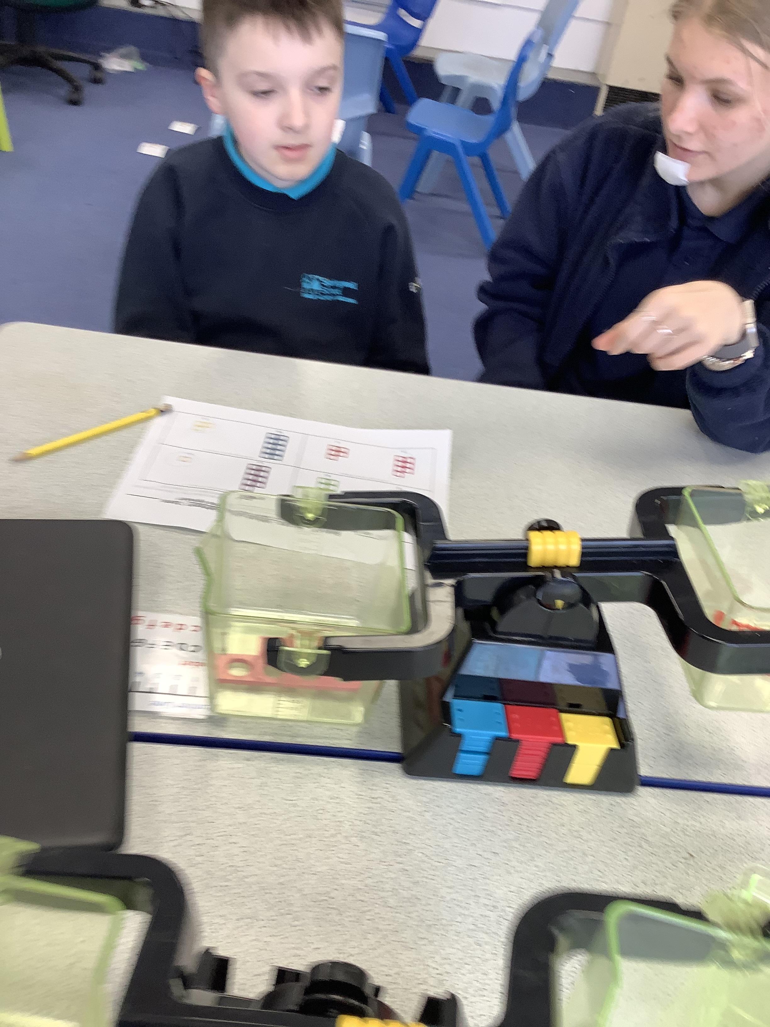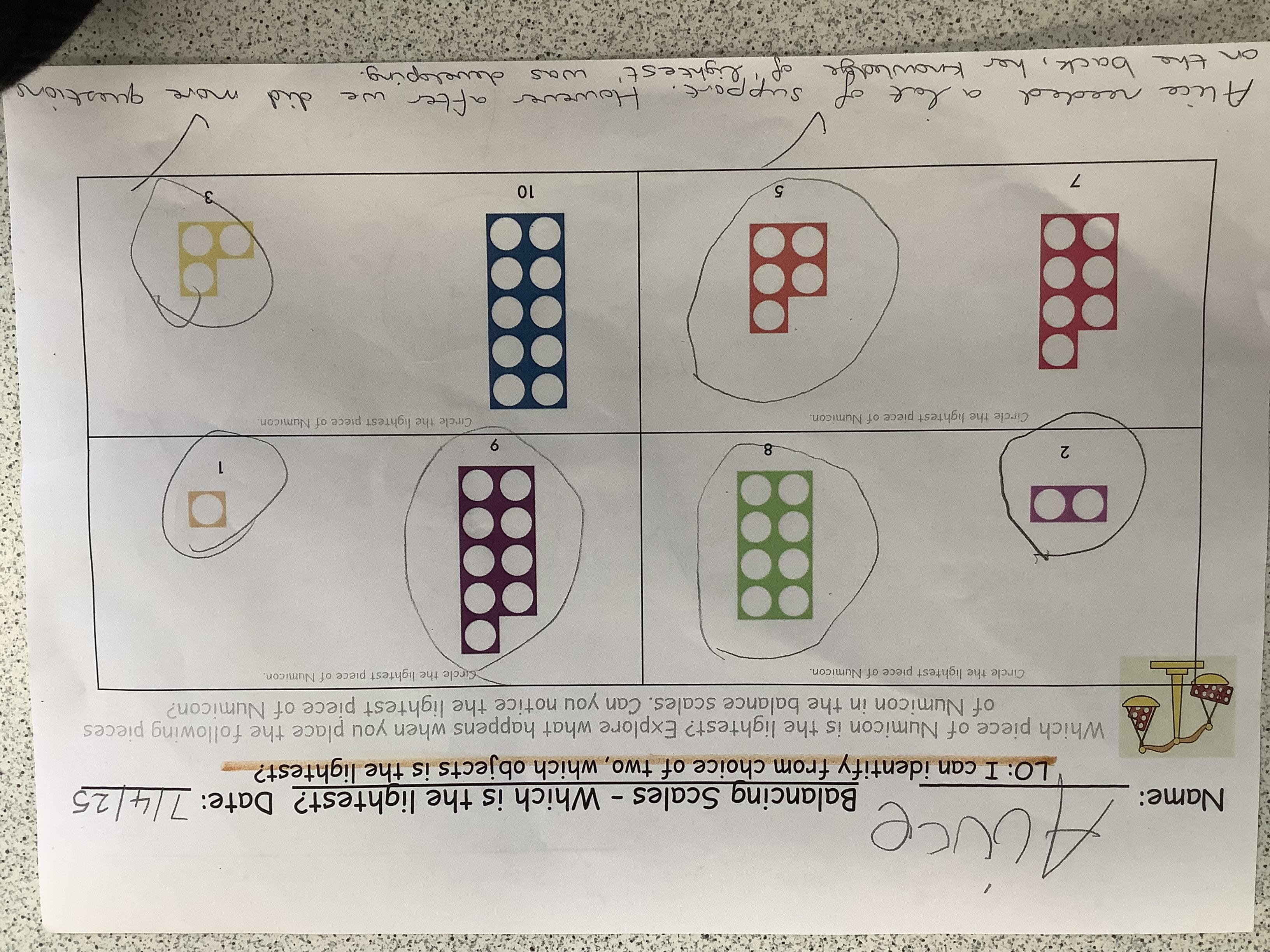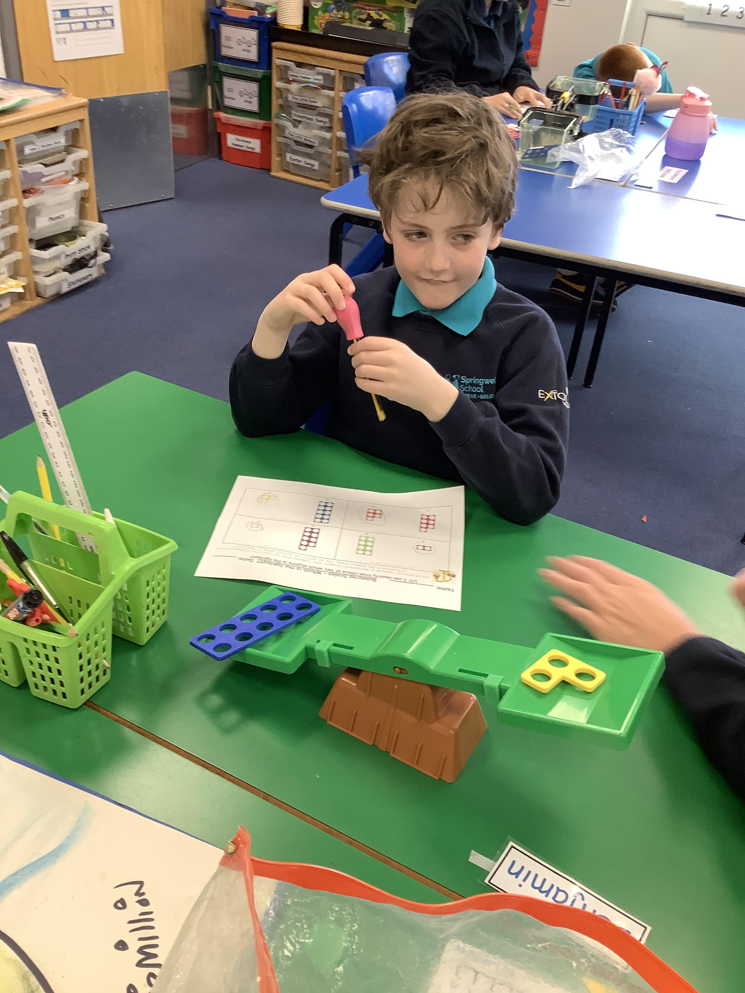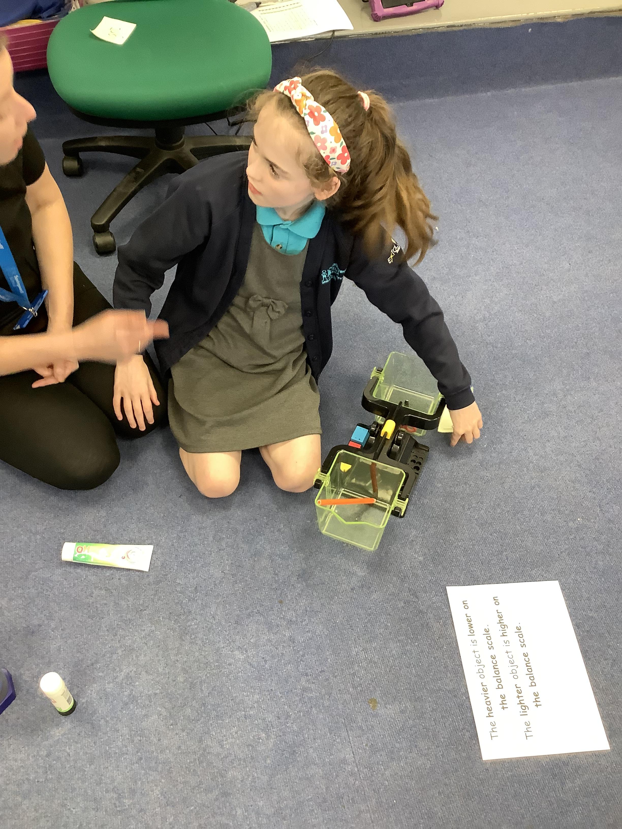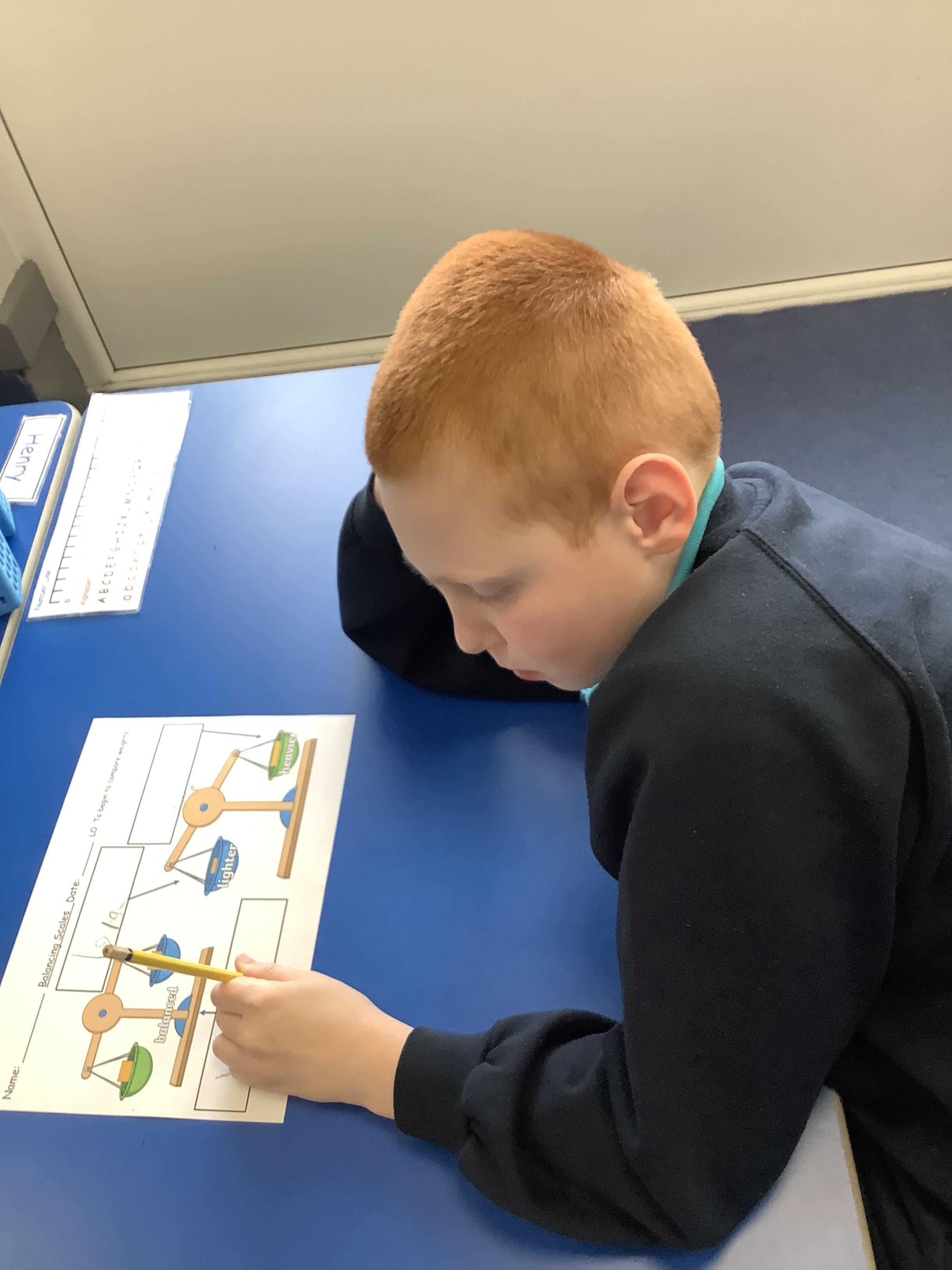 07.04.25 MATHS: MASS The children have been using the balance scales to identify from choice of two, which piece of numicon is the heaviest and which piece is the lighest.
