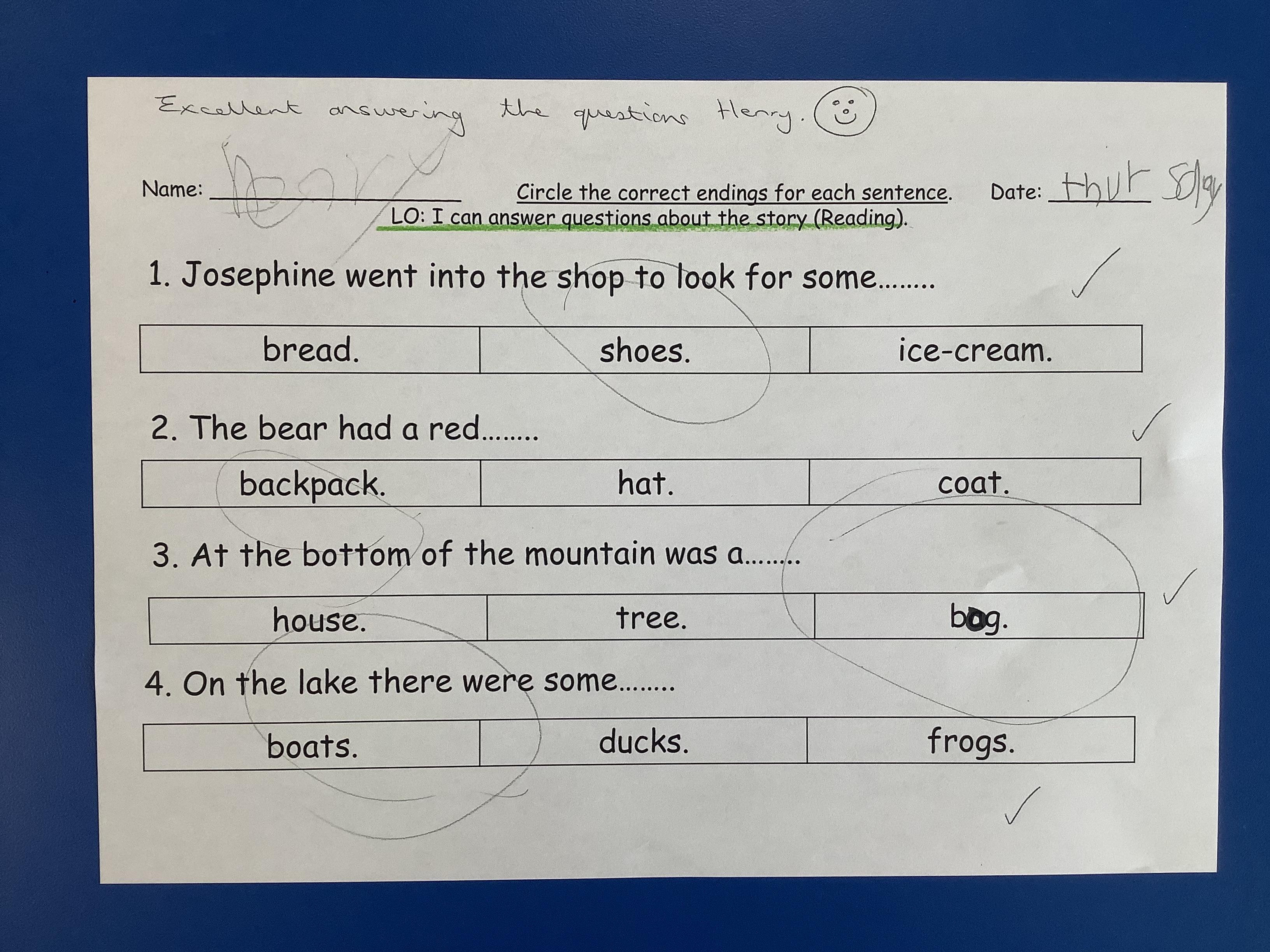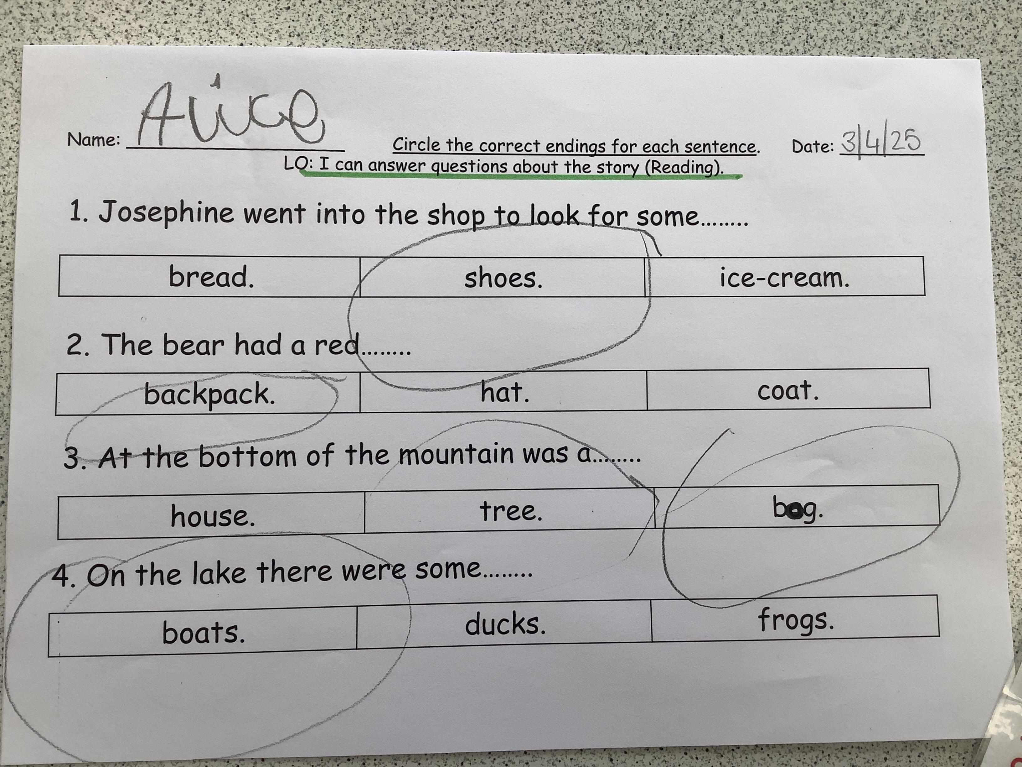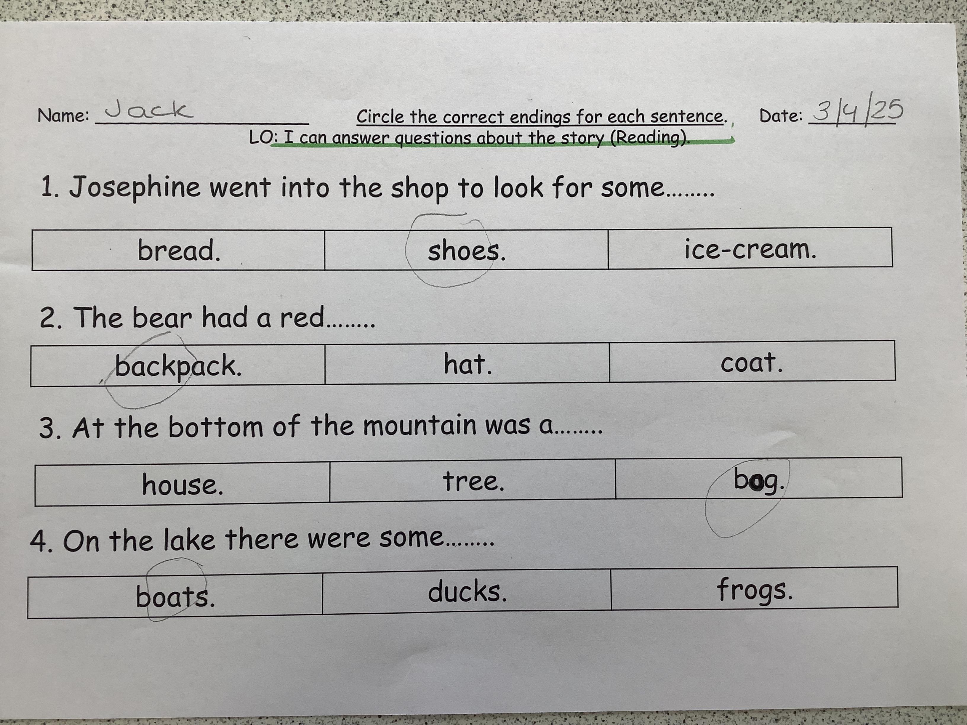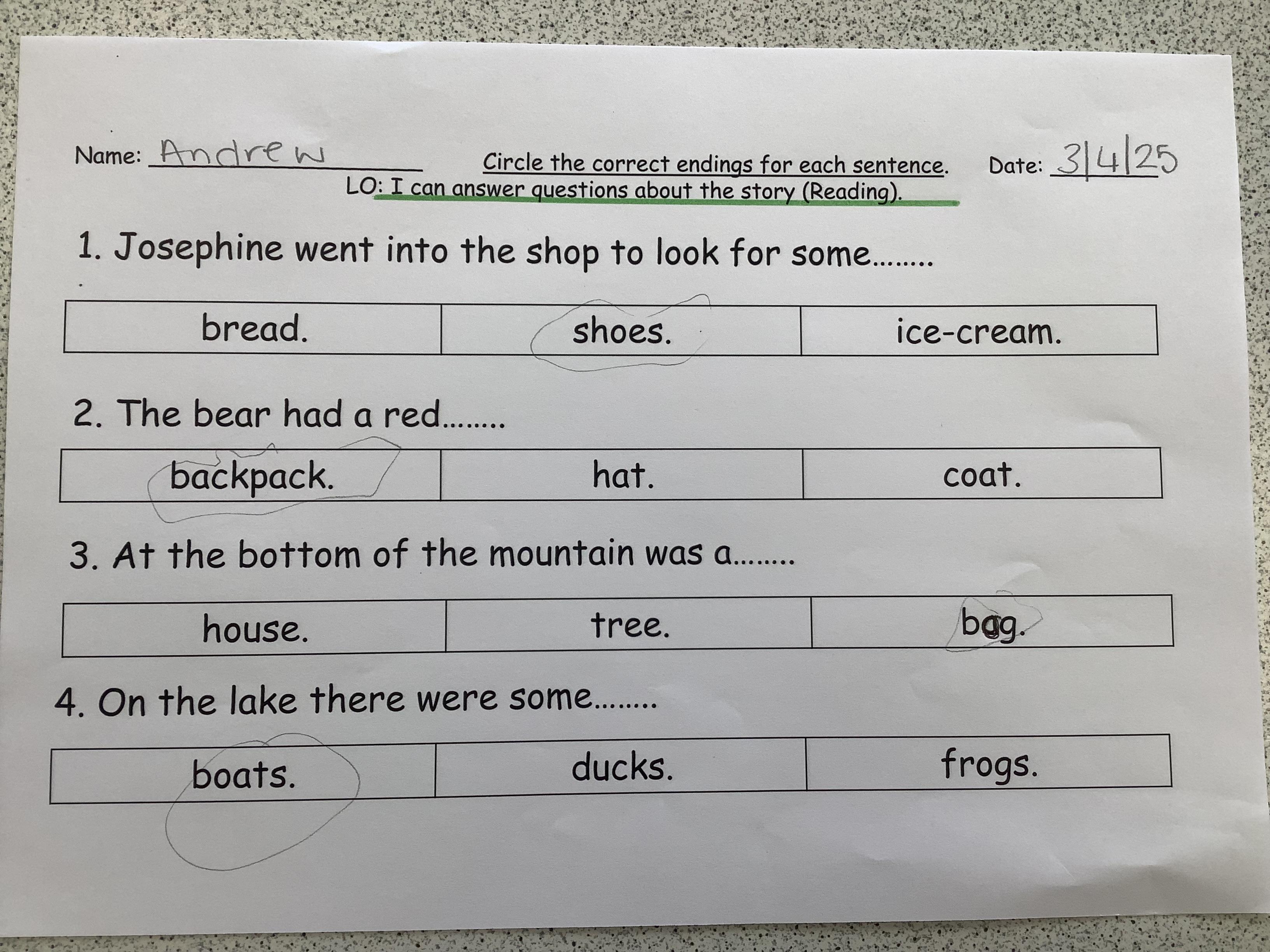 03.04.25 LITERACY: THE GIRL, THE BEAR AND THE MAGIC SHOES The children have really enjoyed this book! The children can identify all the different shoes Josephine's magic shoes turns into. We have been drawing and labeling all of her shoes, and making a list of all the different places she went to while running away from the bear. Together, we have been matching up beginnings and endings of sentences and answering questions about the story.